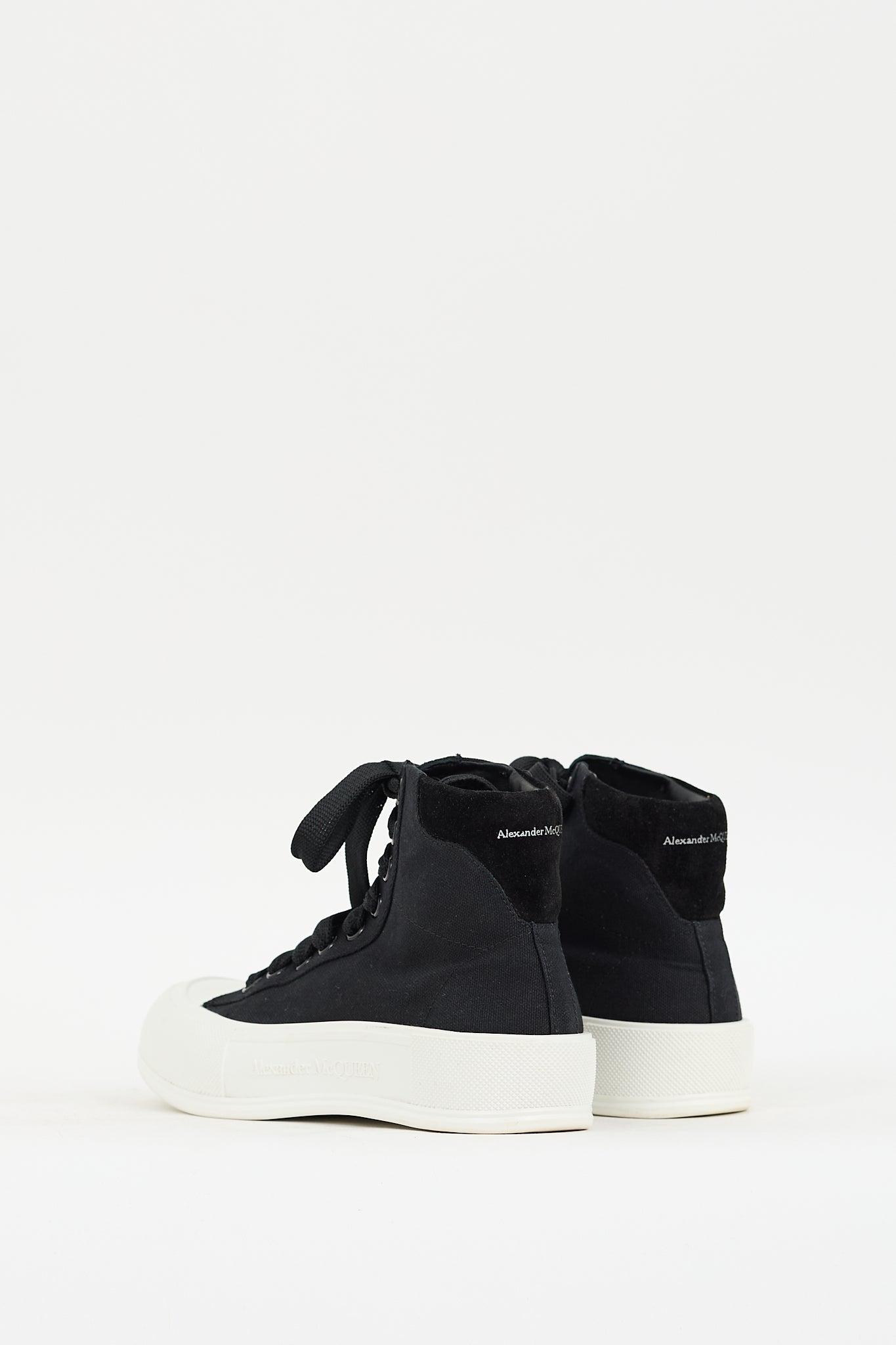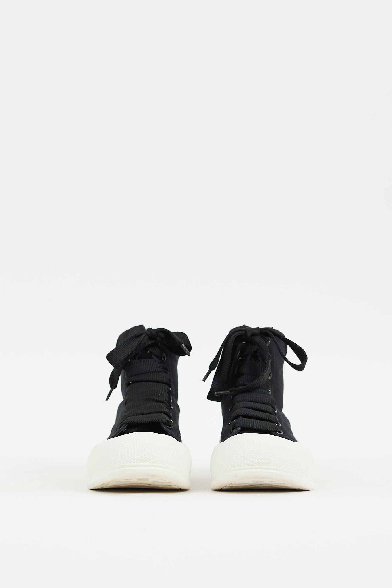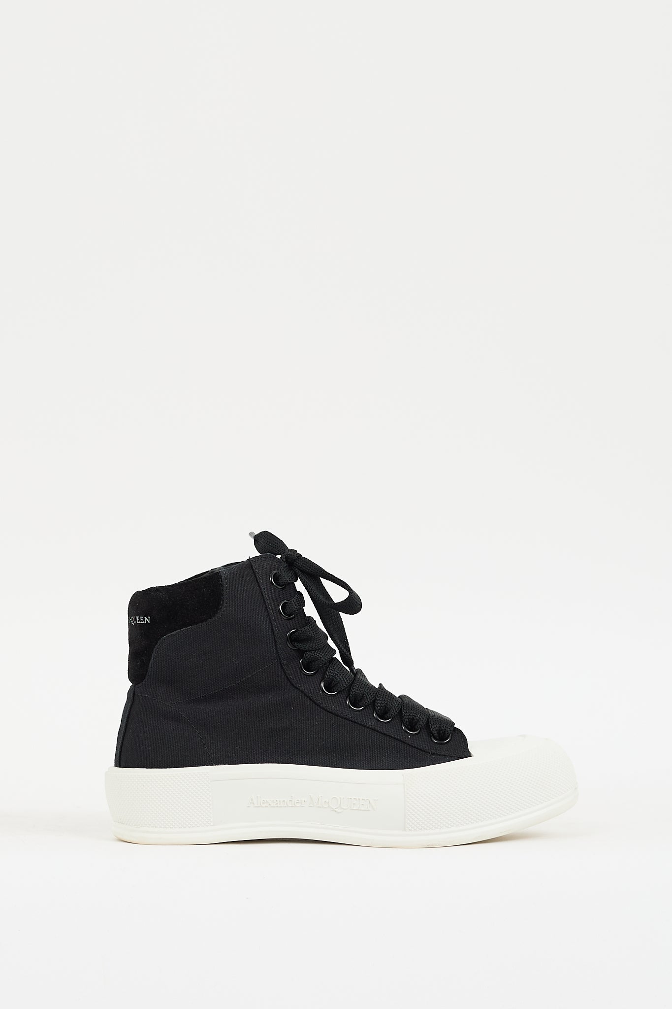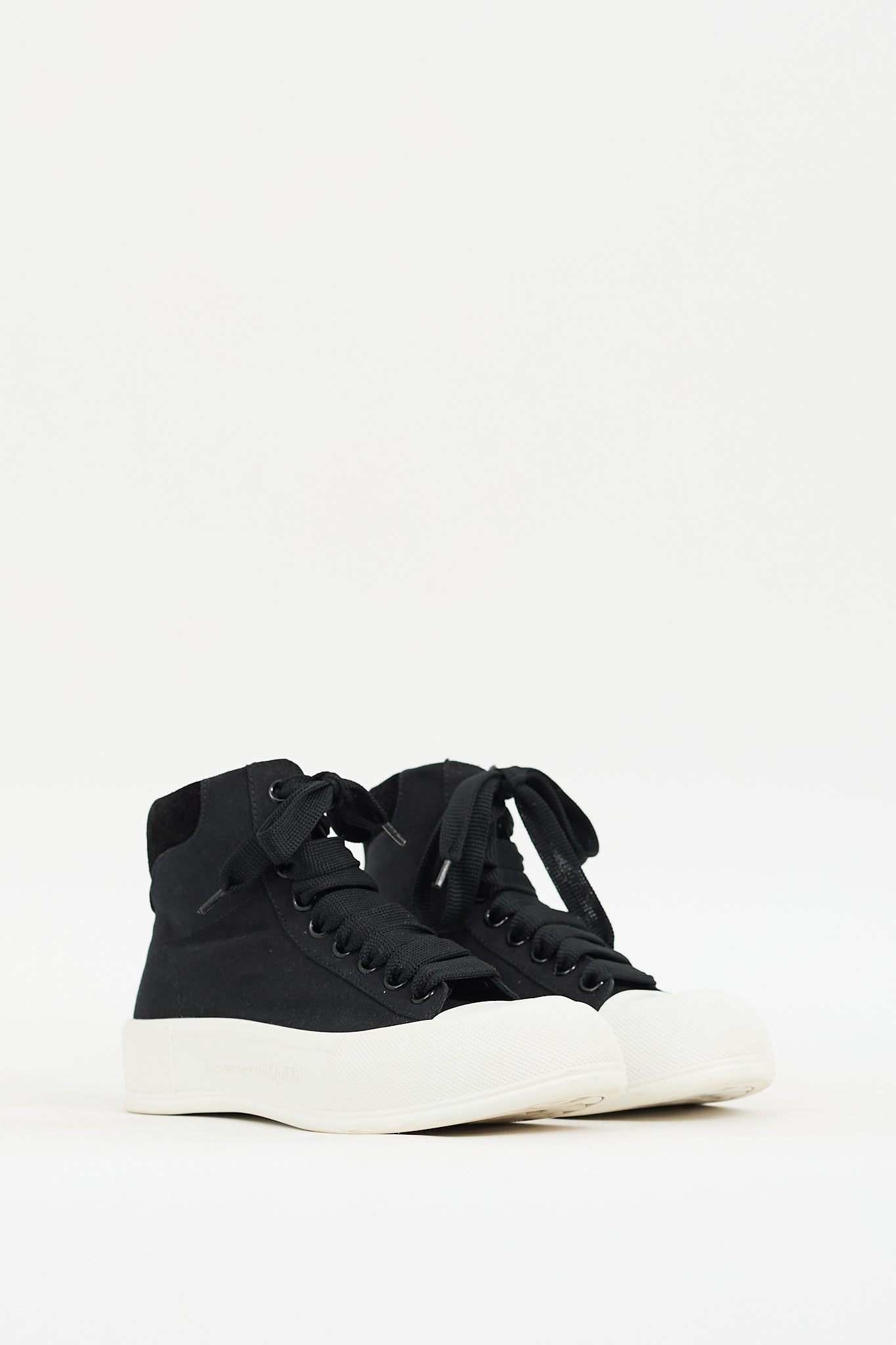 Pre-owned Alexander McQueen black and white Plimsoll sneakers featuring a rounded toe with rubber cap, canvas upper, wide lace up vamp, silver tone printed logo at tongue, black suede counter panel with printed logo, and white rubber platform sole with embossed logo at outer sides. Comes with extra laces.