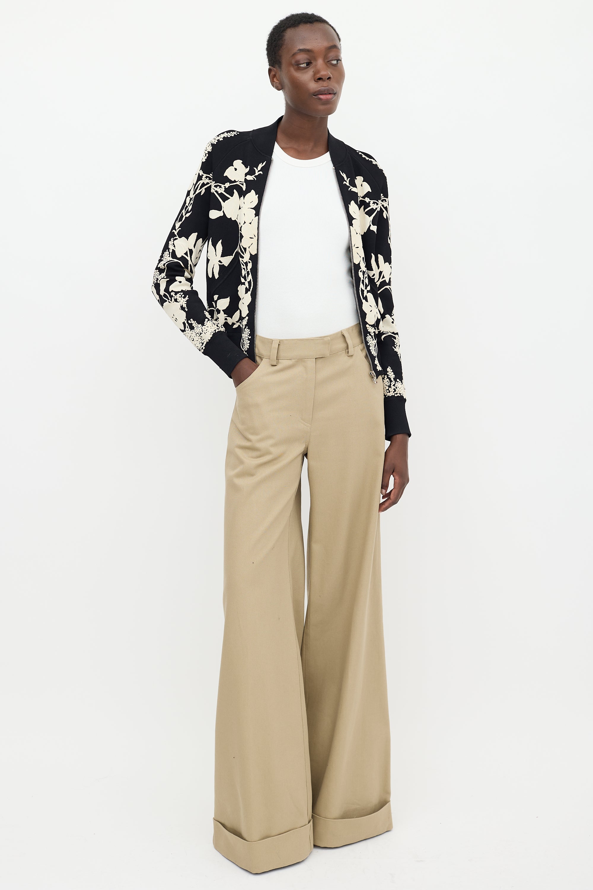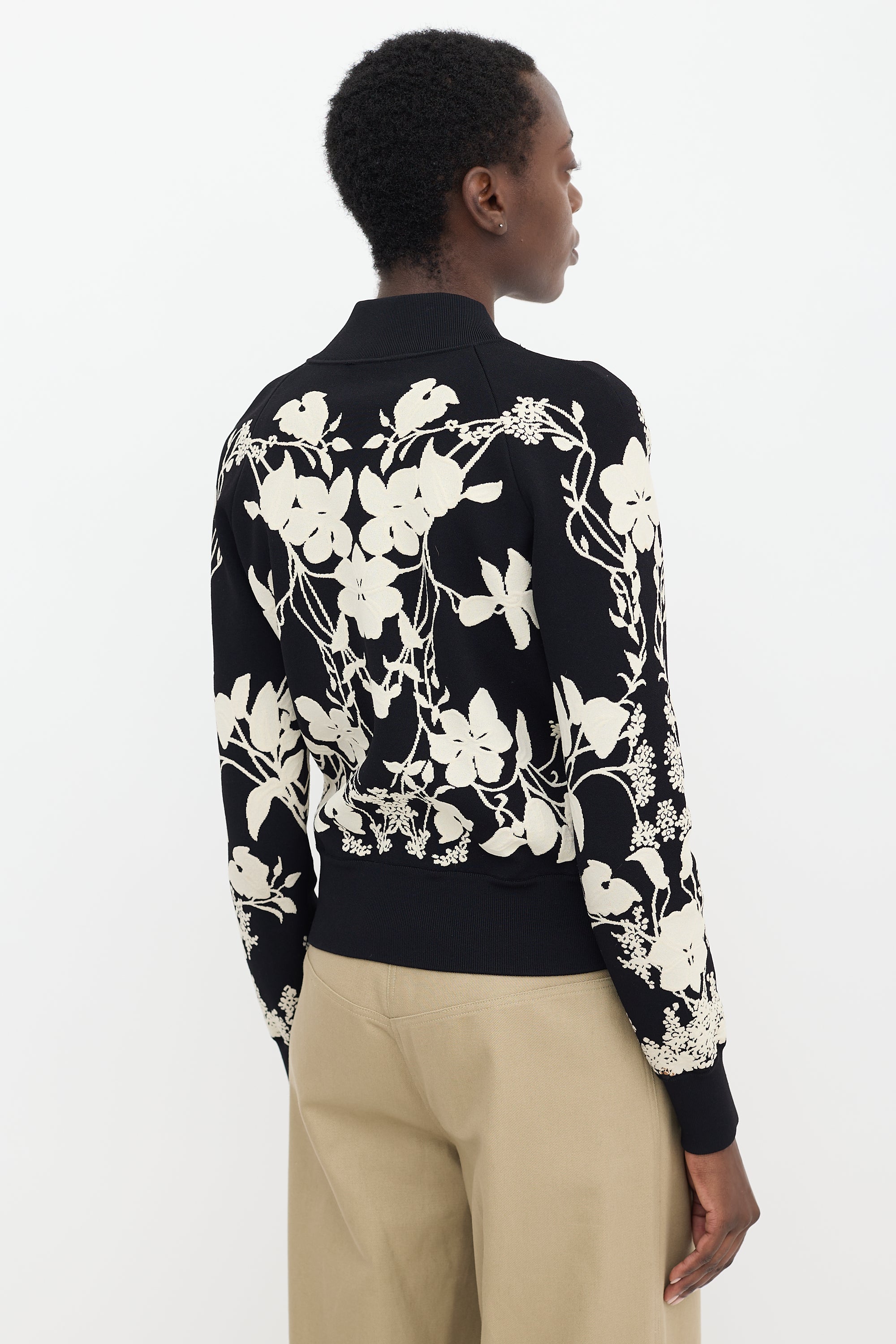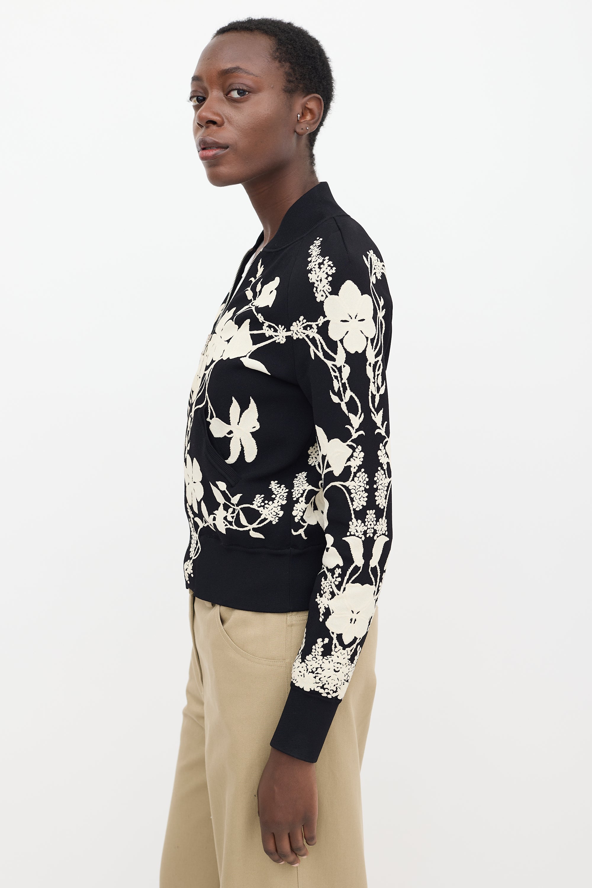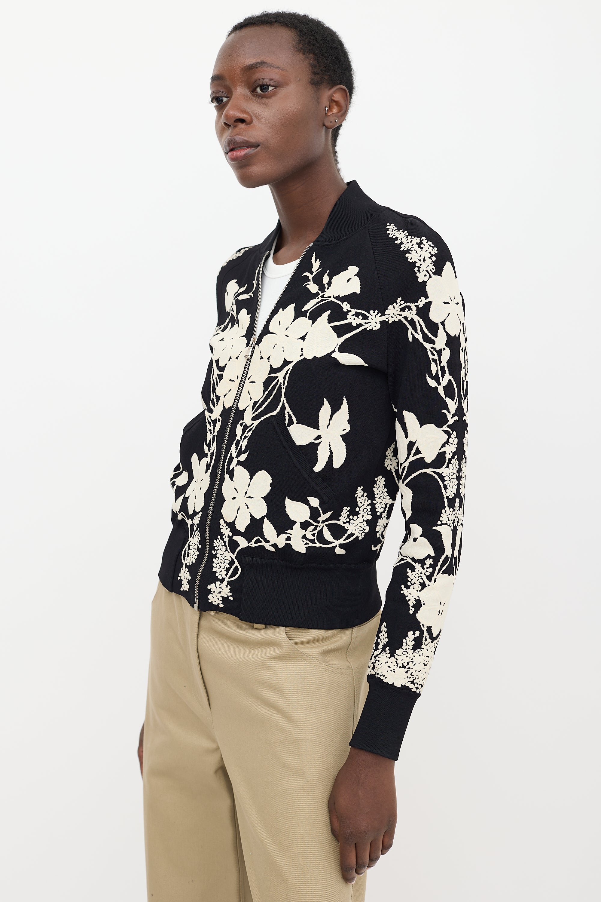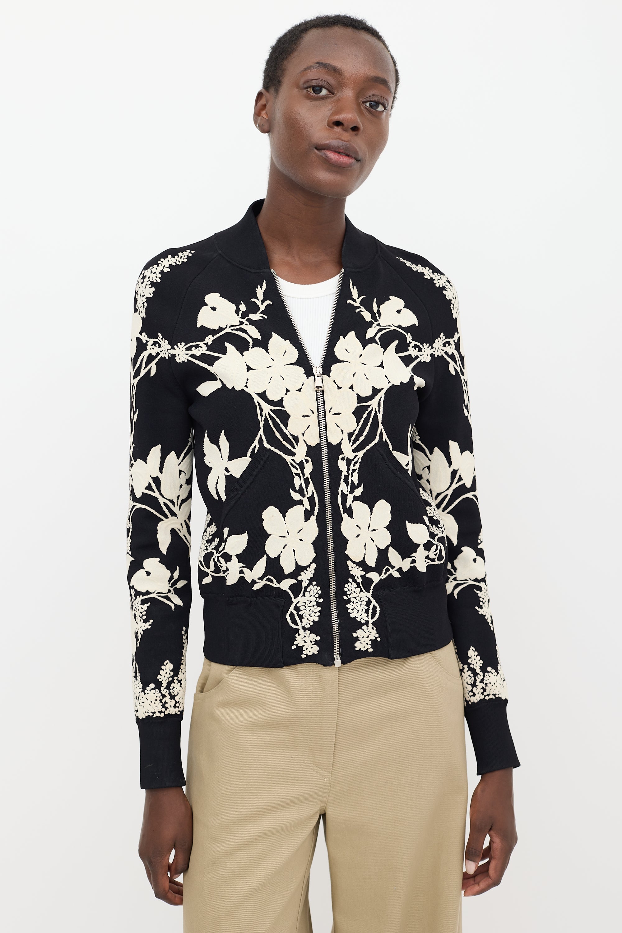 Pre-owned Alexander McQueen black bomber jacket featuring a white floral pattern throughout, two slip pockets at hip, ribbed hem, and zip closure.