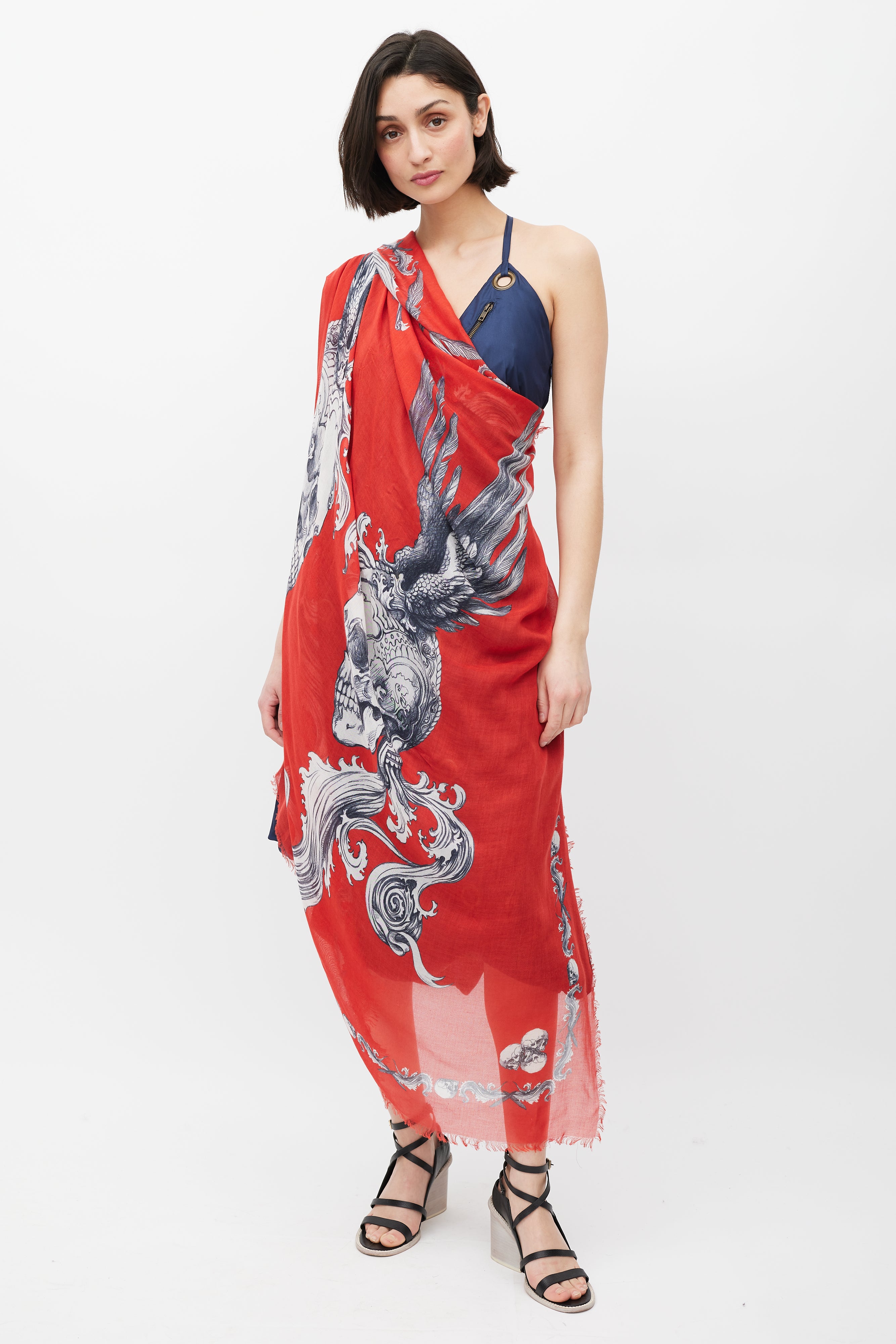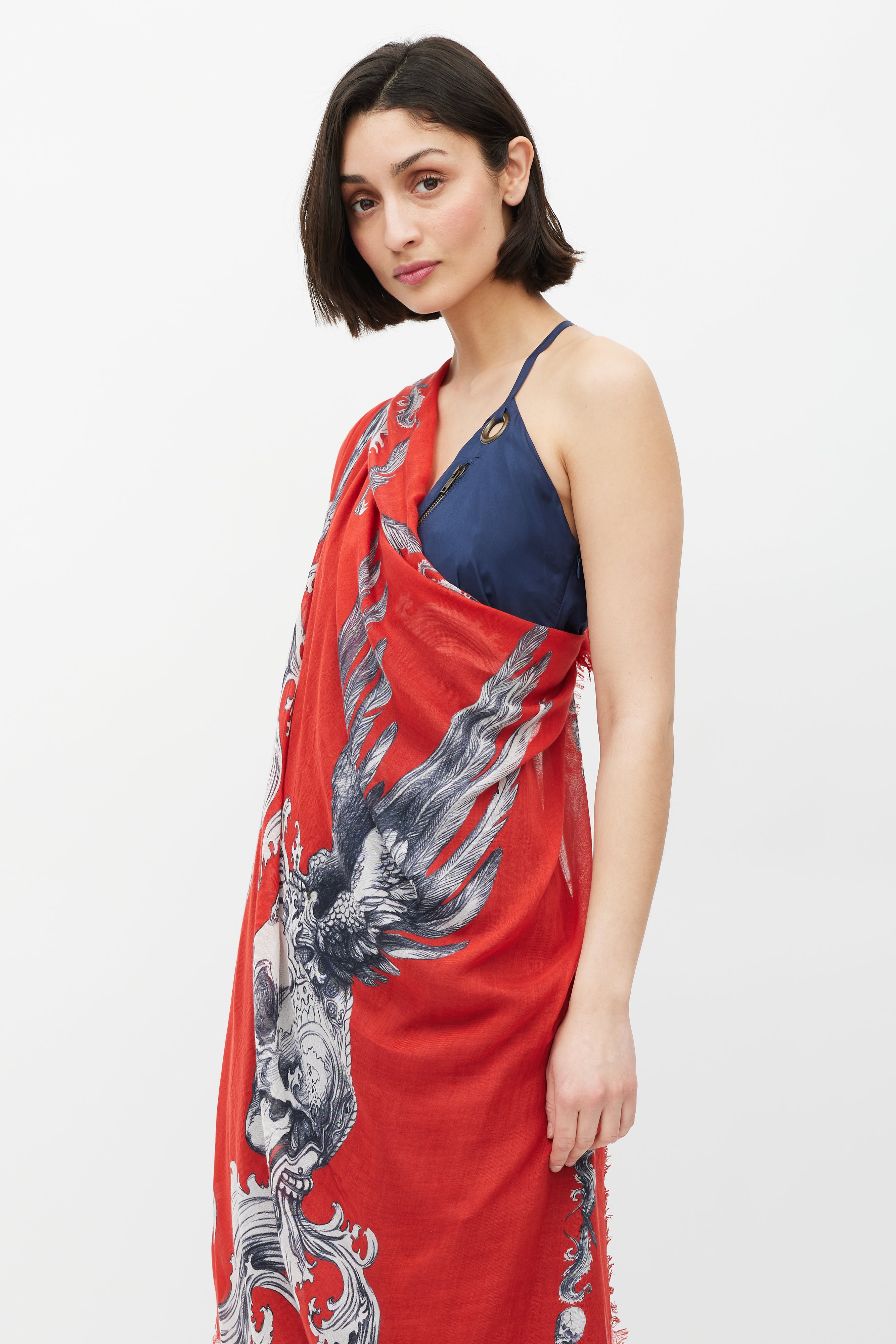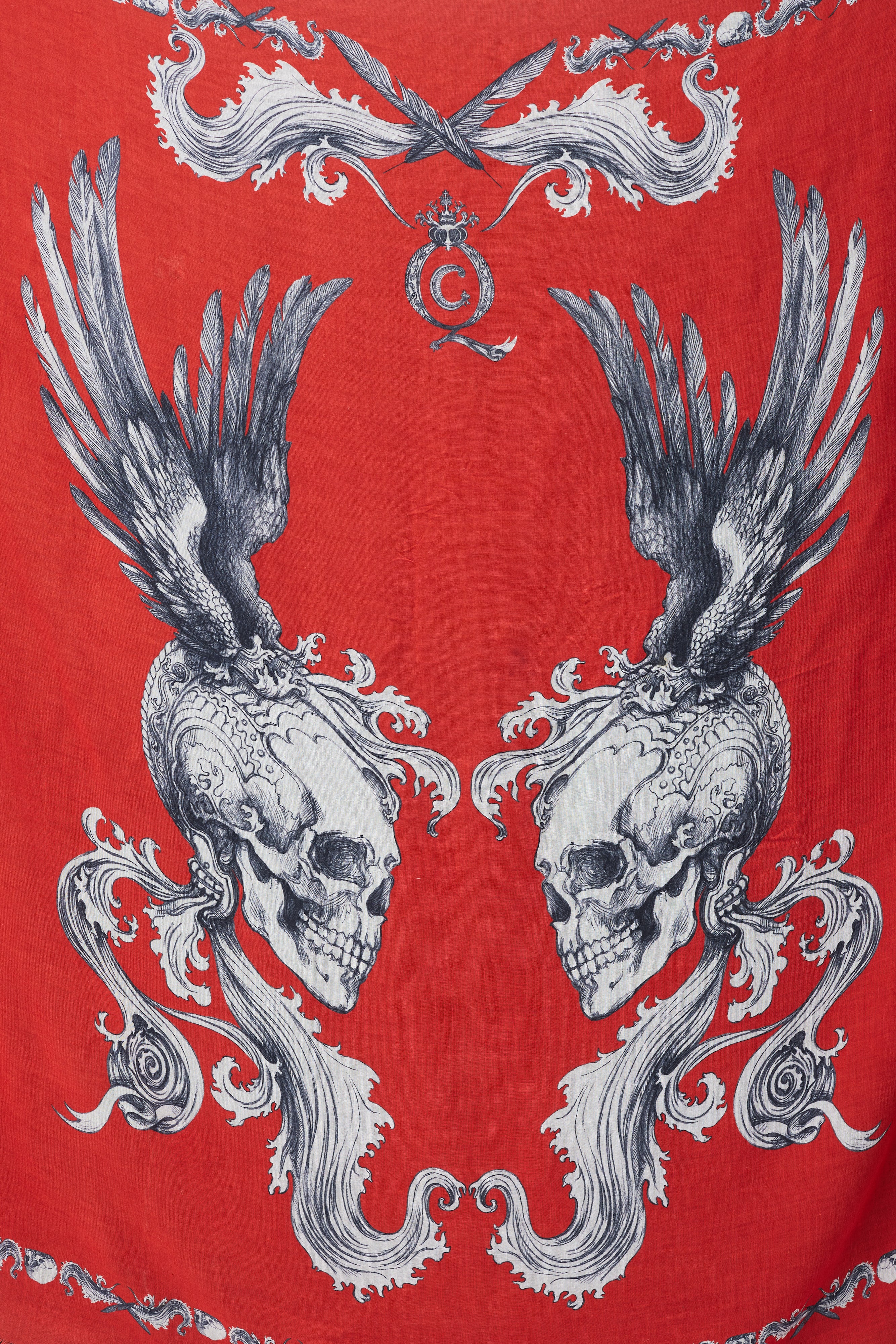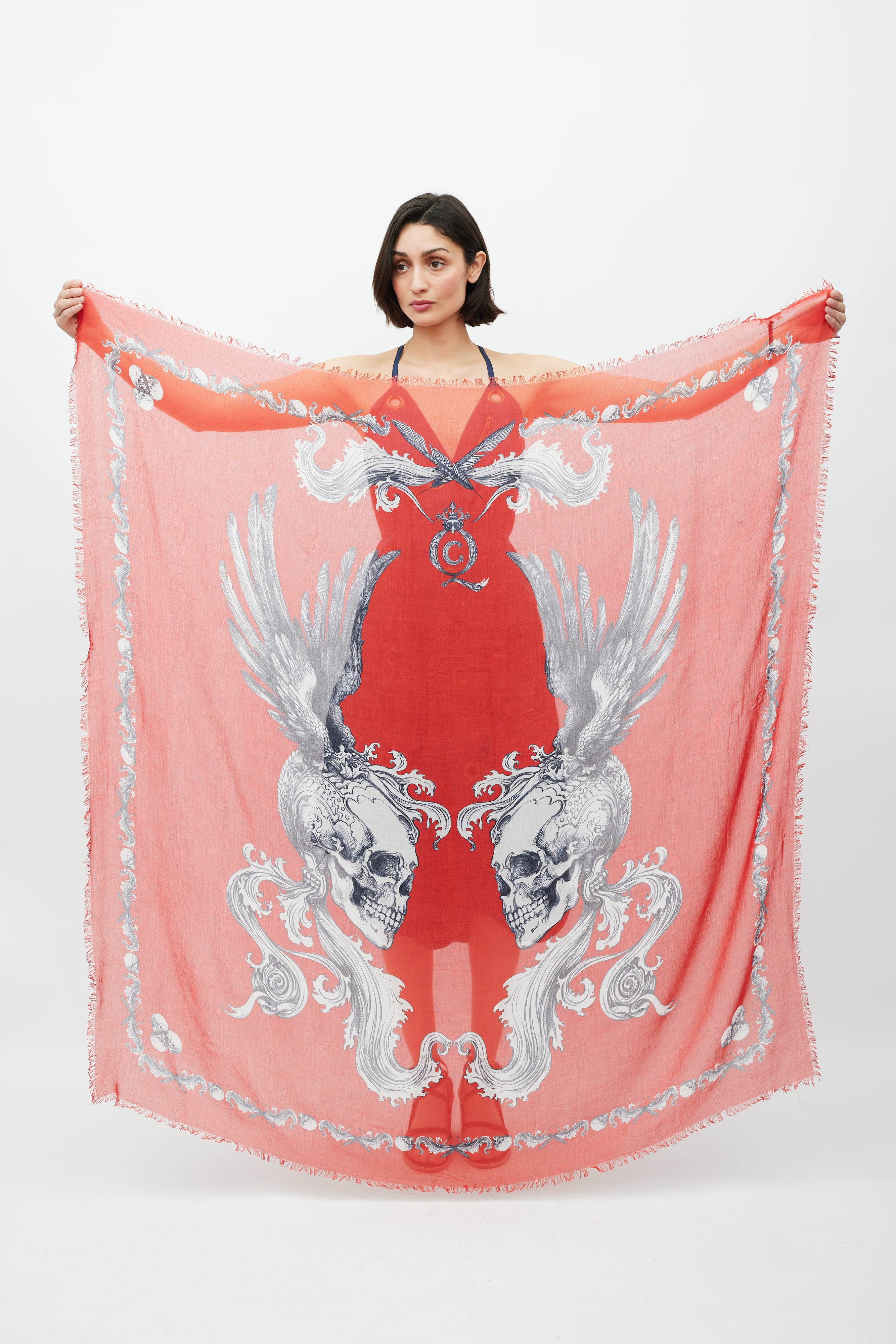 Pre-owned Alexander McQueen red scarf featuring a white skull pattern throughout, baroque trim, and raw edges.