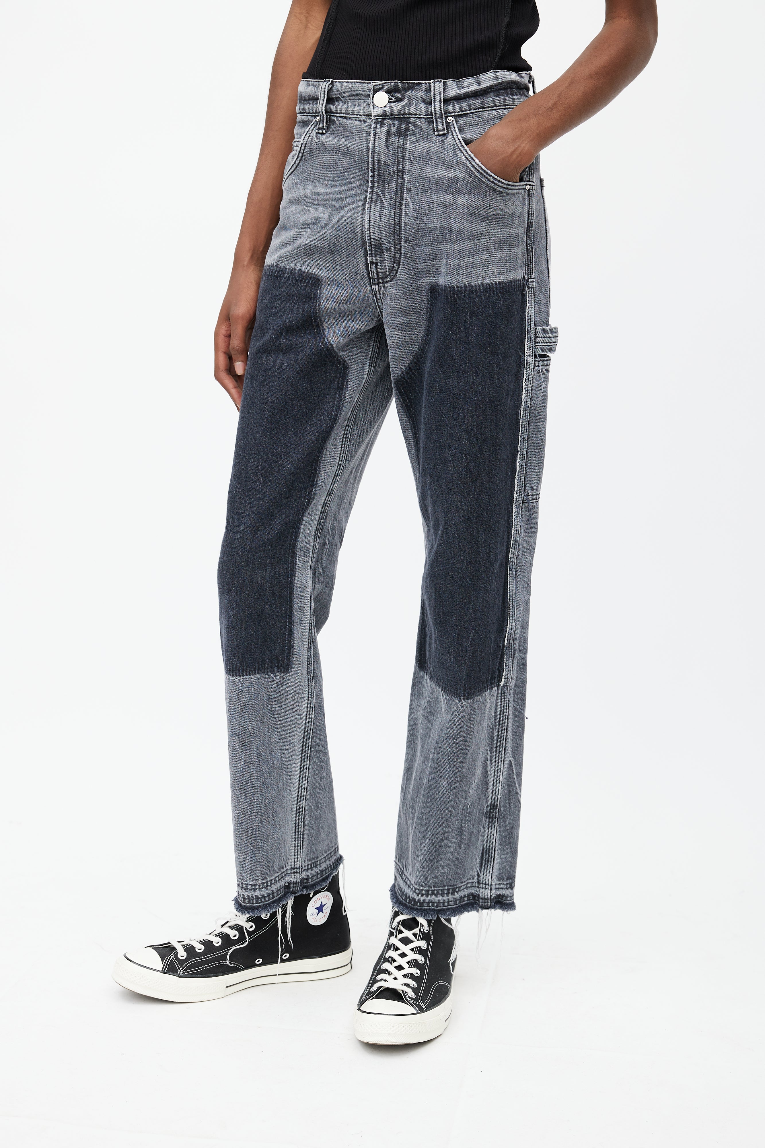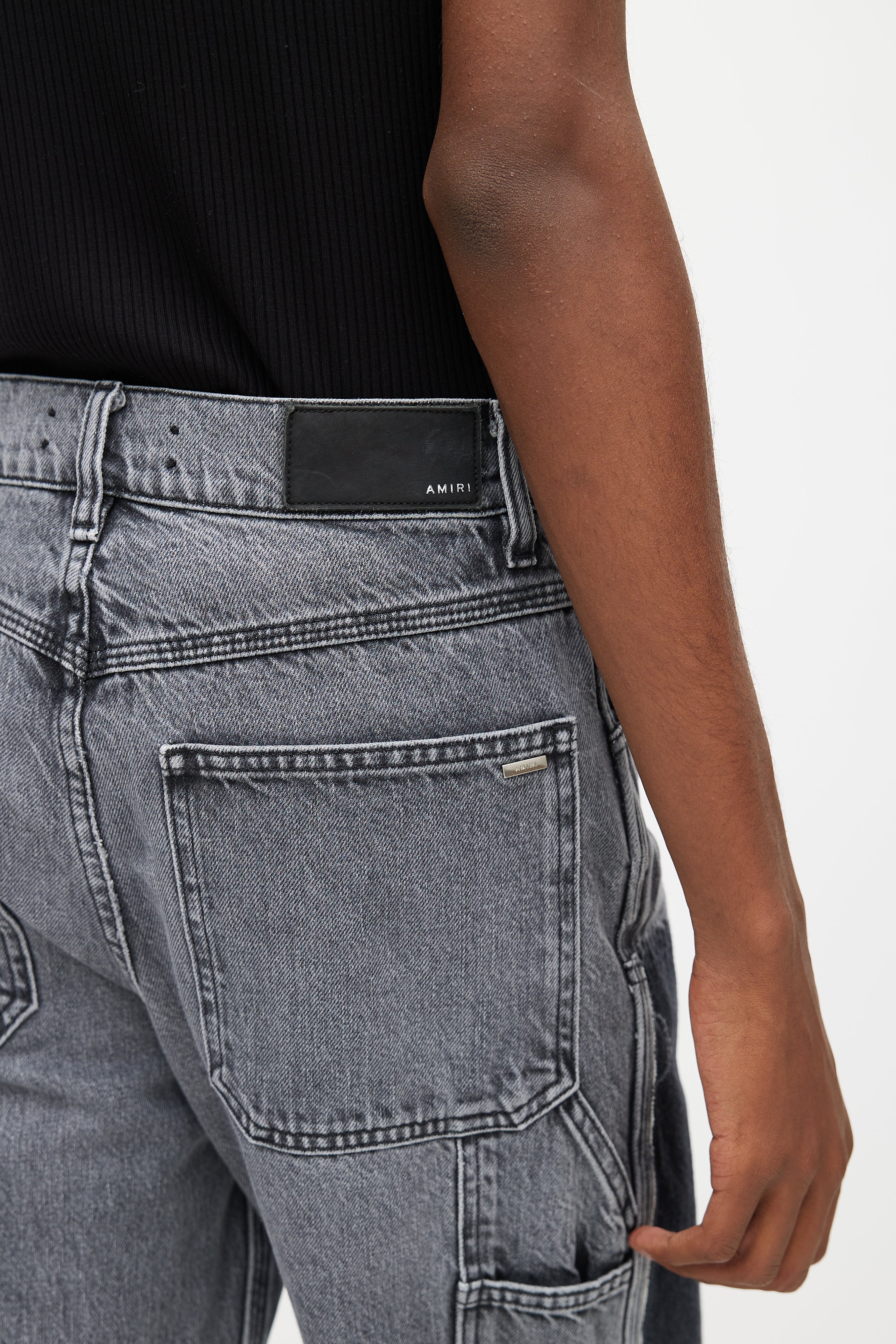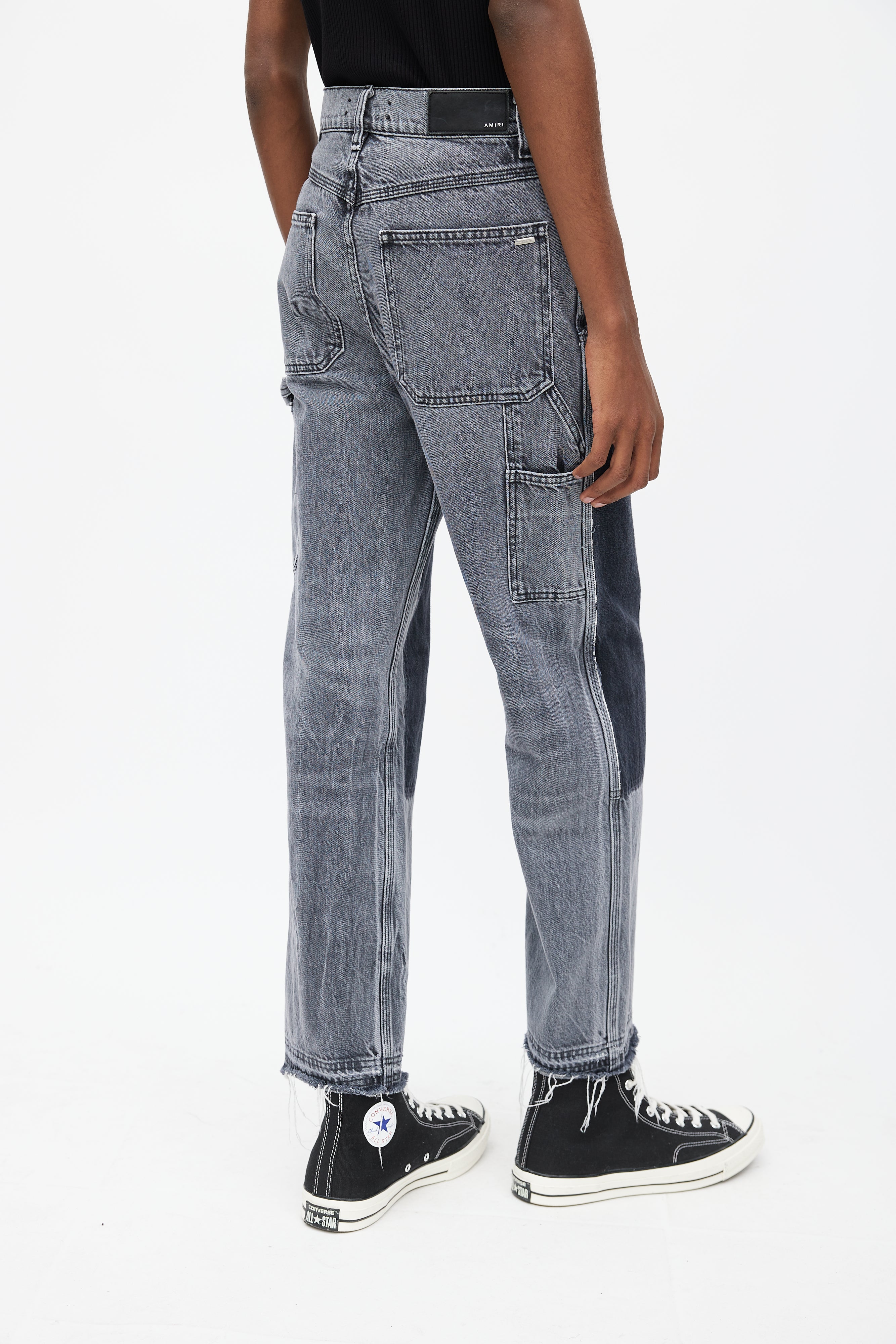 Pre-owned Amiri grey jeans featuring belt loops, zip fly, five pocket styling, raw hem at cuffs, dark grey carpenter panel, and jacron patch at back.