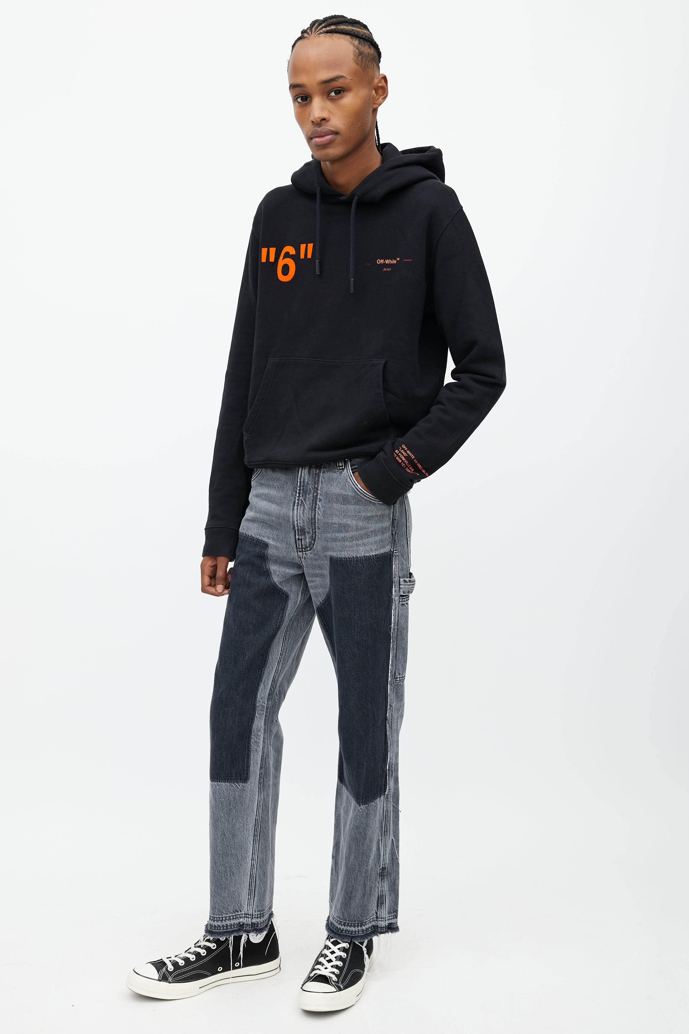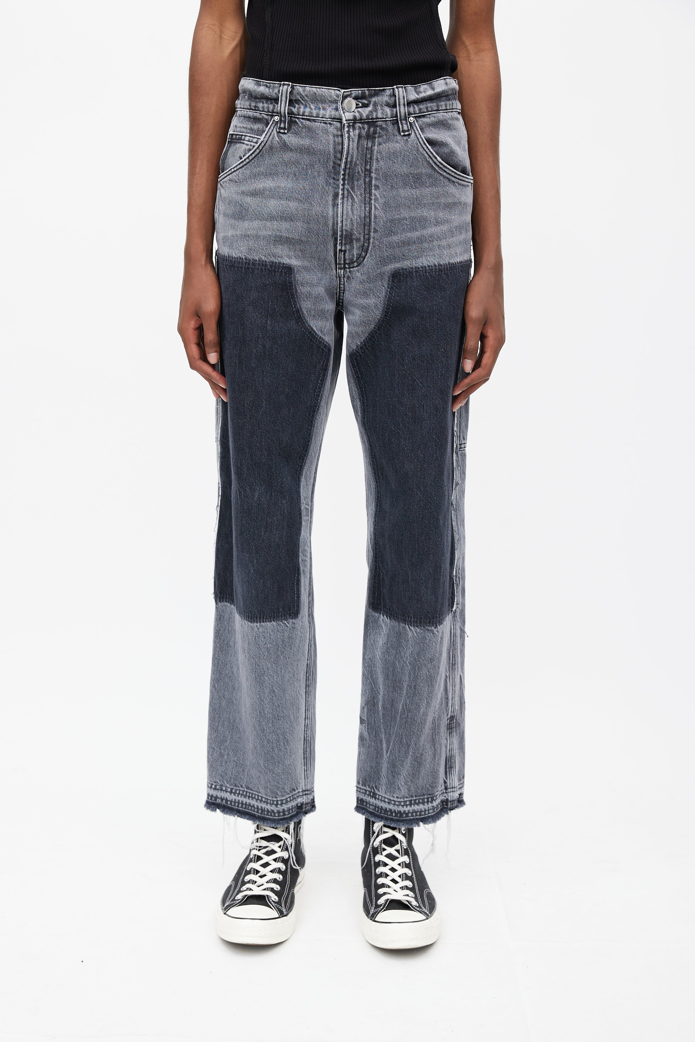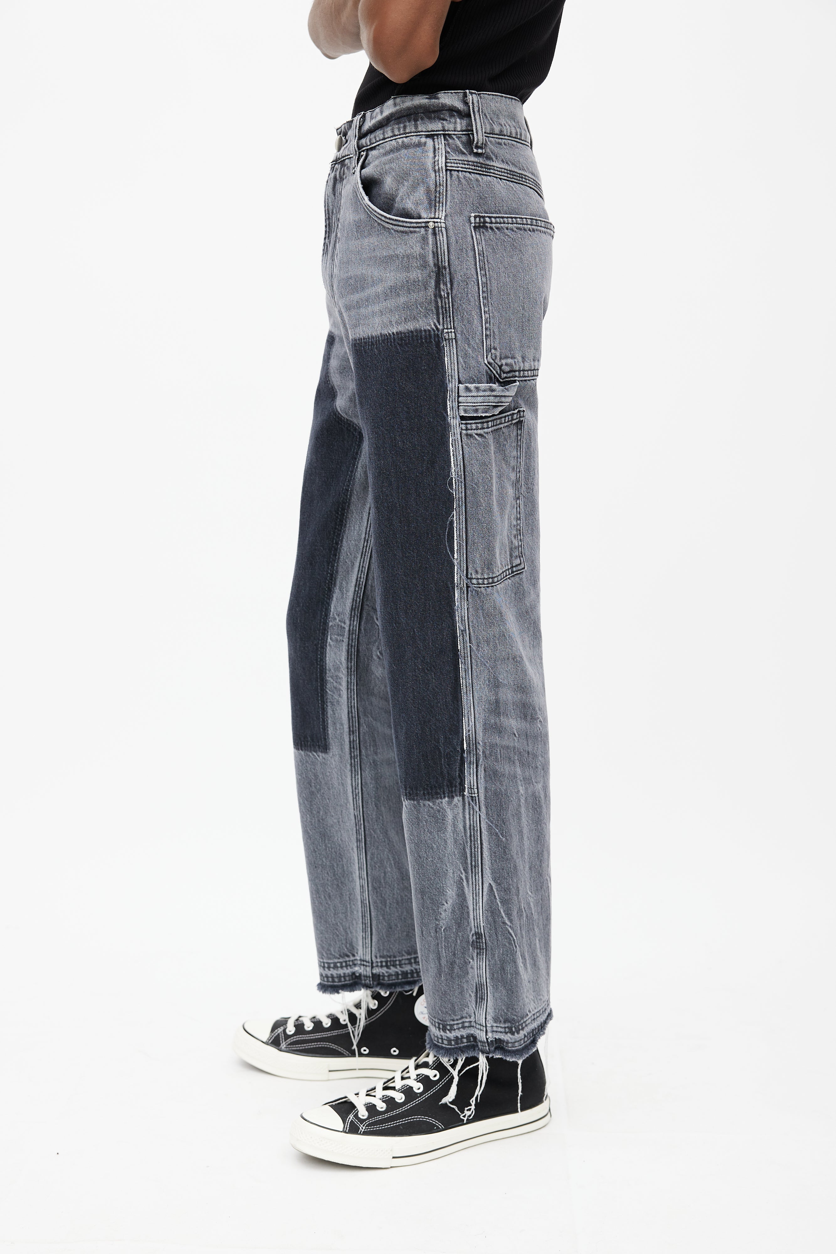 Pre-owned Amiri grey jeans featuring belt loops, zip fly, five pocket styling, raw hem at cuffs, dark grey carpenter panel, and jacron patch at back.