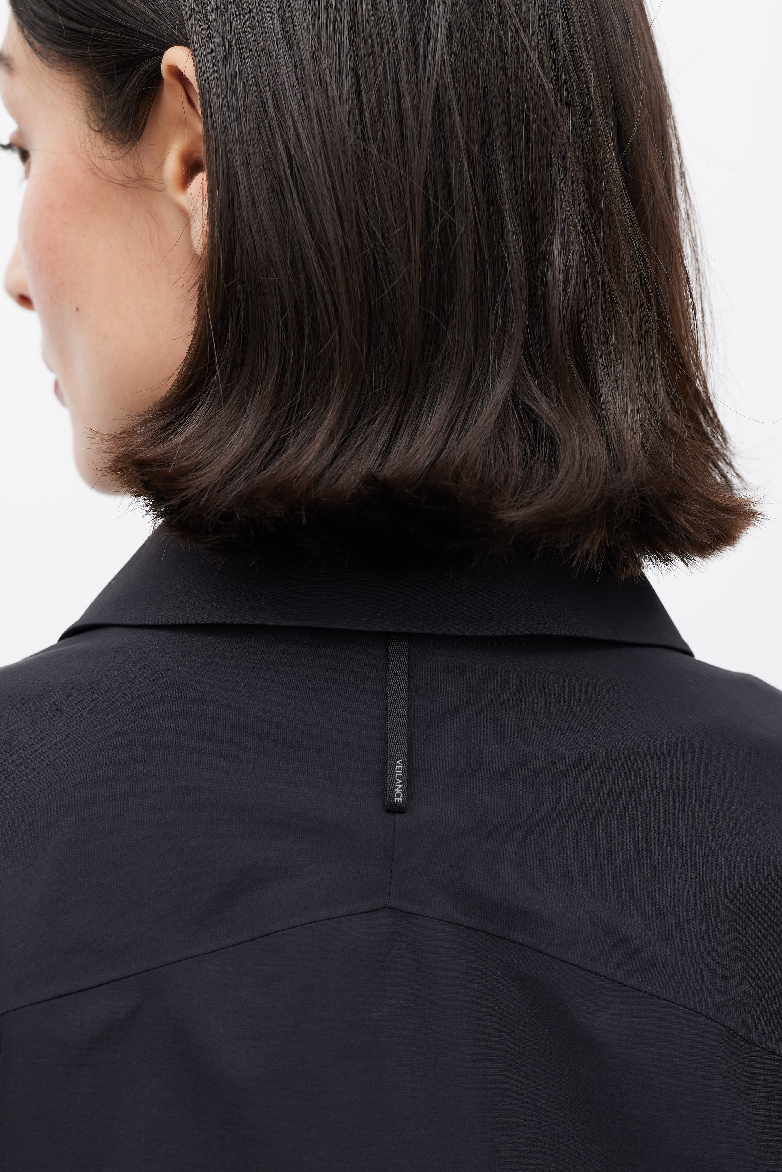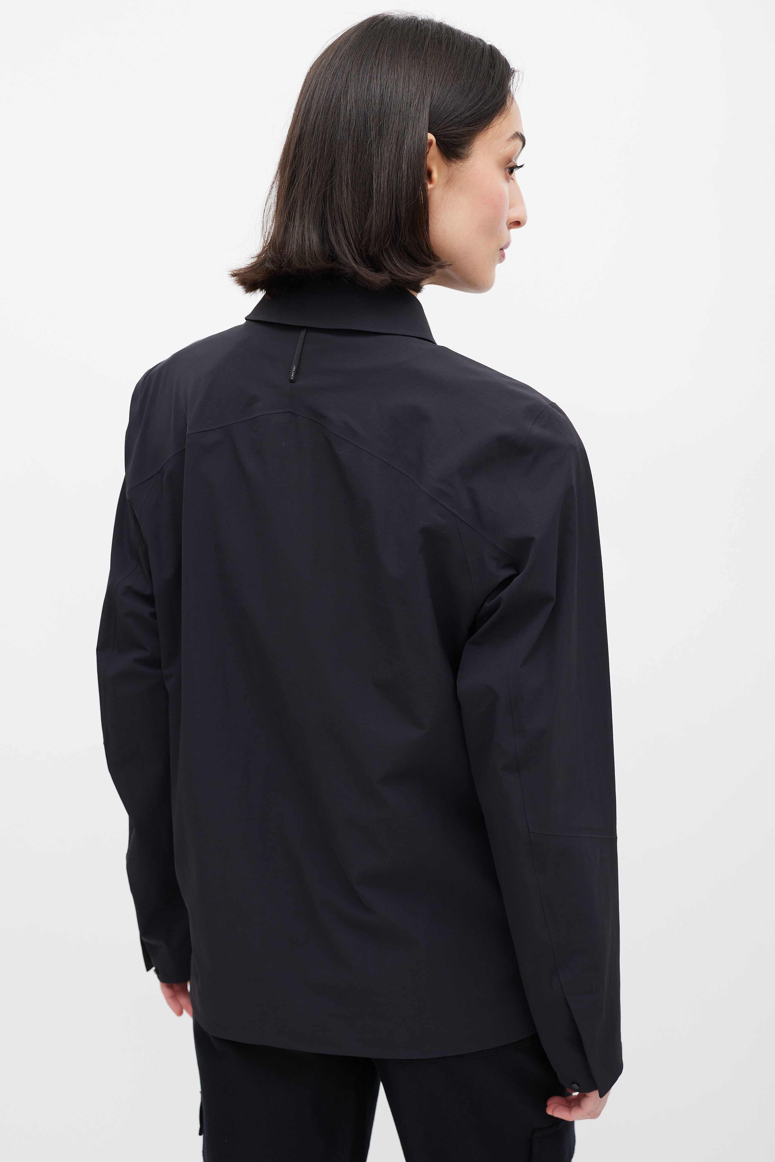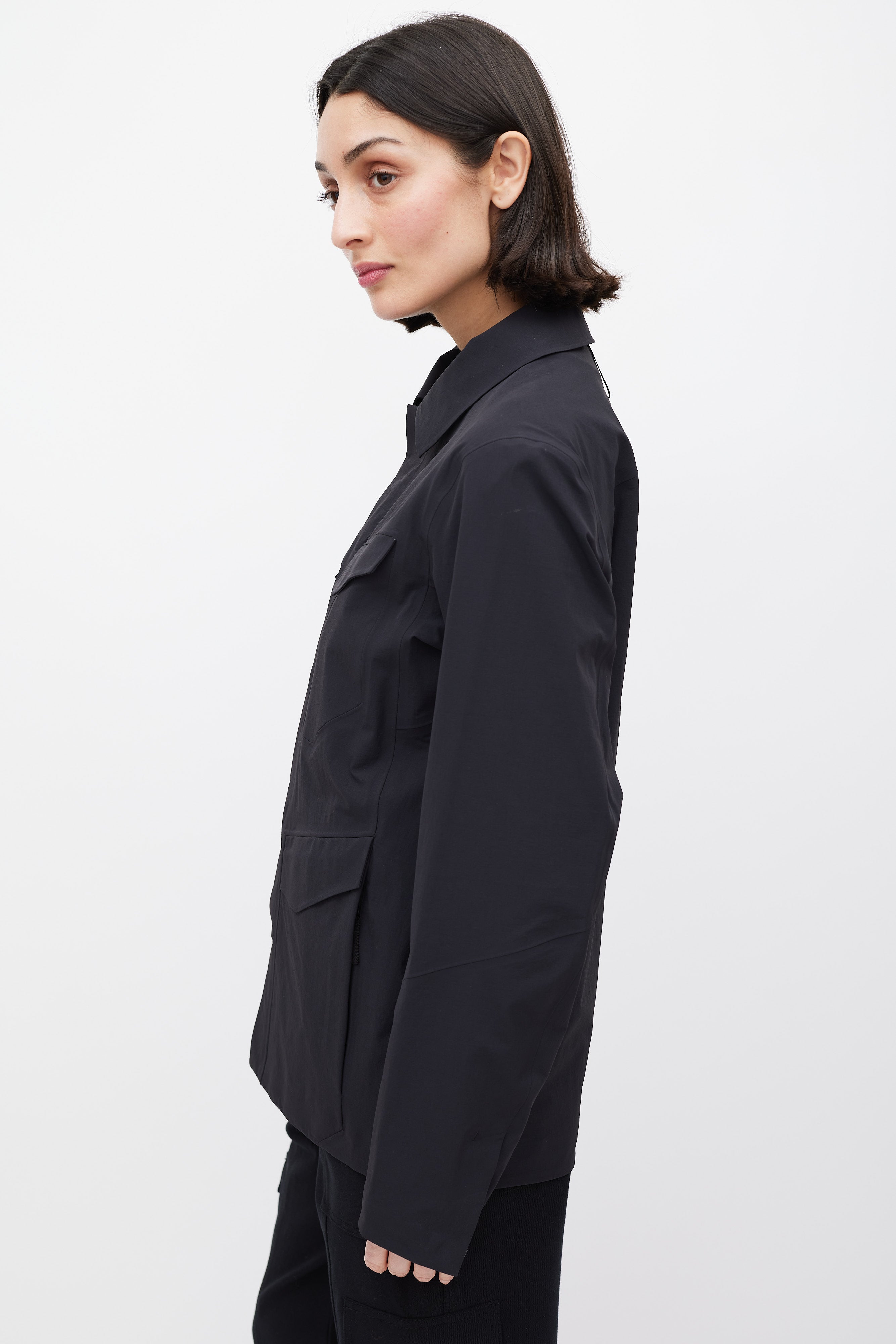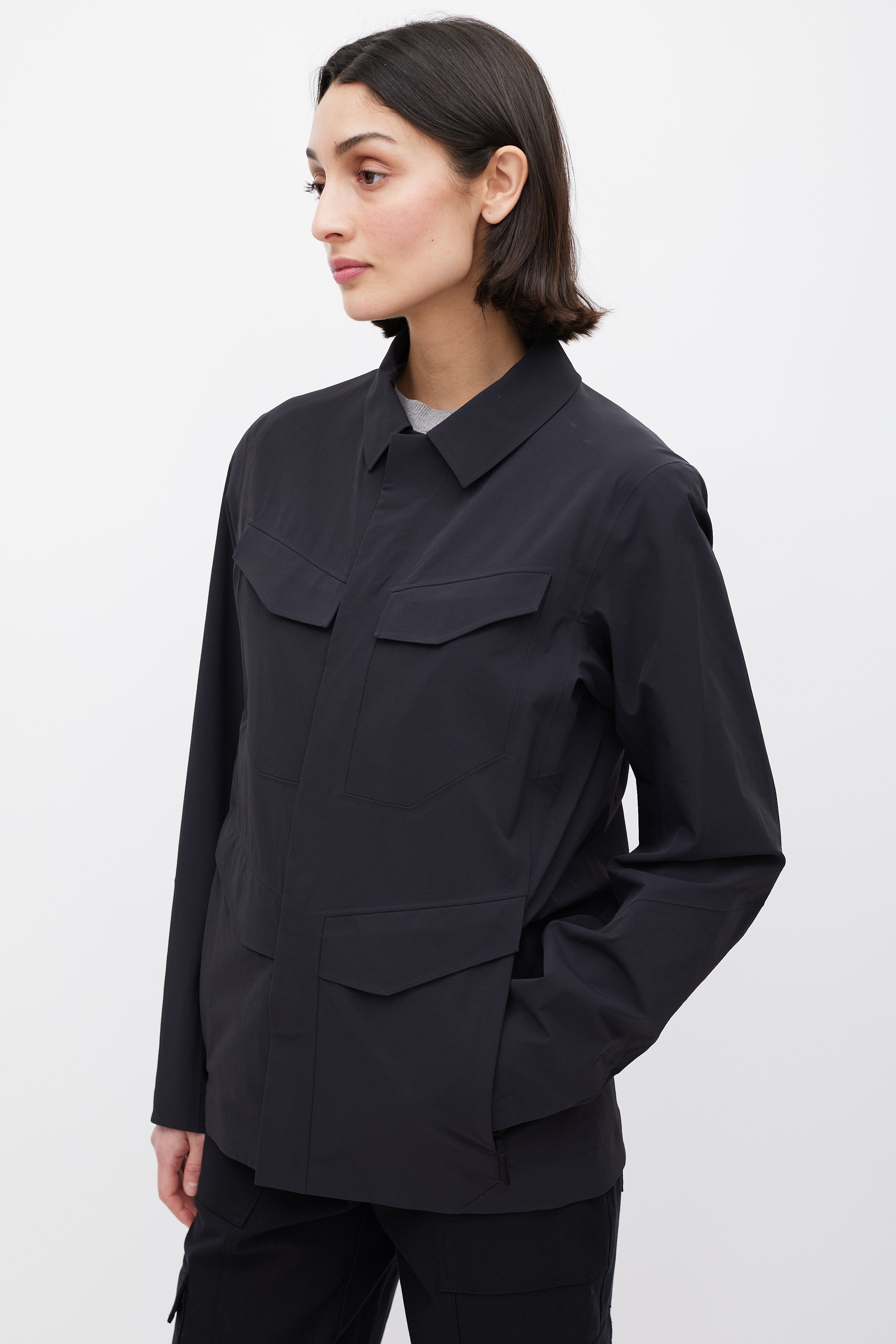 Arc'teryx Veilance black Field Softshell jacket featuring spread collar, snap button placket at front, flap pockets at chest and waist, panelling at back and sleeves, signature Arc'teryx Veilance pull tab at back, and snap buttons at cuff.