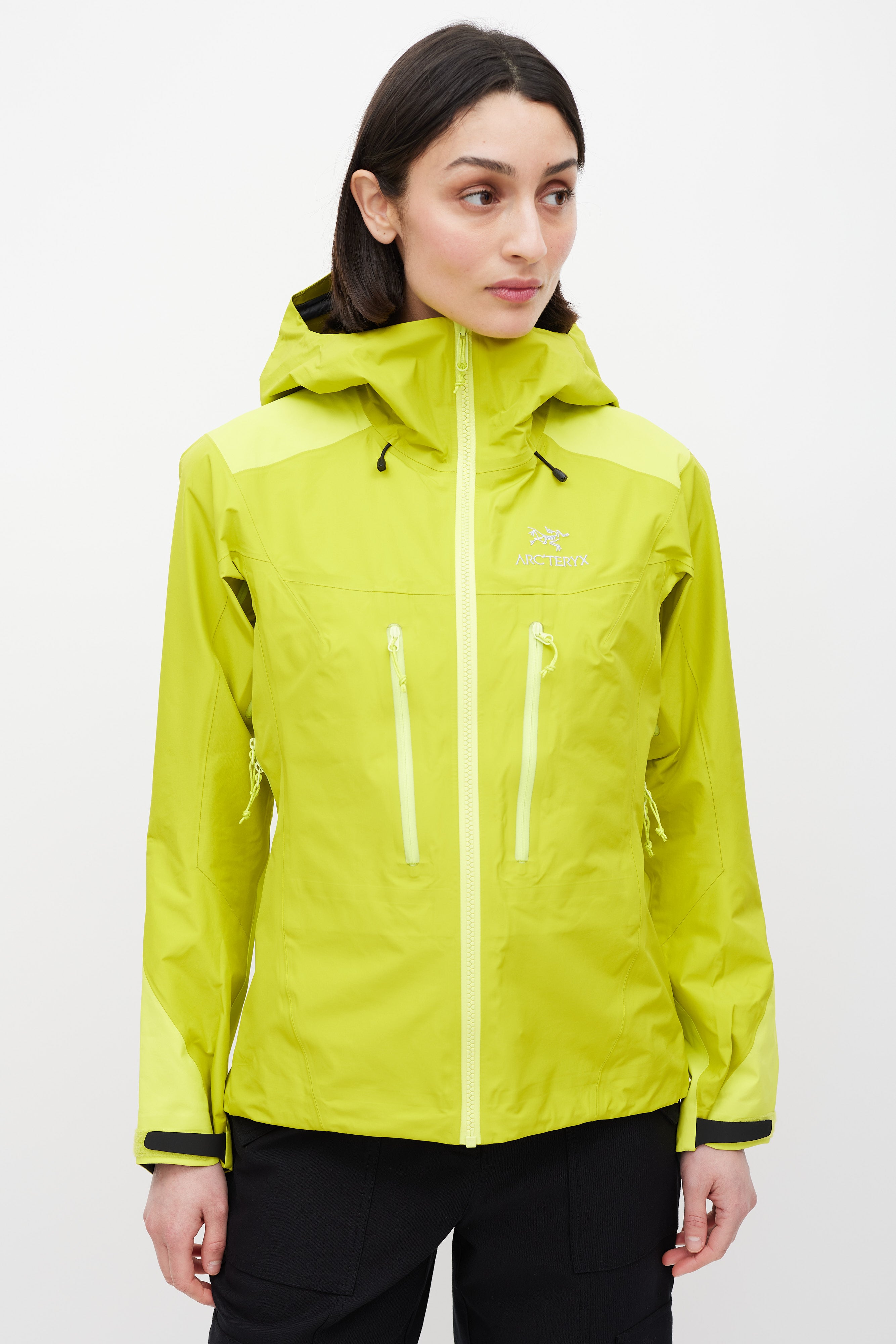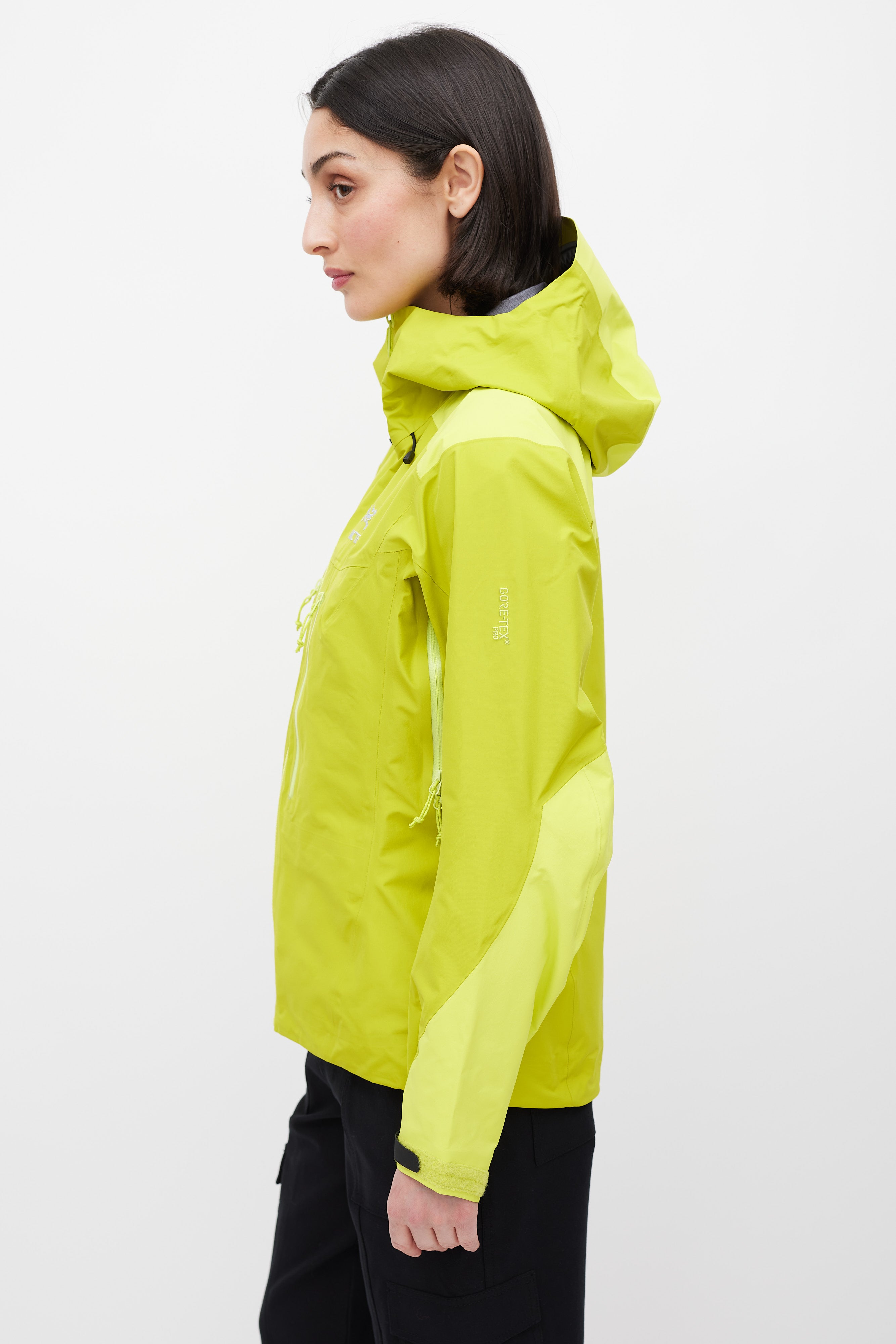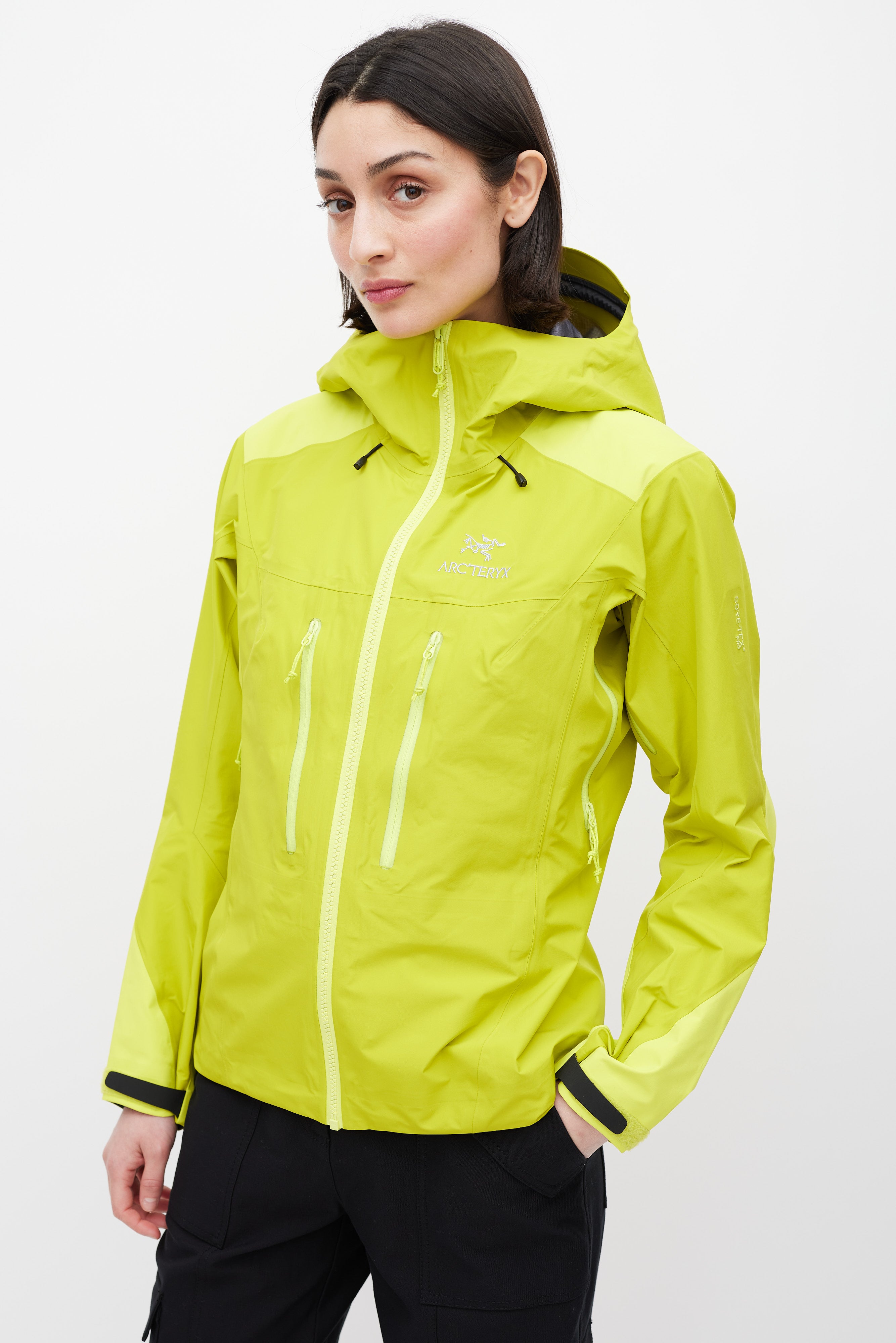 Arc'teryx yellow Alpha SV jacket featuring GORE-TEX textile throughout, concealed brim in hood, adjustable elasticated cord at back of hood, zip pockets at chest, zips at underarms, velcro fastening at cuffs, panelling throughout, embroidered logo at chest, single interior pocket, and adjustable elasticated cord at hem.
