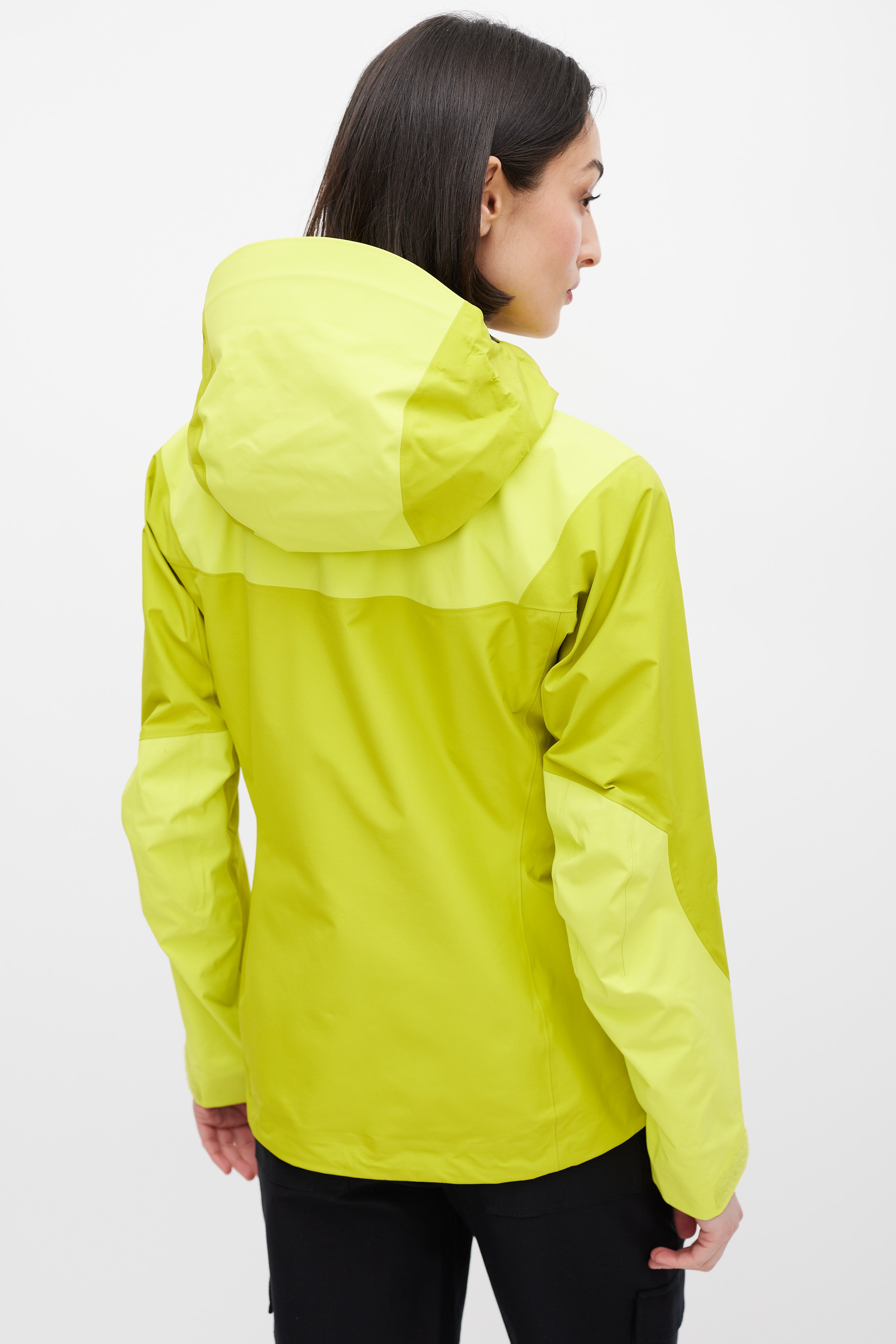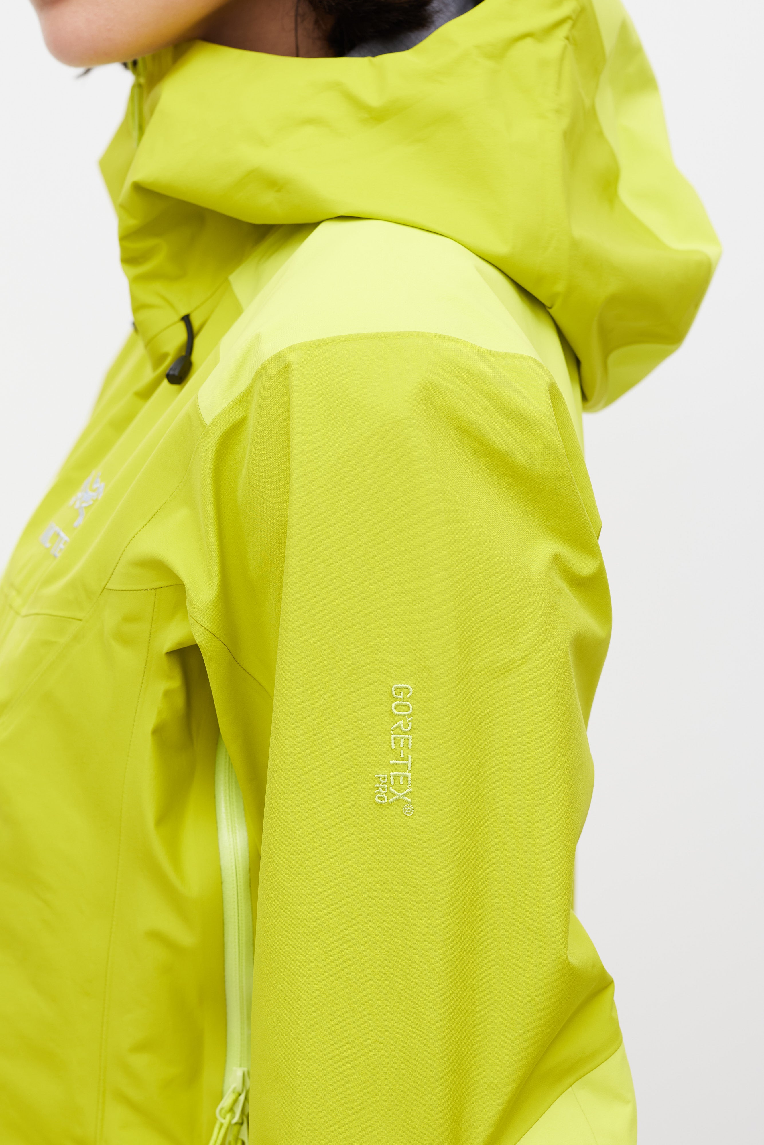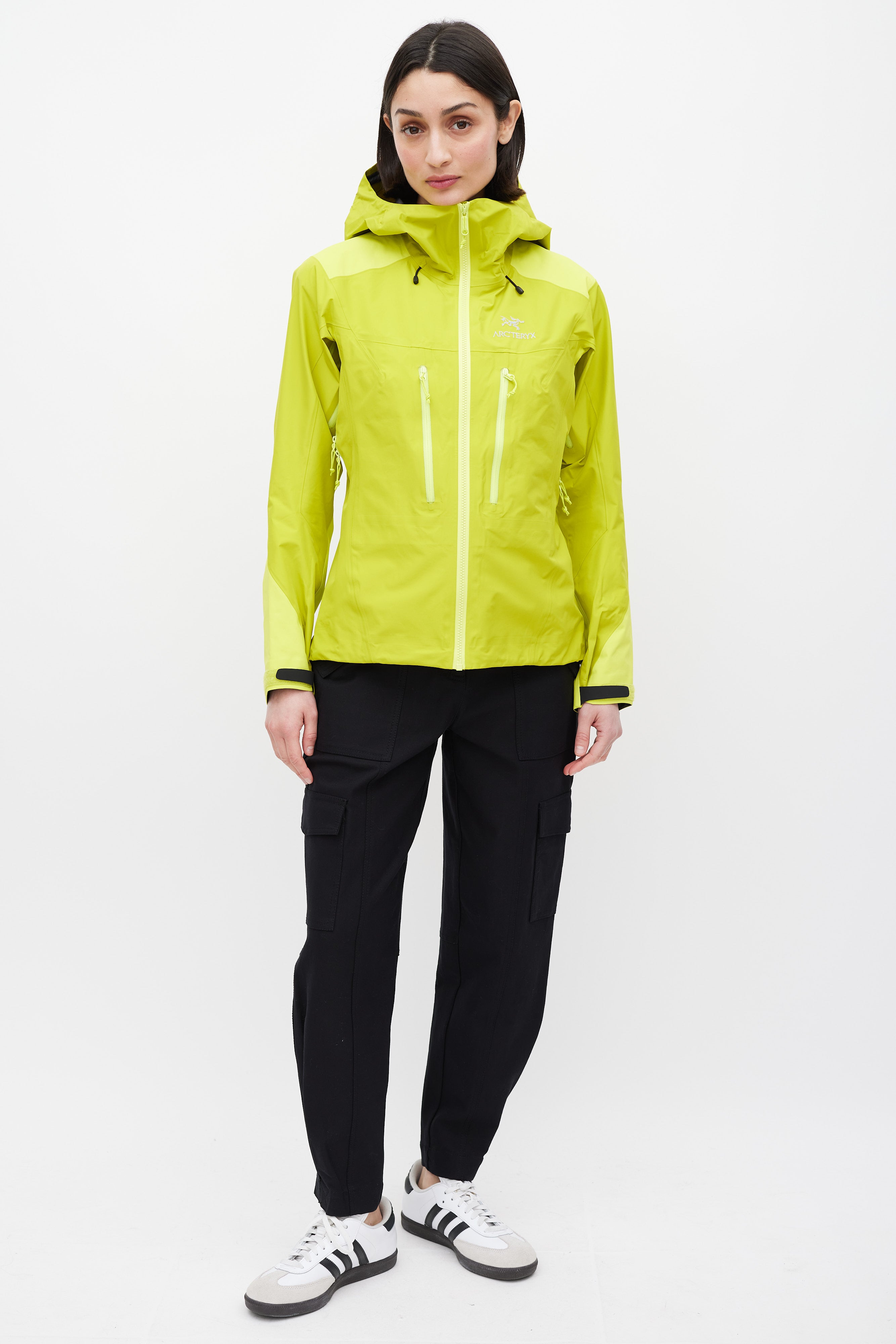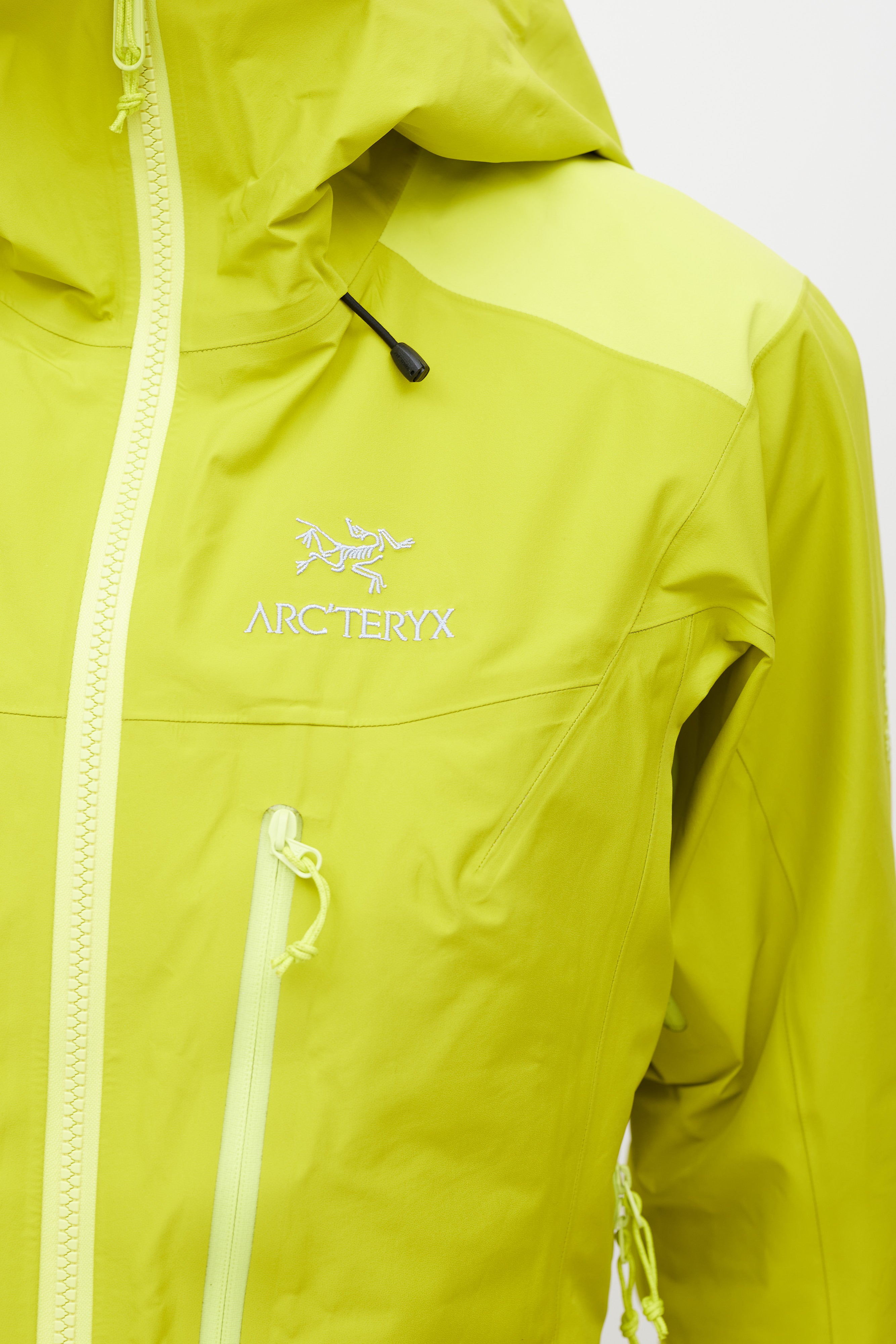 Arc'teryx yellow Alpha SV jacket featuring GORE-TEX textile throughout, concealed brim in hood, adjustable elasticated cord at back of hood, zip pockets at chest, zips at underarms, velcro fastening at cuffs, panelling throughout, embroidered logo at chest, single interior pocket, and adjustable elasticated cord at hem.