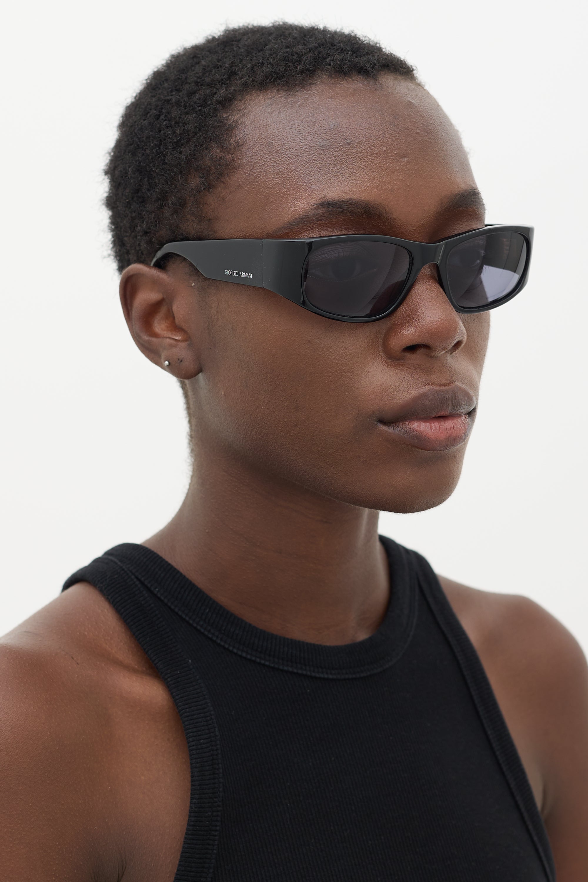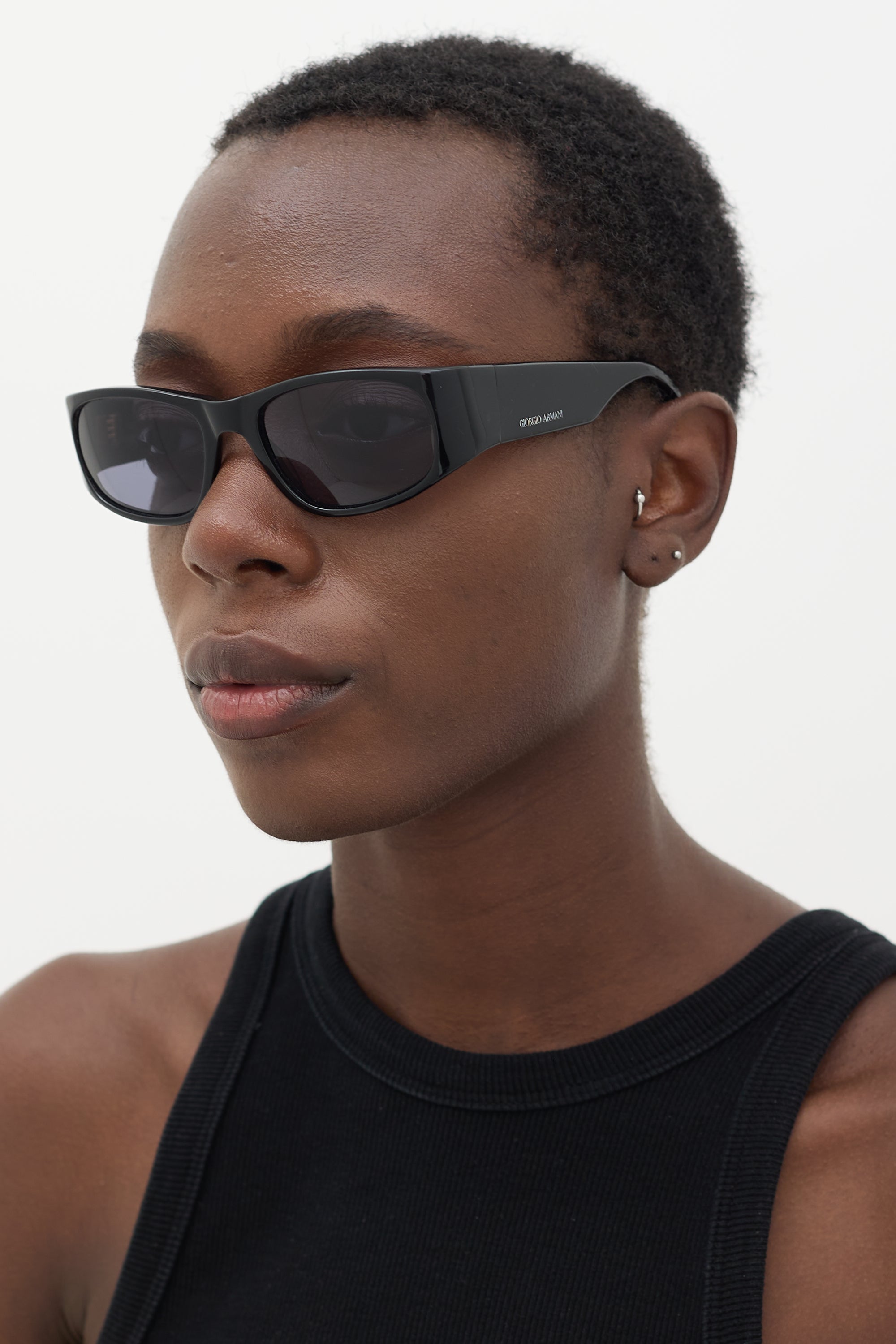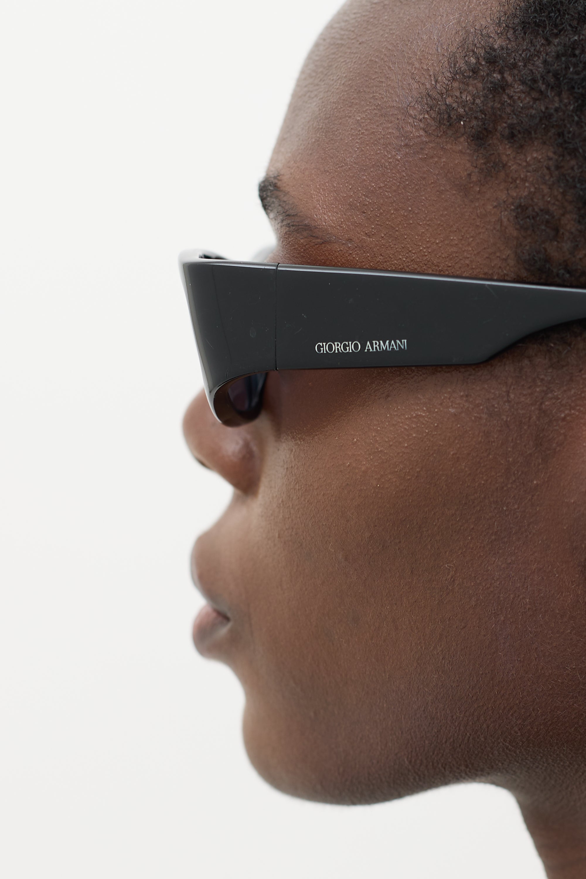 Pre-owned Armani black 906 020 sunglasses featuring tinted lenses, nose pads, straight brow bar, and printed logo at temples. comes with original case.