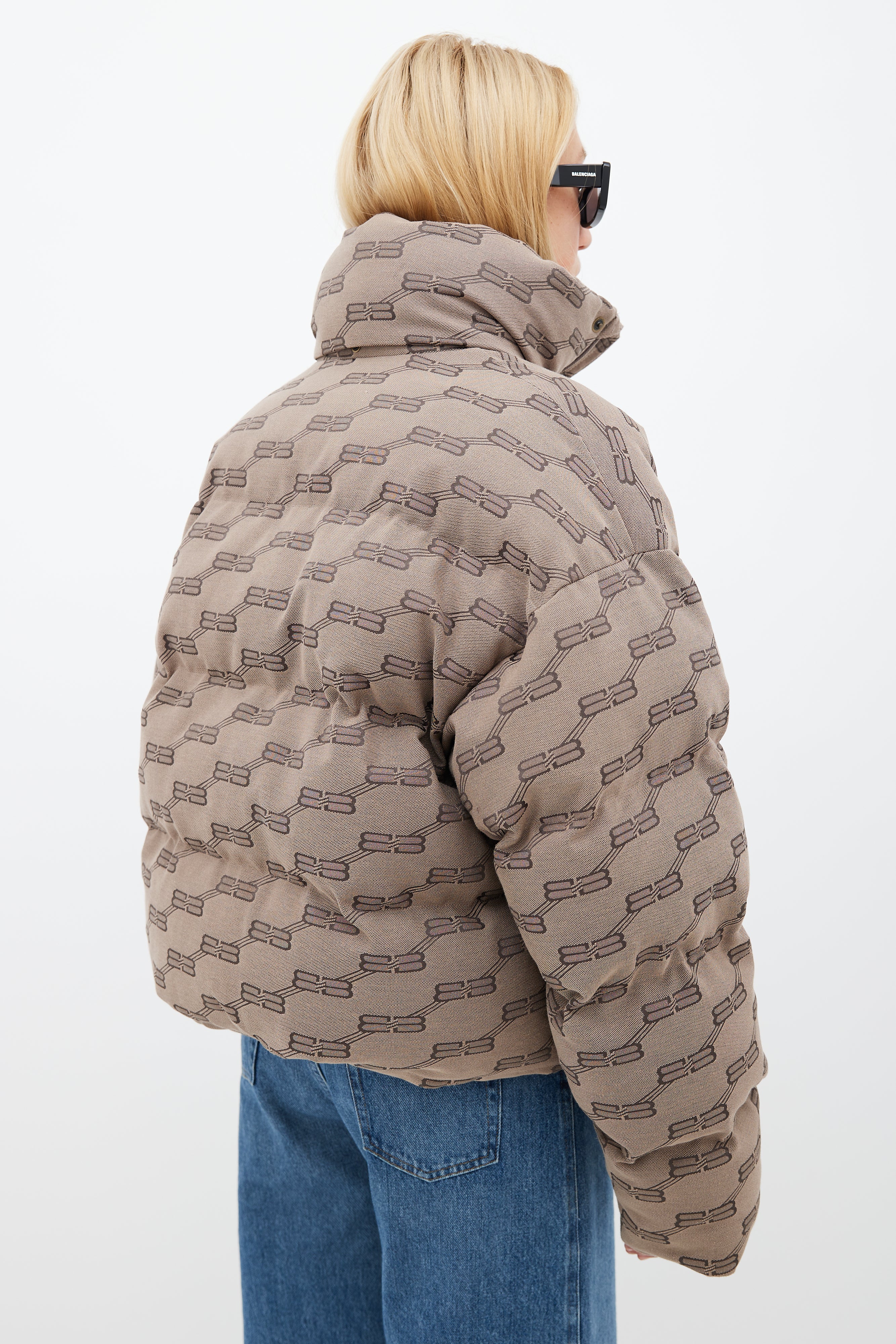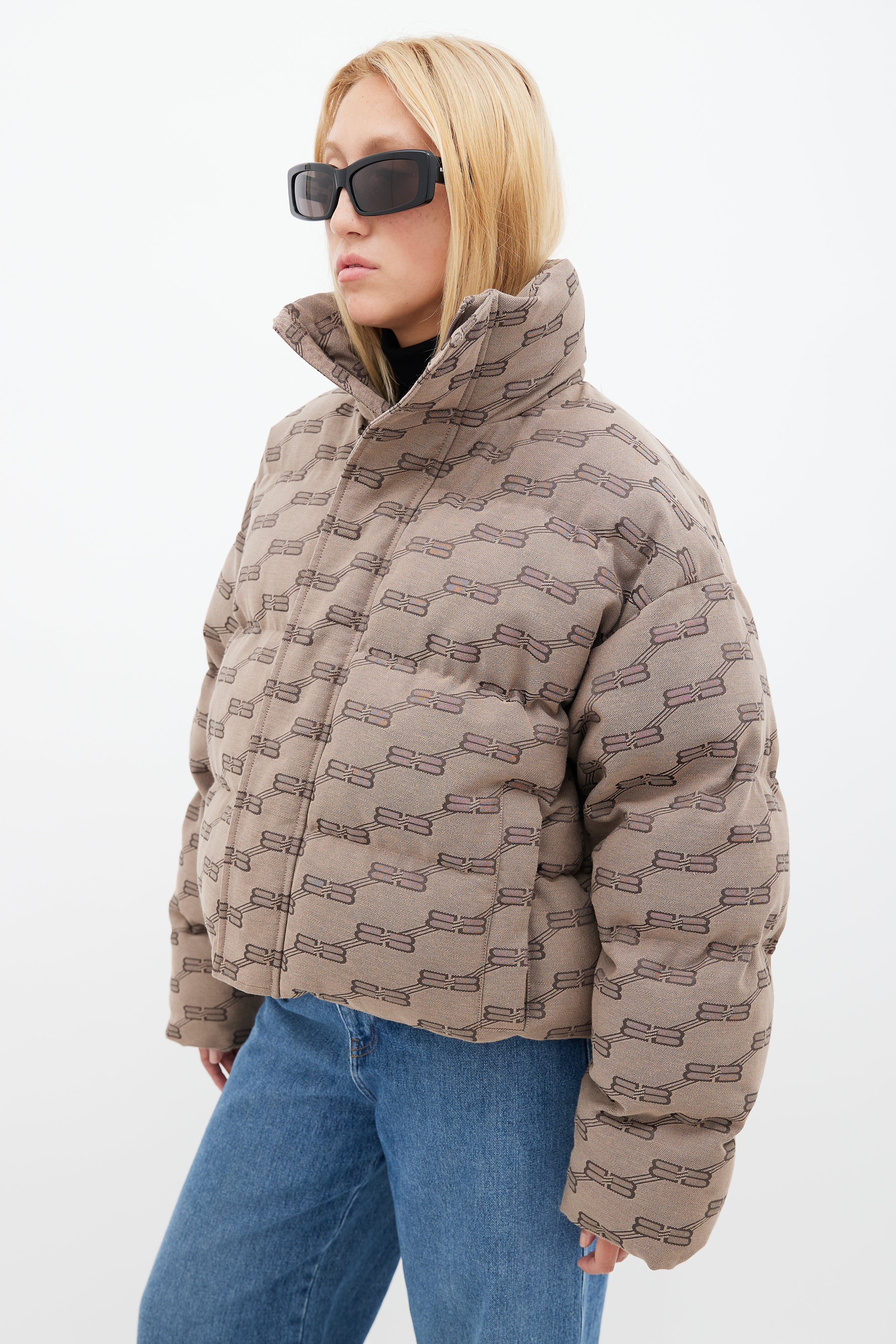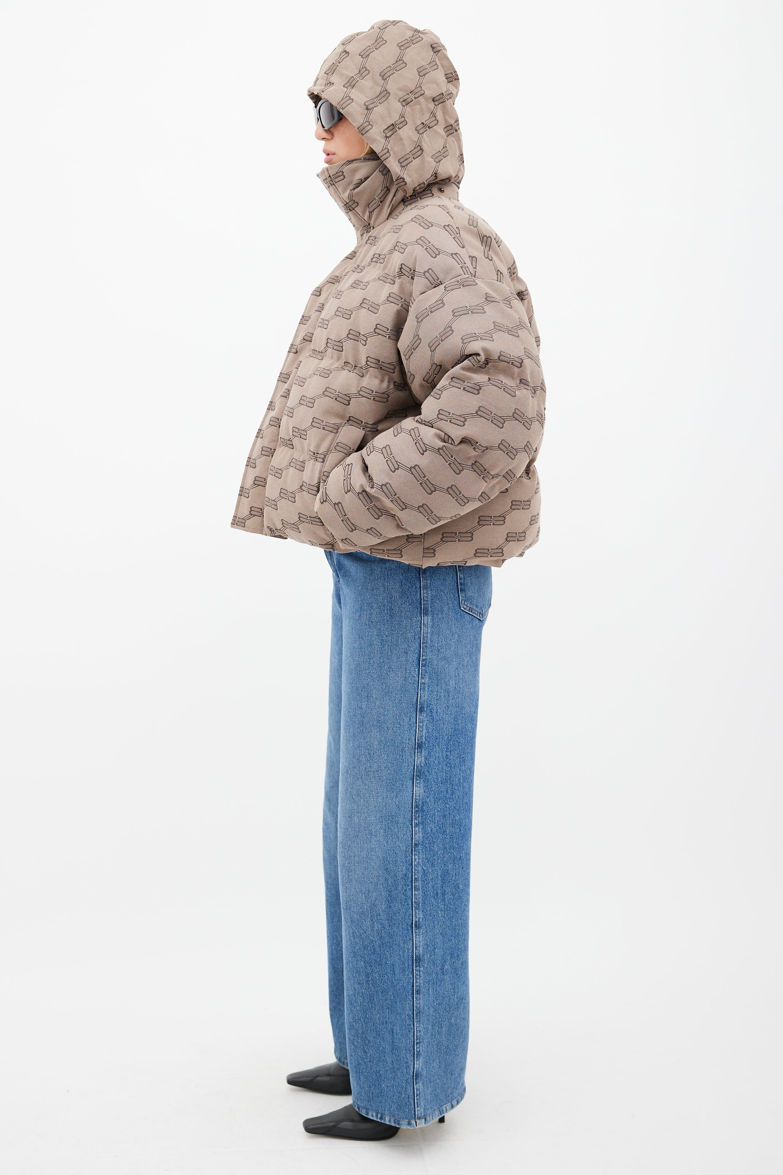 Pre-owned Balenciaga puffer jacket featuring a tonal BB monogram pattern throughout, concealed hood with drawstring, two slip pockets at hip, cropped fit, and zip front with button closure. Lined.