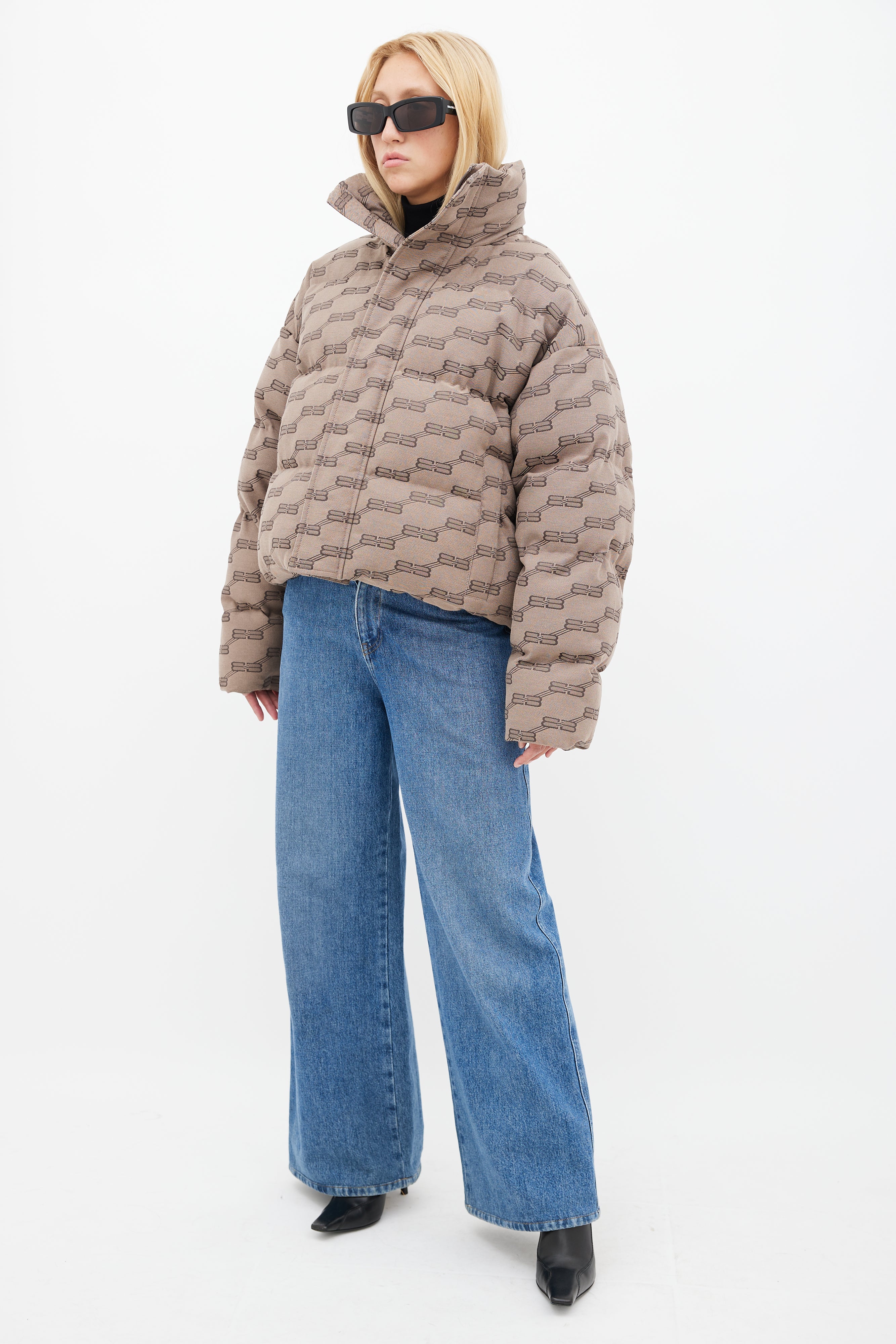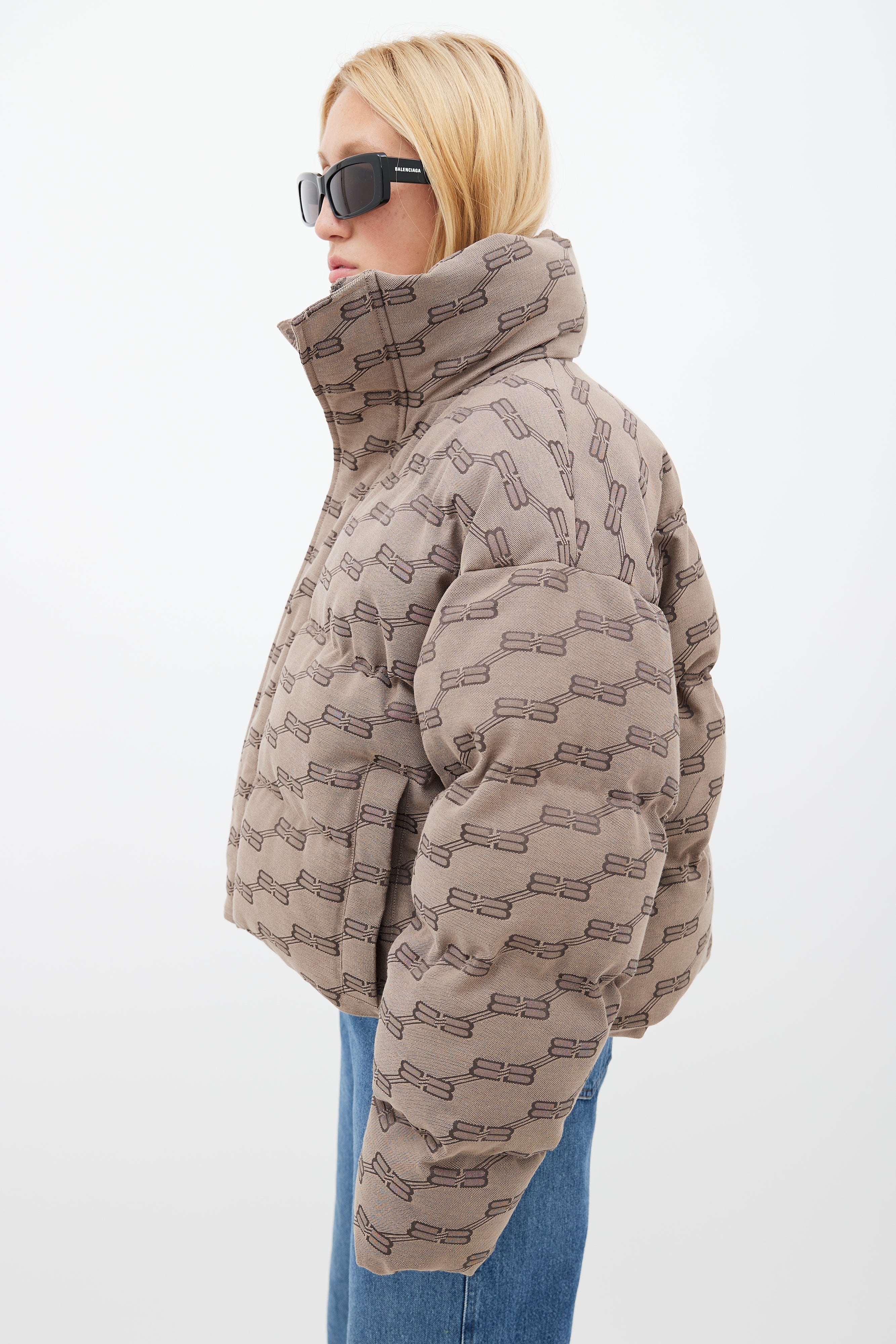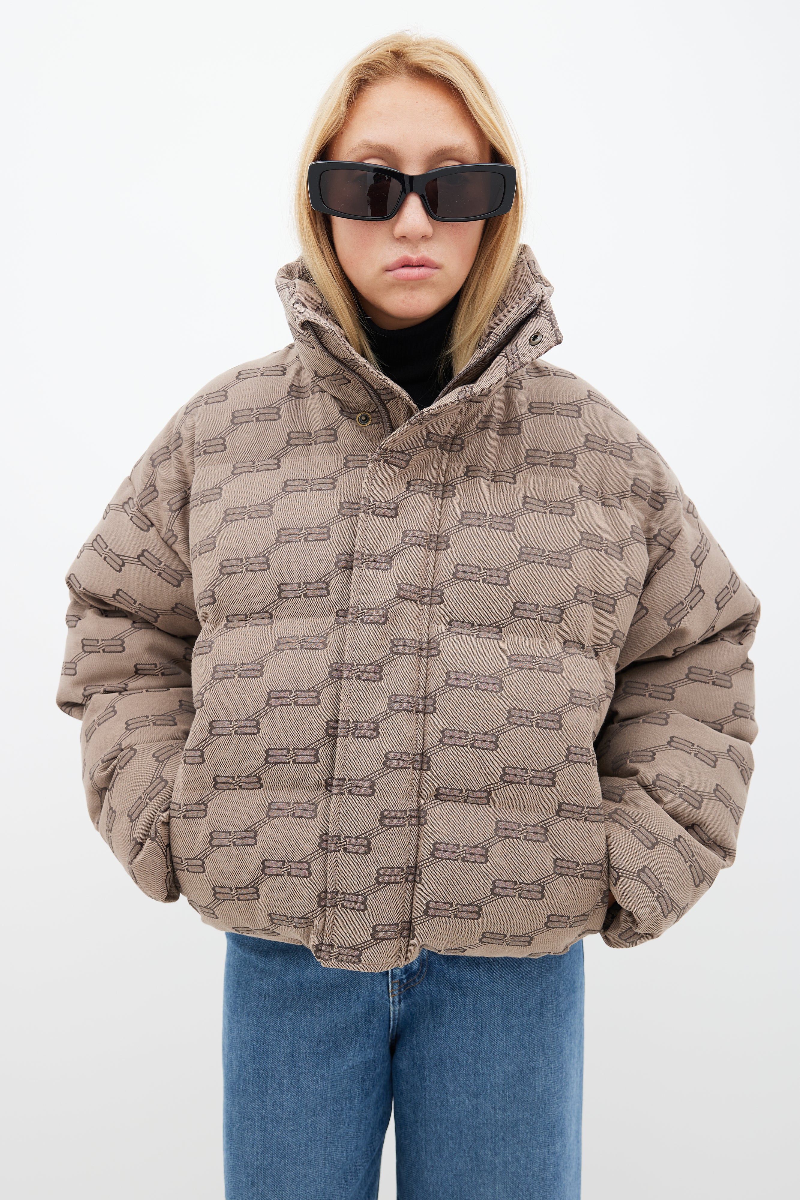 Pre-owned Balenciaga puffer jacket featuring a tonal BB monogram pattern throughout, concealed hood with drawstring, two slip pockets at hip, cropped fit, and zip front with button closure. Lined.