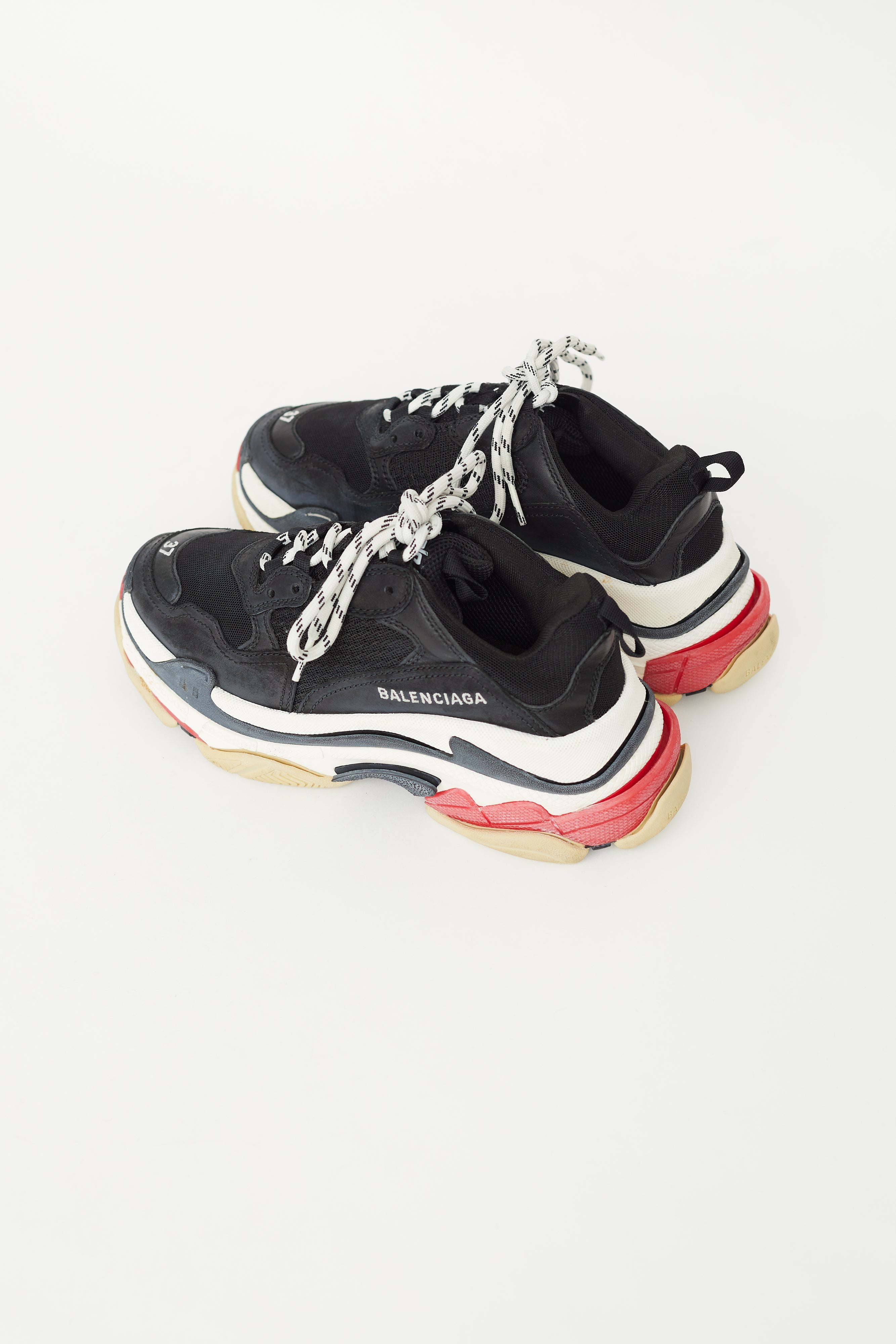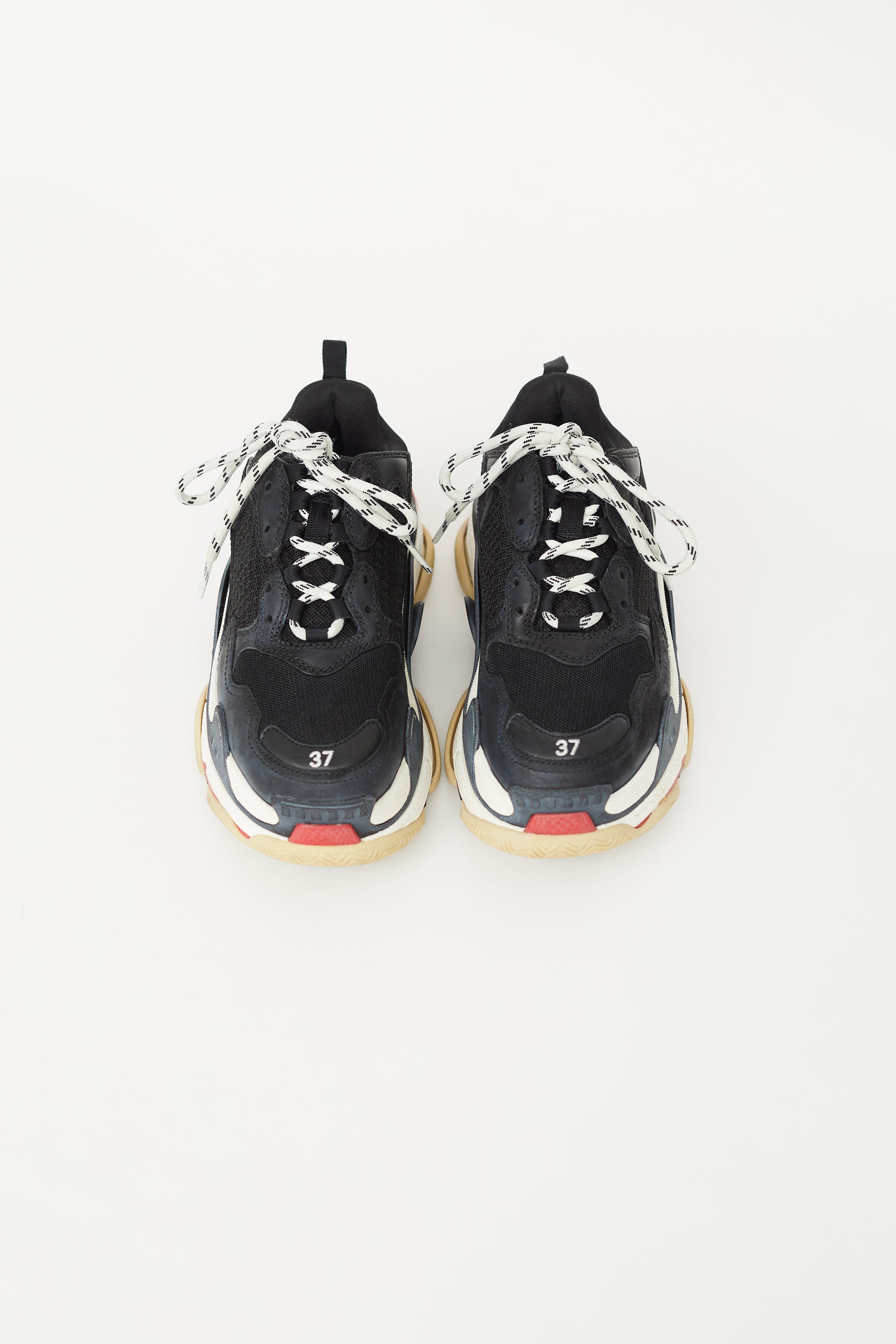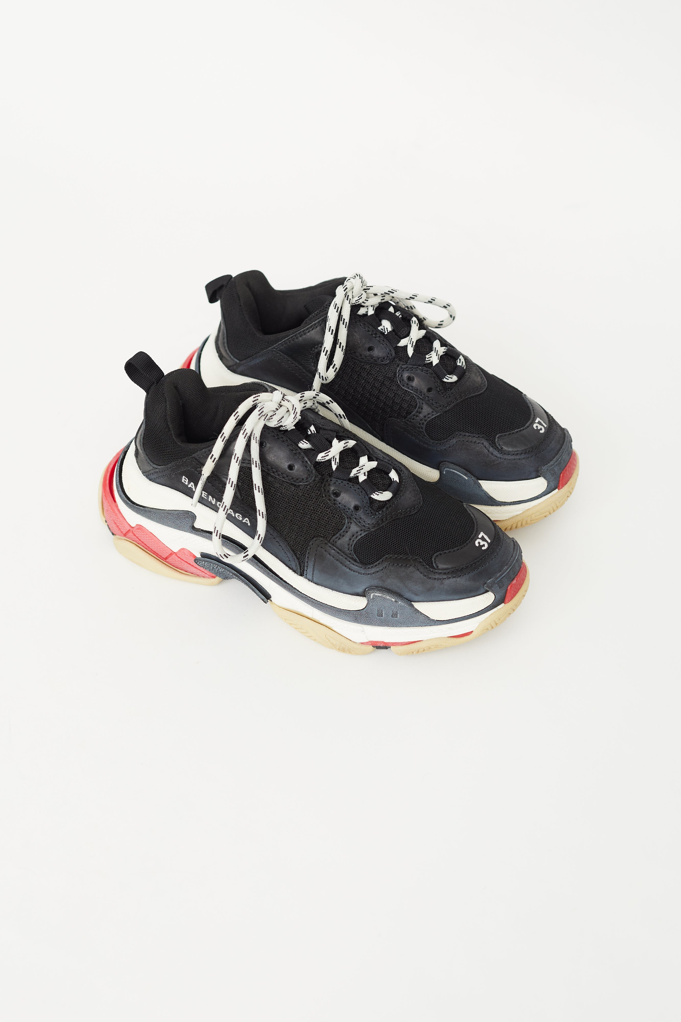 Pre-owned Balenciaga black Triple S sneaker featuring rounded toe, leather and mesh panelling at upper, cord lace up vamp, pull tab at heel and tongue, white and red chunky midsole, and embroidered "37" at toe.