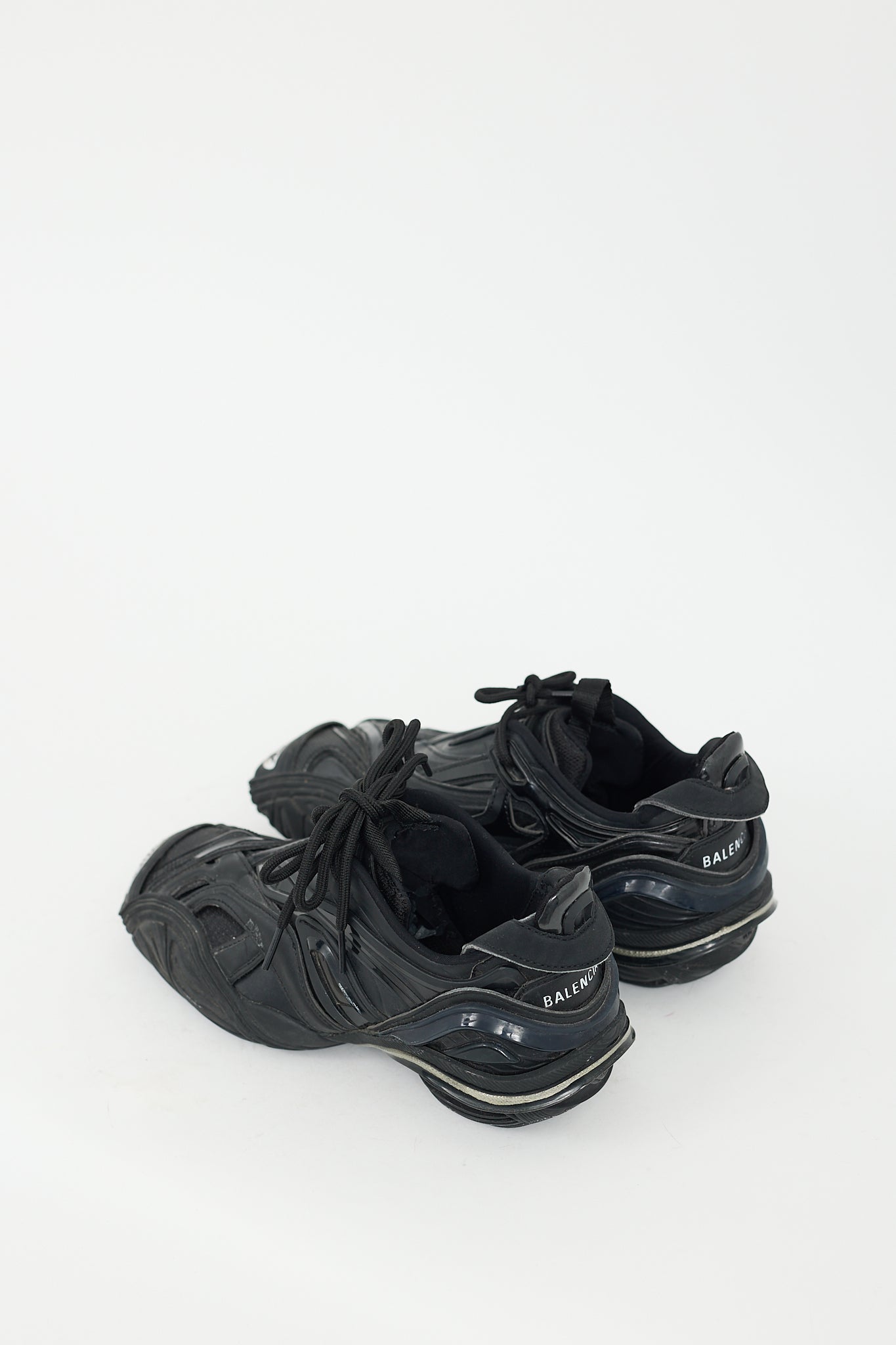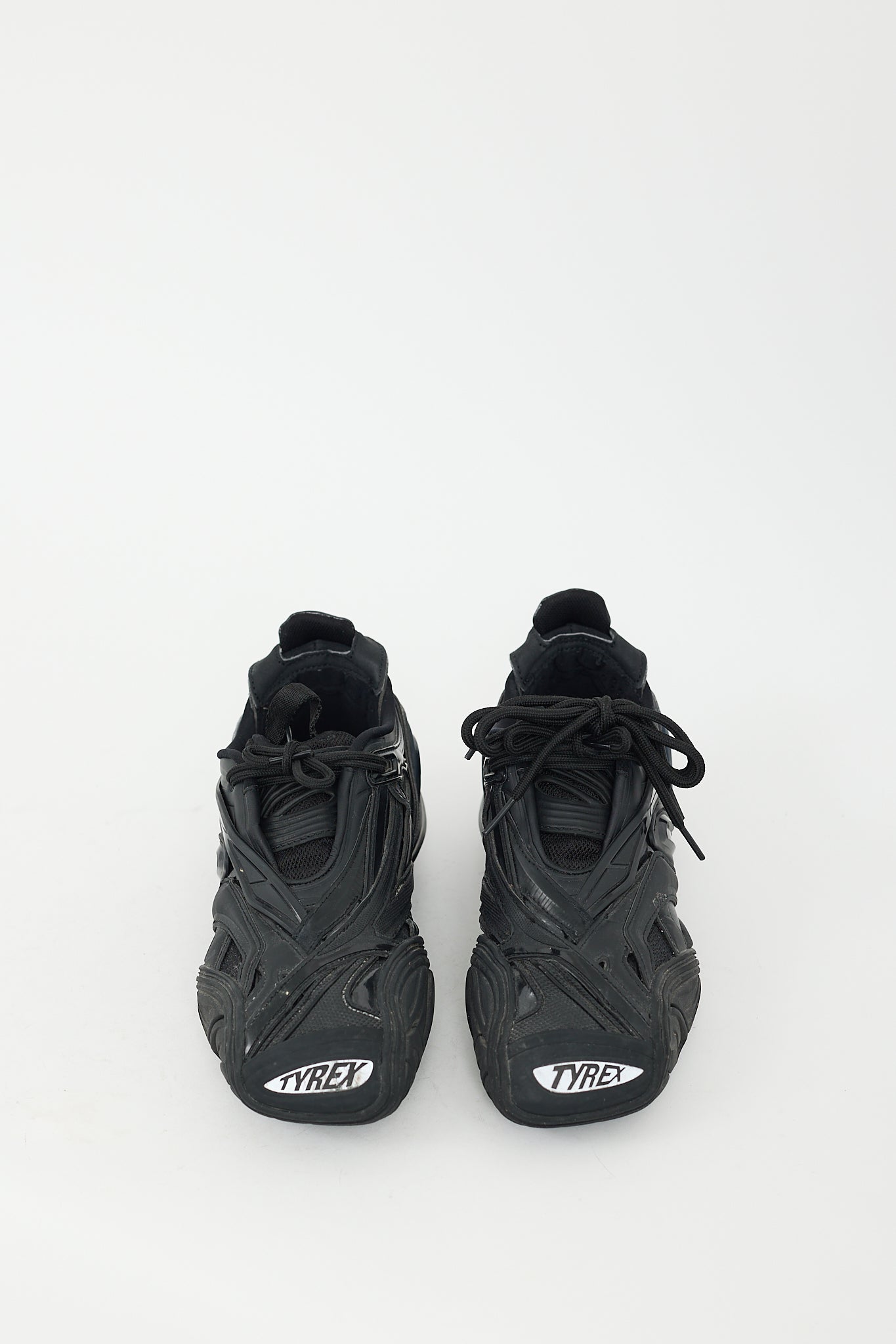 Pre-owned Balenciaga black Tyrex sneakers featuring exaggerated square toe, rubberized cut out panelling throughout, single lace up vamp, split outsole, and debossed "Tyrex" lettering at toe. Comes with extra set of shoelaces.
