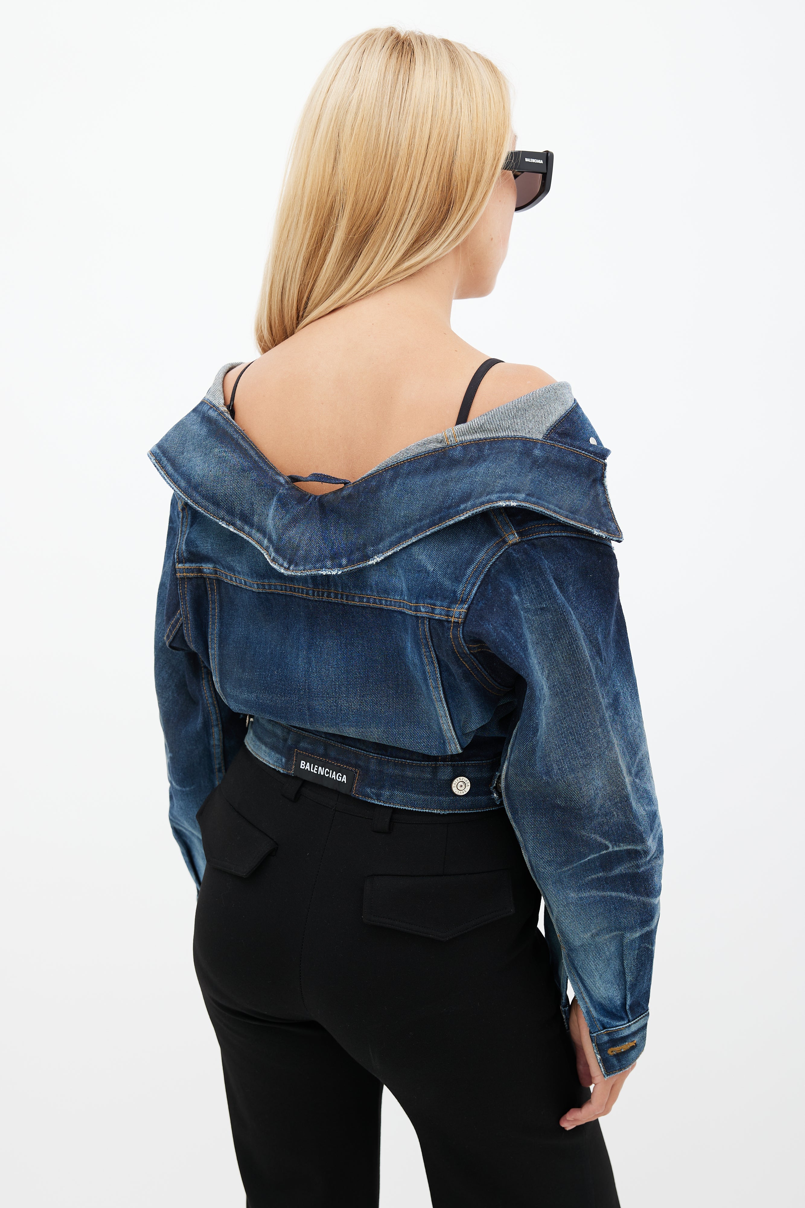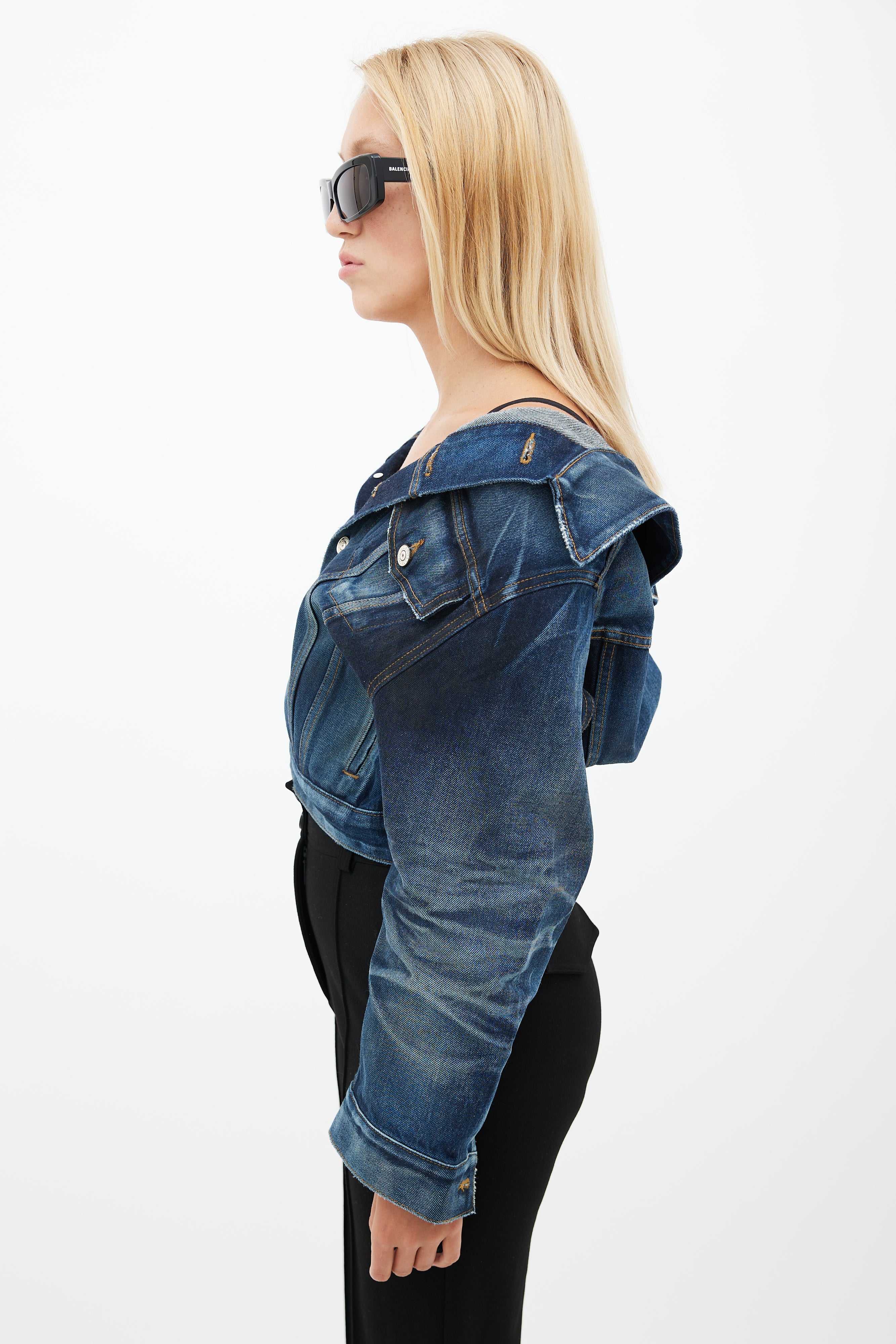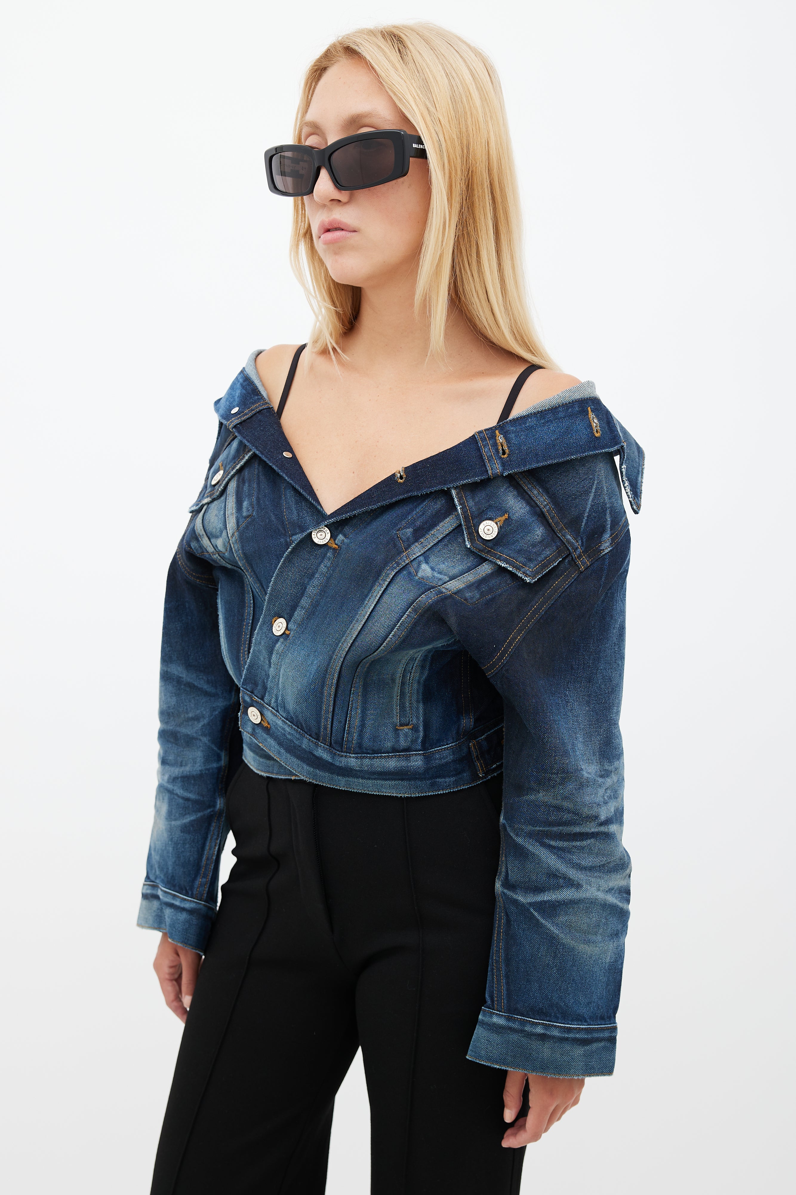 Pre-owned Balenciaga blue Swing darkwash denim jacket featuring an off the shoulder pointed collar, two buttoned pockets at chest, long sleeves with buttoned cuffs, and button up front.