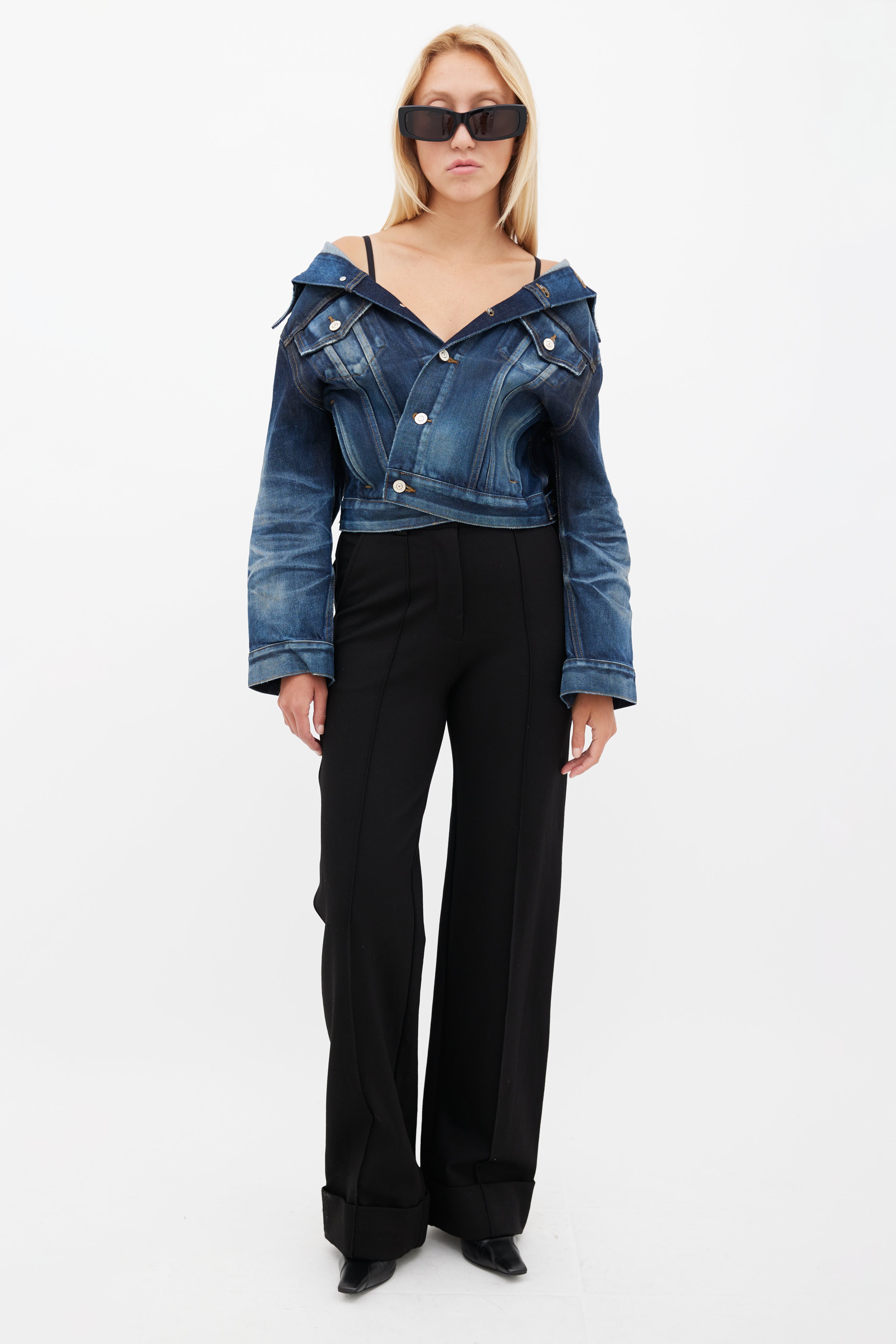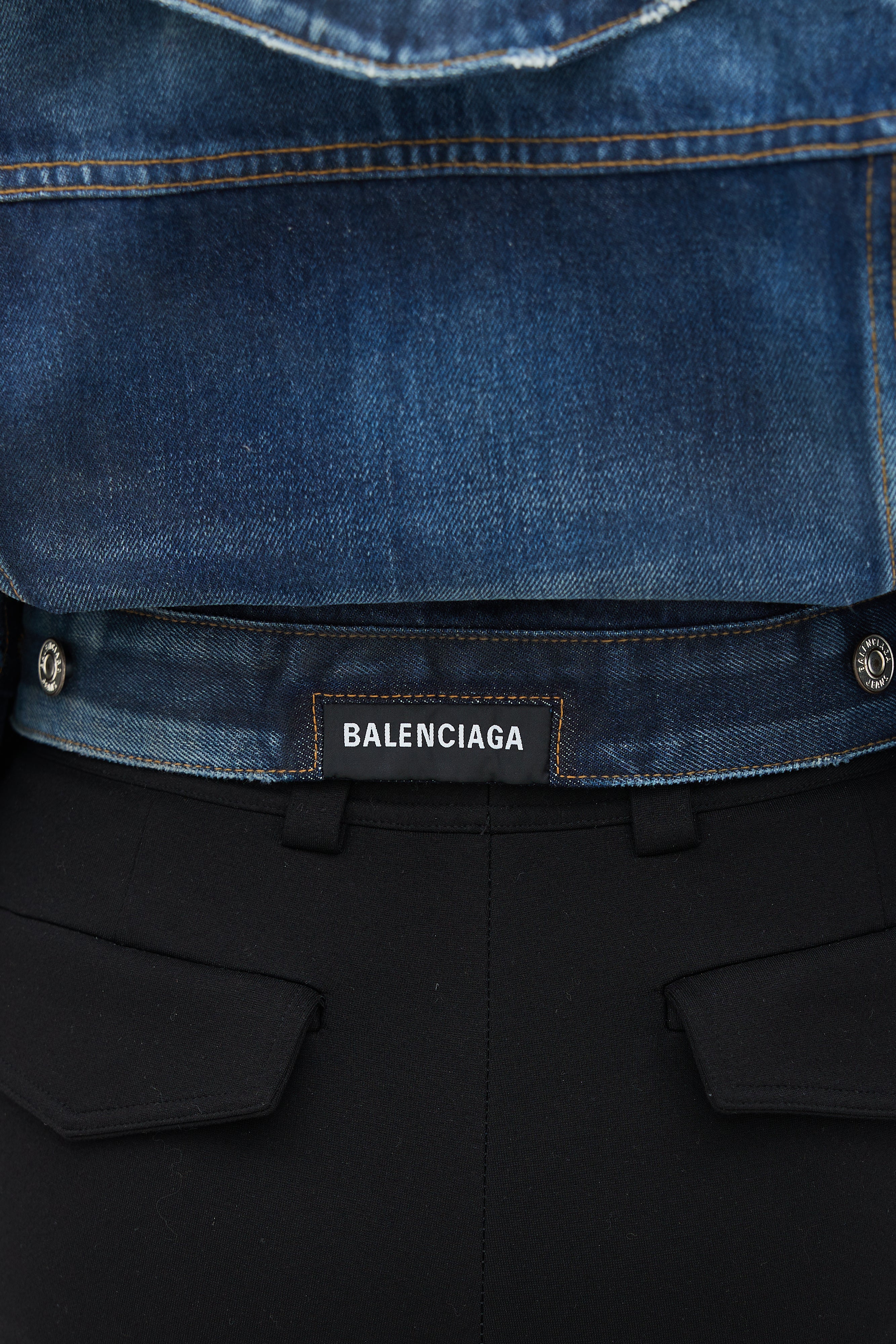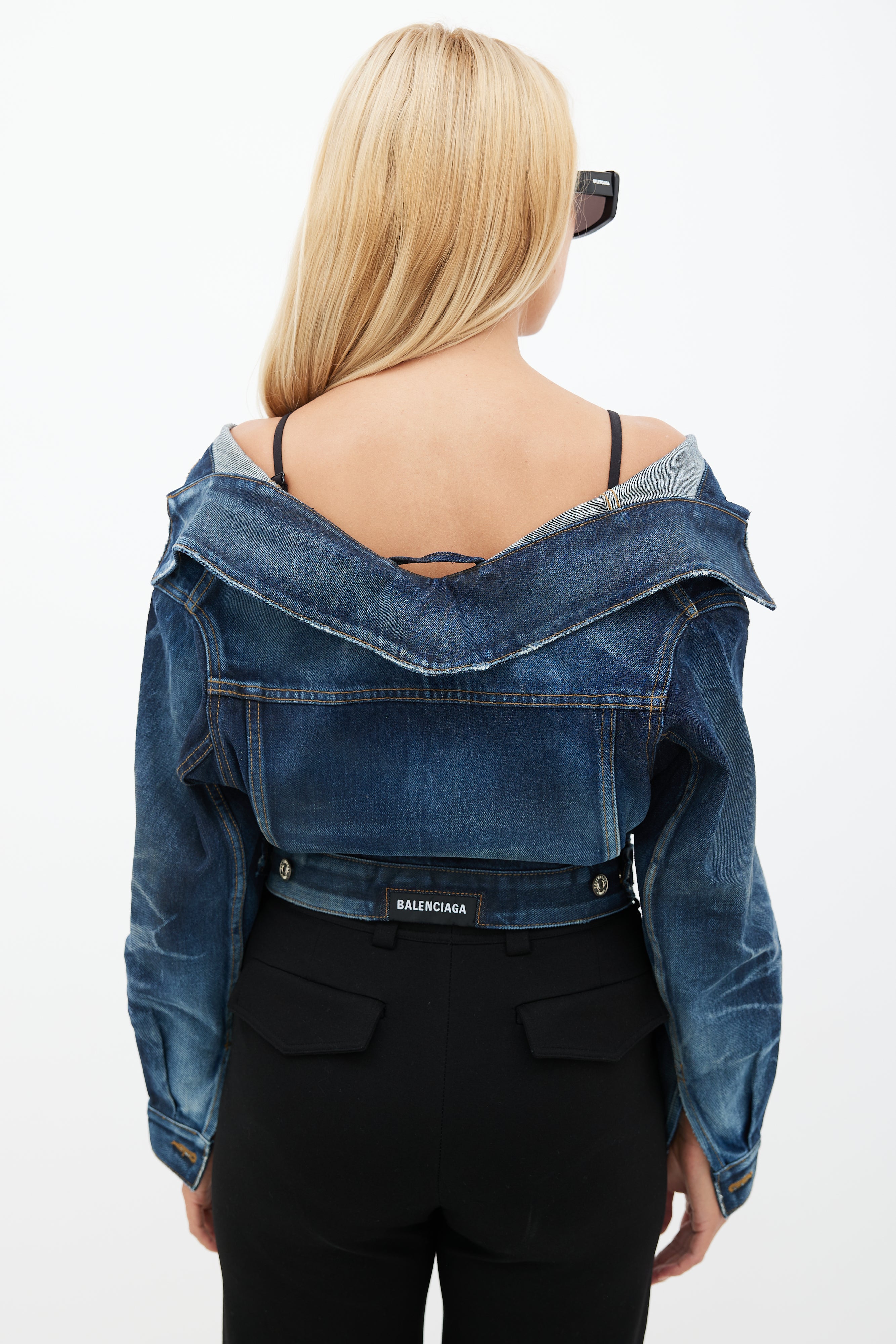Pre-owned Balenciaga blue Swing darkwash denim jacket featuring an off the shoulder pointed collar, two buttoned pockets at chest, long sleeves with buttoned cuffs, and button up front.