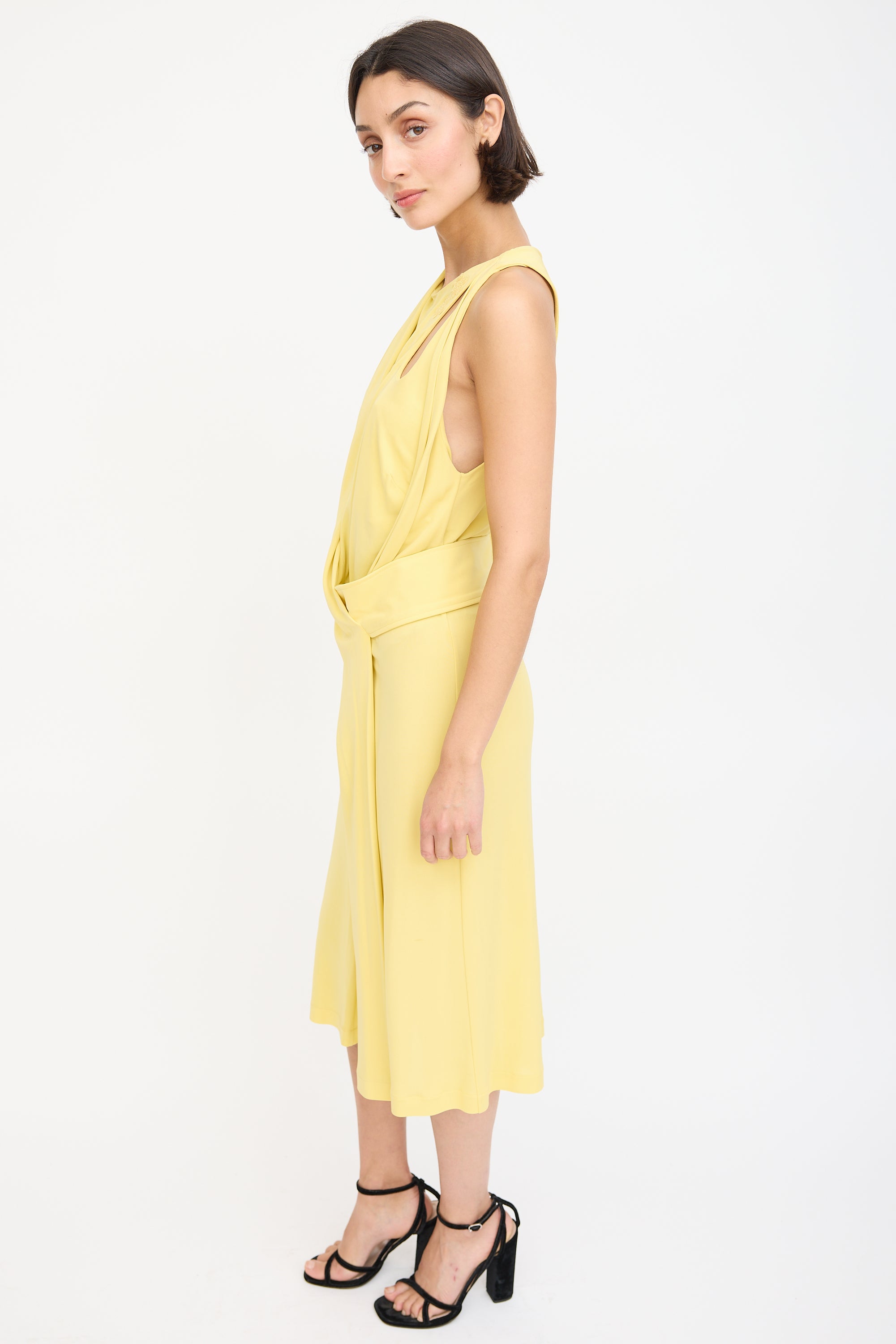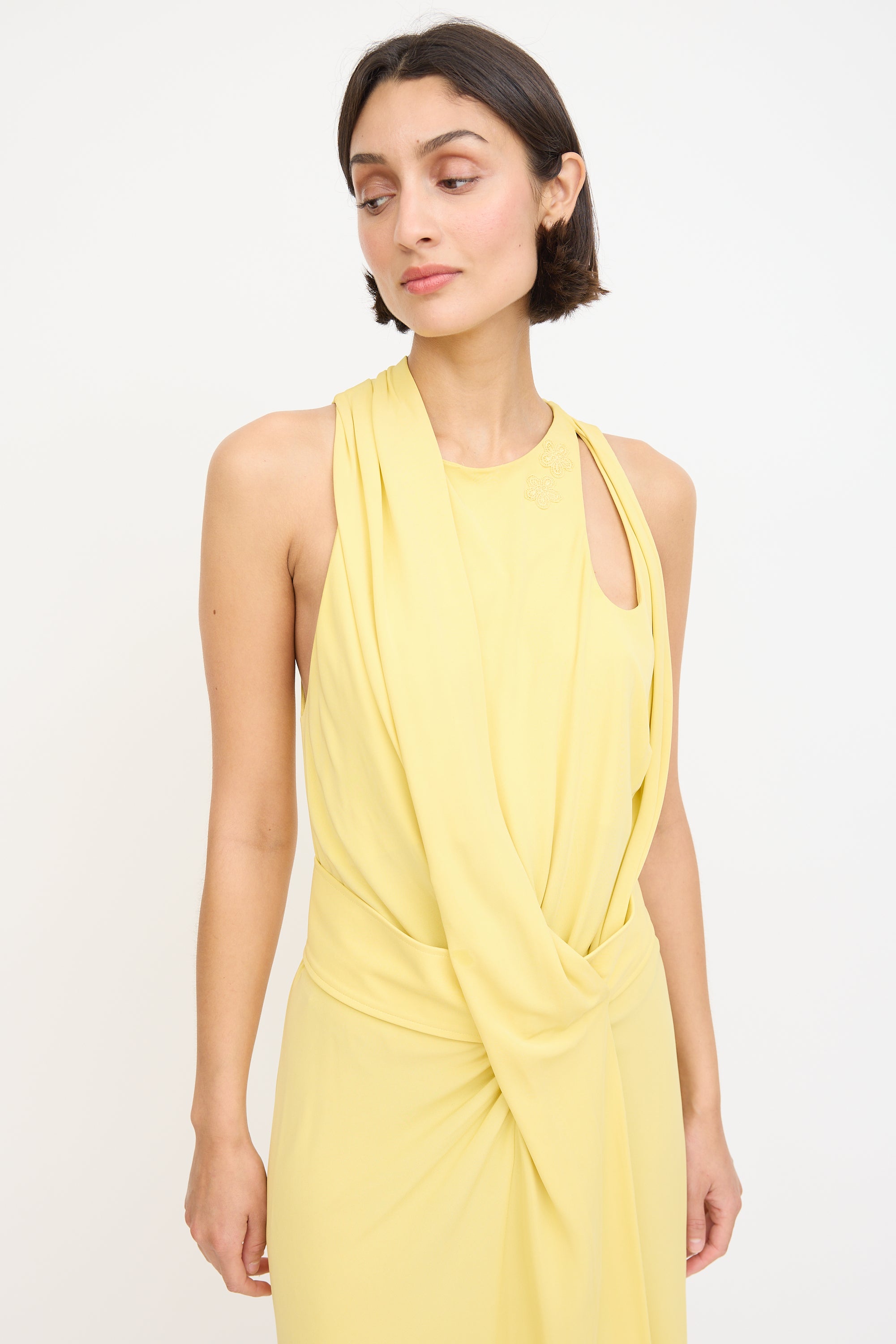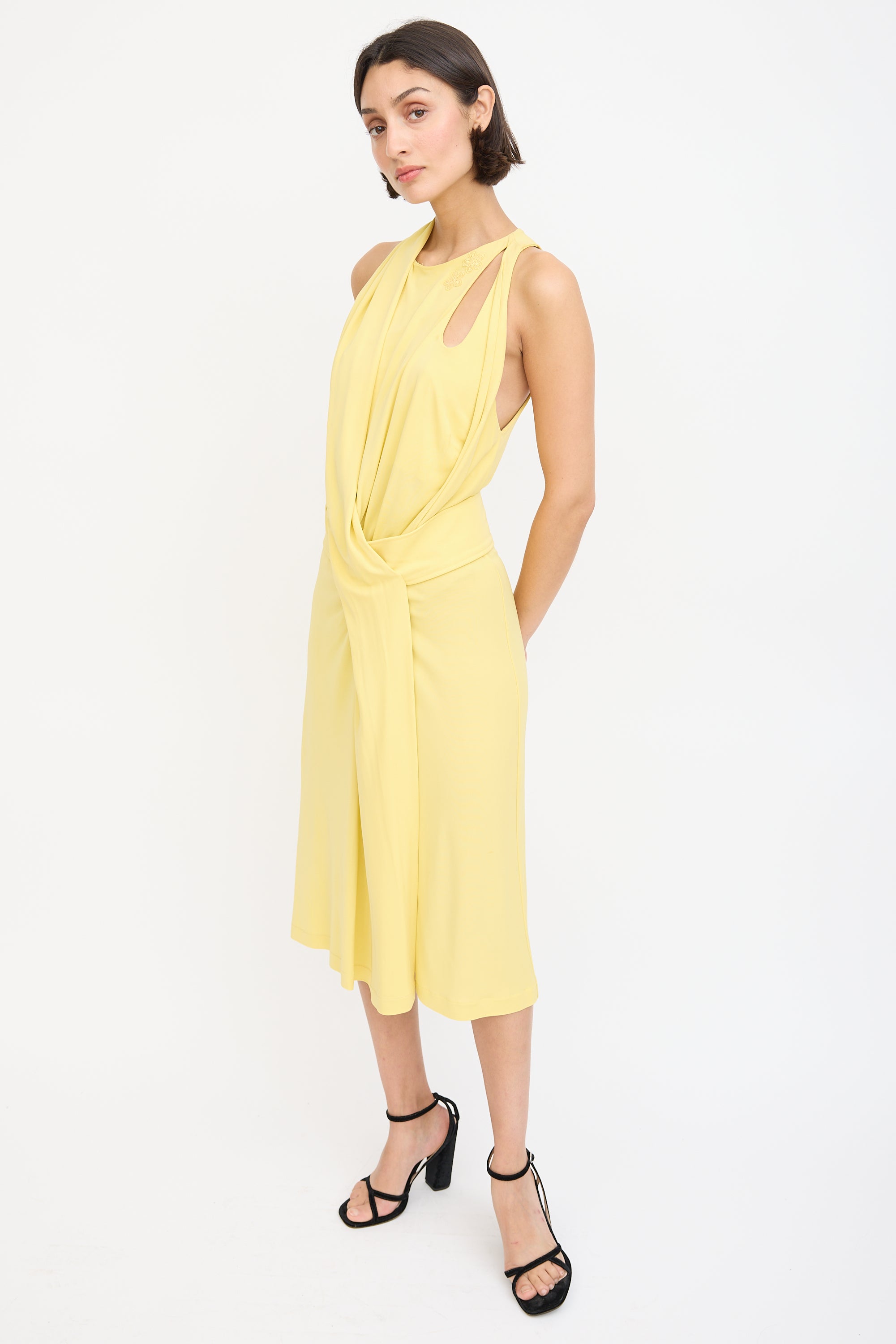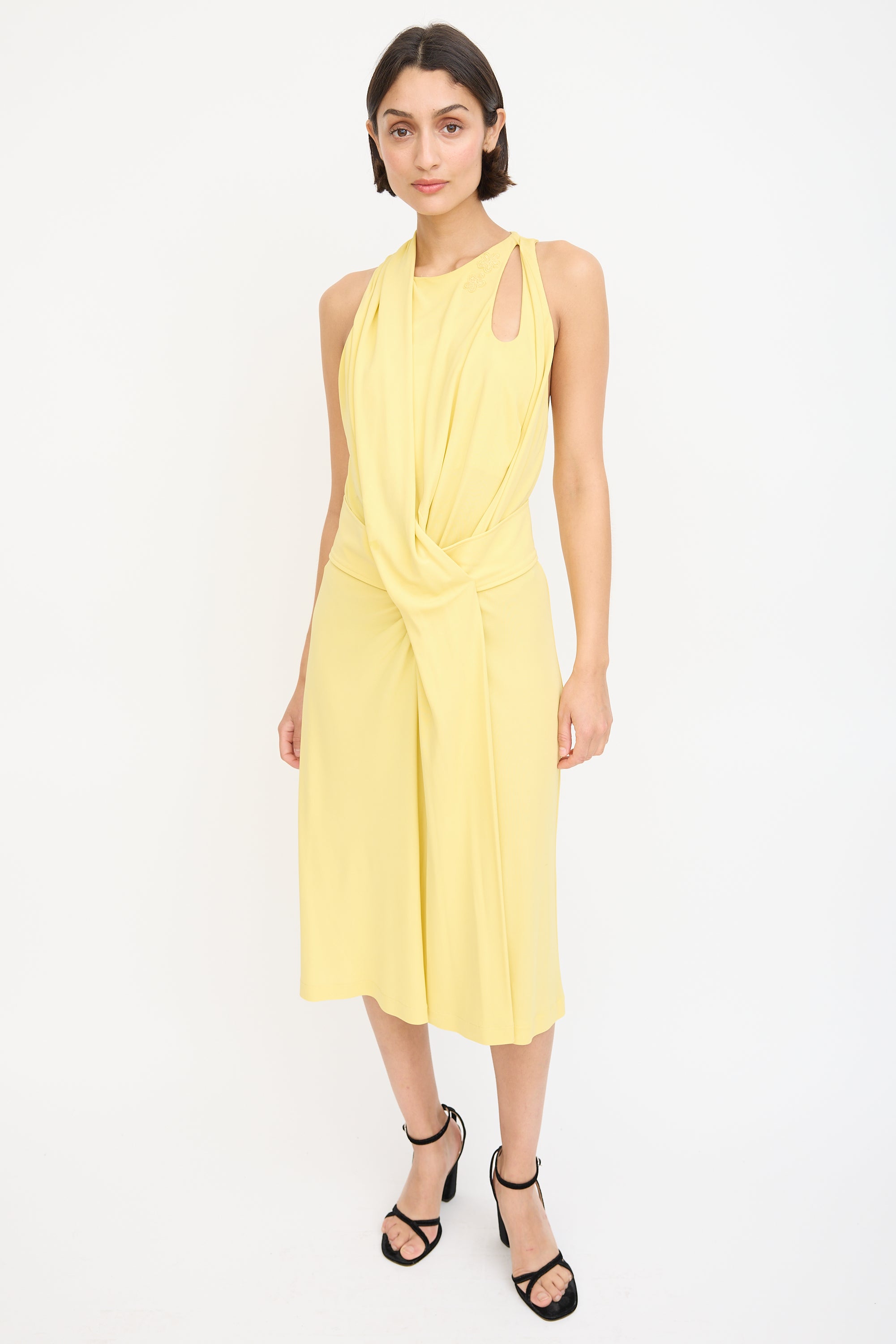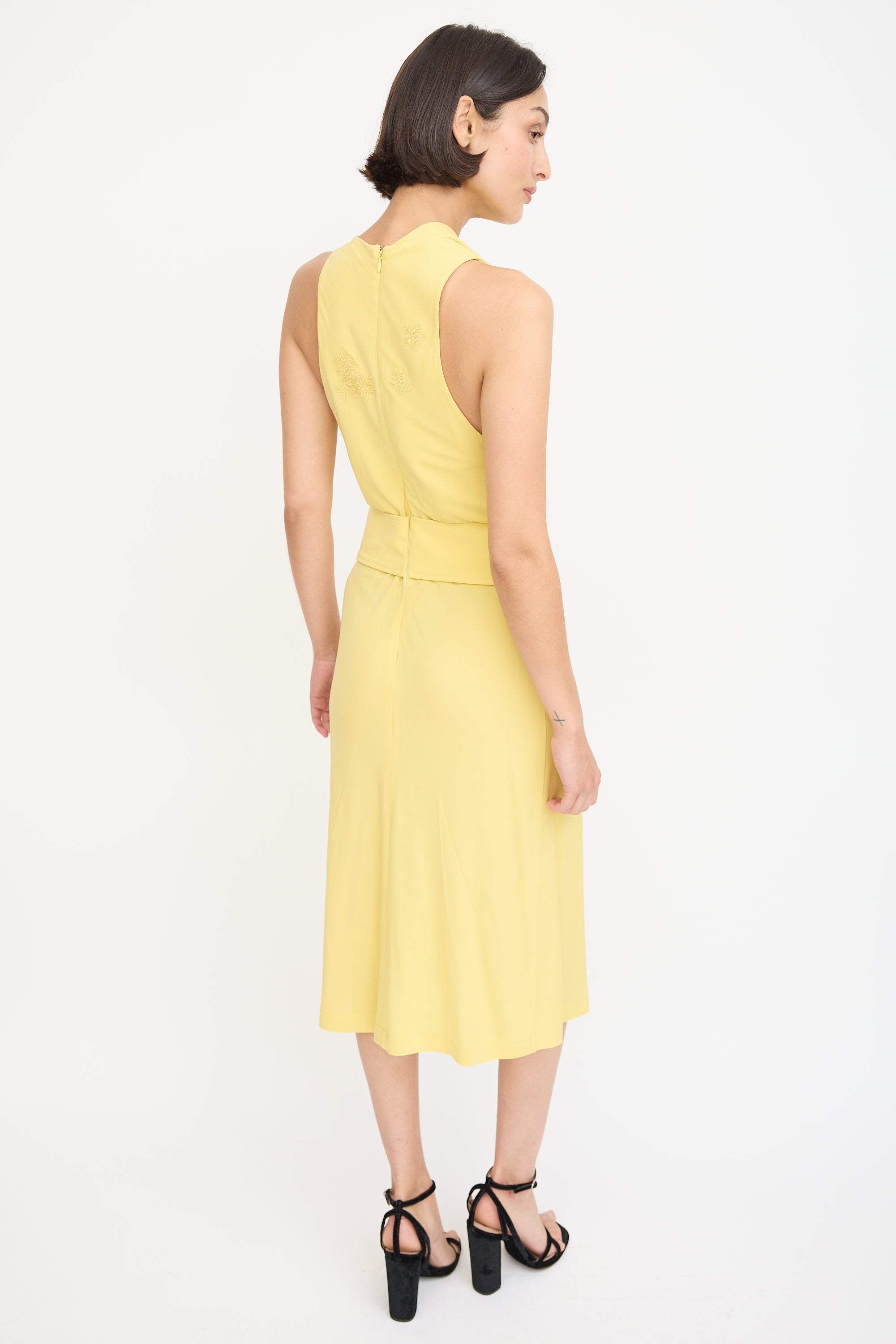 Pre-owned Balenciaga yellow sleeveless midi dress featuring a round neck, sash detail at waist, cutout at left chest, floral appliques throughout upper, front slit, and concealed back zip.
