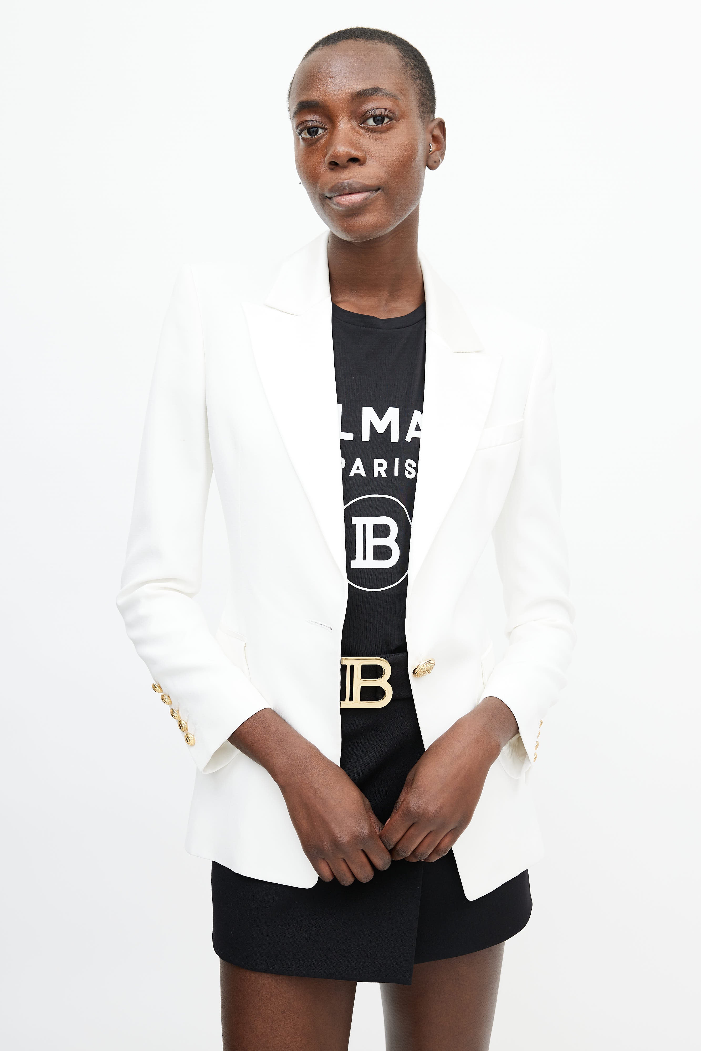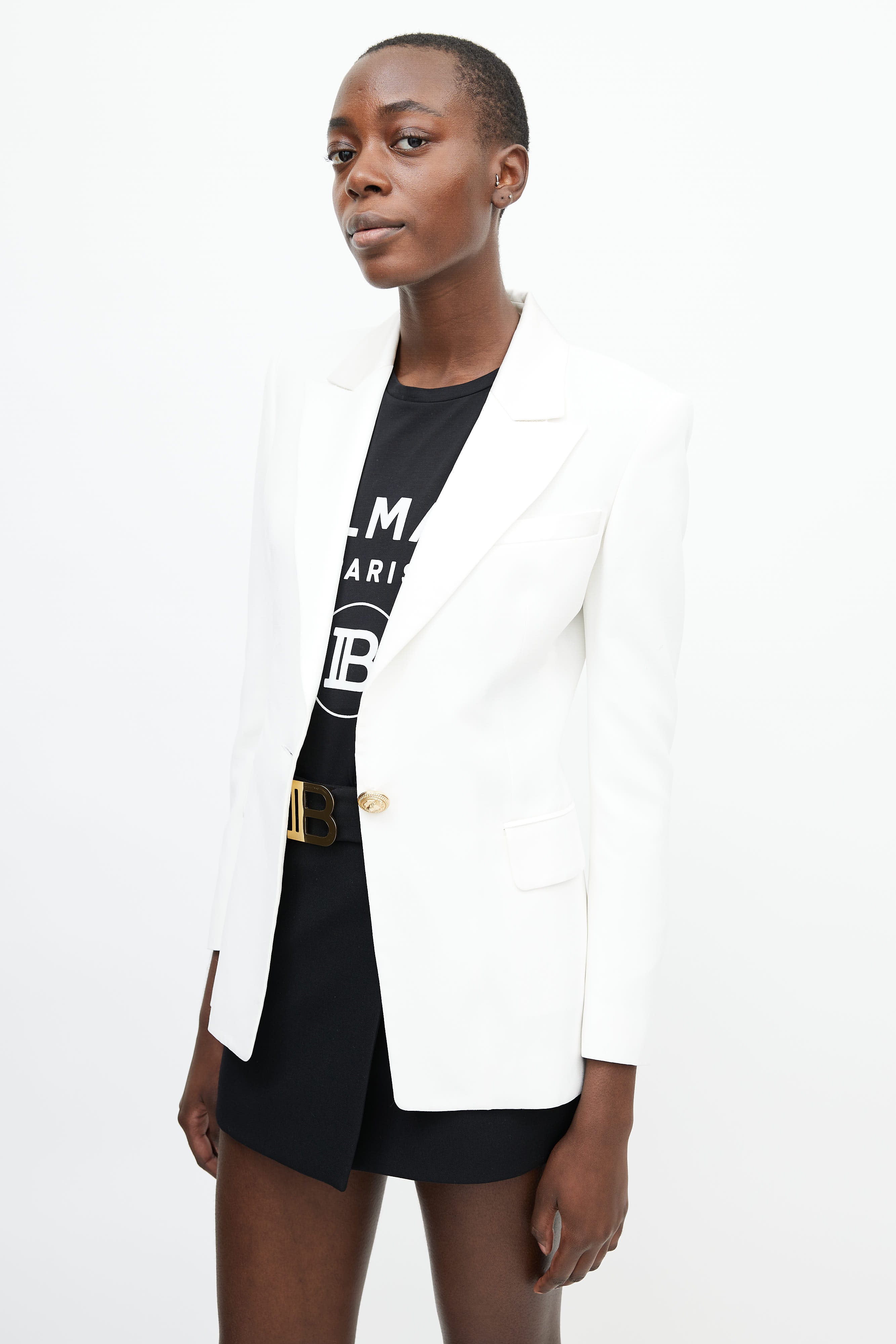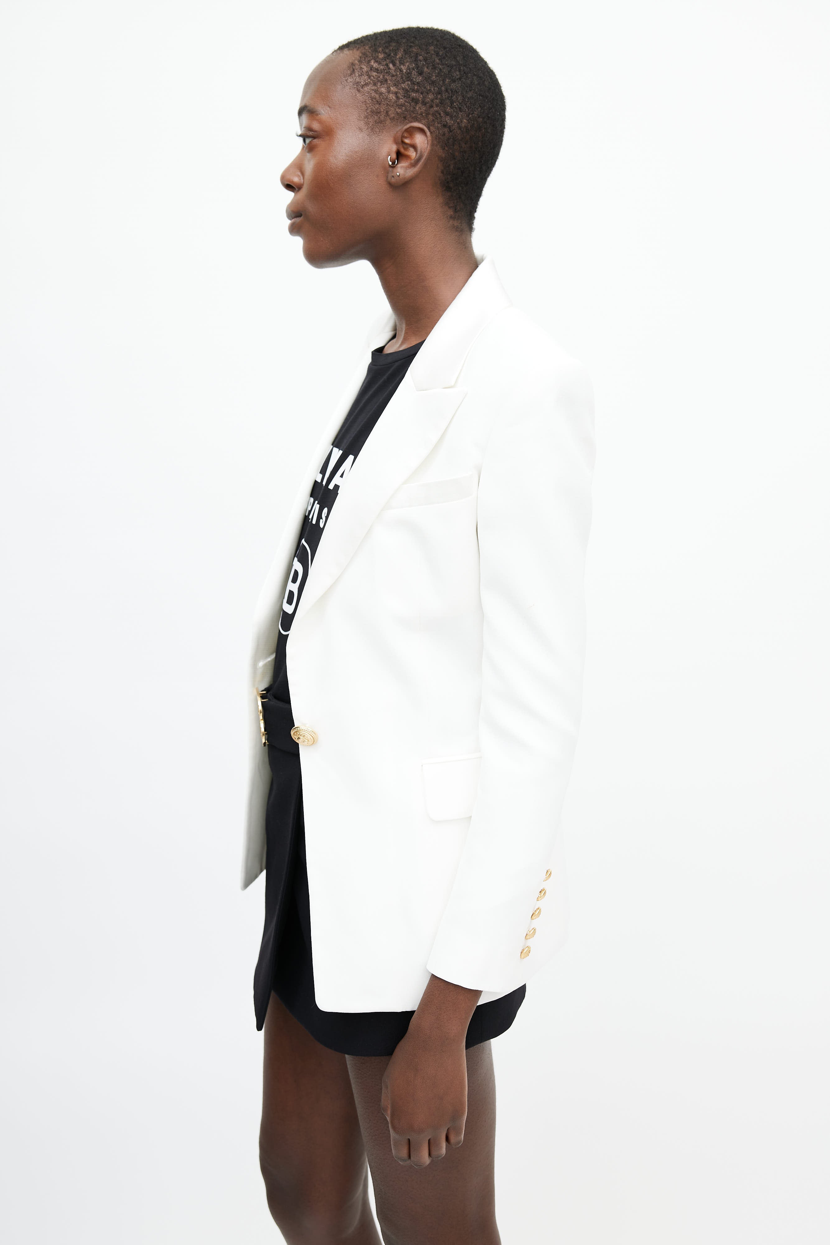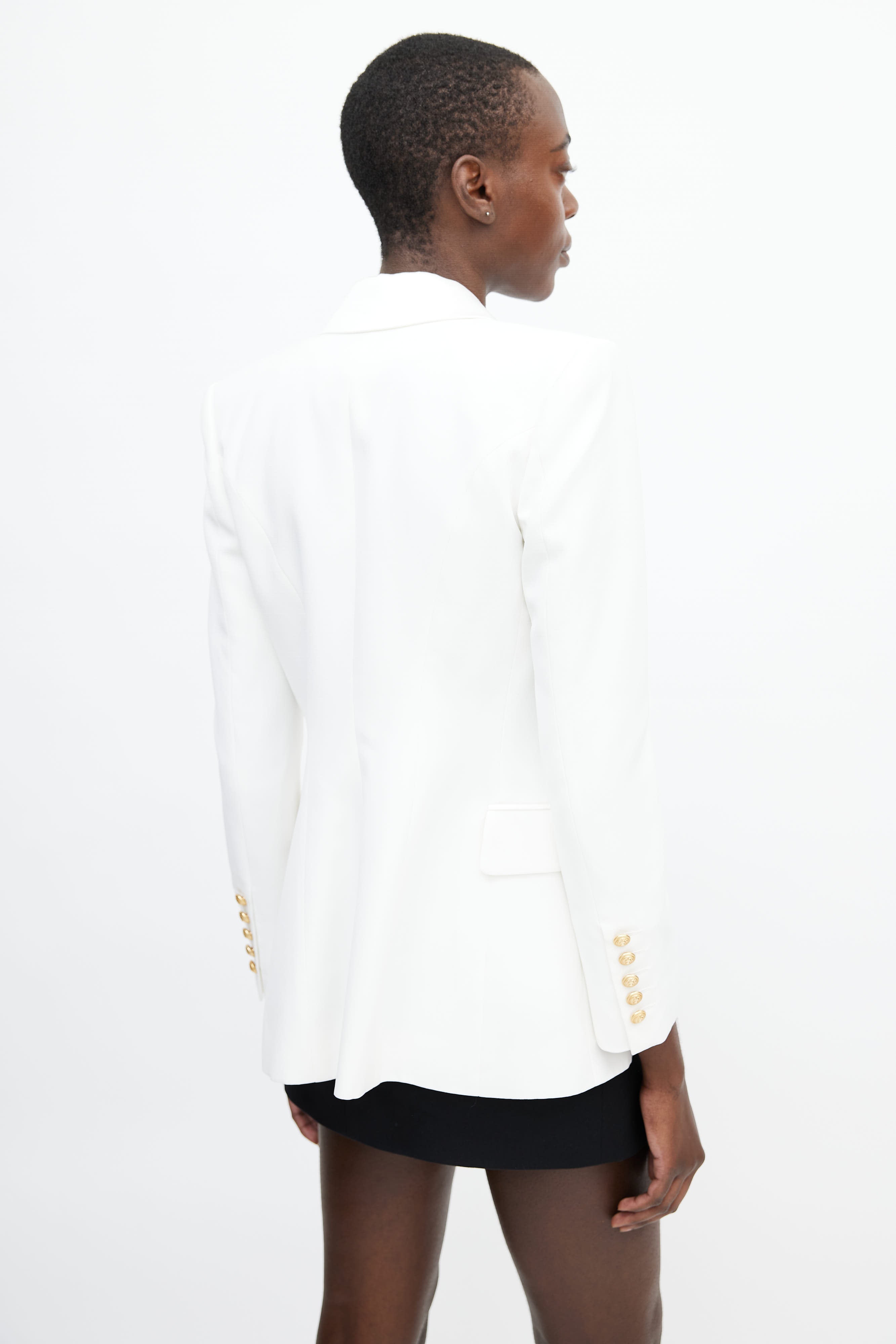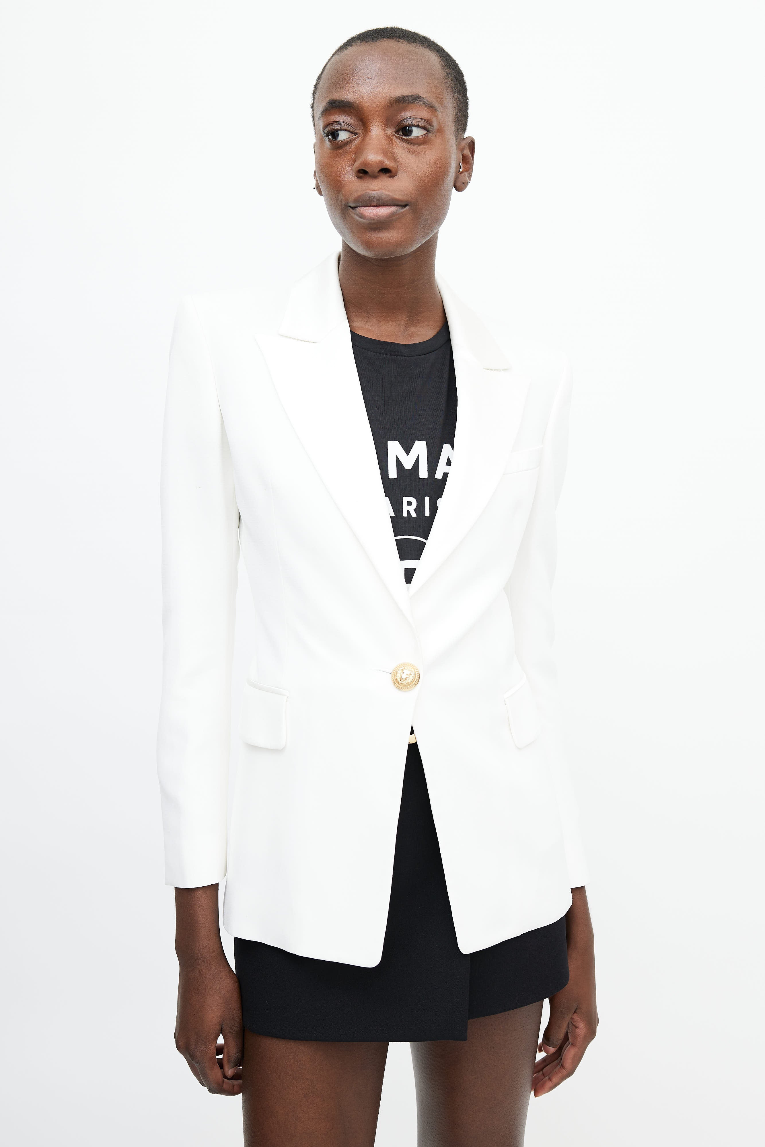 Pre-owned Balmain white blazer featuring a notched lapel with satin trim, one welt pocket at chest, two flap pockets at hip, long sleeves with gold tone button closure at cuff, darting at front, and a gold tone button closure at front. Lined.