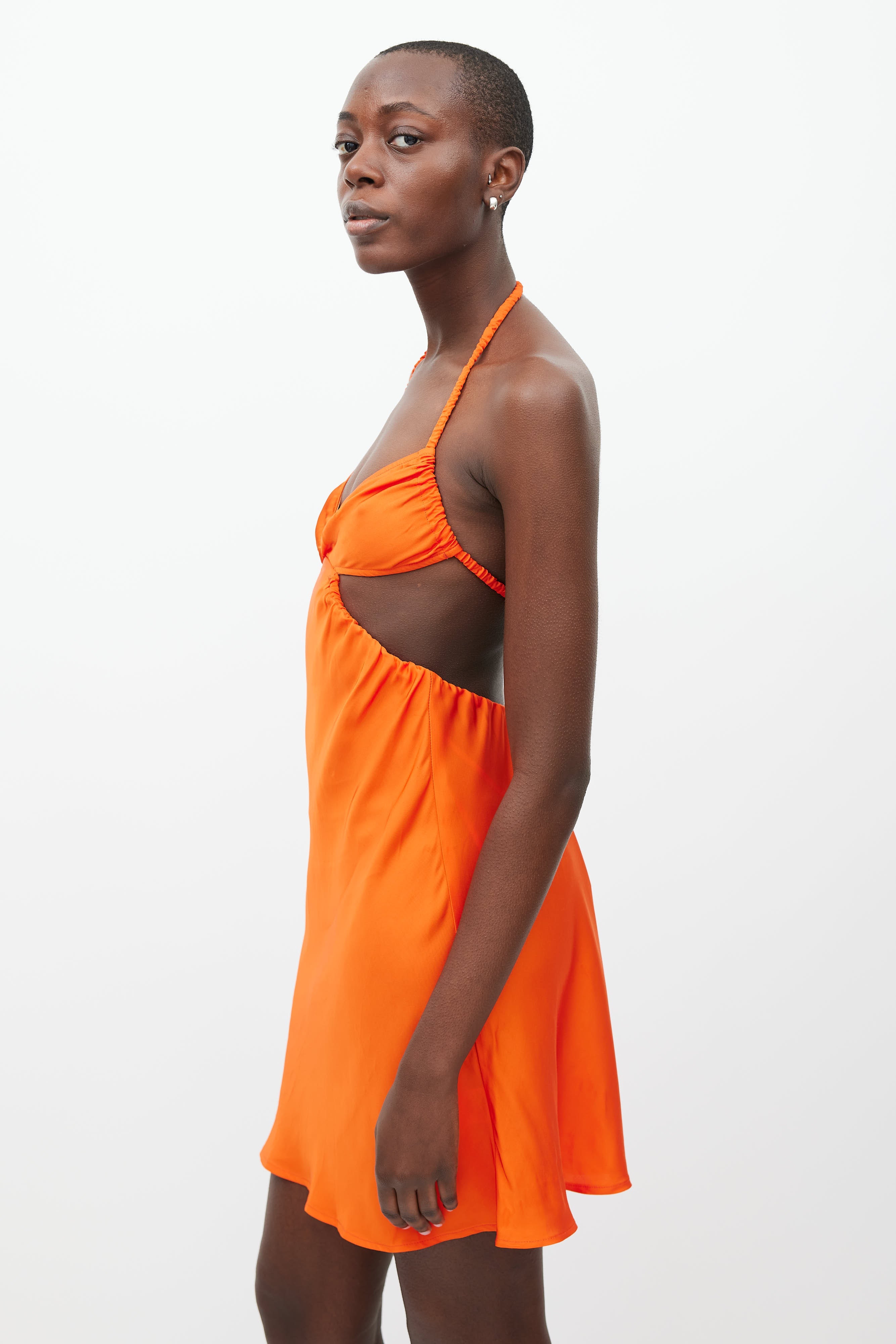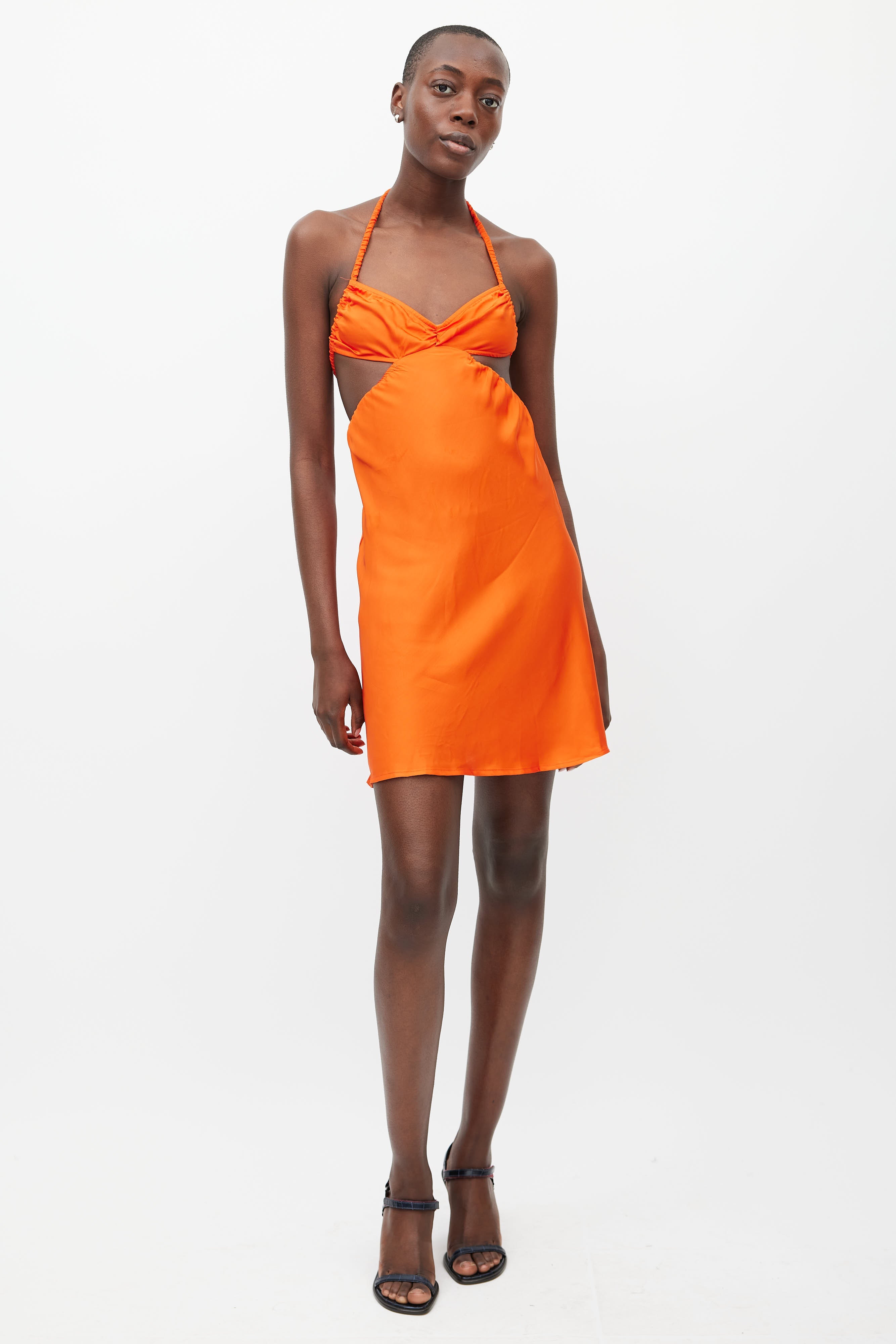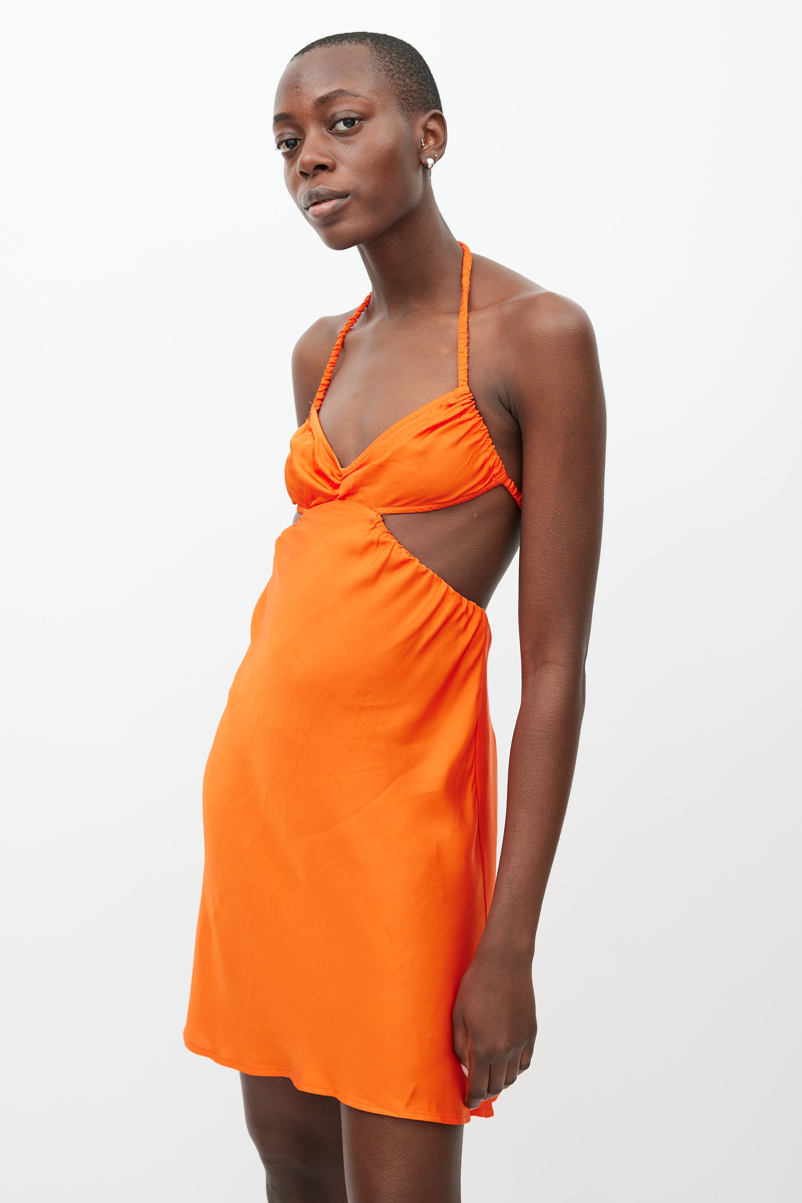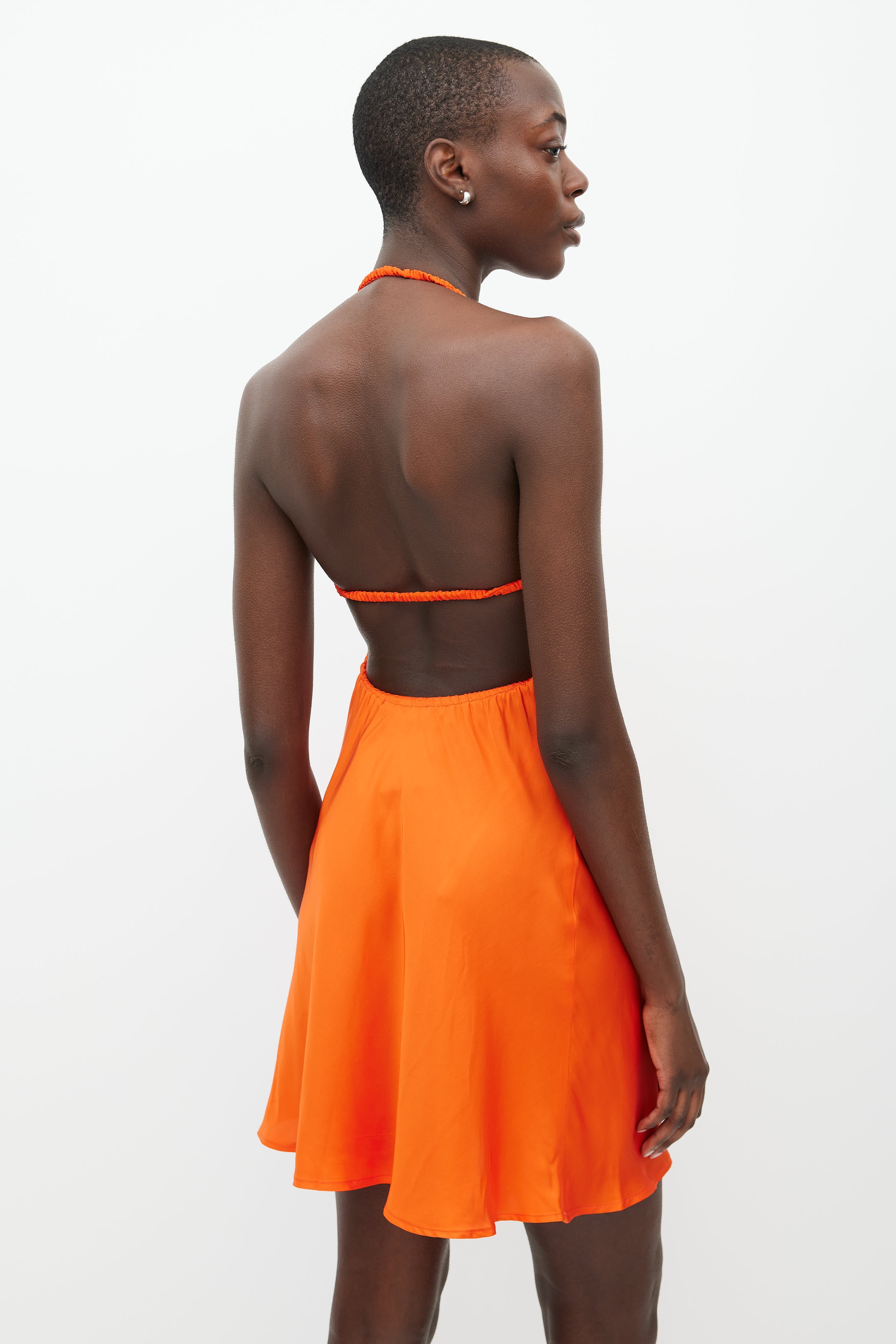 Beaufille orange Hera satin dress featuring a halter neckline, sleeveless styling, and cut out at back.