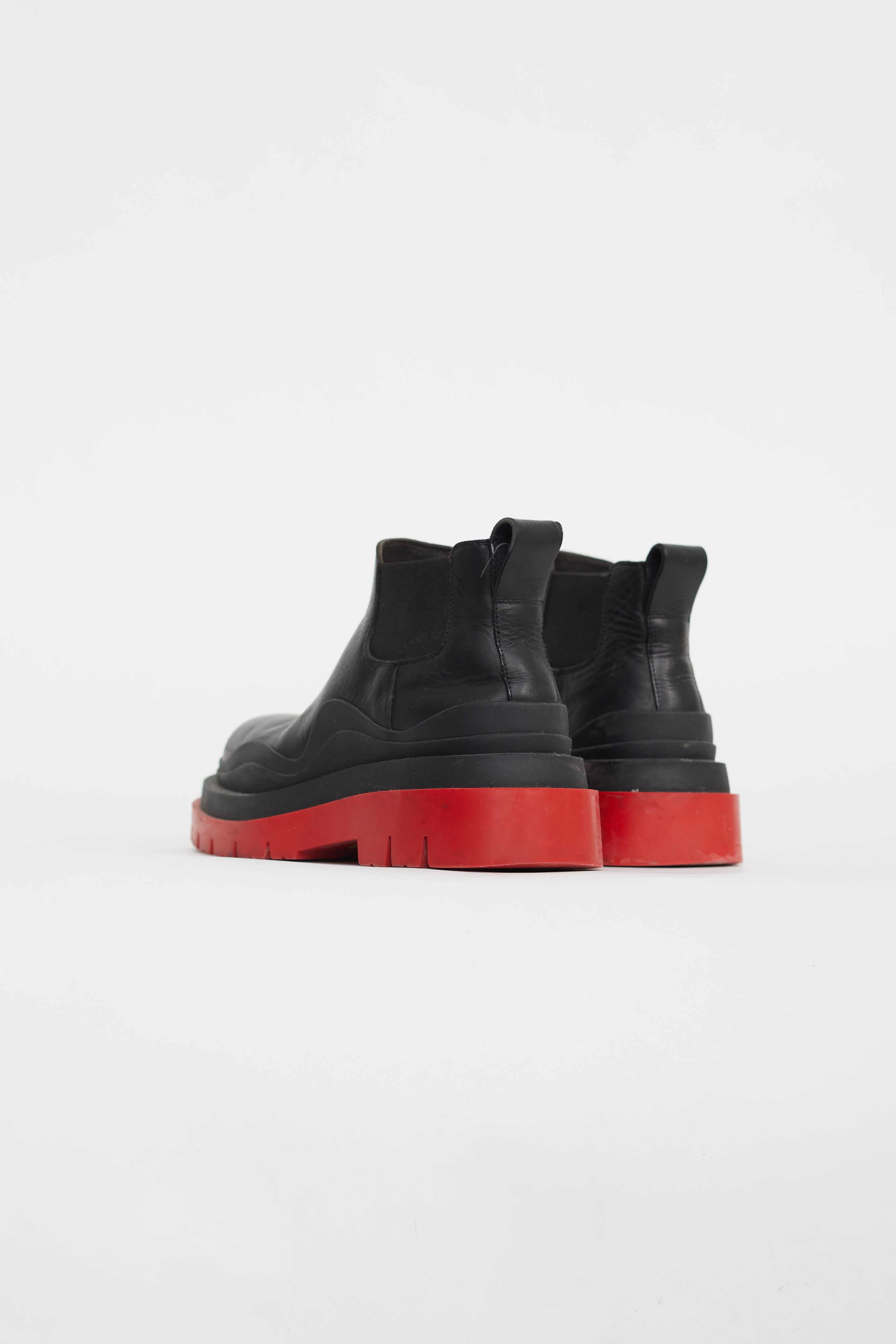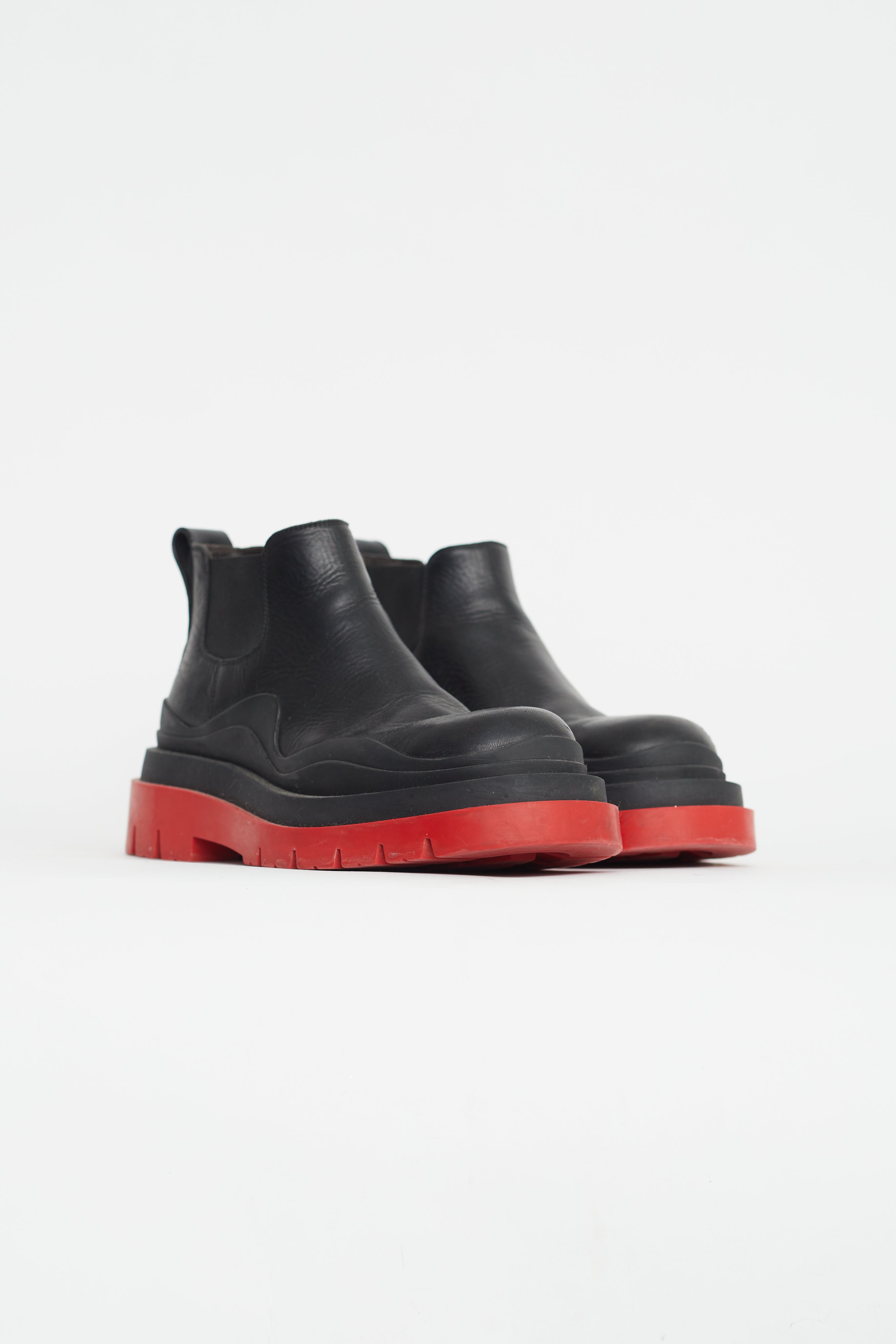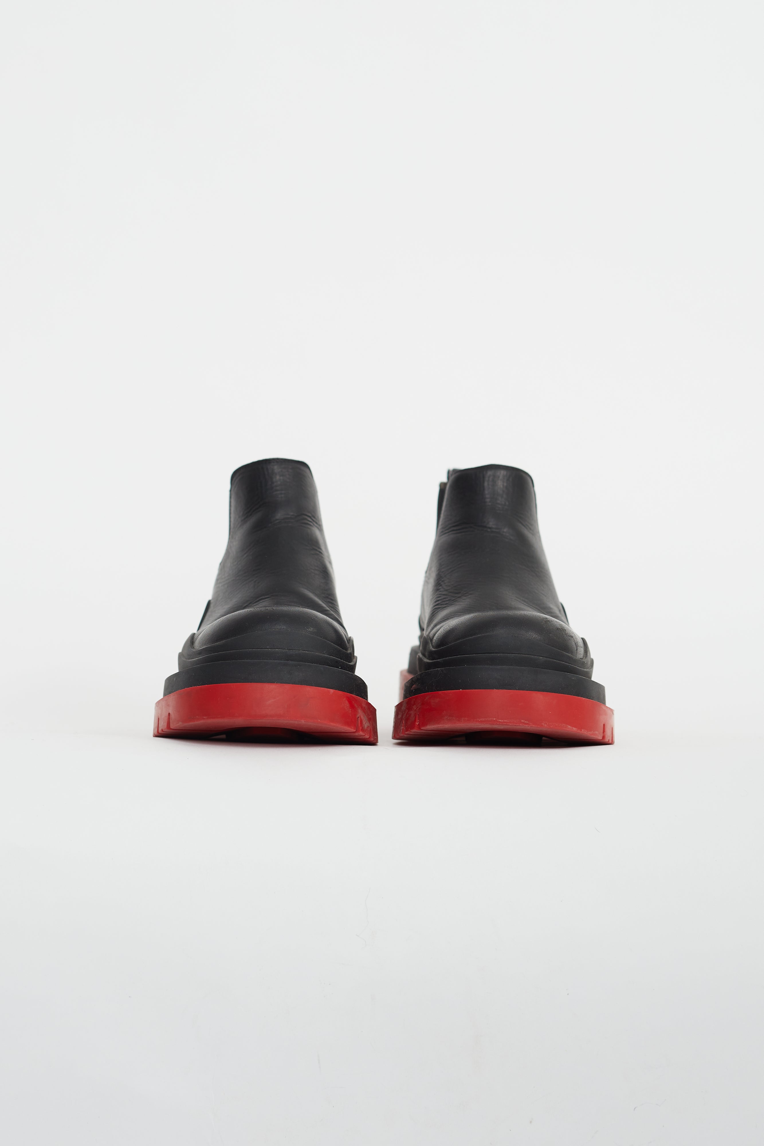 Pre-owned Bottega Veneta black and red leather Chelsea boot featuring a square toe, low cut ankle shaft, pull tab at back of ankle, double platform with red lug outsole and wavy detail at upper sides.