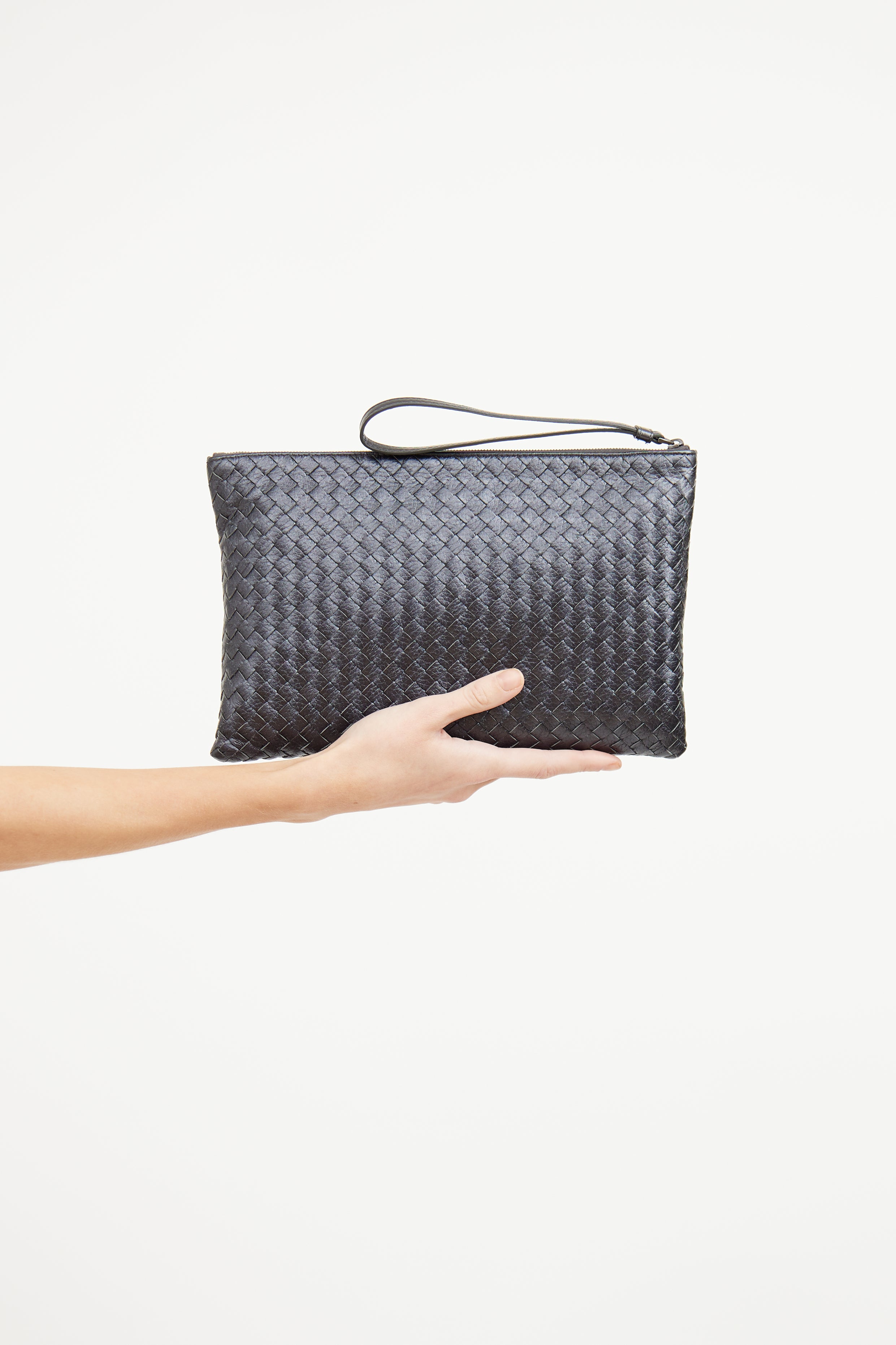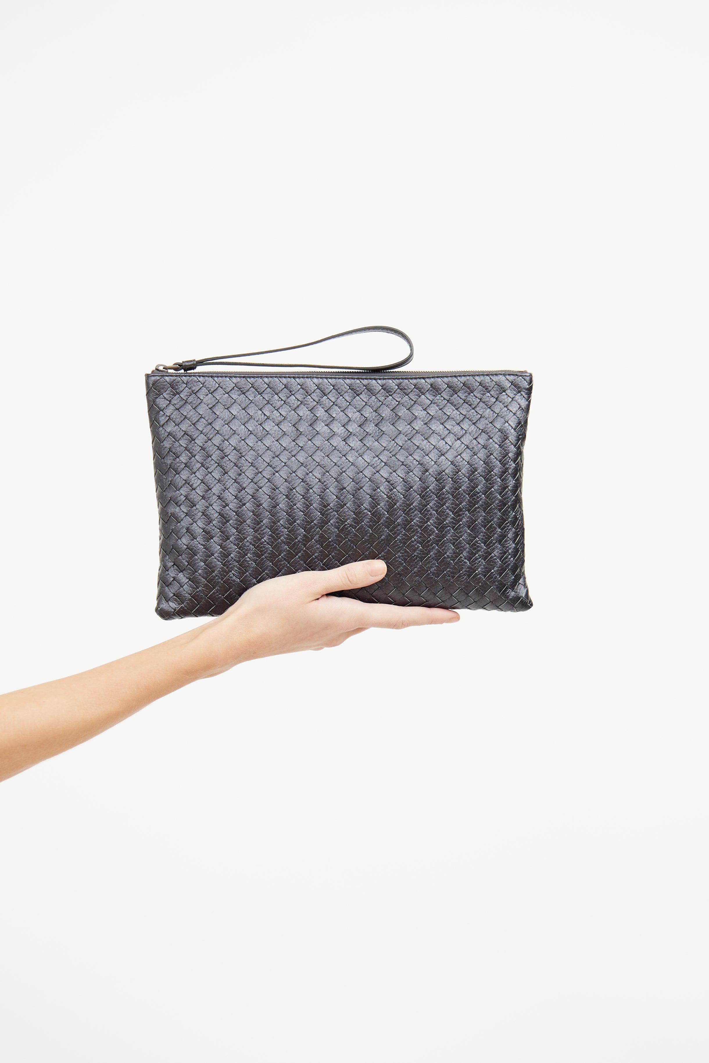 Pre-owned Bottega Veneta grey metallic pouch featuring Intrecciato woven body, one main compartment and top zip closure with wrist strap.