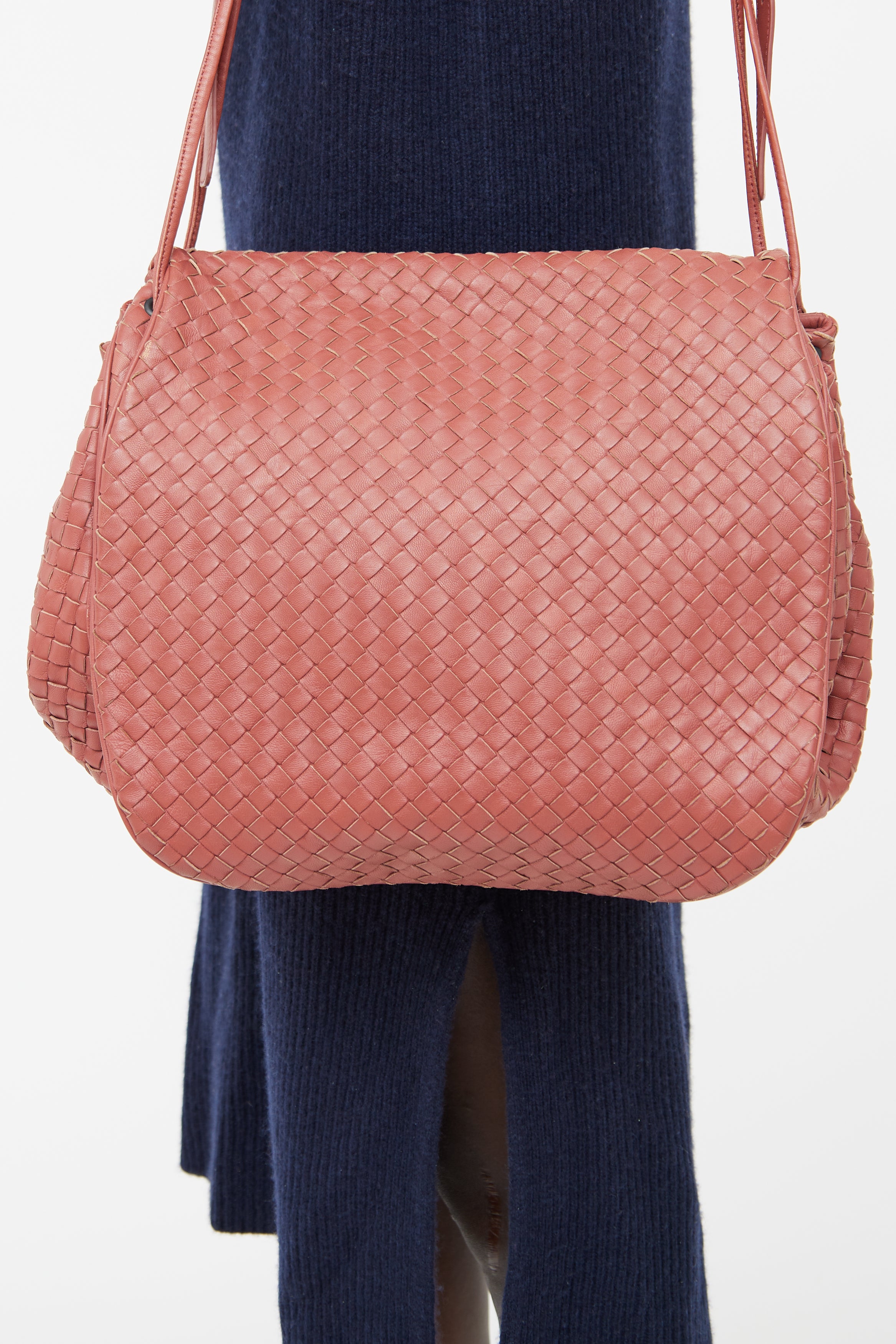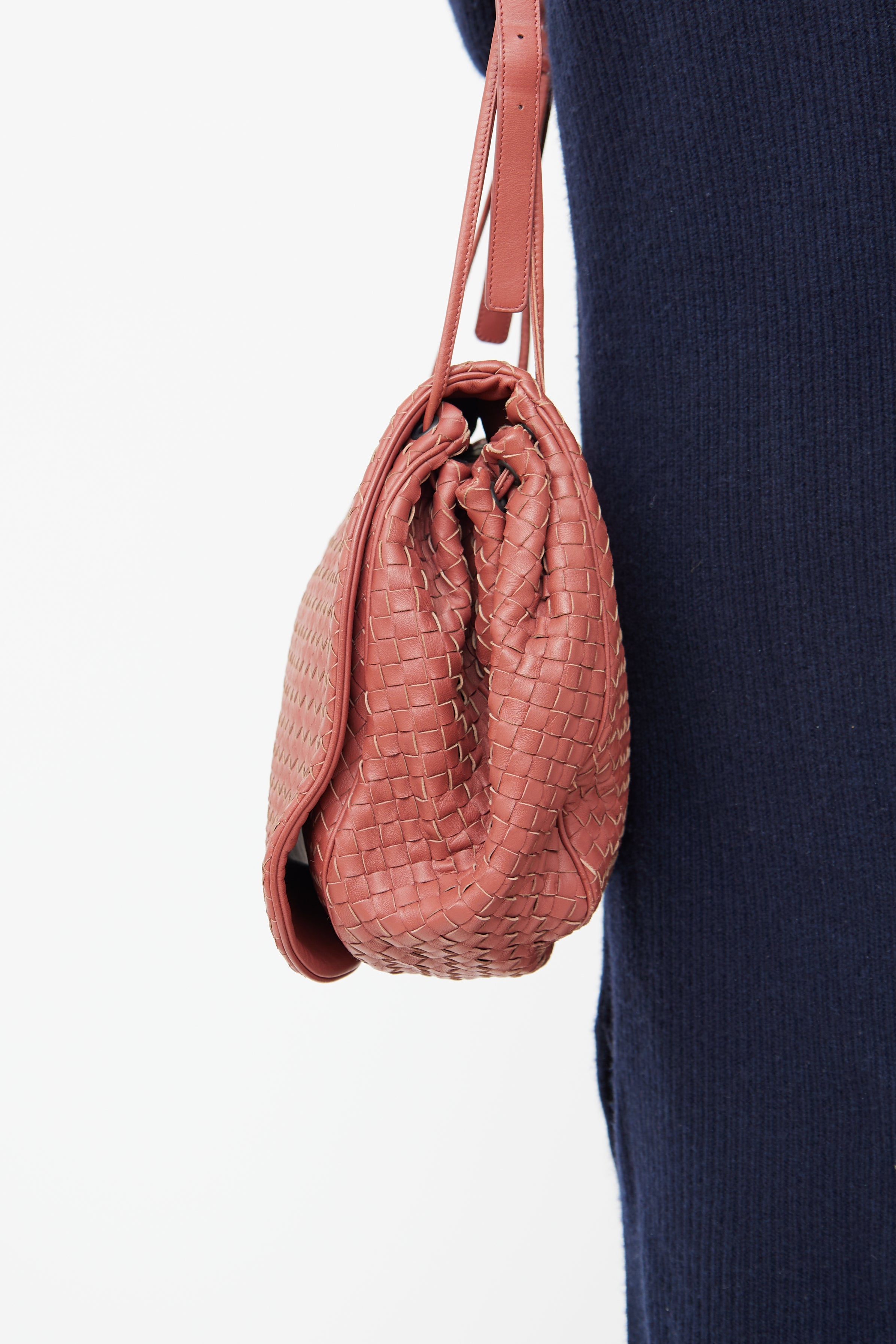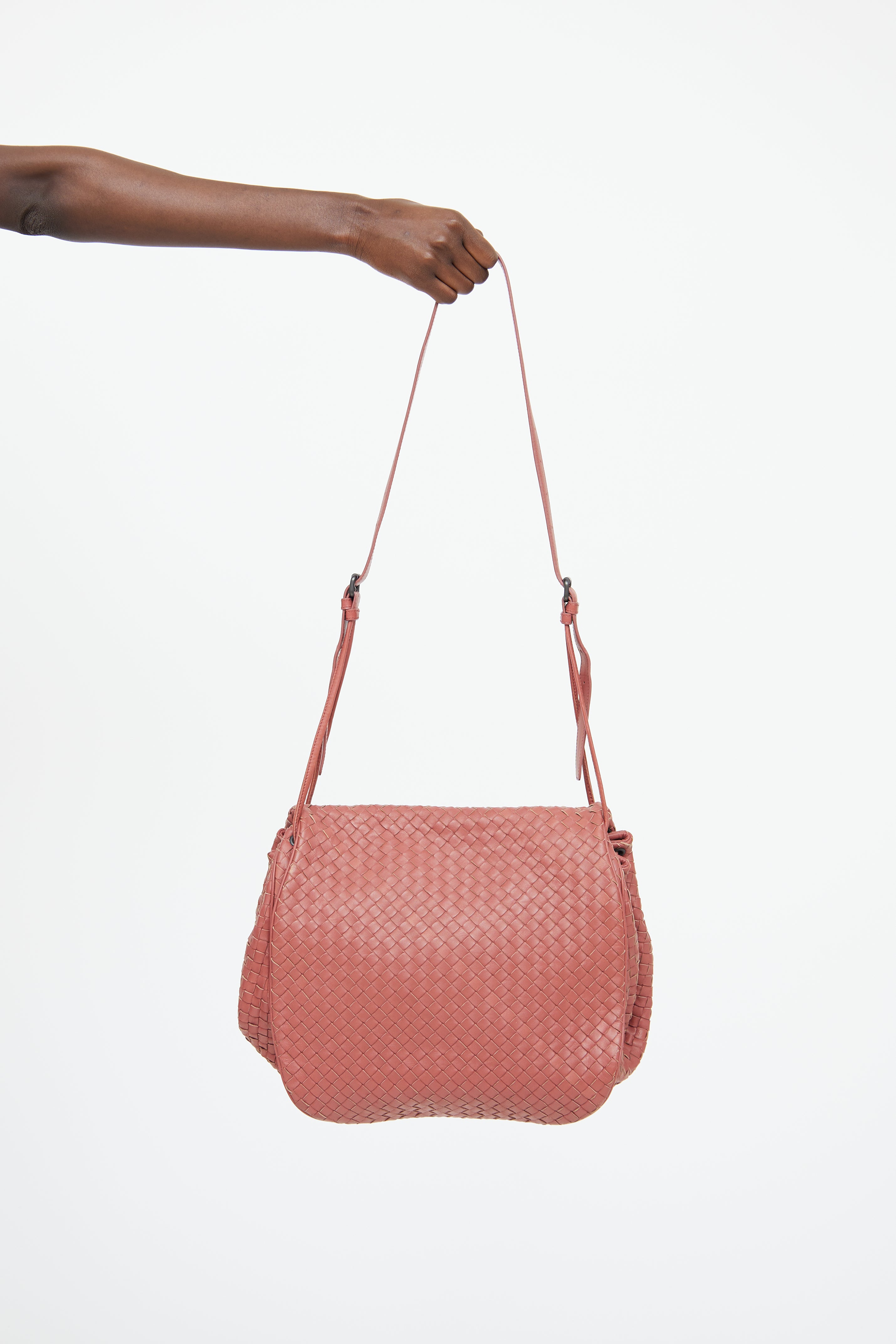 Pre-owned Bottega Veneta red Messenger bag featuring a adjustable crossbody strap, top flap opening with magnetic closure, interwoven leather, one main suede lined compartment, interior slip pocket, and interior zip pocket.