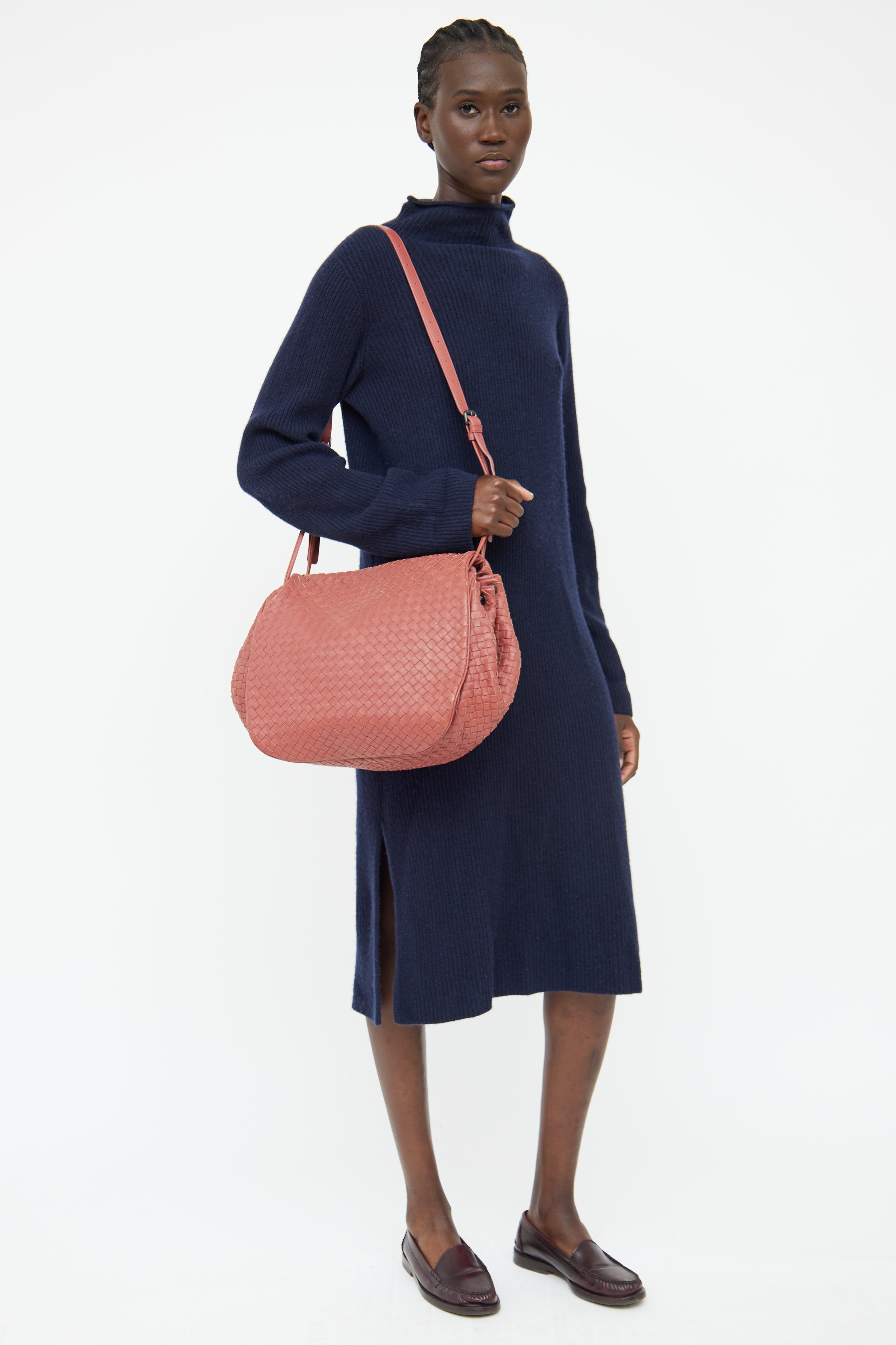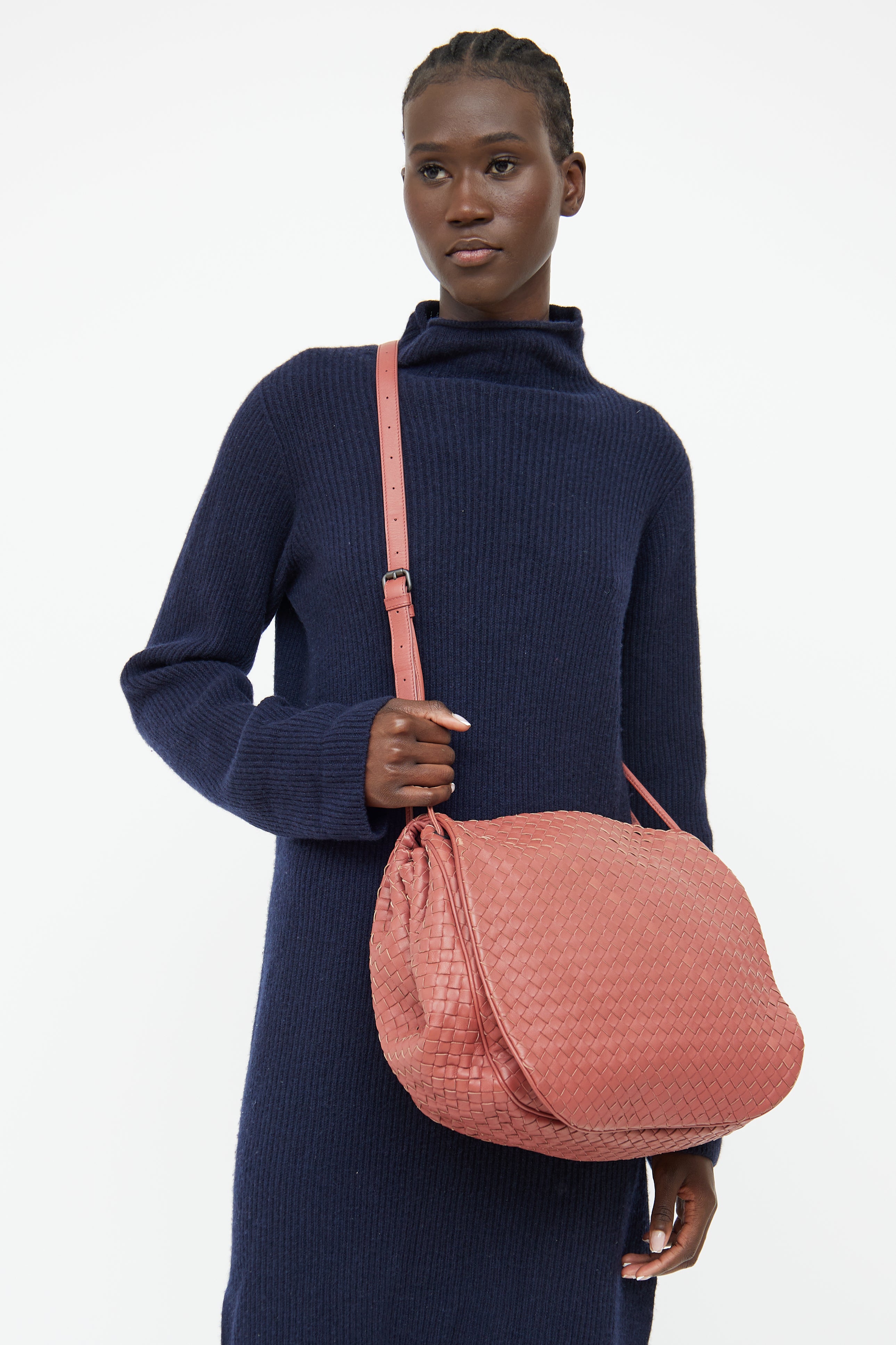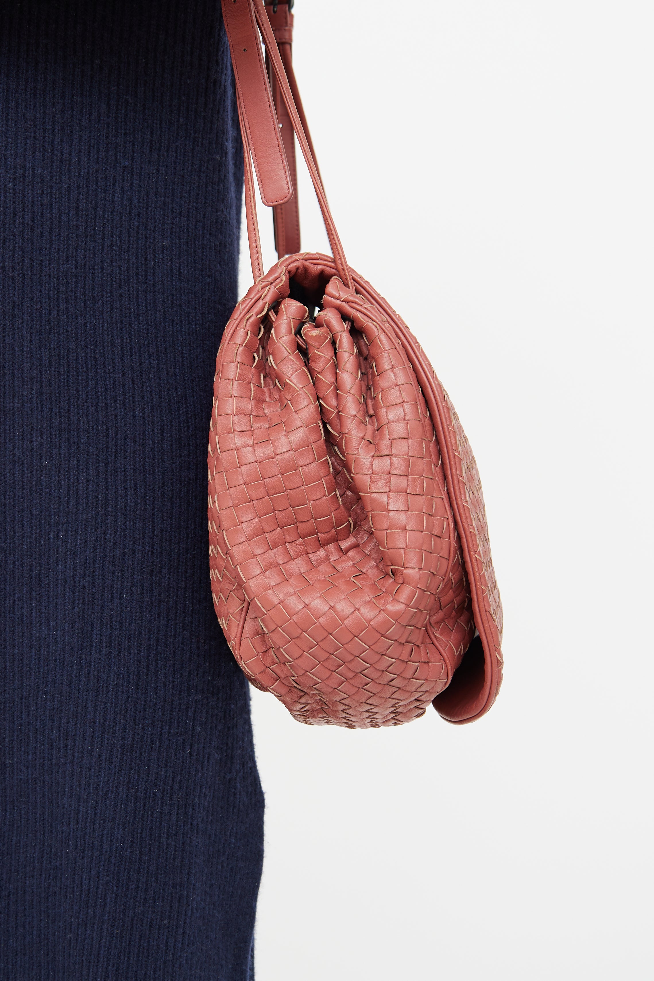 Pre-owned Bottega Veneta red Messenger bag featuring a adjustable crossbody strap, top flap opening with magnetic closure, interwoven leather, one main suede lined compartment, interior slip pocket, and interior zip pocket.