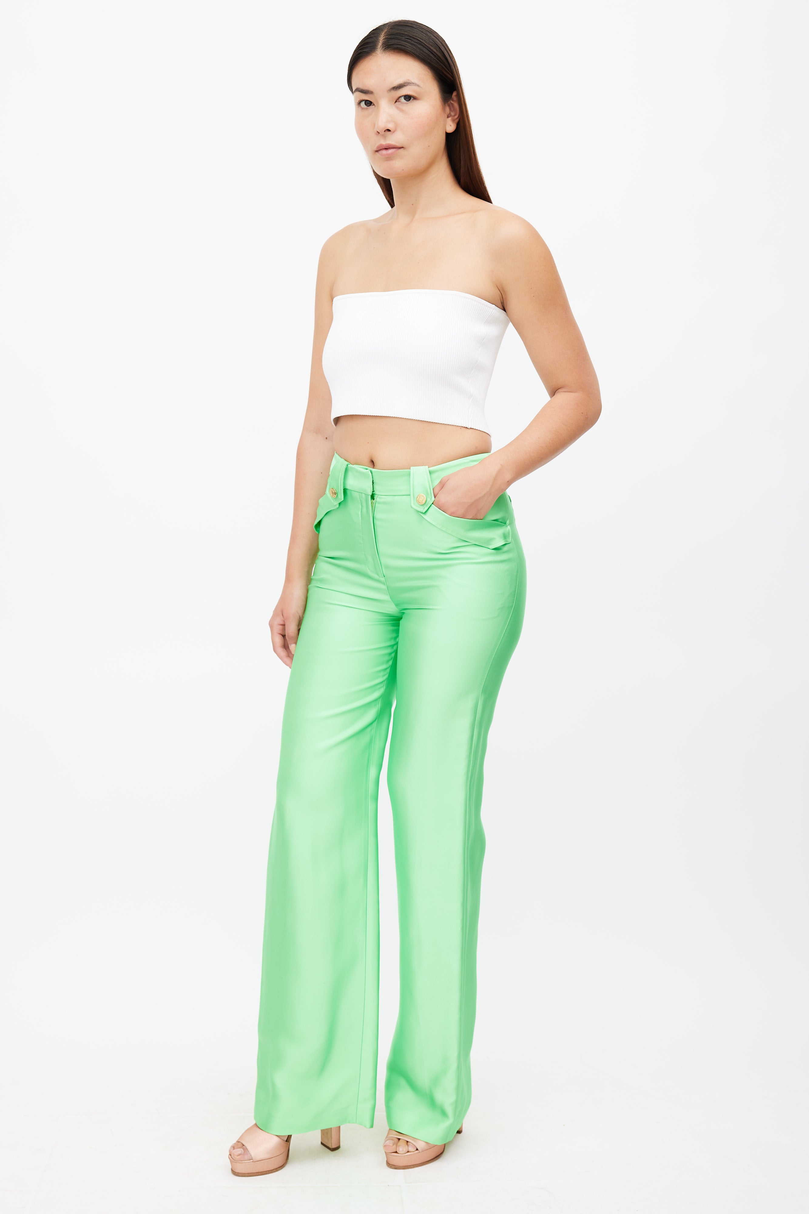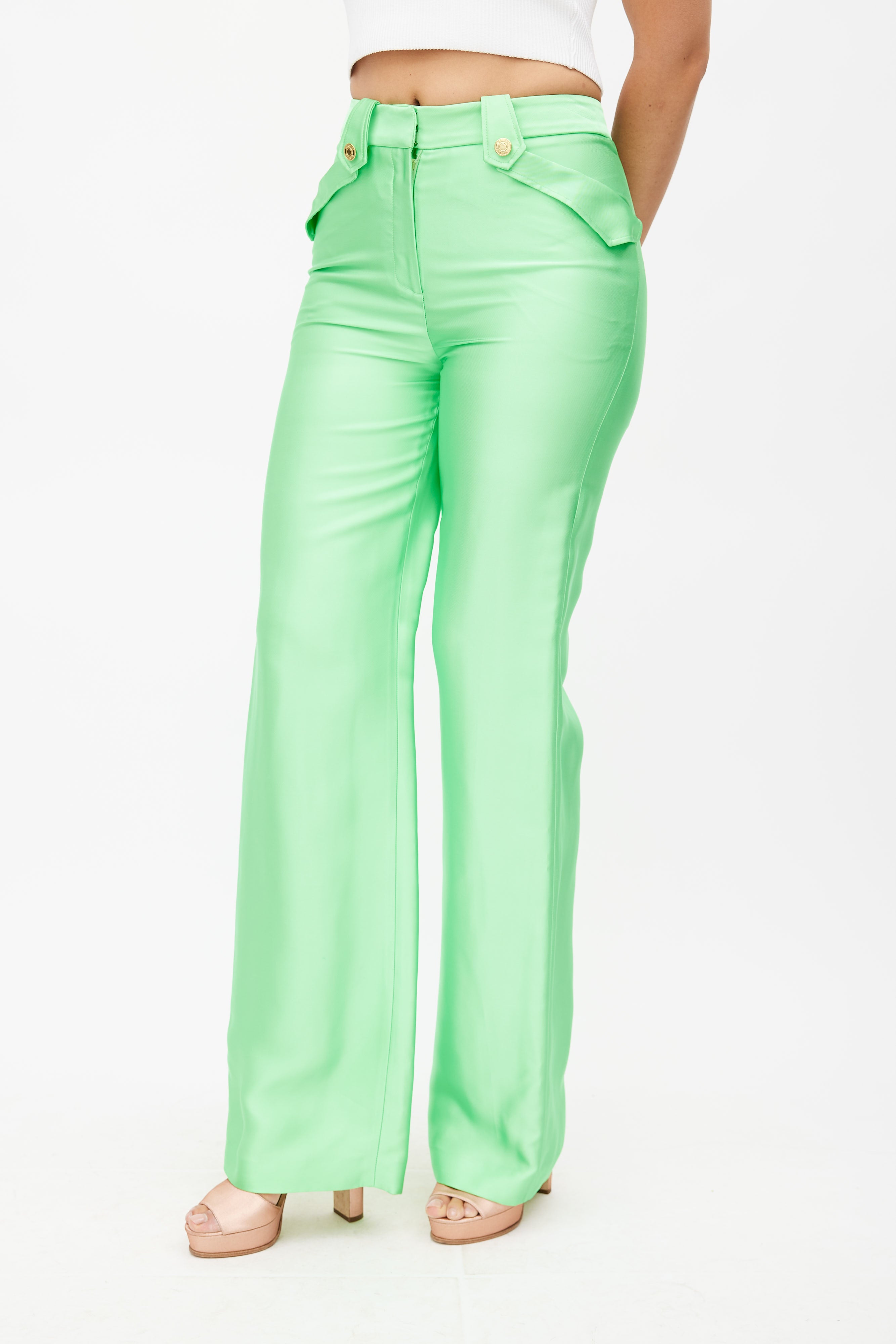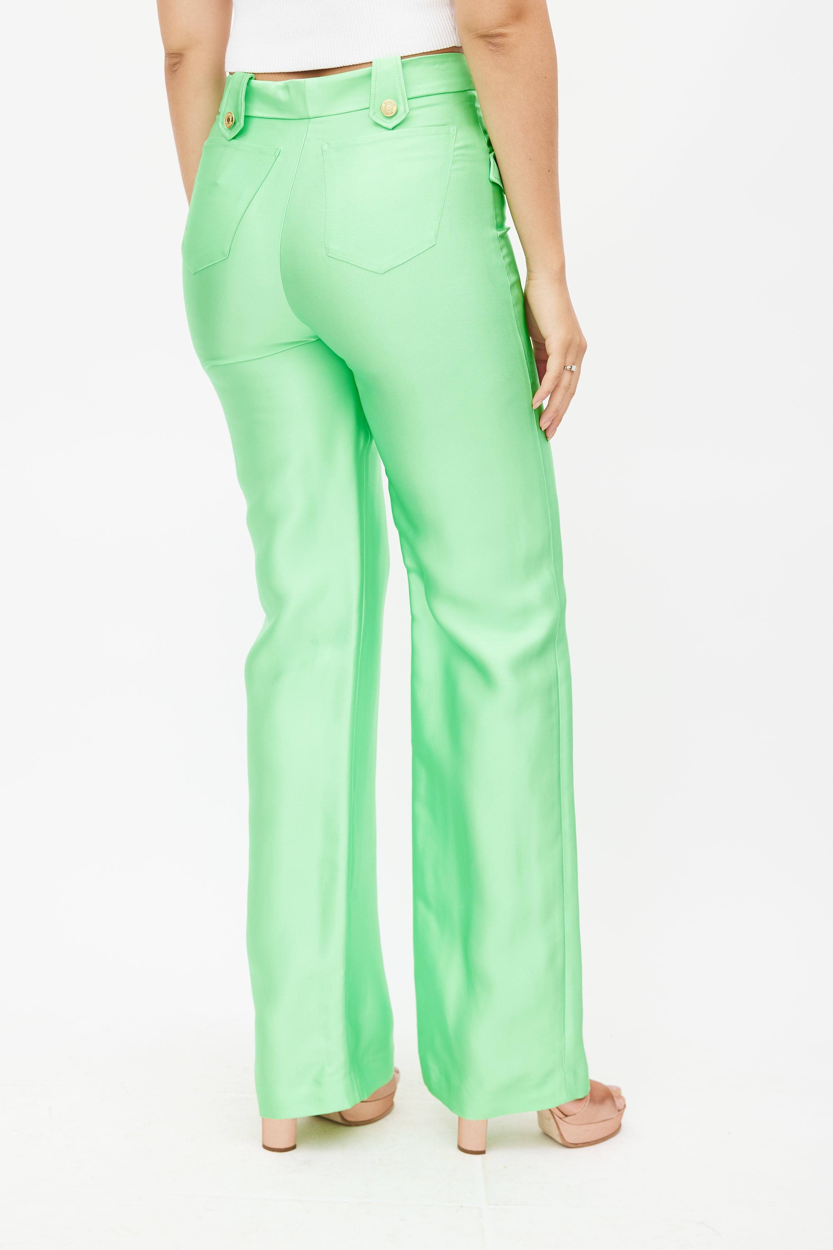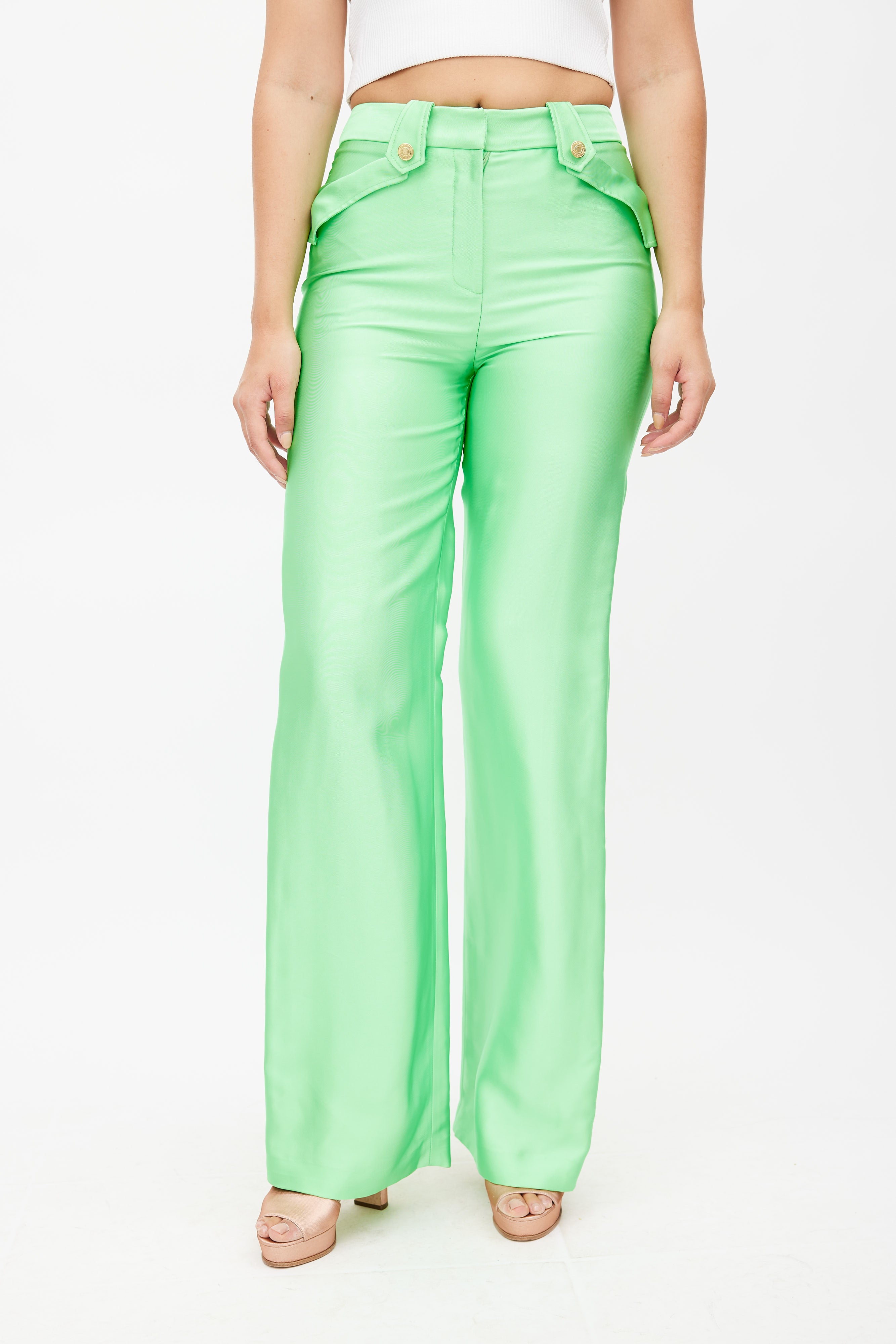 Brandon Maxwell lime green pants featuring high rise, zip fly, two slash pockets at front, two patch pockets at back, belt loops with gold tone crest buttons, and wide leg.