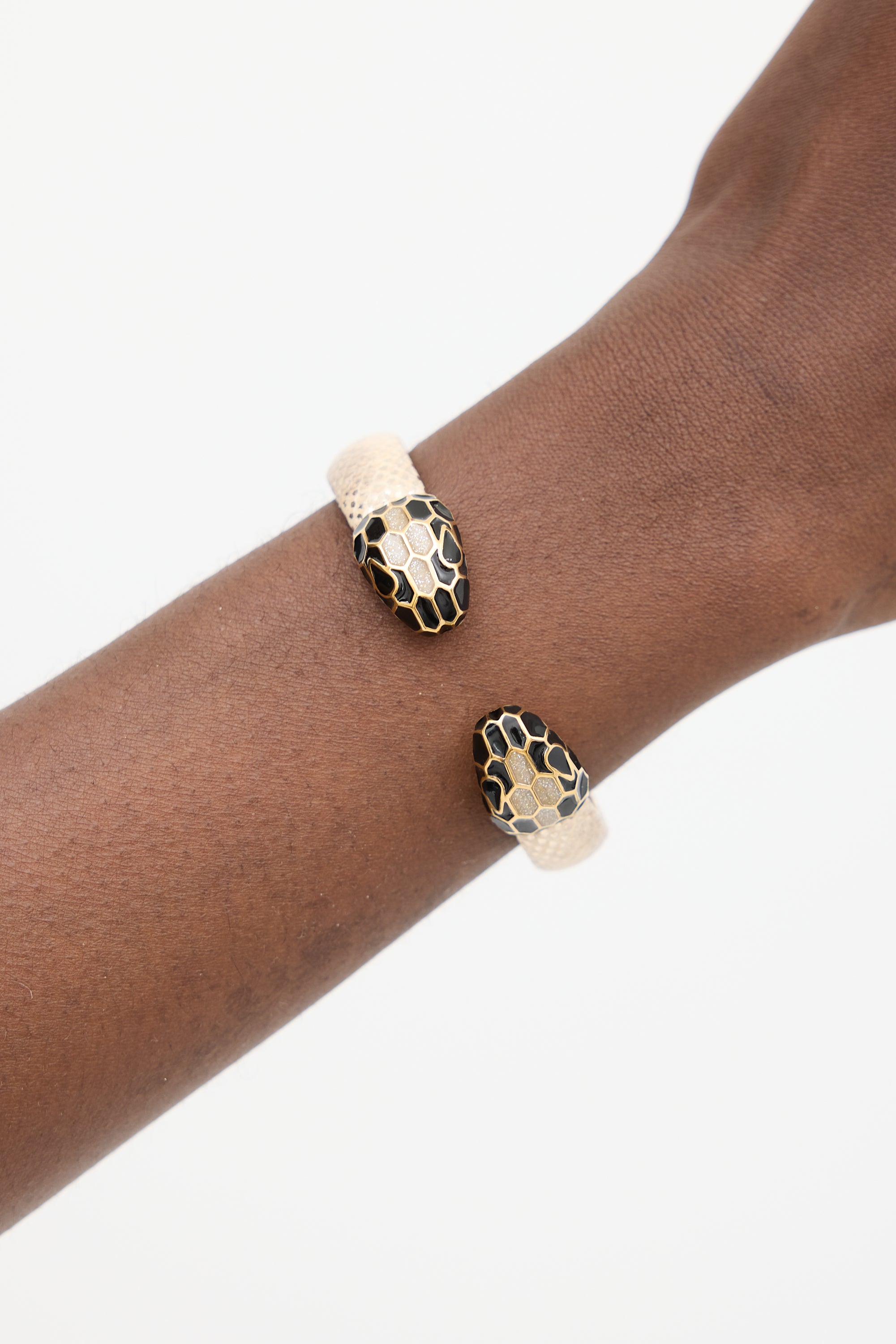 Pre-owned Bulgari beige Serpenti Forever leather featuring textured karung snakeskin exterior, gold tone interior, snake head motif with multicolour enamel and opal inlay, and engraved logo at interior. Comes with original box.
