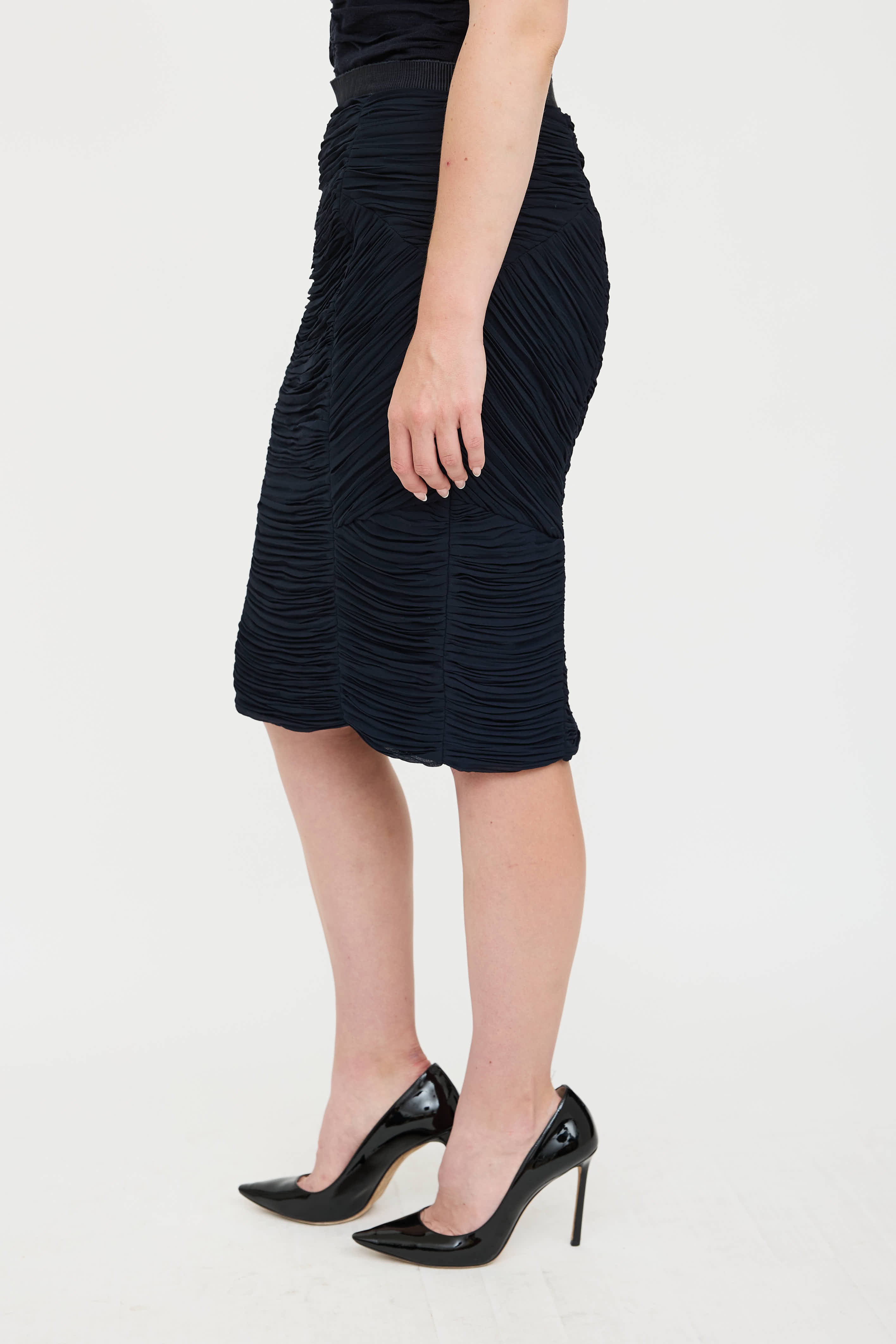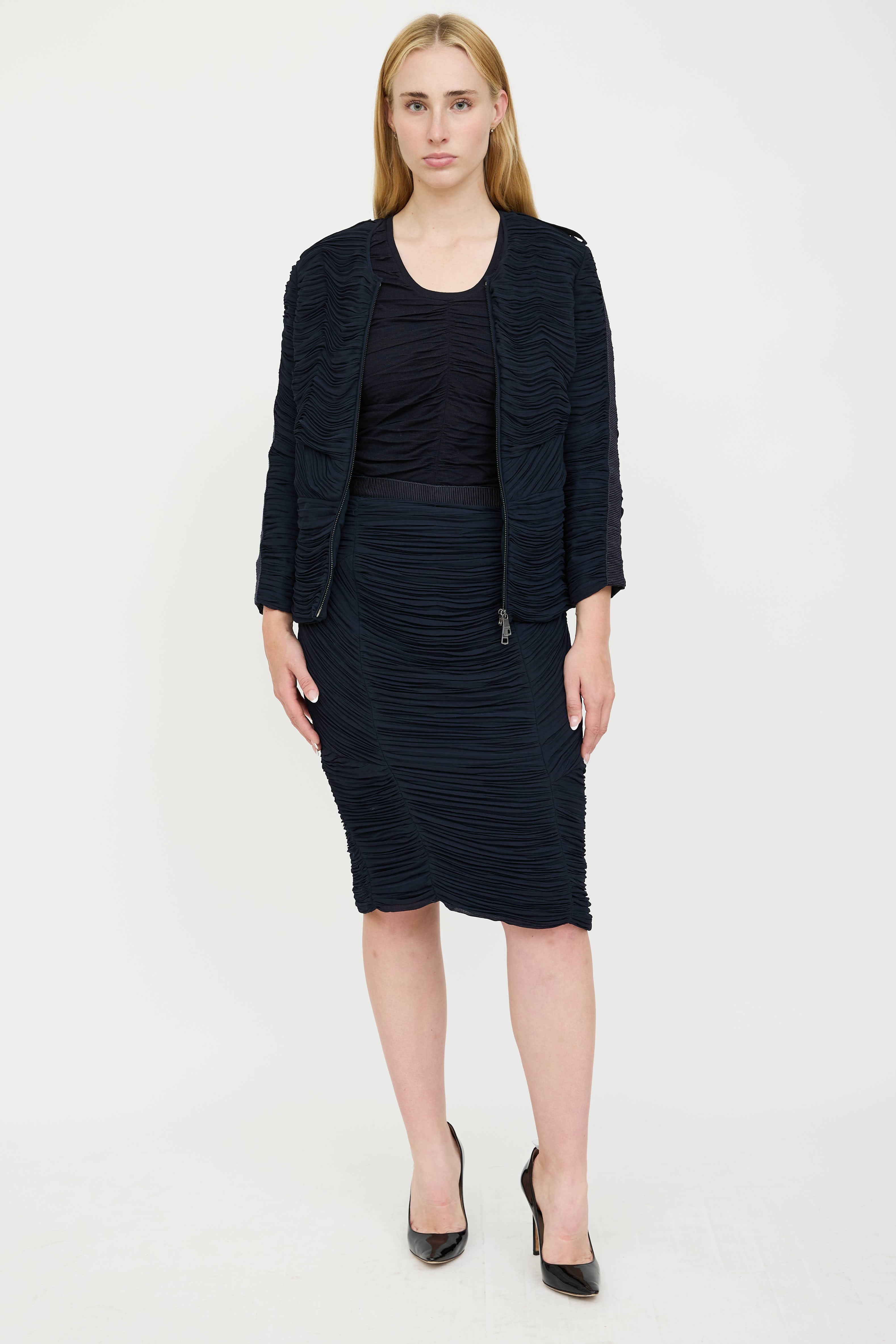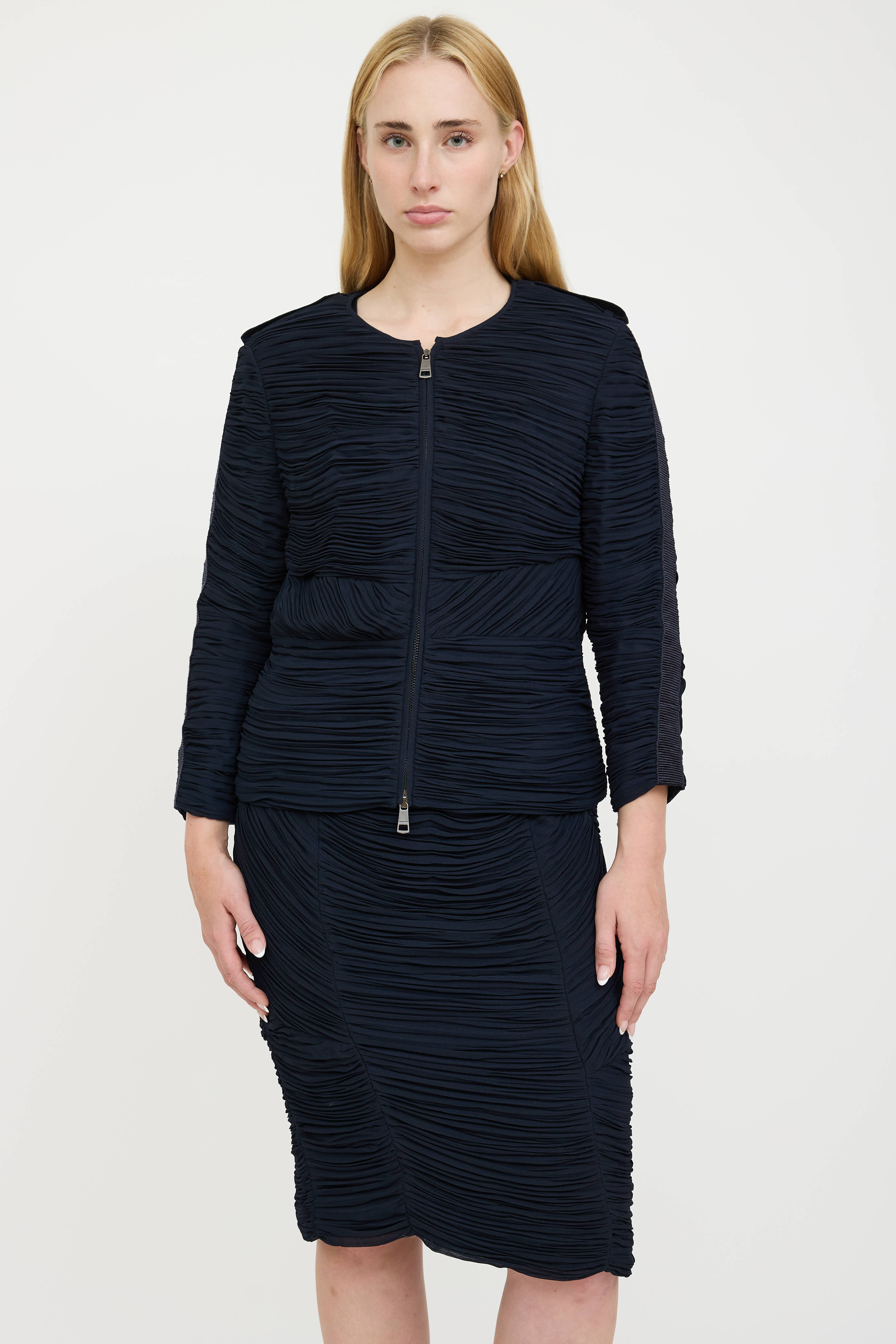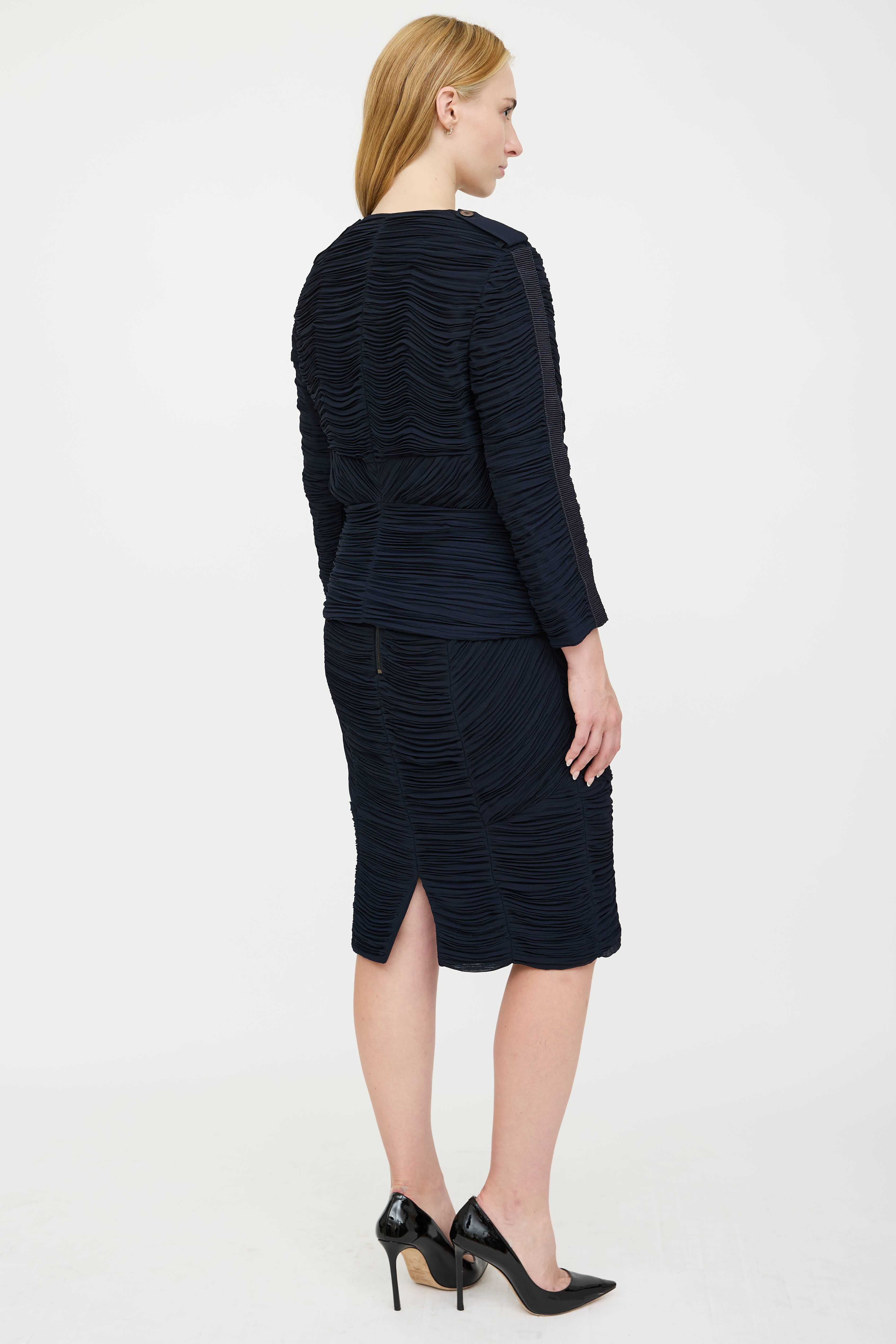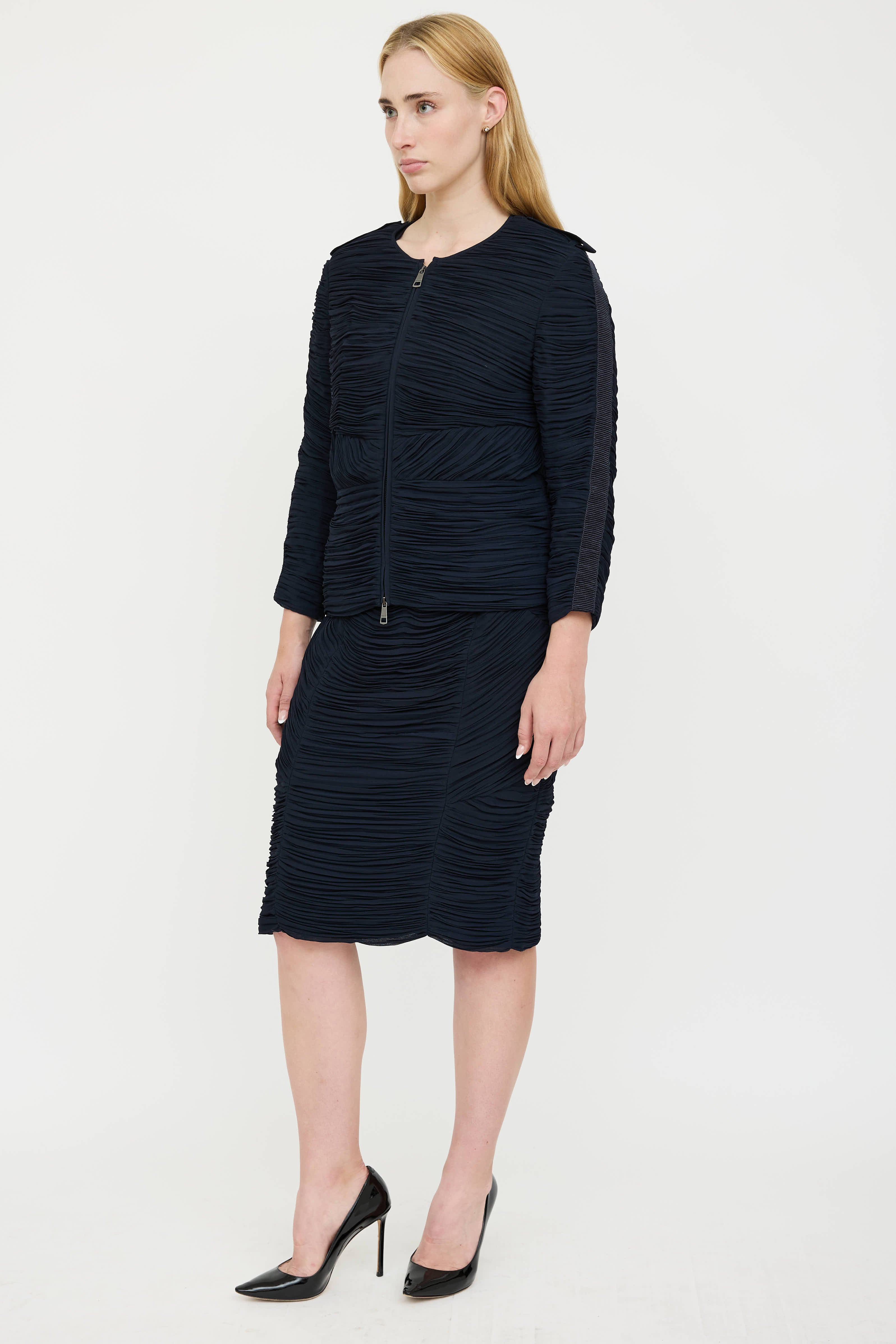 Pre-owned Burberry navy pleated co-ord set featuring pleated jacket, epaulettes at shoulder, round neckline, textured trim at sleeves, and double zip front. Matching skirt featuring exposed zip at back, centre slit at hemline, and pleated throughout. Lined.