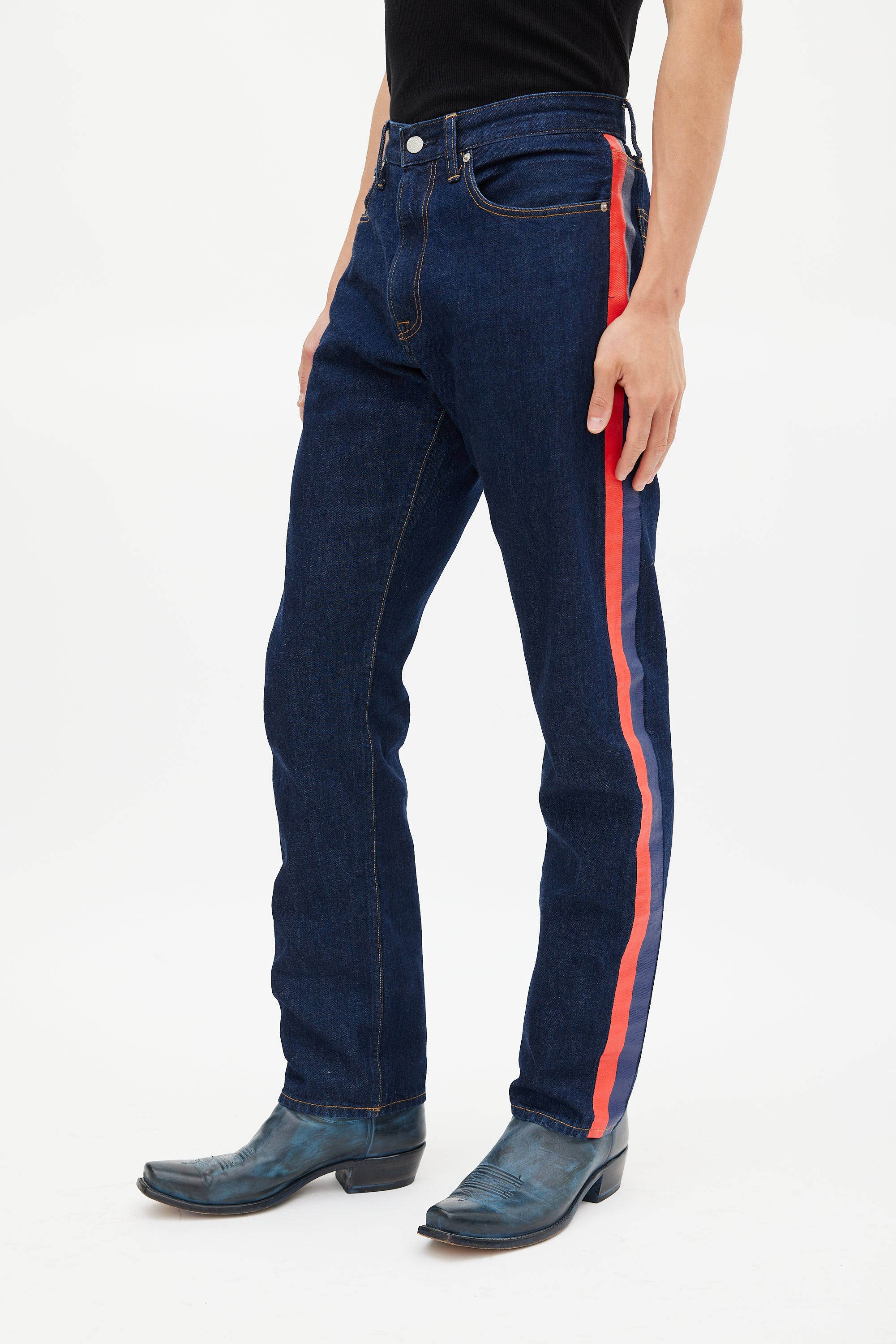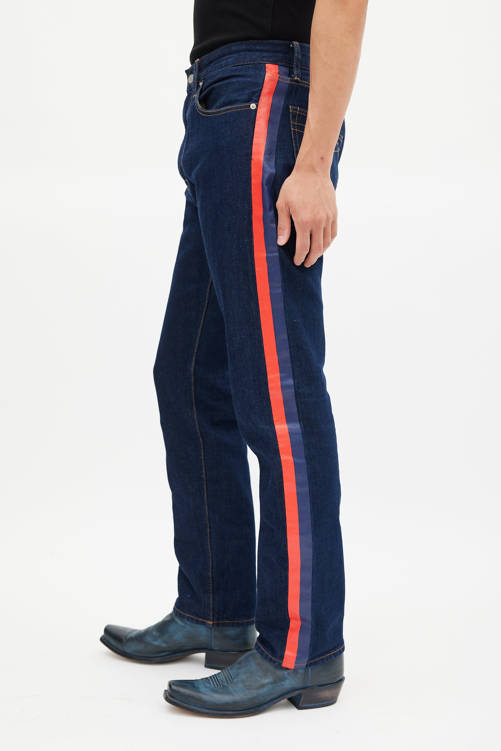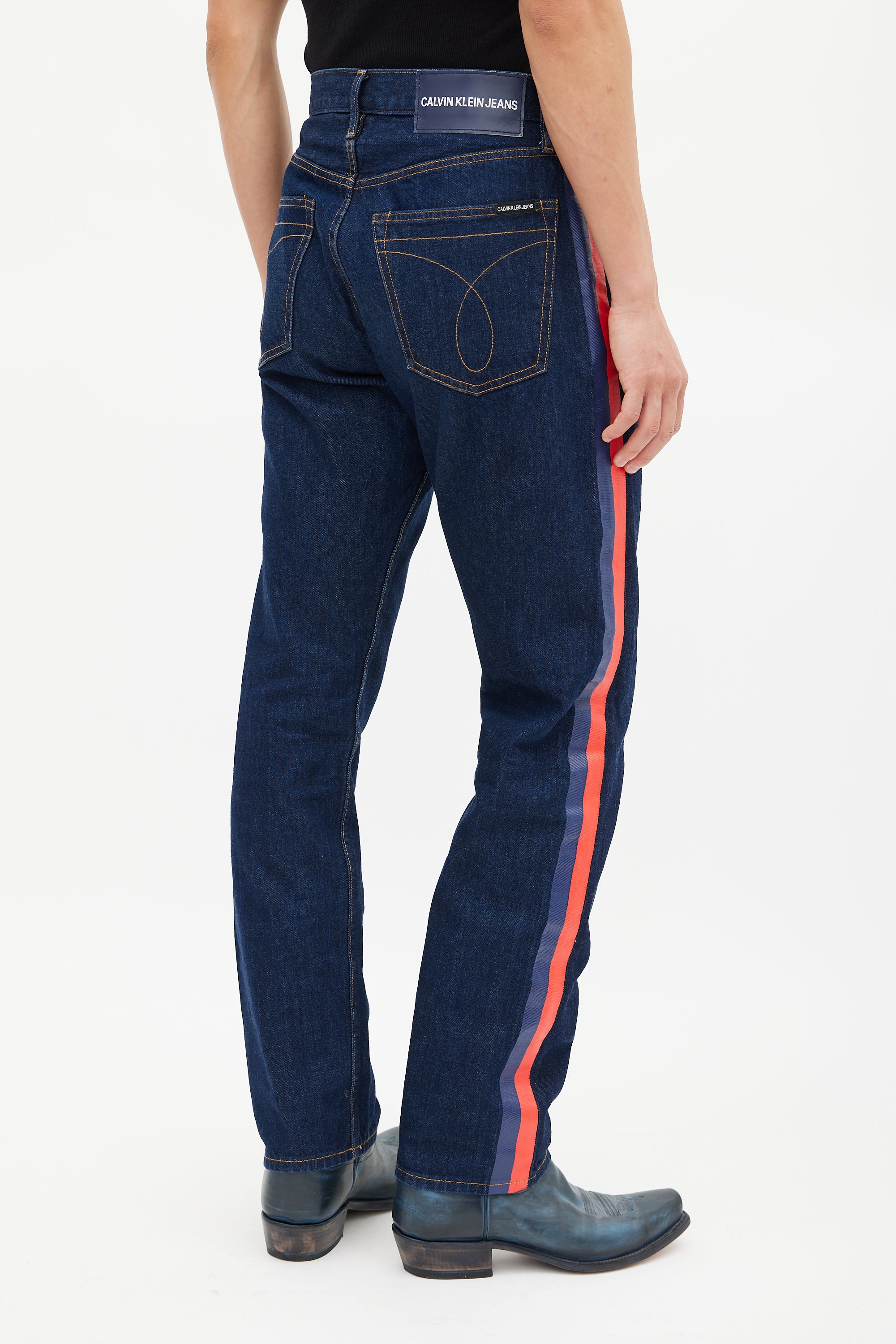 Pre-owned Calvin Klein Jeans navy CKJ035 dark wash jeans featuring a red stripe at sides, five pocket styling, embossed leather logo patch at back, straight leg, and zip fly with button closure.