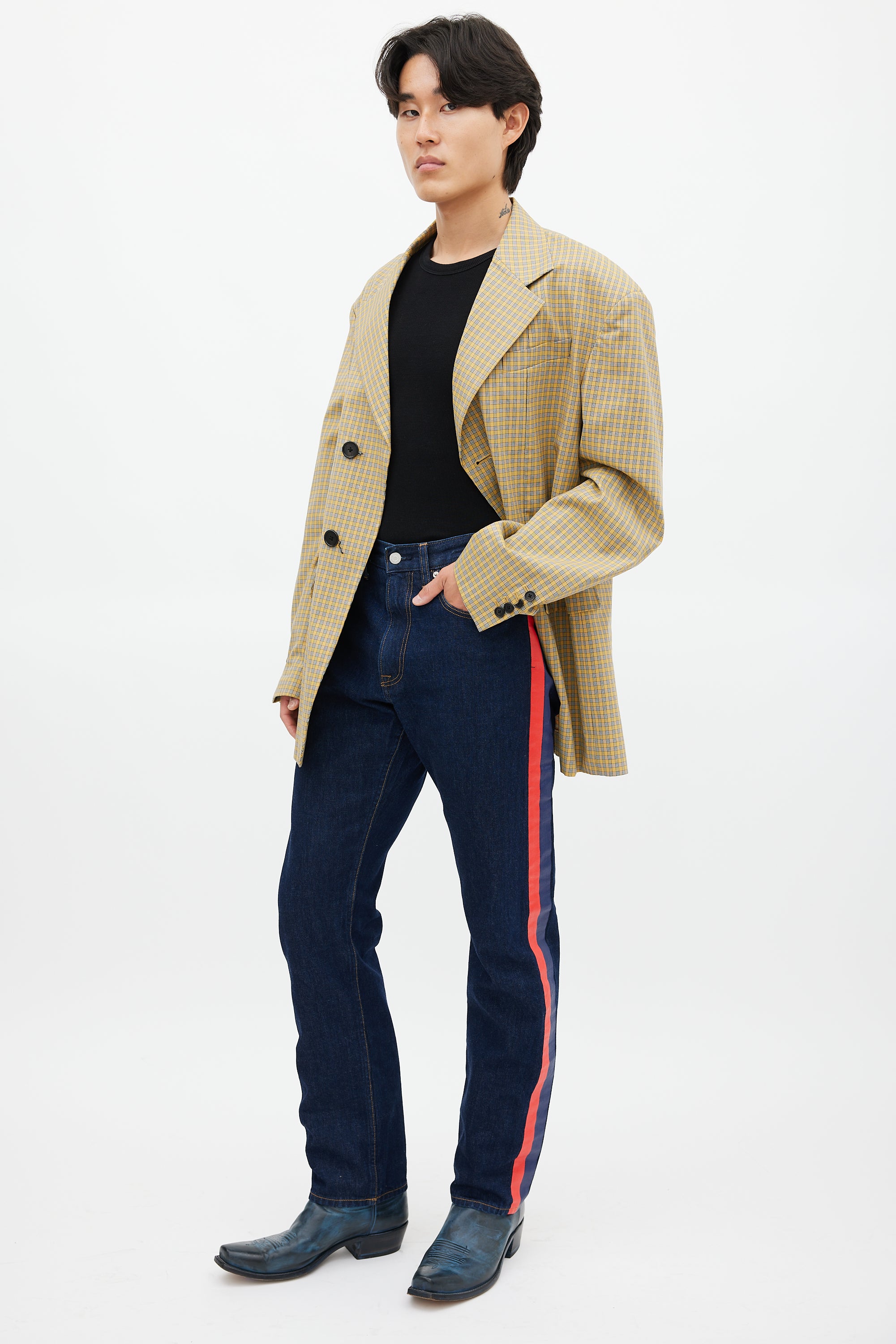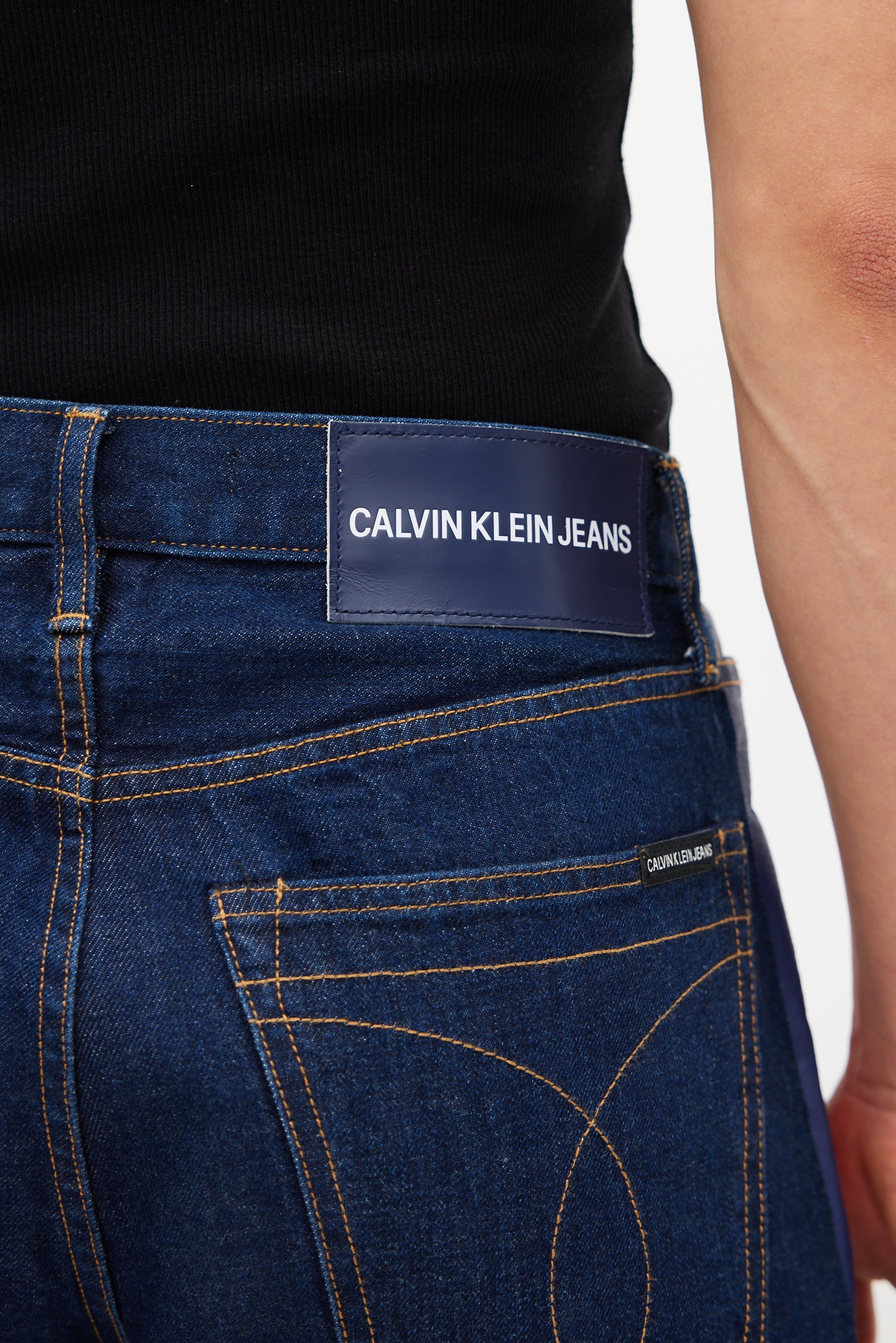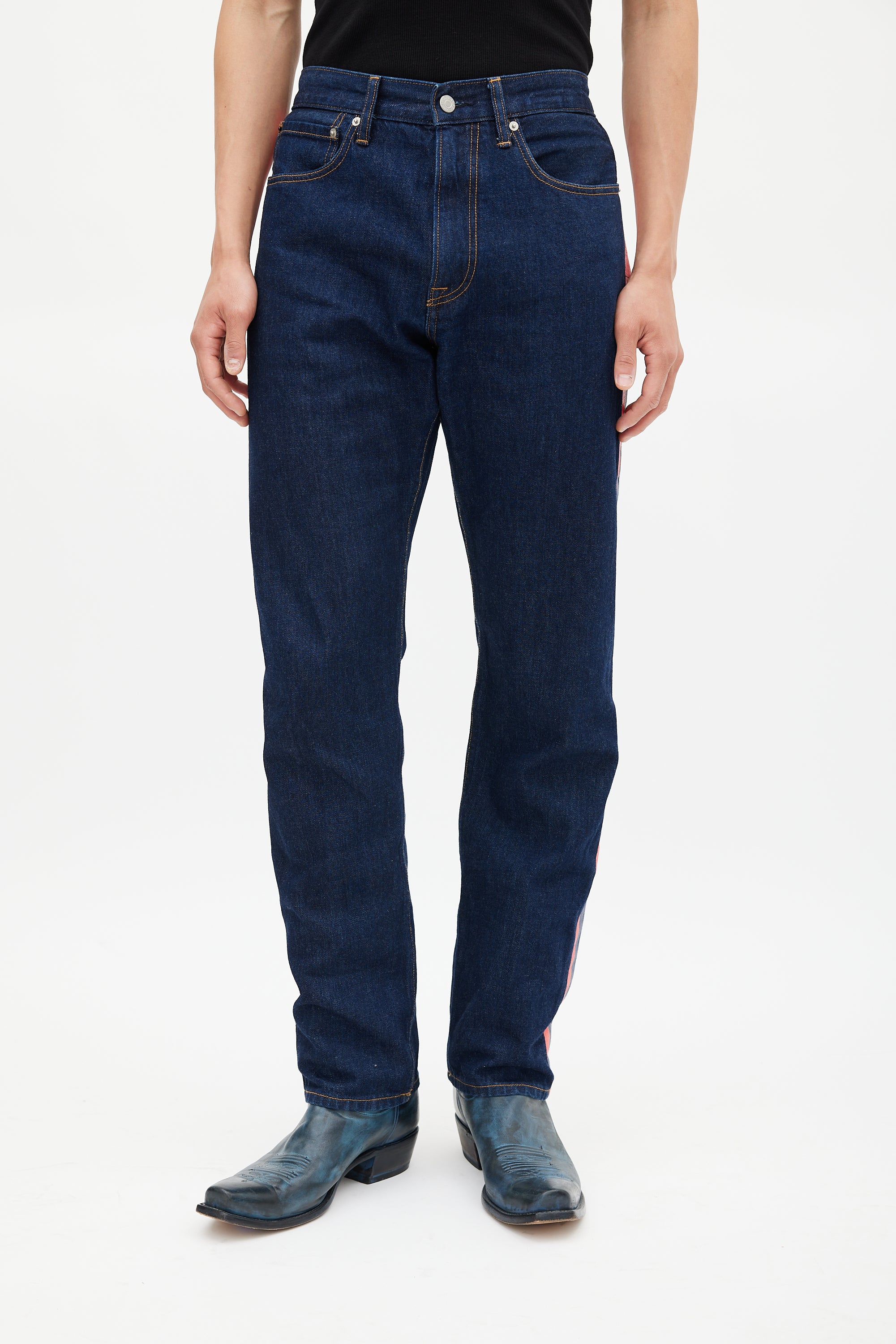 Pre-owned Calvin Klein Jeans navy CKJ035 dark wash jeans featuring a red stripe at sides, five pocket styling, embossed leather logo patch at back, straight leg, and zip fly with button closure.