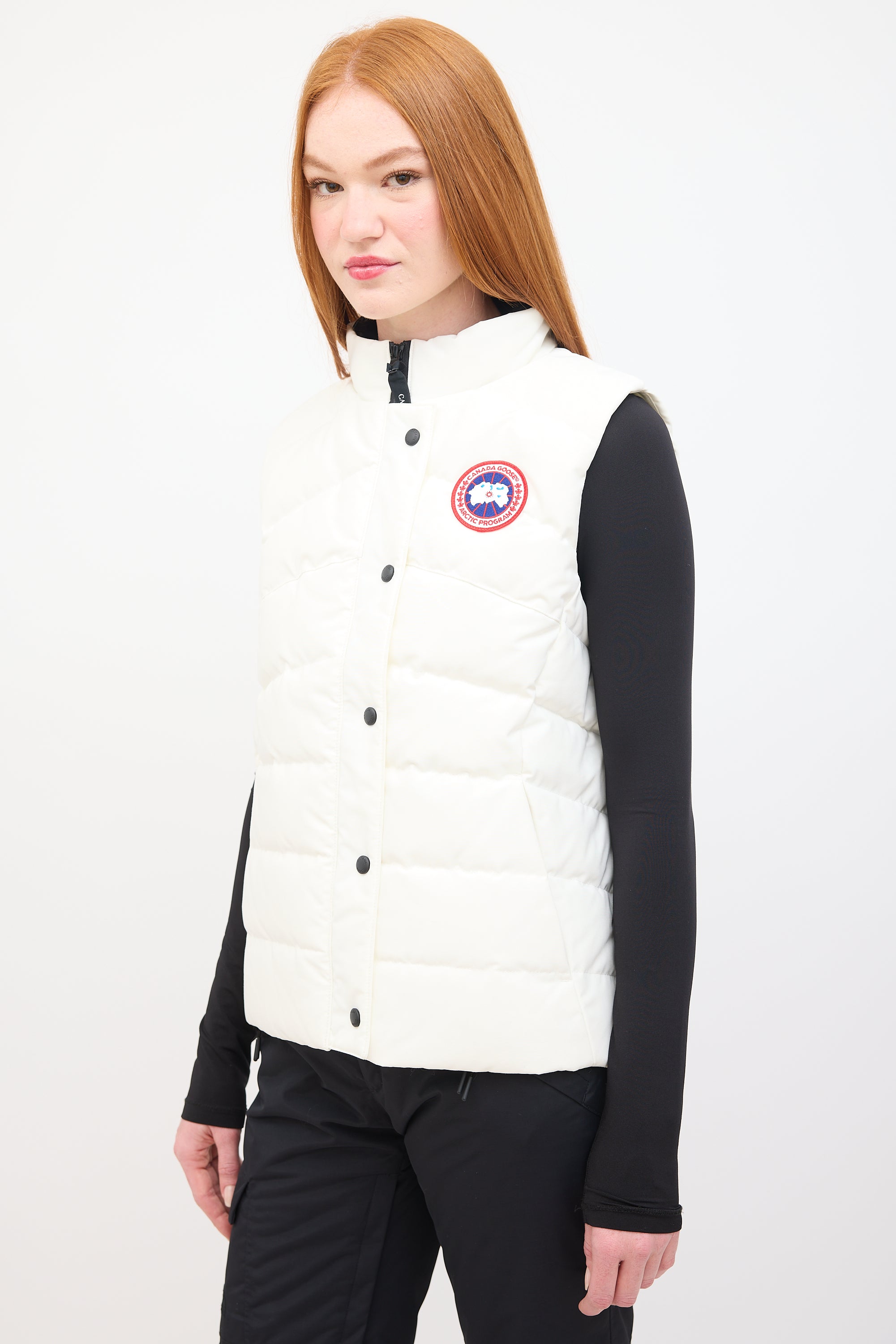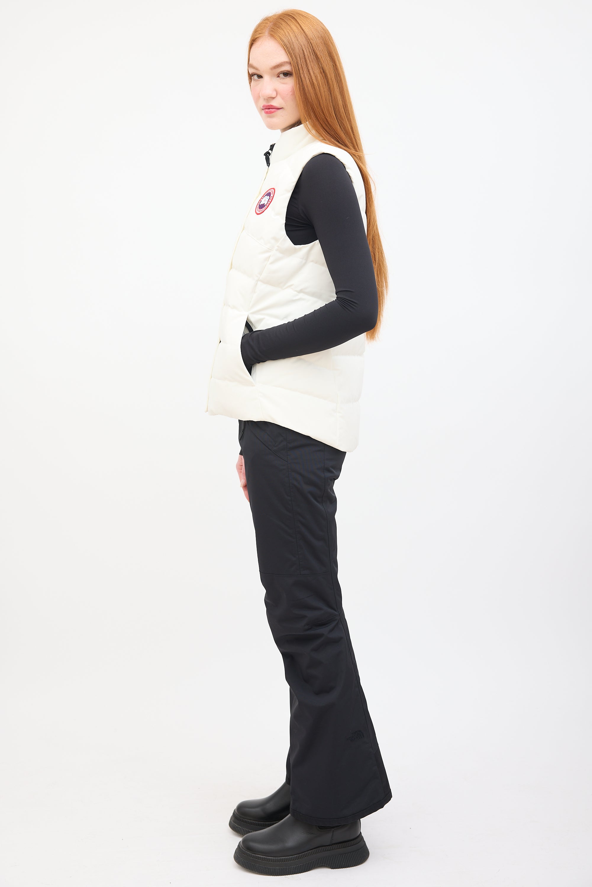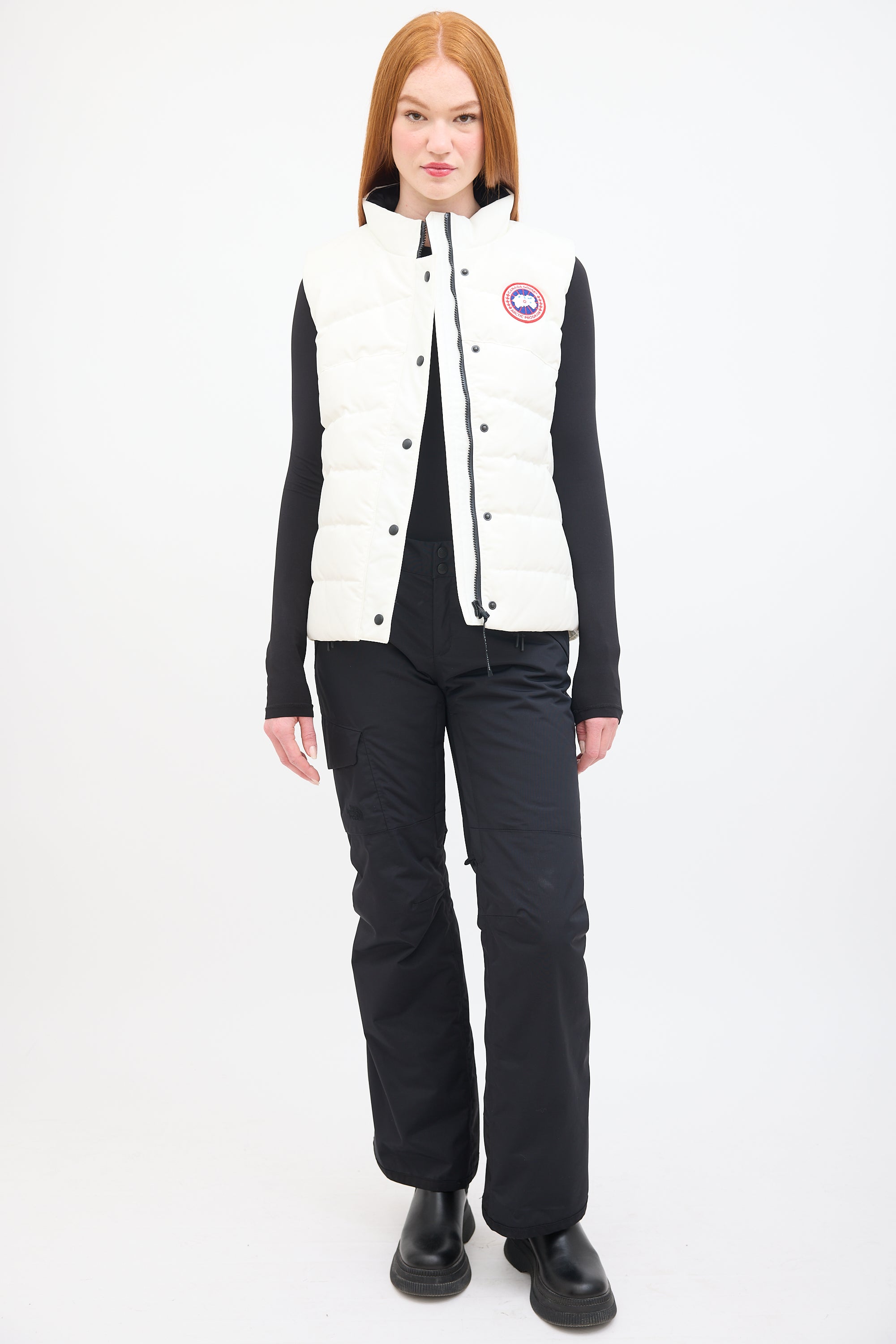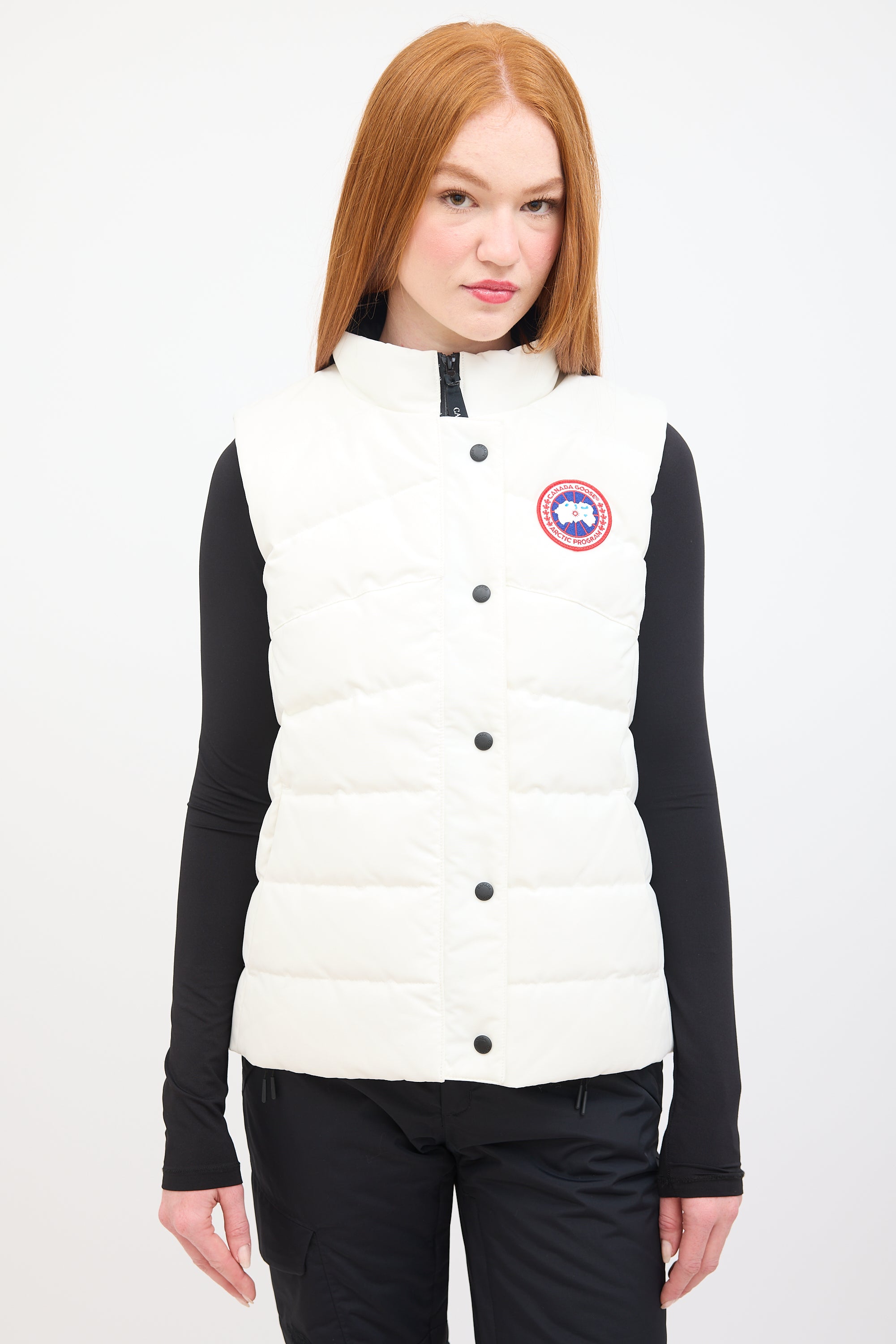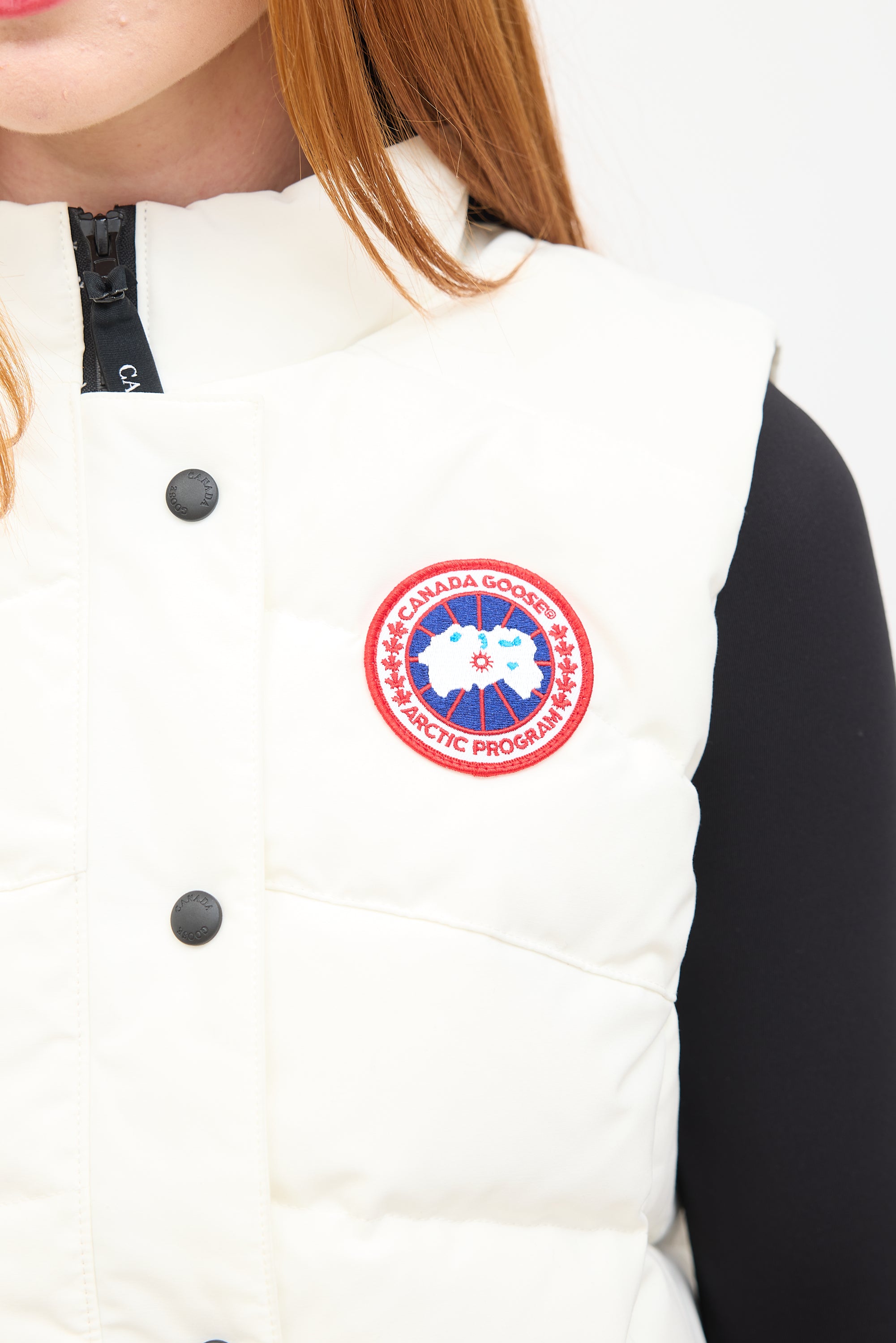 Pre-owned Canada Goose quilted puffer Freestyle down vest in North Star White featuring funnel collar, zip up front with snap buttoned placket, two slip pockets at waist, interior mesh pocket, and Canada Goose emblem patch at left chest. Lined.