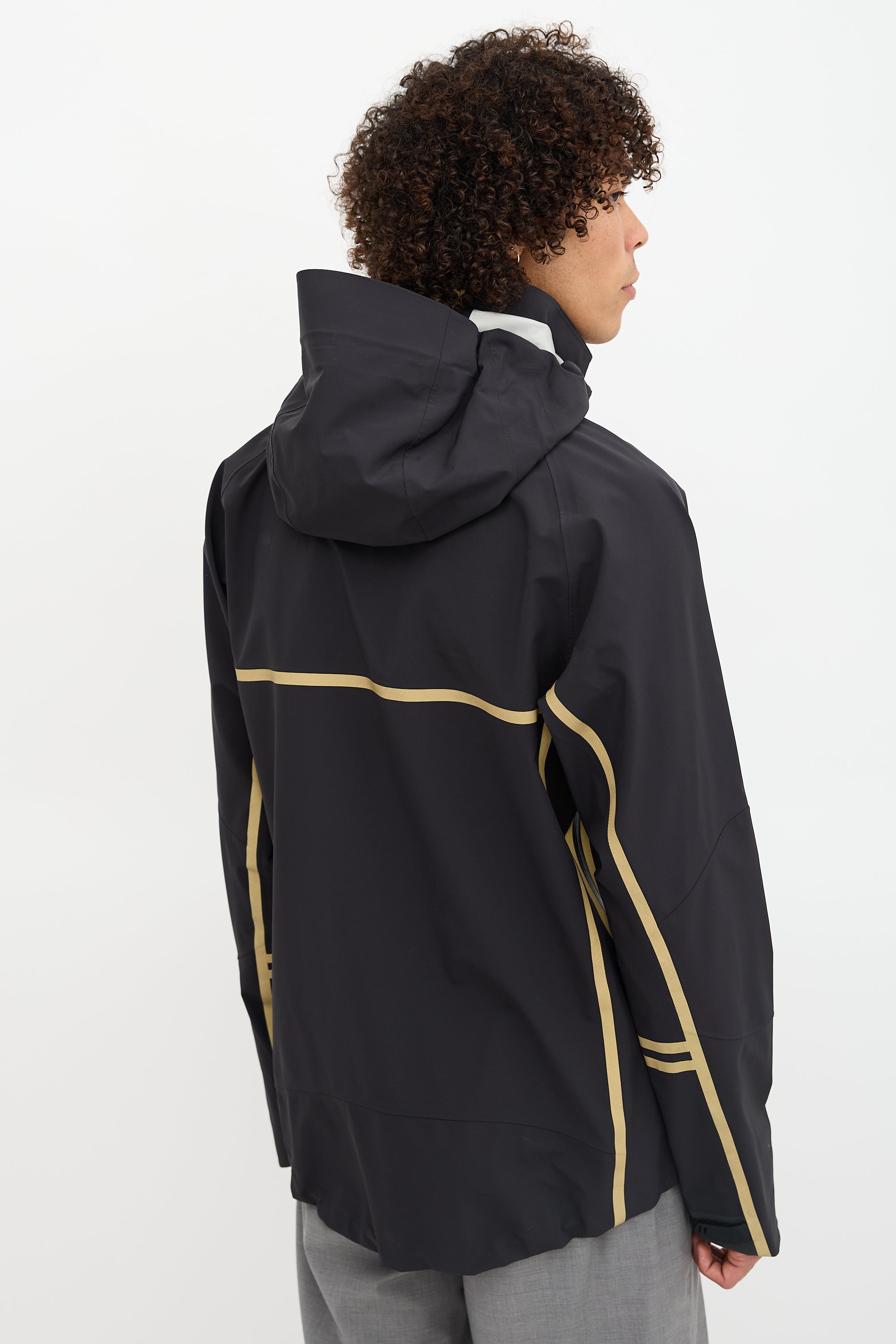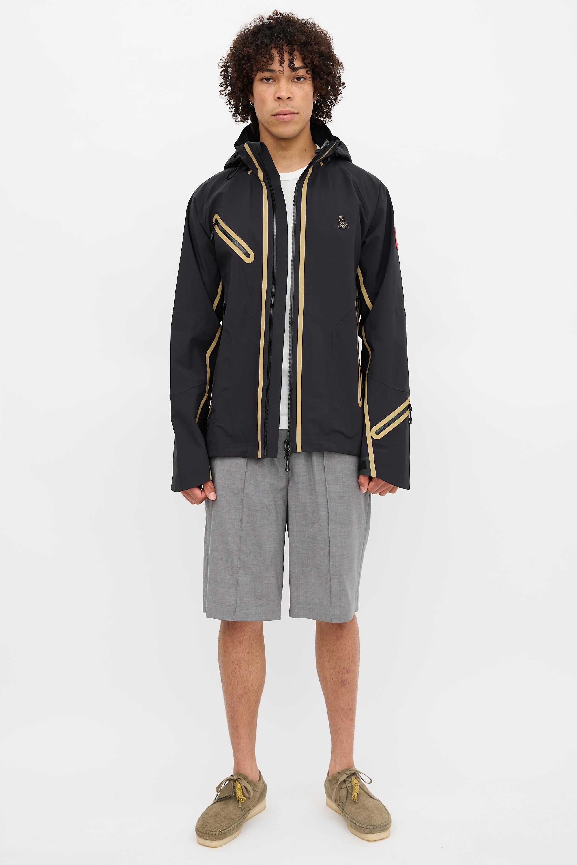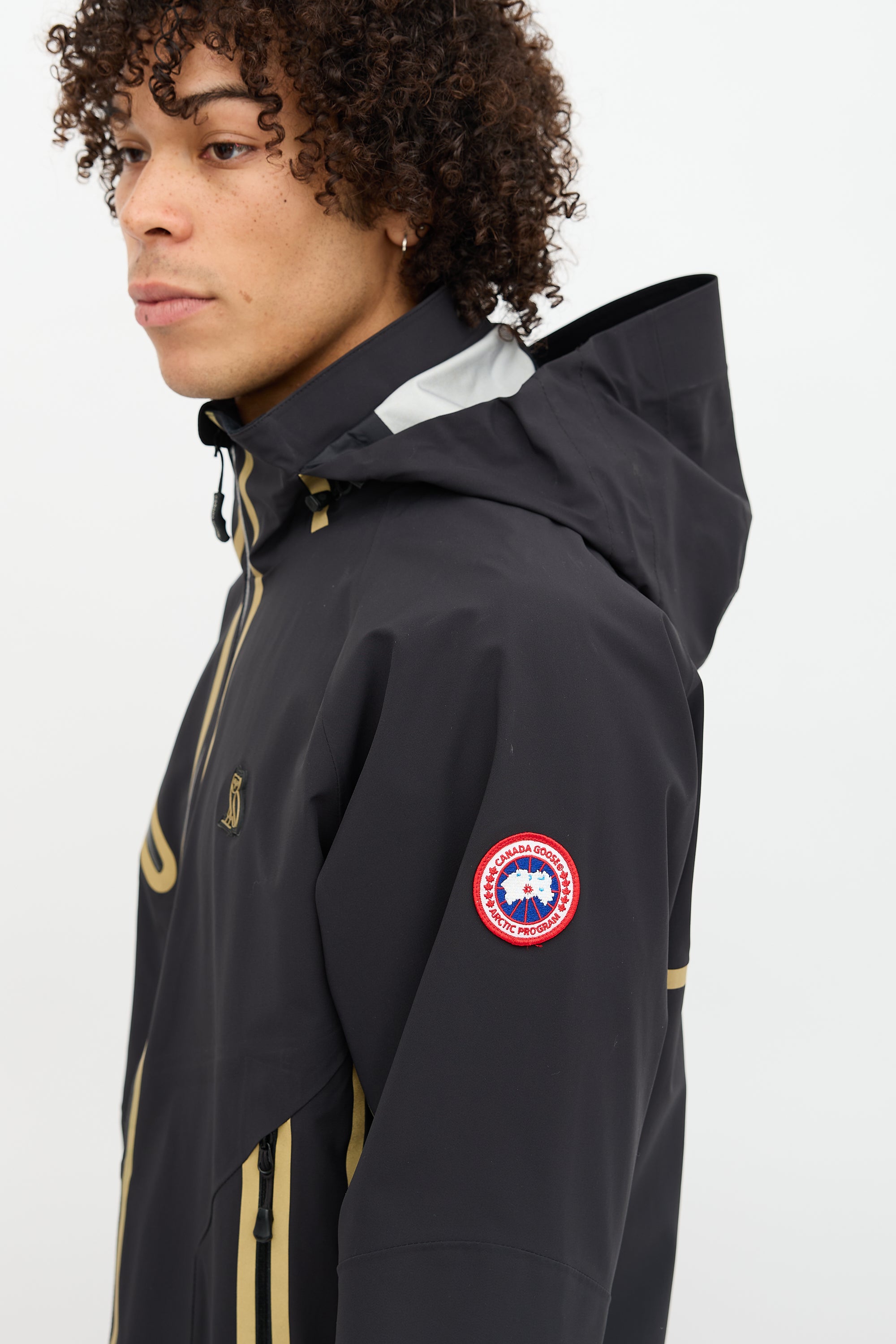 Pre-owned Canada Goose X October's Very Own 2017 black Timber shell jacket featuring gold tone reflective trim and details, high collar, attached drawcord hood with brim, double zip front, rubberized owl logo patch at left chest, three front zip pockets, one interior zip pocket, underarm vents, interior drawcord hem, signature circle logo patch and zip pocket at left sleeve, and Velcro cuffs. Lined.