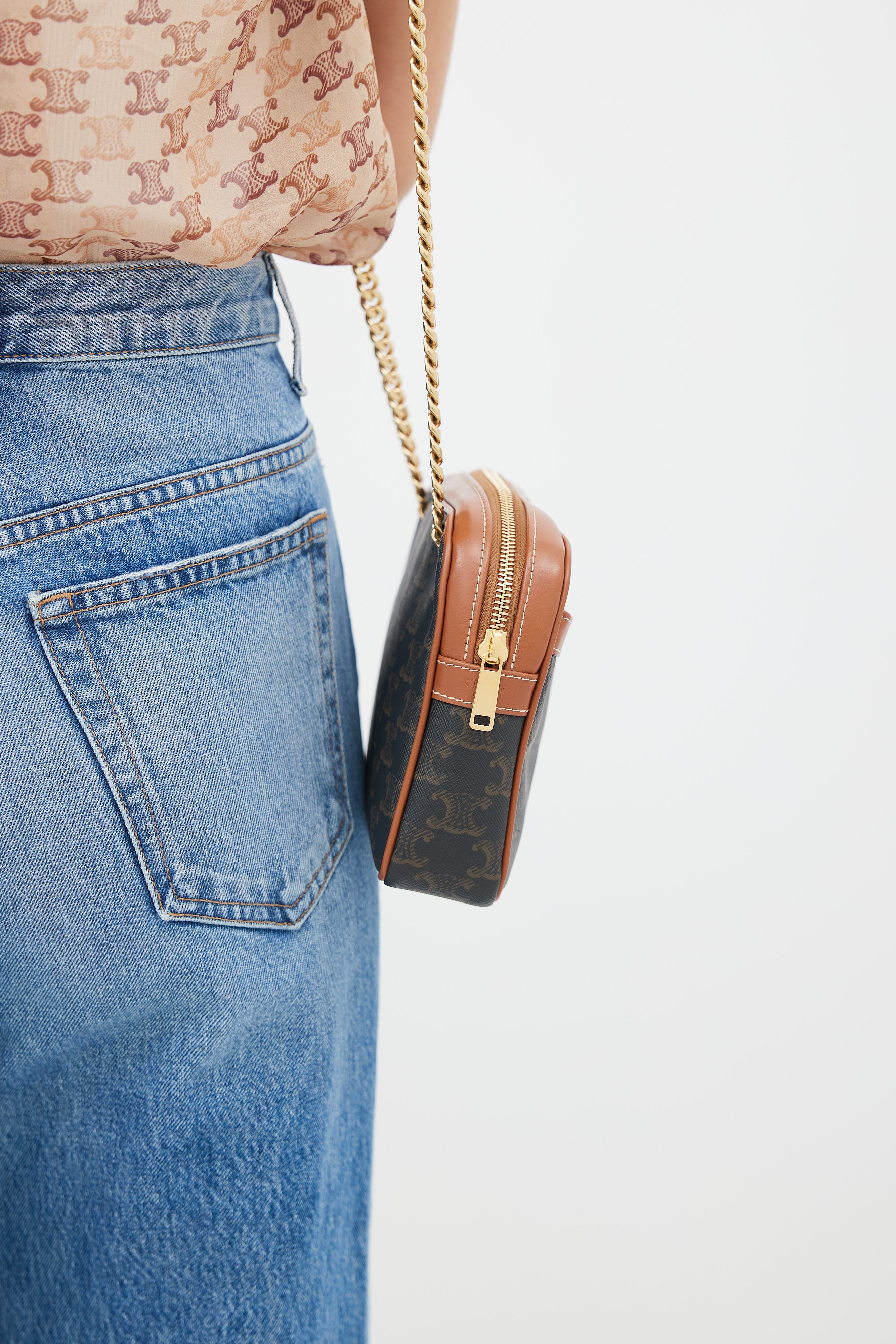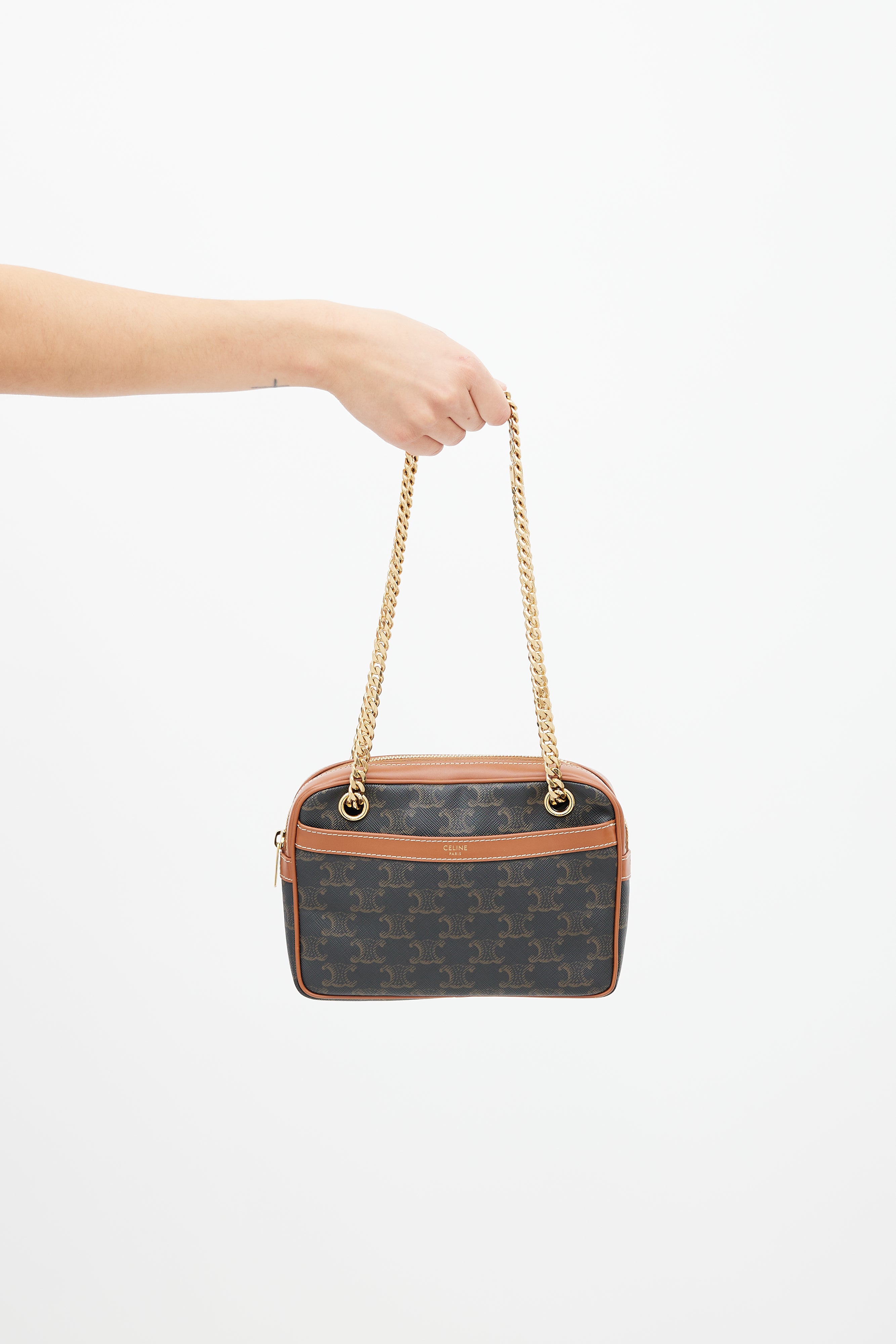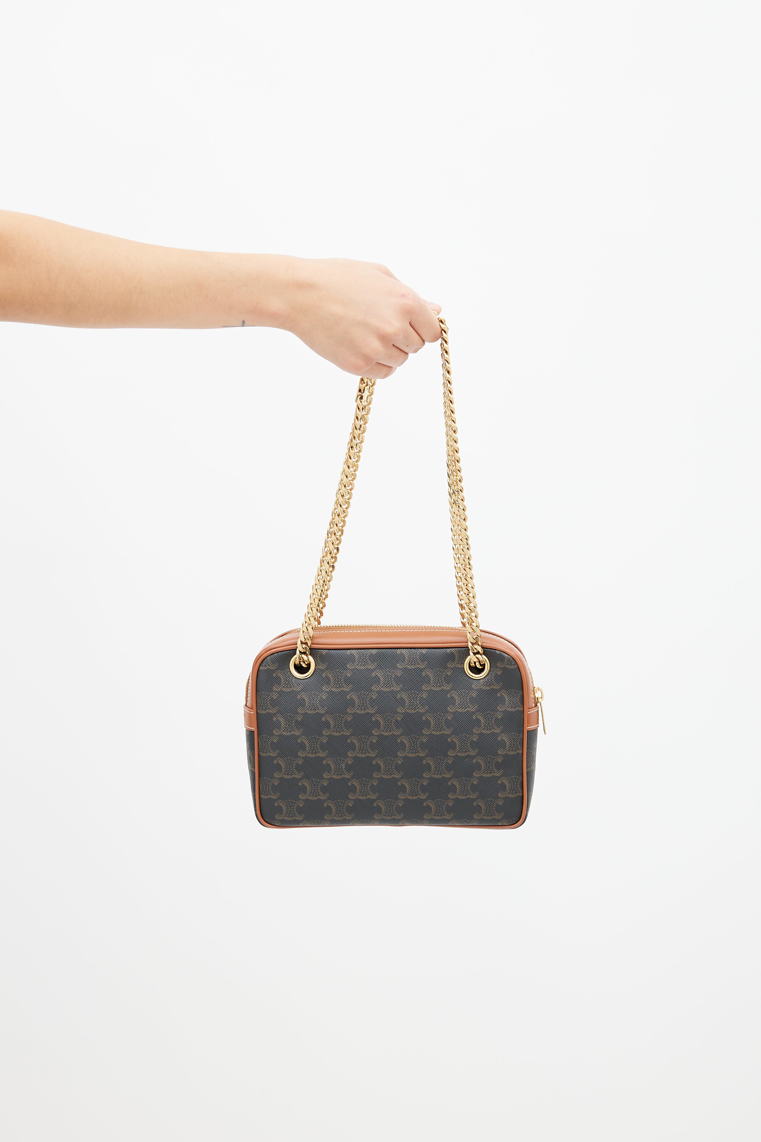 Pre-owned 2021 Celine brown Patapans shoulder bag featuring Triomphe monogram coated canvas, brown leather trim, stamped logo at front, embossed logo at side, slip pocket at front, gold tone chain strap, zip closure at top, canvas lining, and zip pocket inside. Comes with original dust bag.