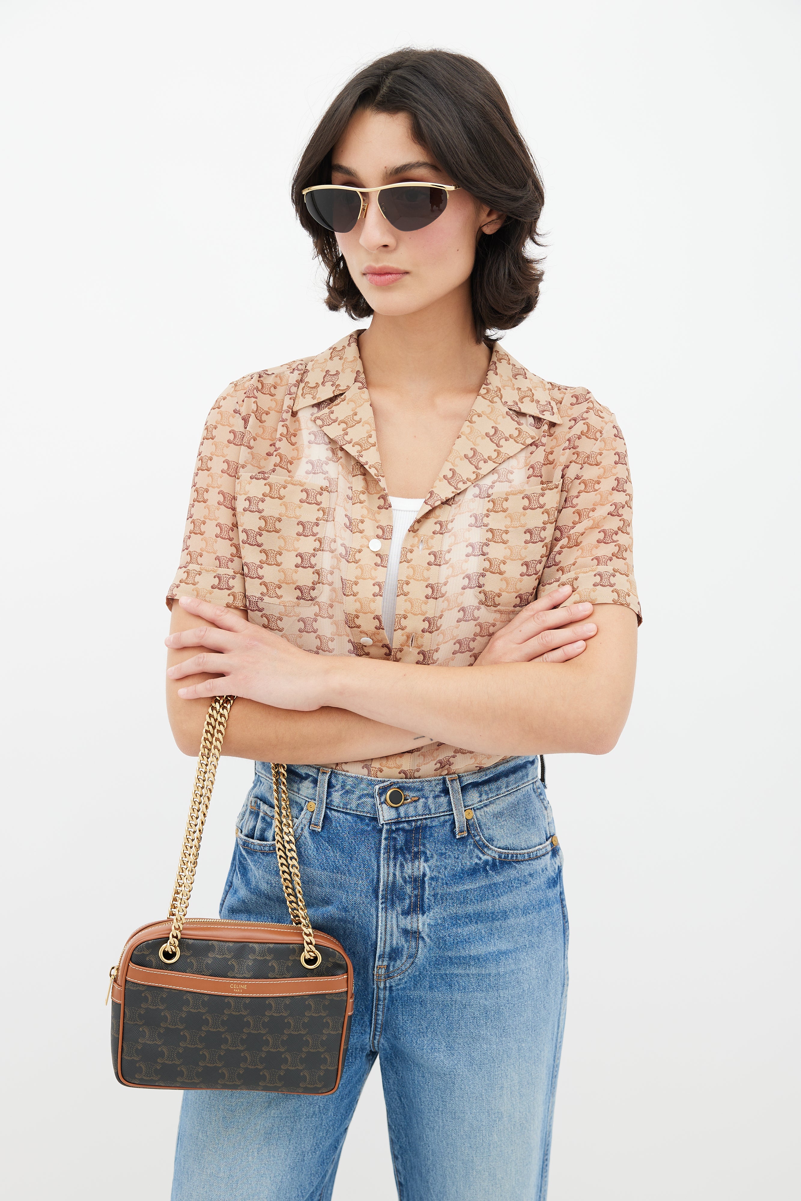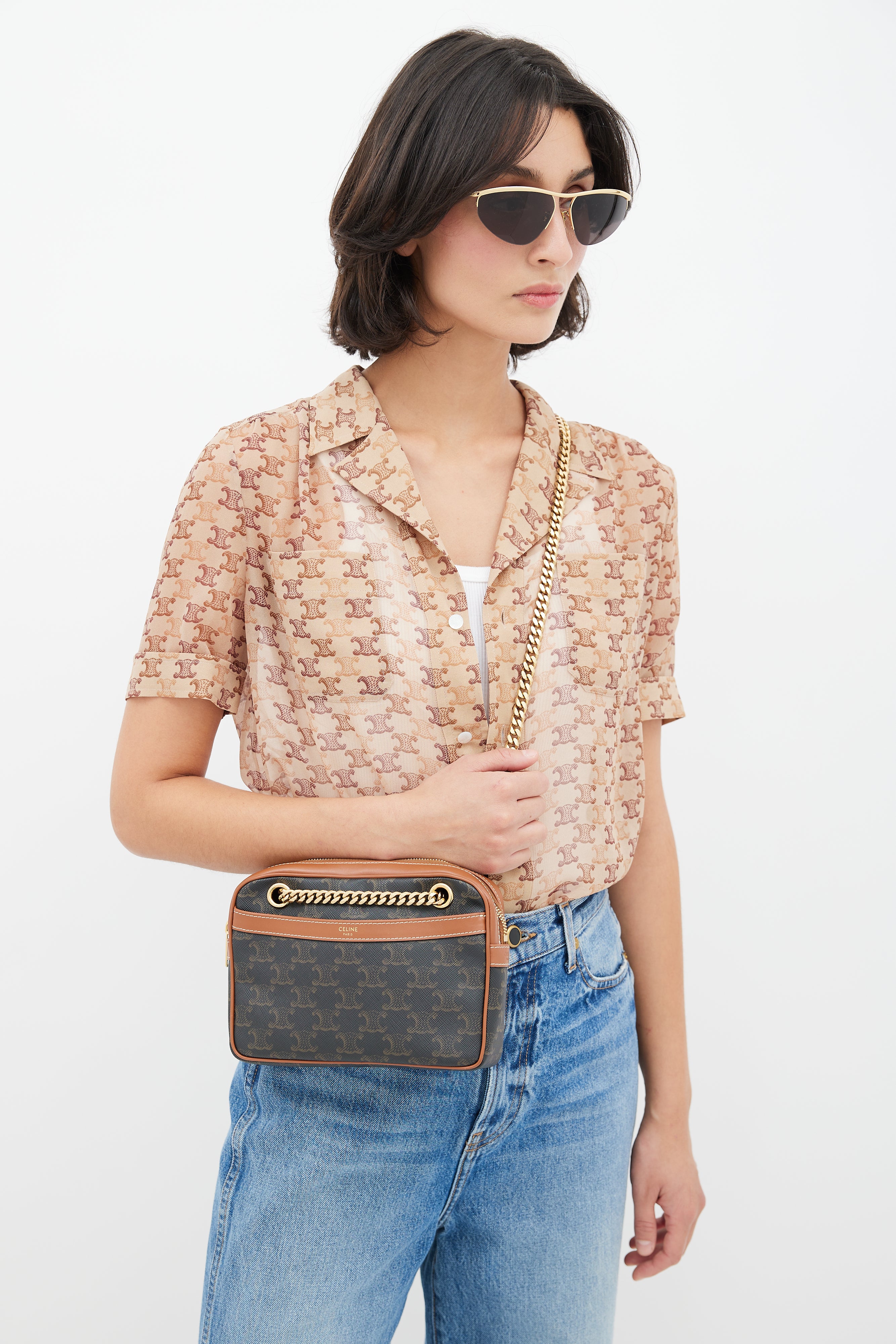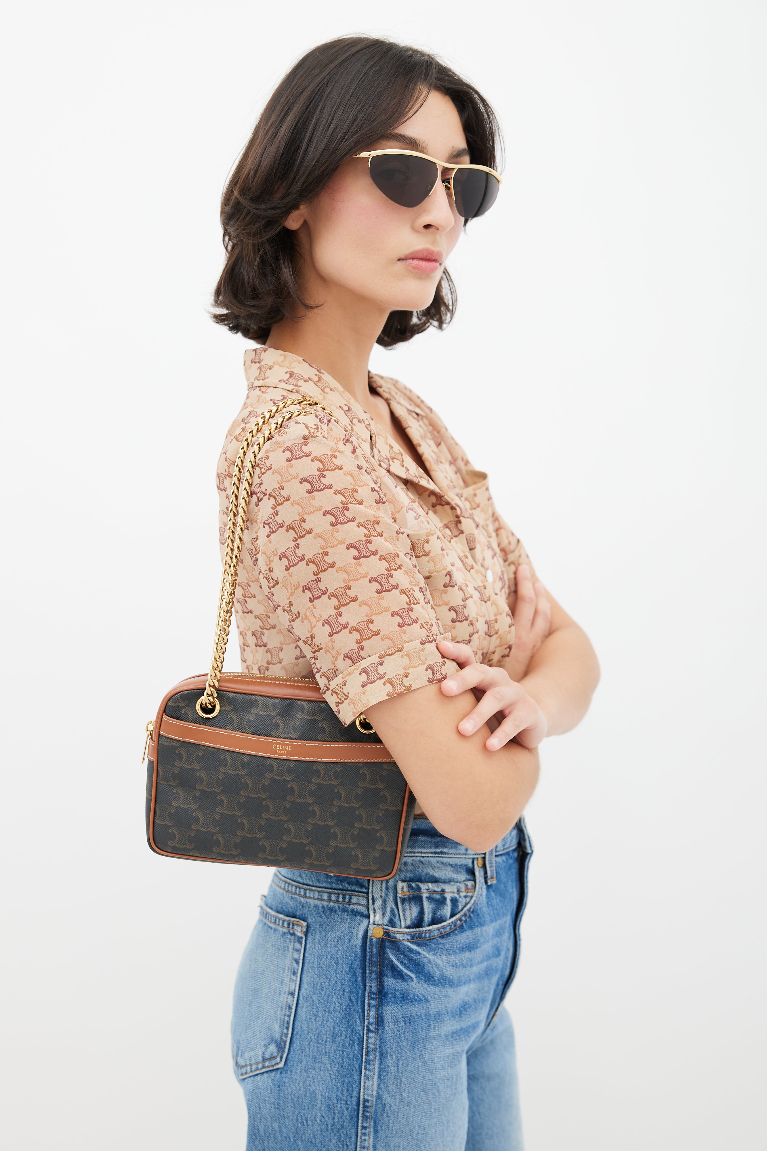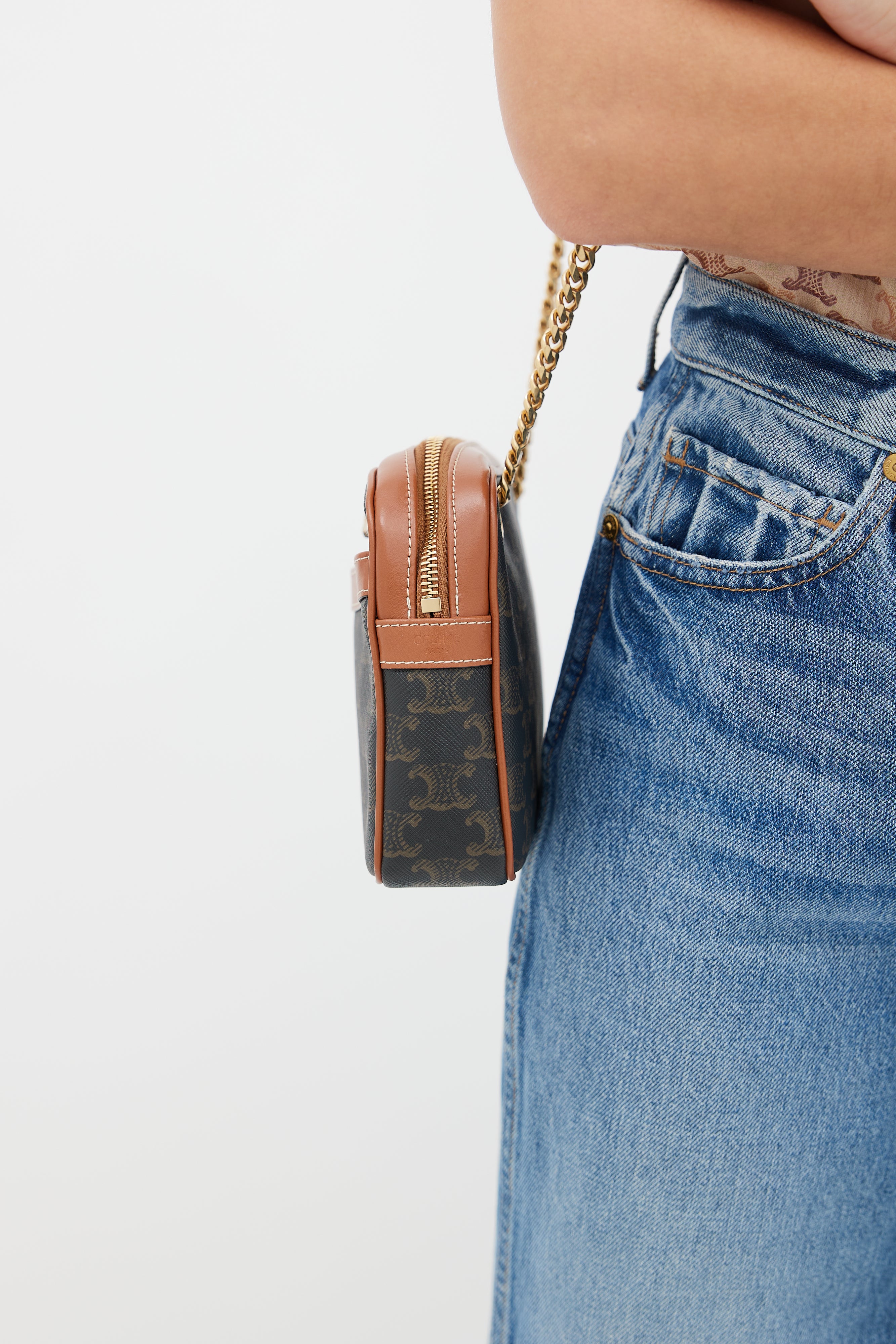 Pre-owned 2021 Celine brown Patapans shoulder bag featuring Triomphe monogram coated canvas, brown leather trim, stamped logo at front, embossed logo at side, slip pocket at front, gold tone chain strap, zip closure at top, canvas lining, and zip pocket inside. Comes with original dust bag.