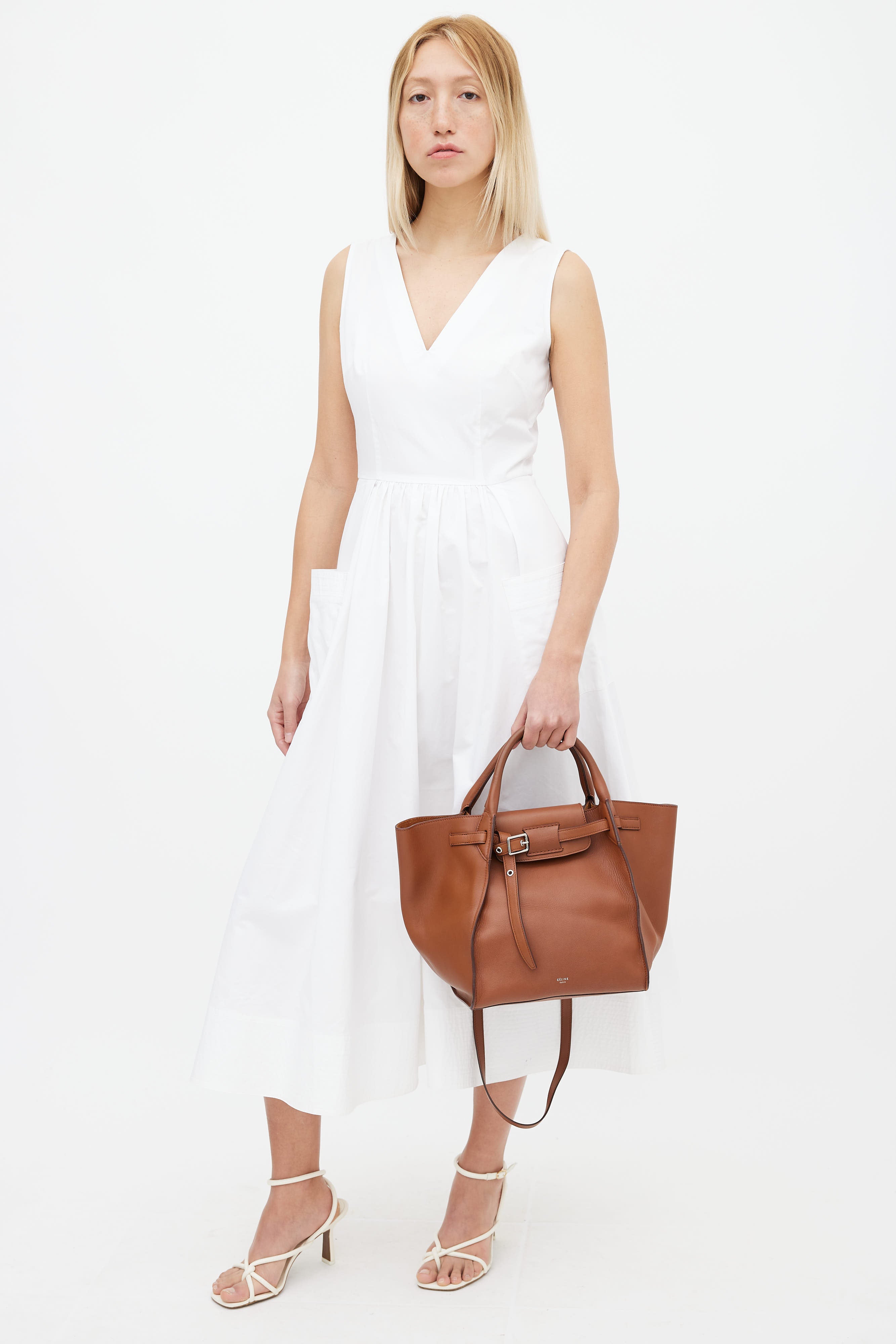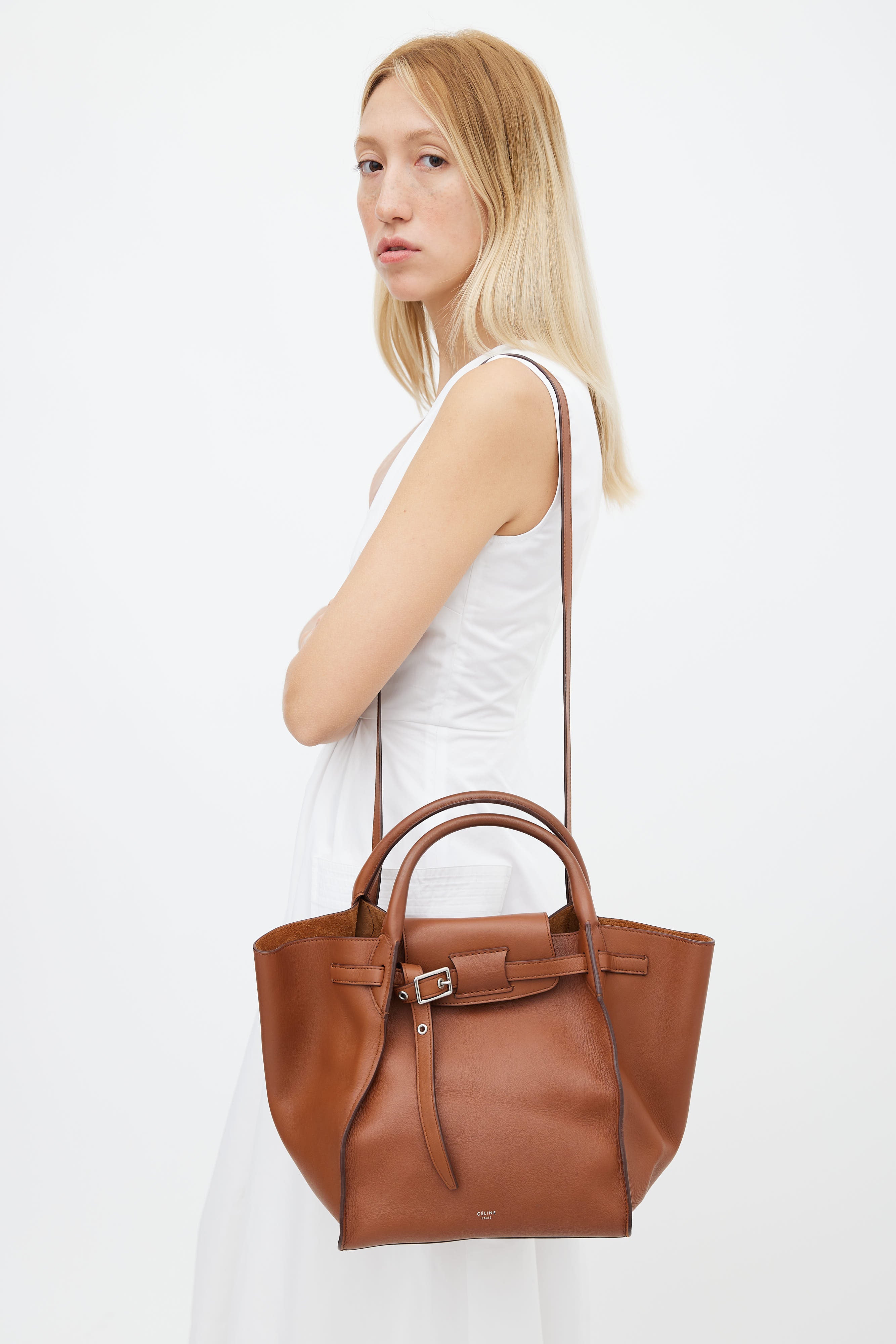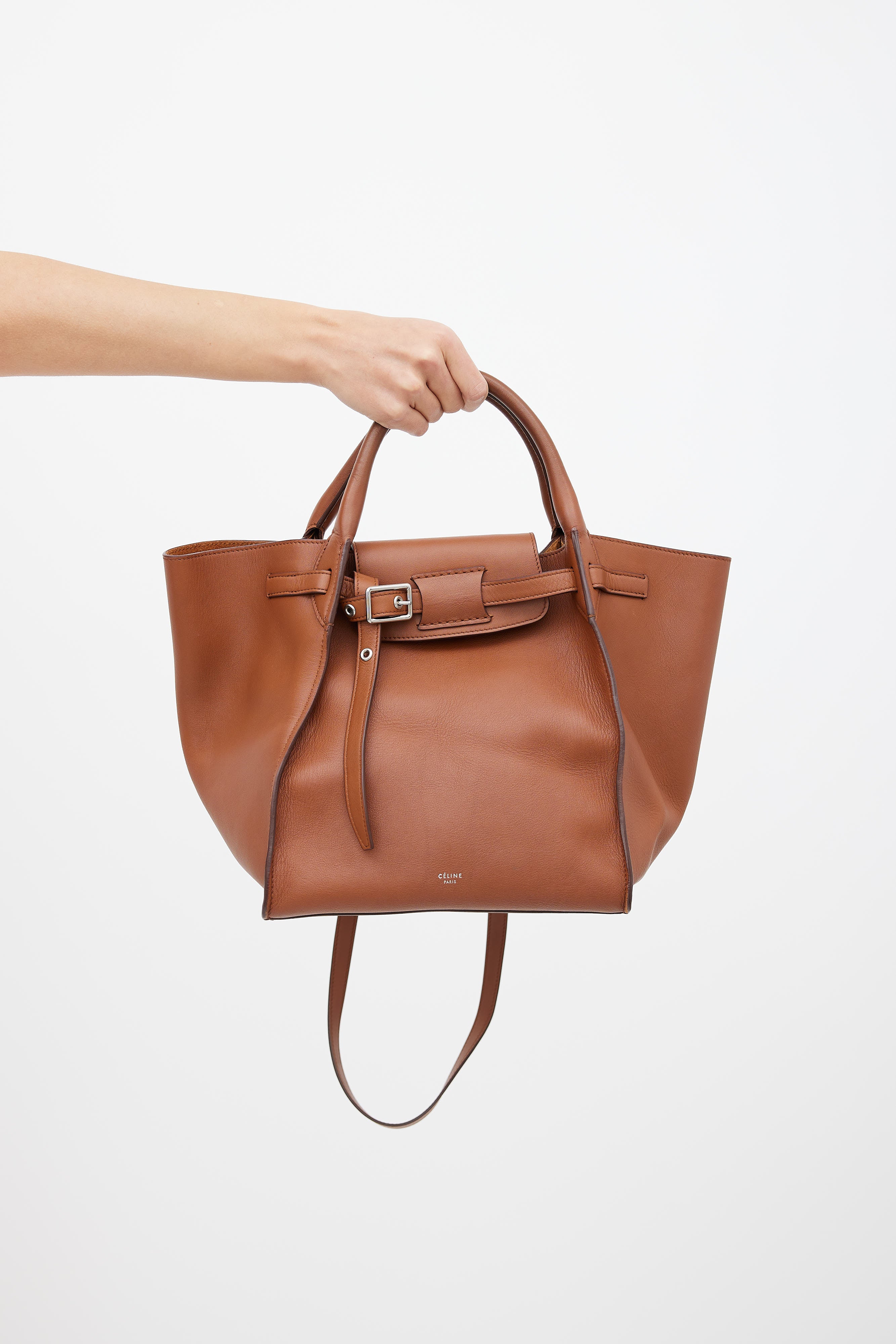 Pre-owned Celine Big Bag tote in brown featuring dual rolled top handle, flat shoulder strap, silver-tone hardware, belt closure at front, interior clasp closure, and interior zip pocket. Original dust bag included.