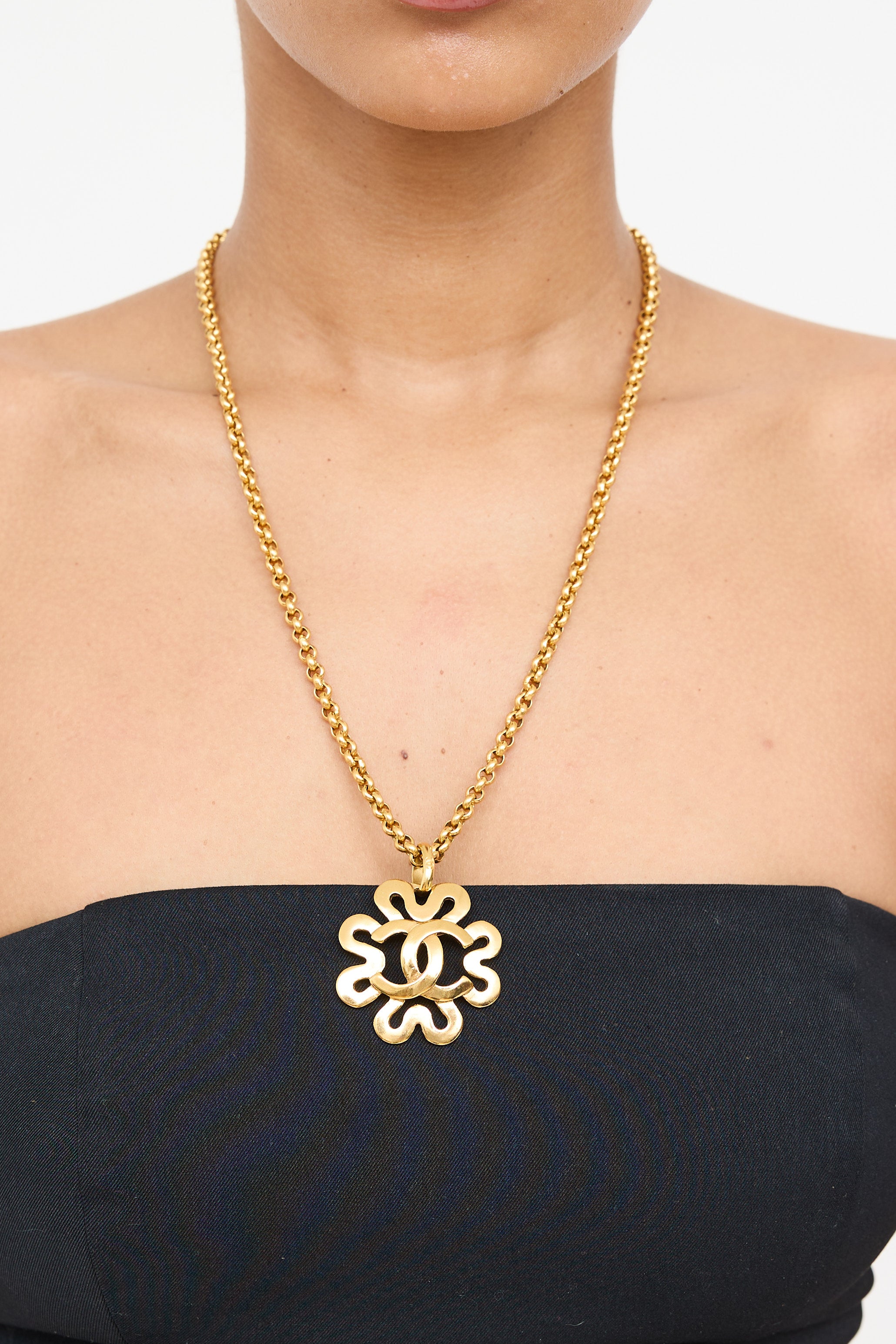Pre-owned Chanel 1995 gold tone necklace featuring a chain link, floral CC logo pendant, and spring ring clasp closure.