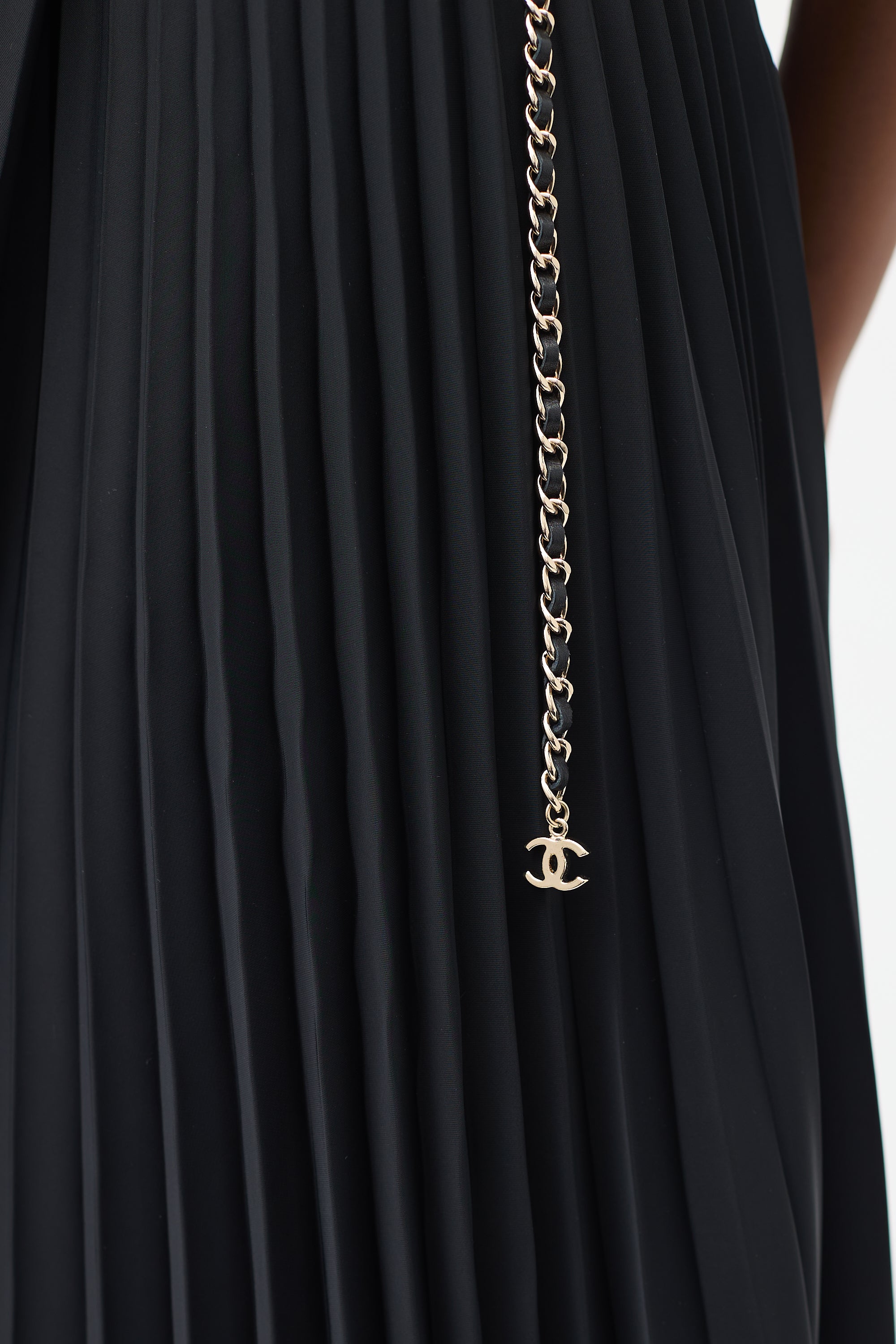 Pre-owned Chanel Fall 2005 belt featuring black leather and silver tone braided chain, interlocking CC logo charm at one end, "C.H.A.N.E.L." logo letter charms, and hook and eye closure. Stamped with designer signature, "04", interlocking CC circle logo, "V", and "Made in France." Comes with original box.