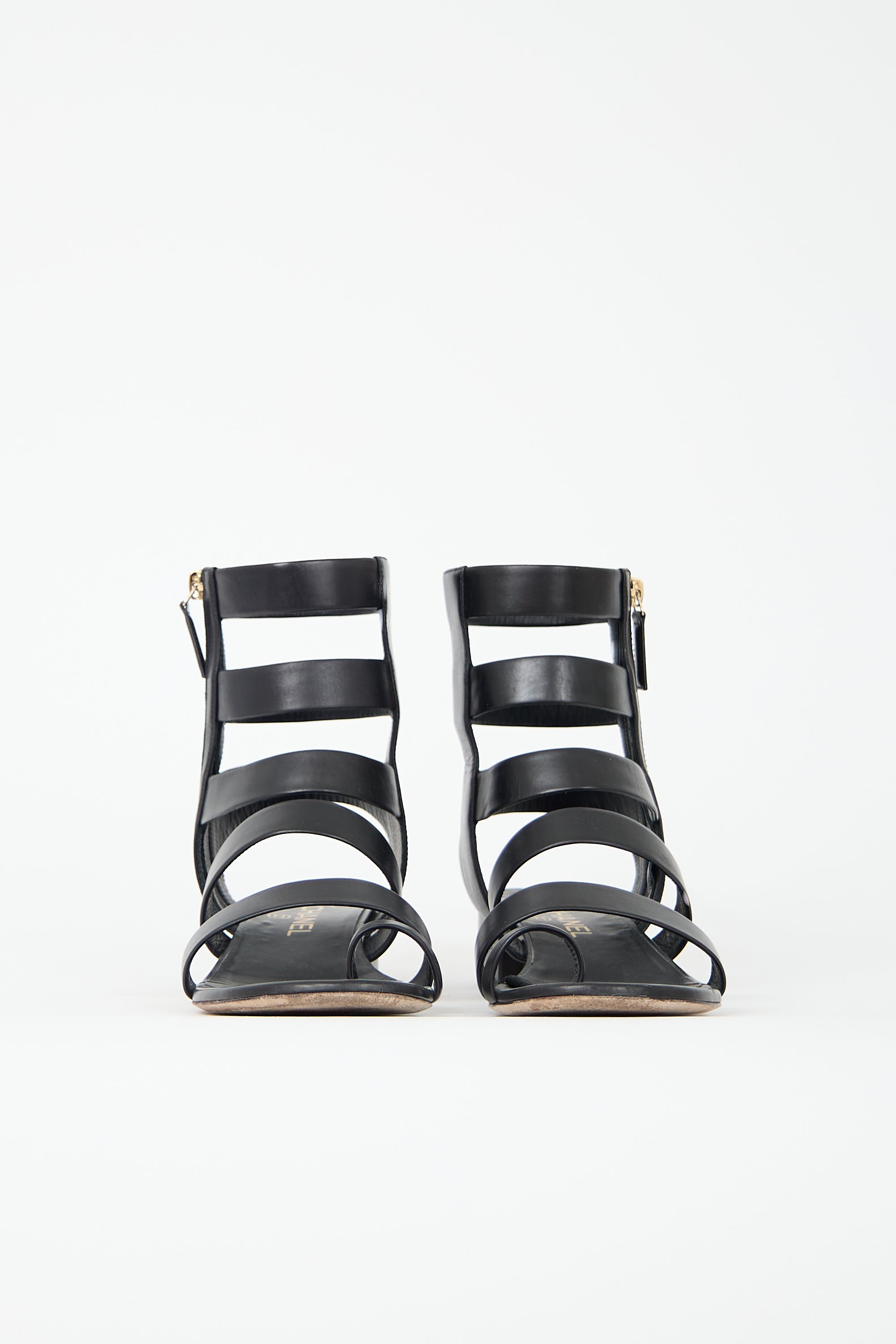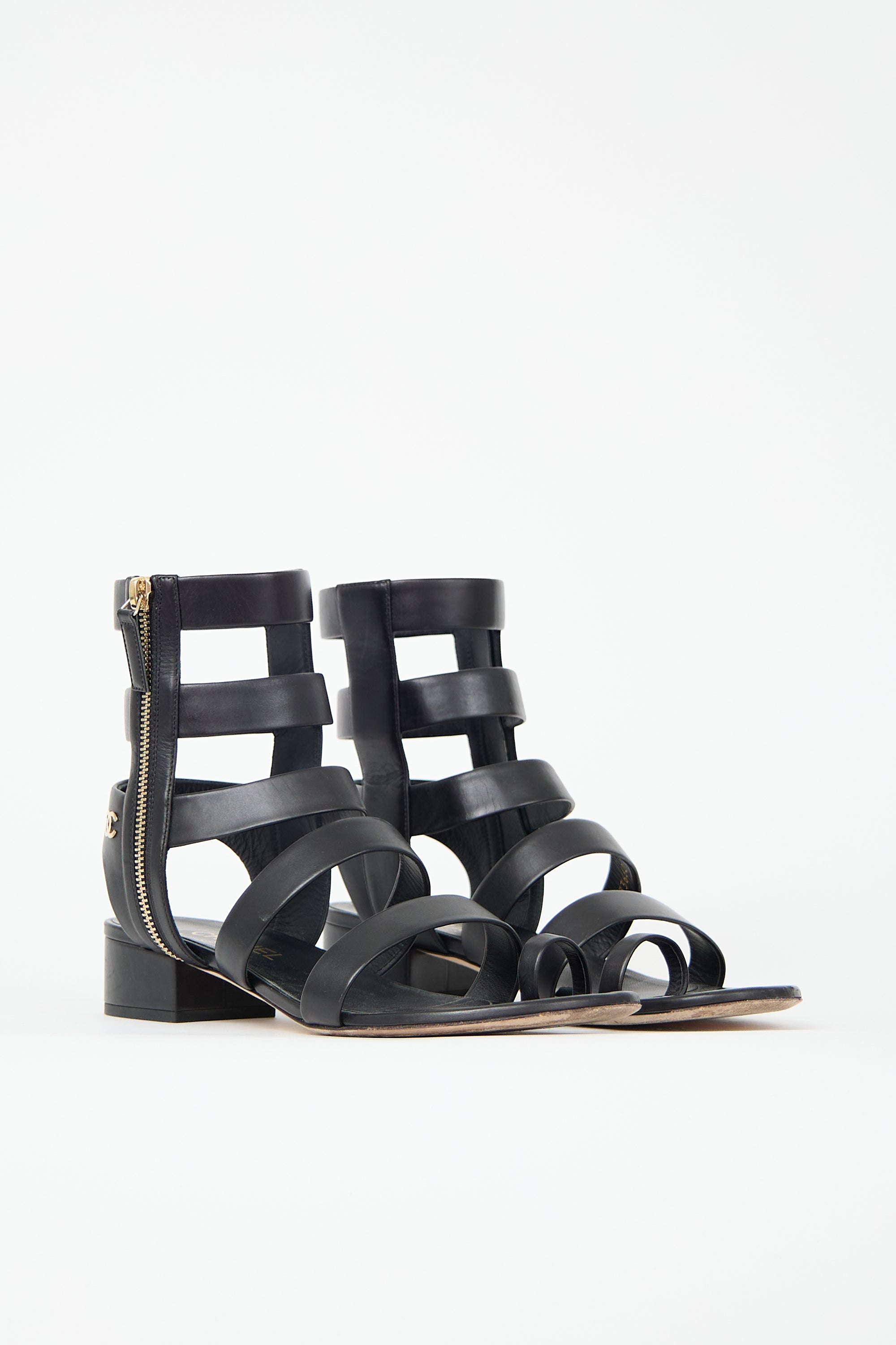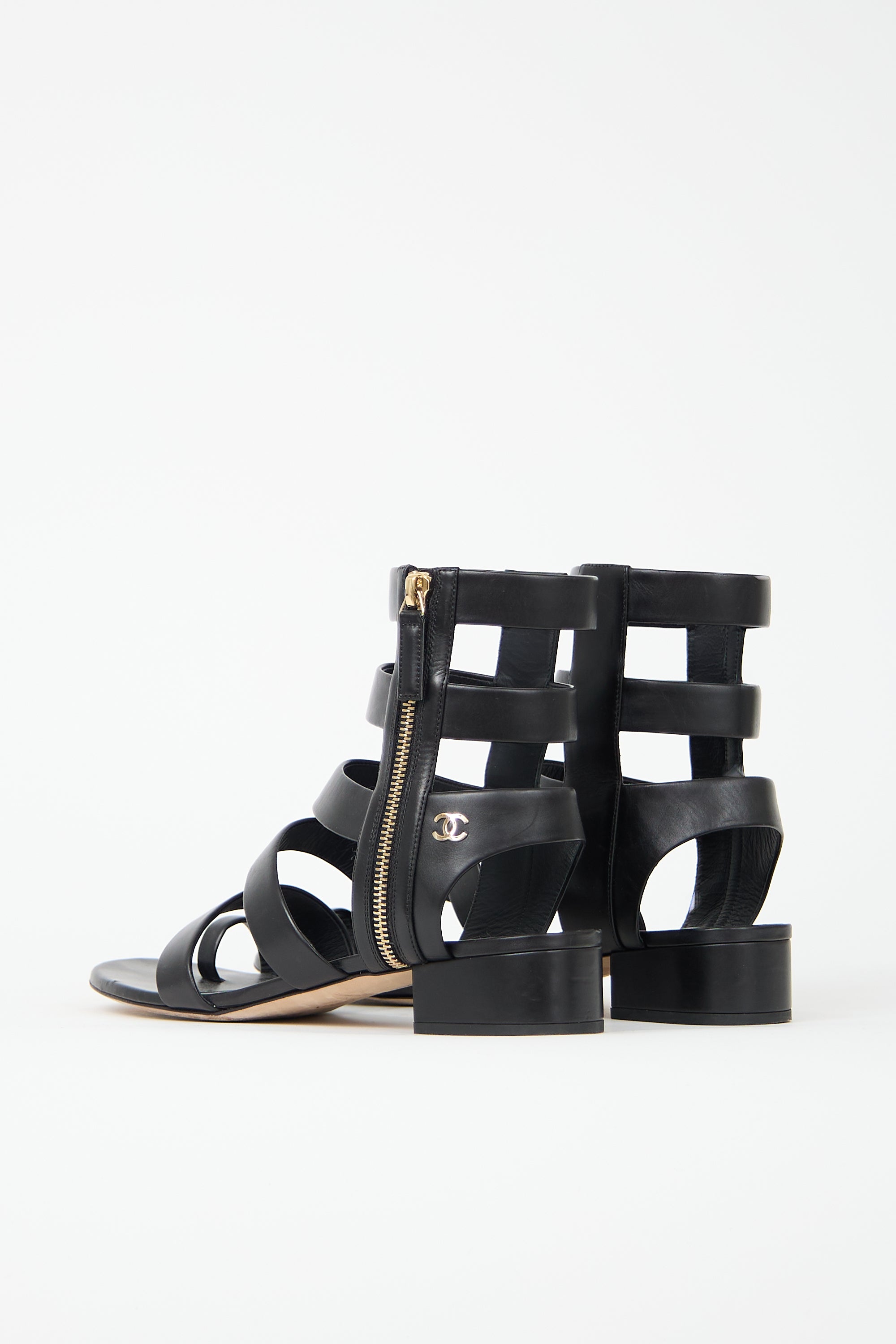Pre-owned Chanel 2018 black leather gladiator sandals featuring open rounded toe, strappy cage upper, interlocking CC embellishment at quarter, outer side zip closure, and short covered block heel. Comes with original dust bags.