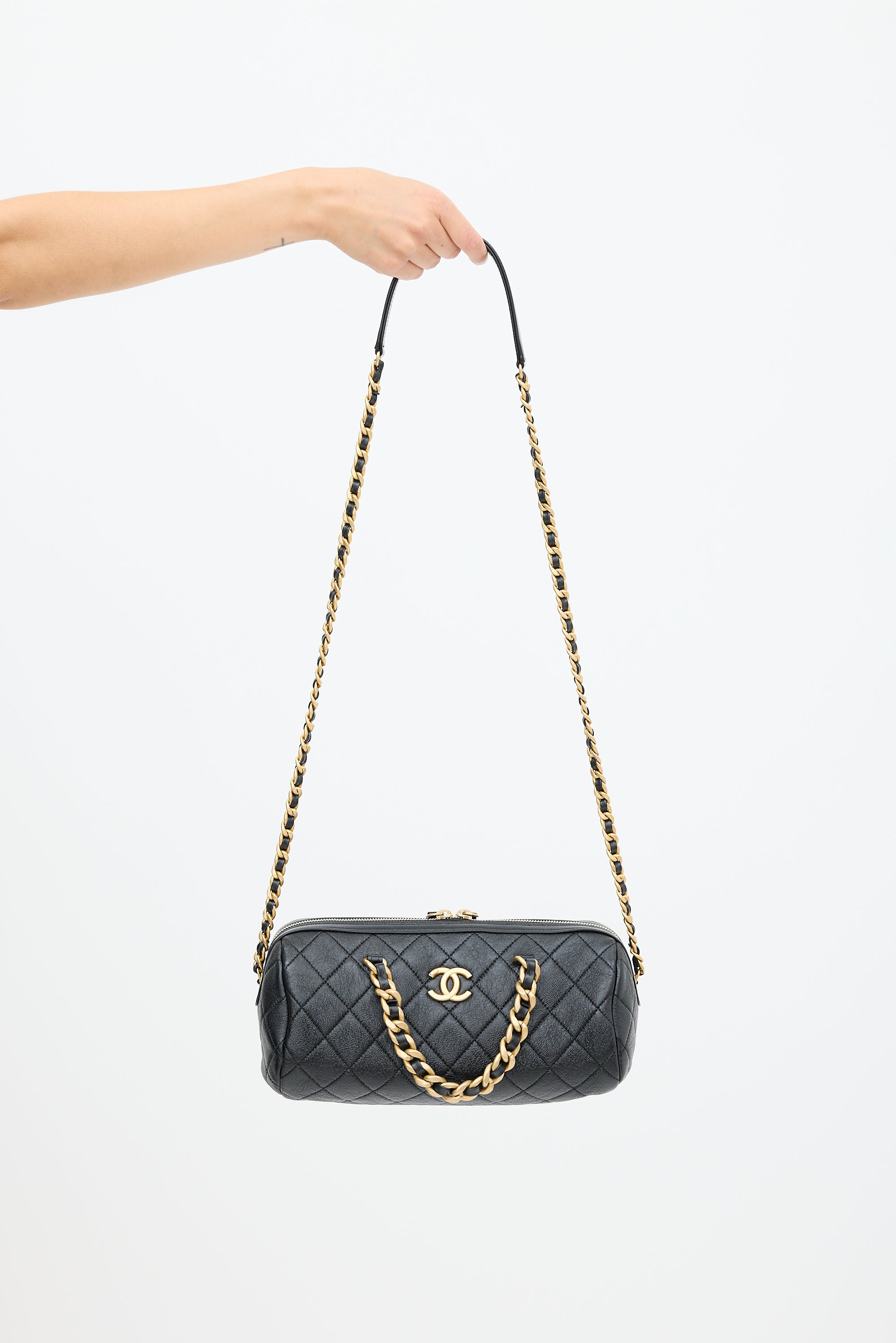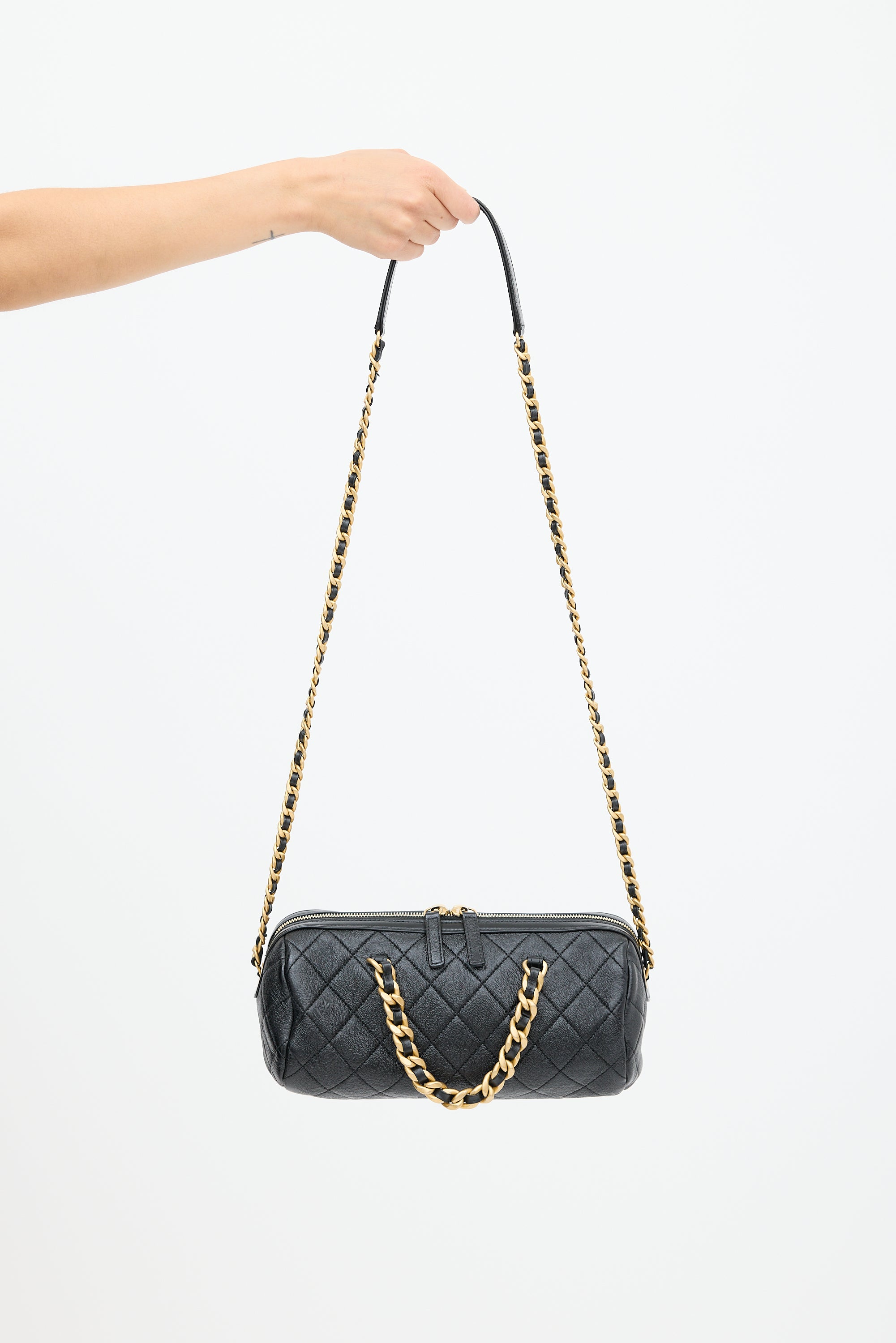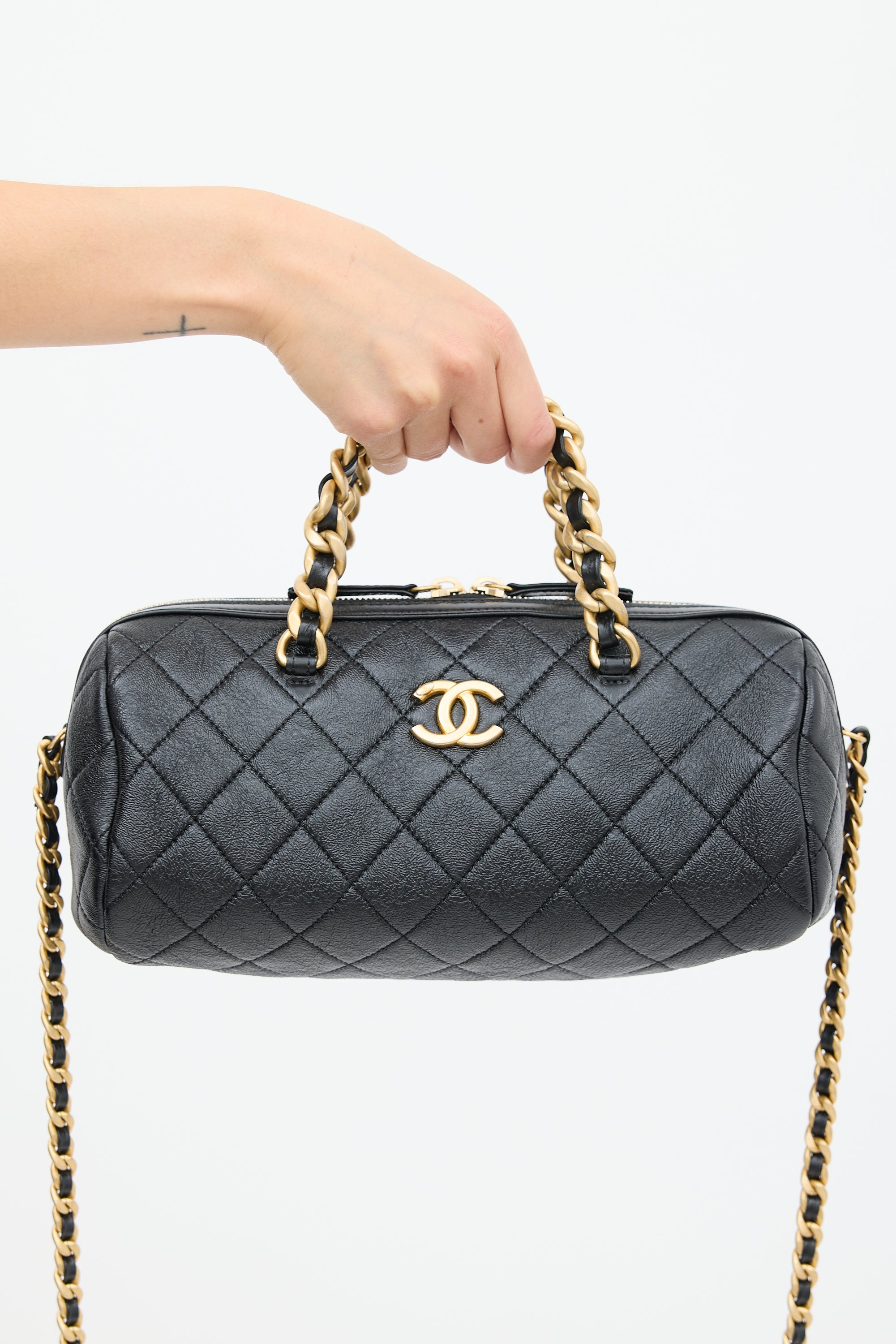 Pre-owned Chanel 2019 black Bowling lambskin leather bag featuring a gold tone CC logo at front, two gold tone braided chain top handles, one main compartment with one slip pocket and one zip pocket, braided chain shoulder strap, quilted stitching, and top zip closure. Comes with original box. Includes card of authenticity.