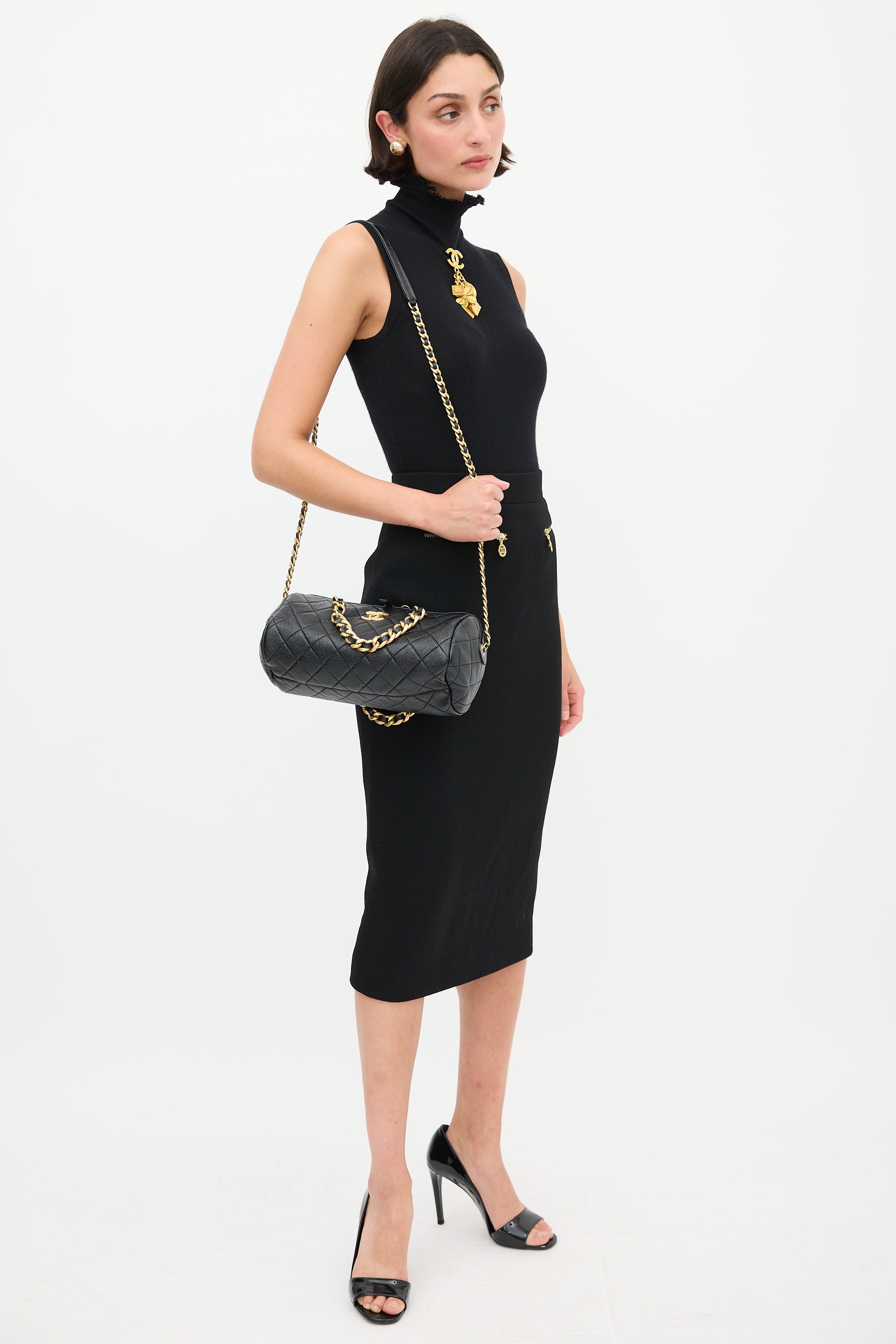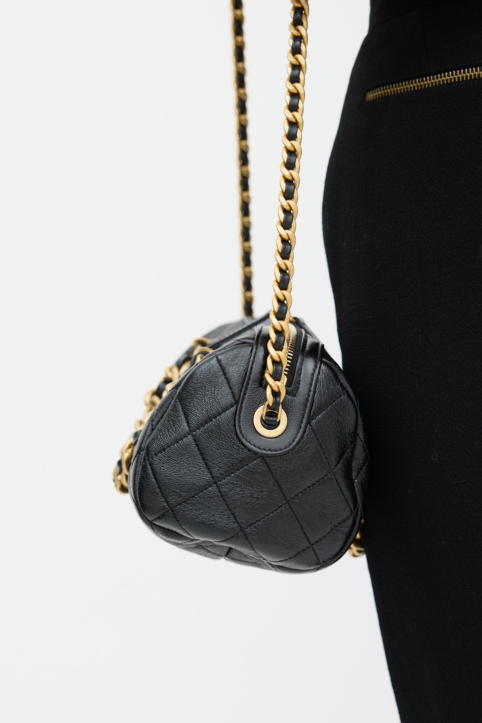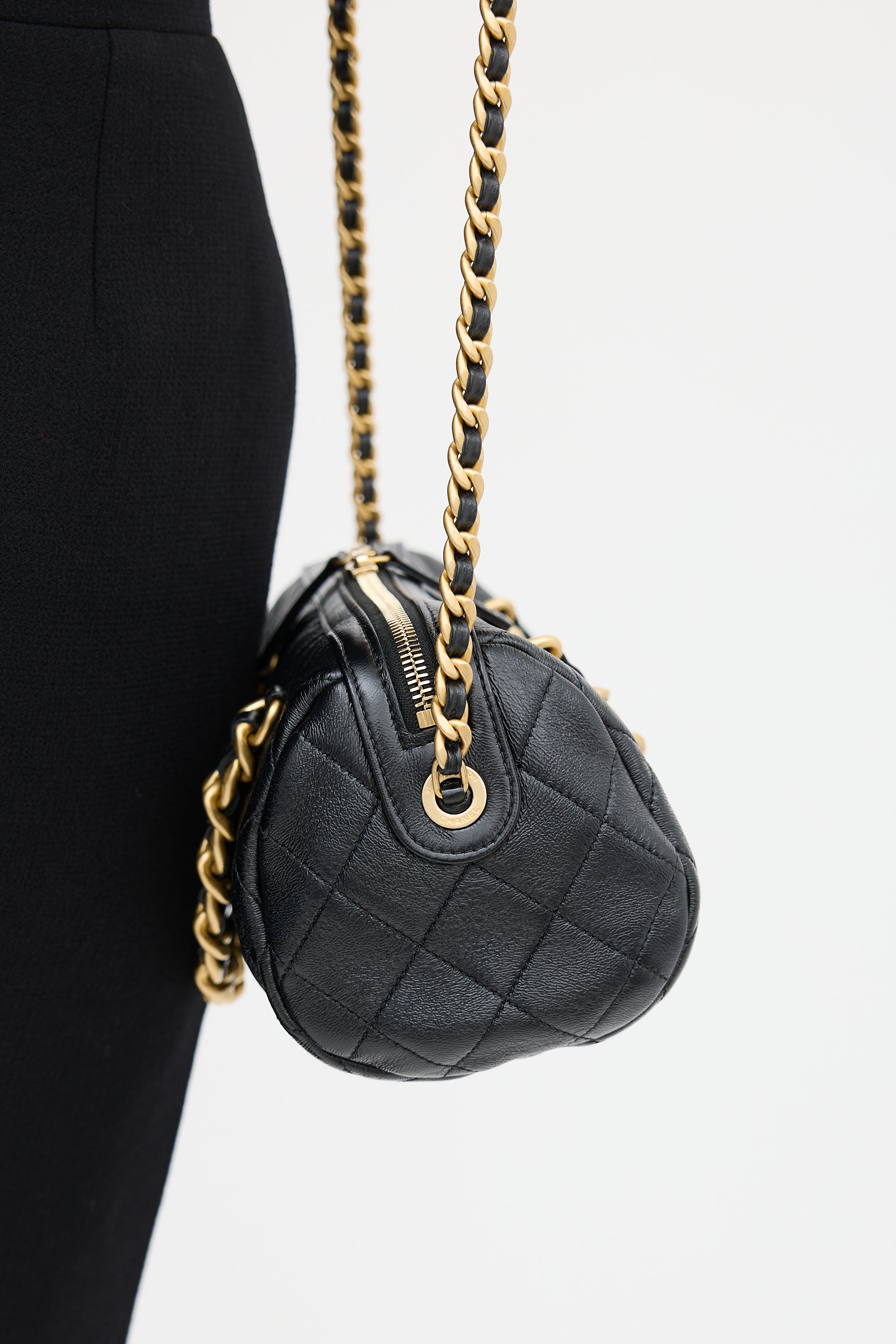Pre-owned Chanel 2019 black Bowling lambskin leather bag featuring a gold tone CC logo at front, two gold tone braided chain top handles, one main compartment with one slip pocket and one zip pocket, braided chain shoulder strap, quilted stitching, and top zip closure. Comes with original box. Includes card of authenticity.