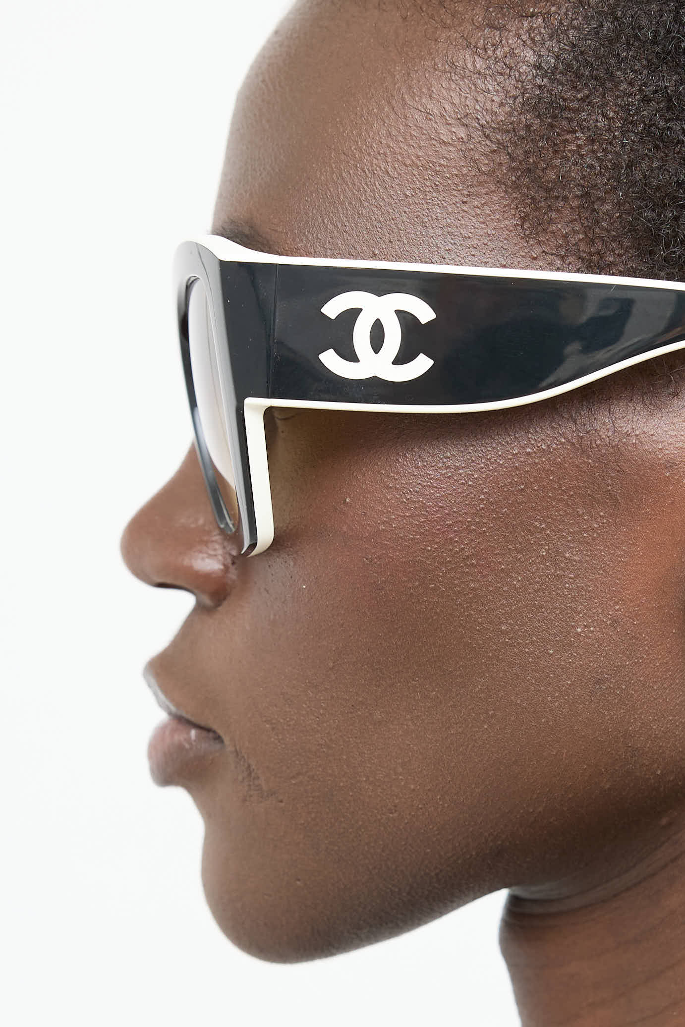 Pre-owned Chanel black and white 6058 sunglasses featuring brown gradient lenses, black square frames with white interior, and logo at temples.