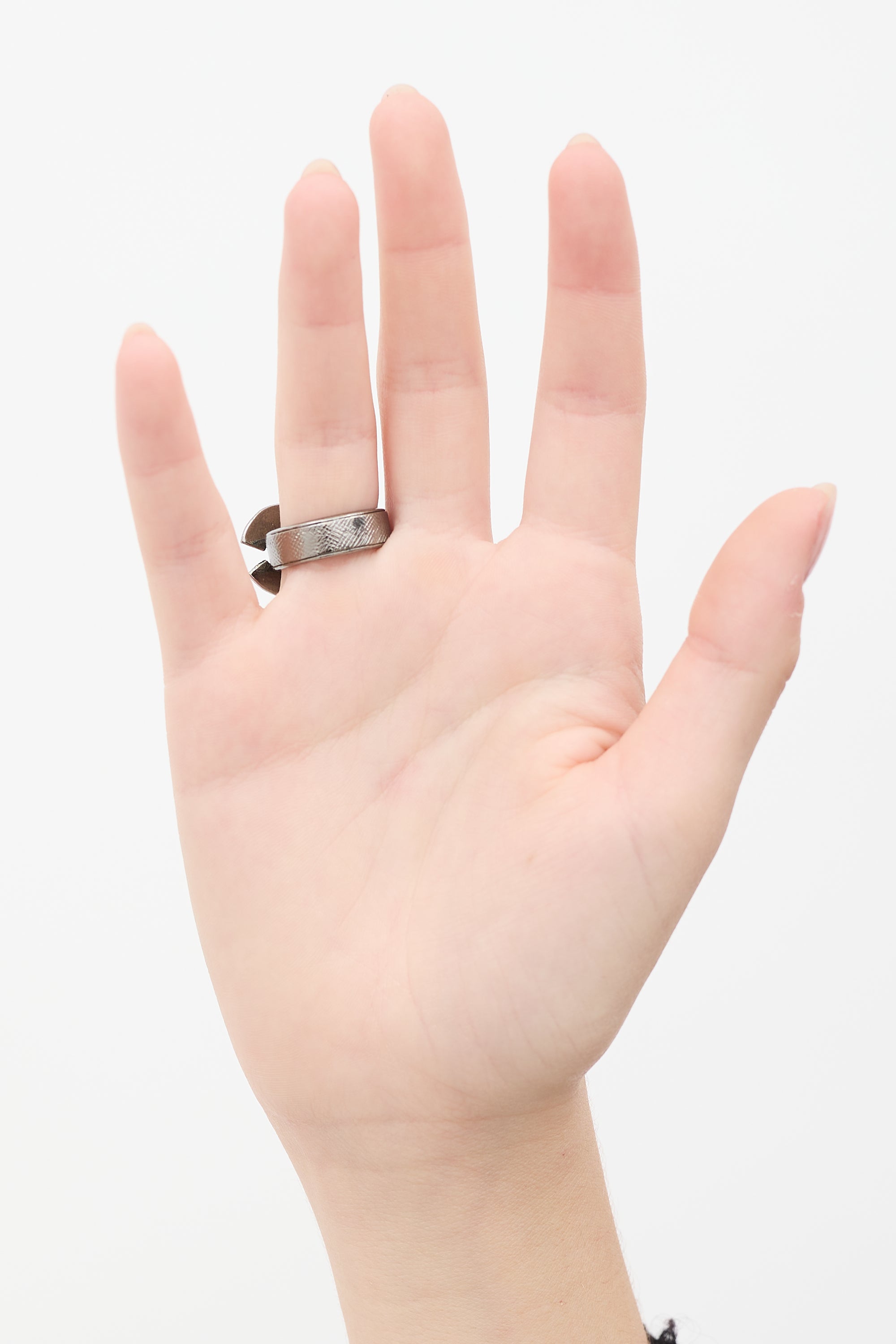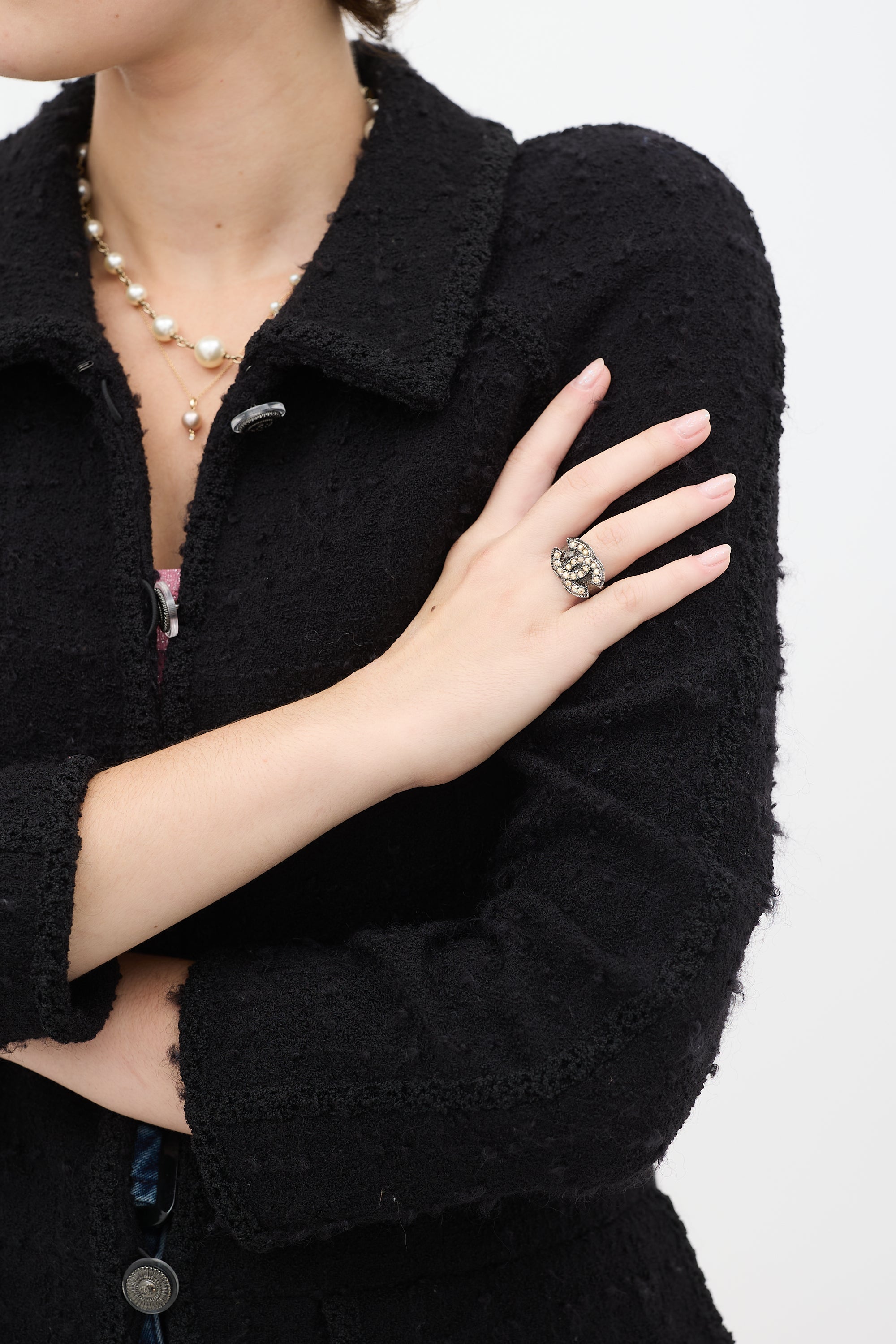 Pre-owned Chanel aged silver ring featuring cross hatch etching throughout band, pale yellow crystal embellished CC logo motif, and stamping at interior.