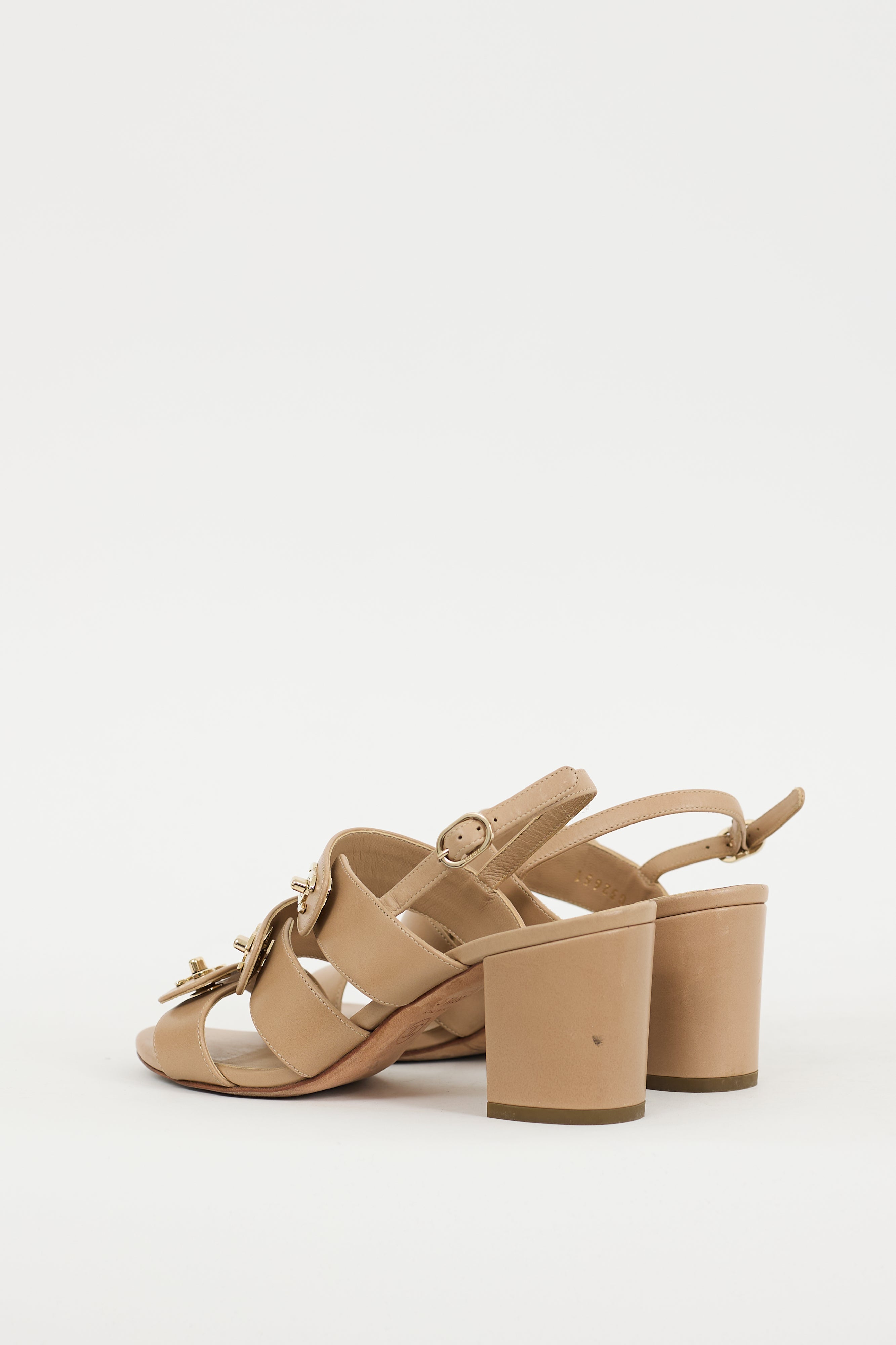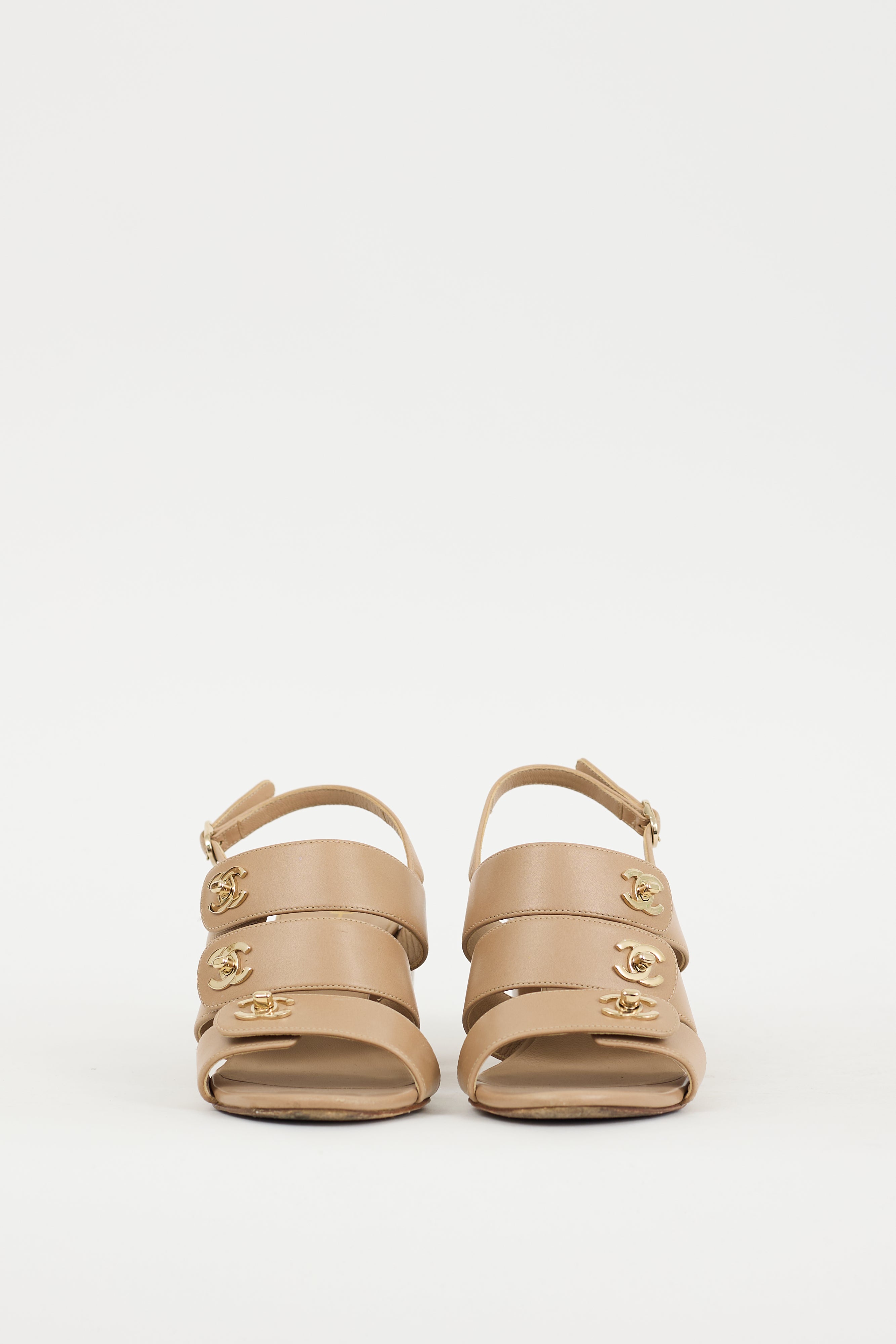 Pre-owned Chanel beige leather sandals featuring an open round toe, wrapped block heel, adjustable strap at ankle, and three straps at upper with gold tone turn lock CC logo hardware.