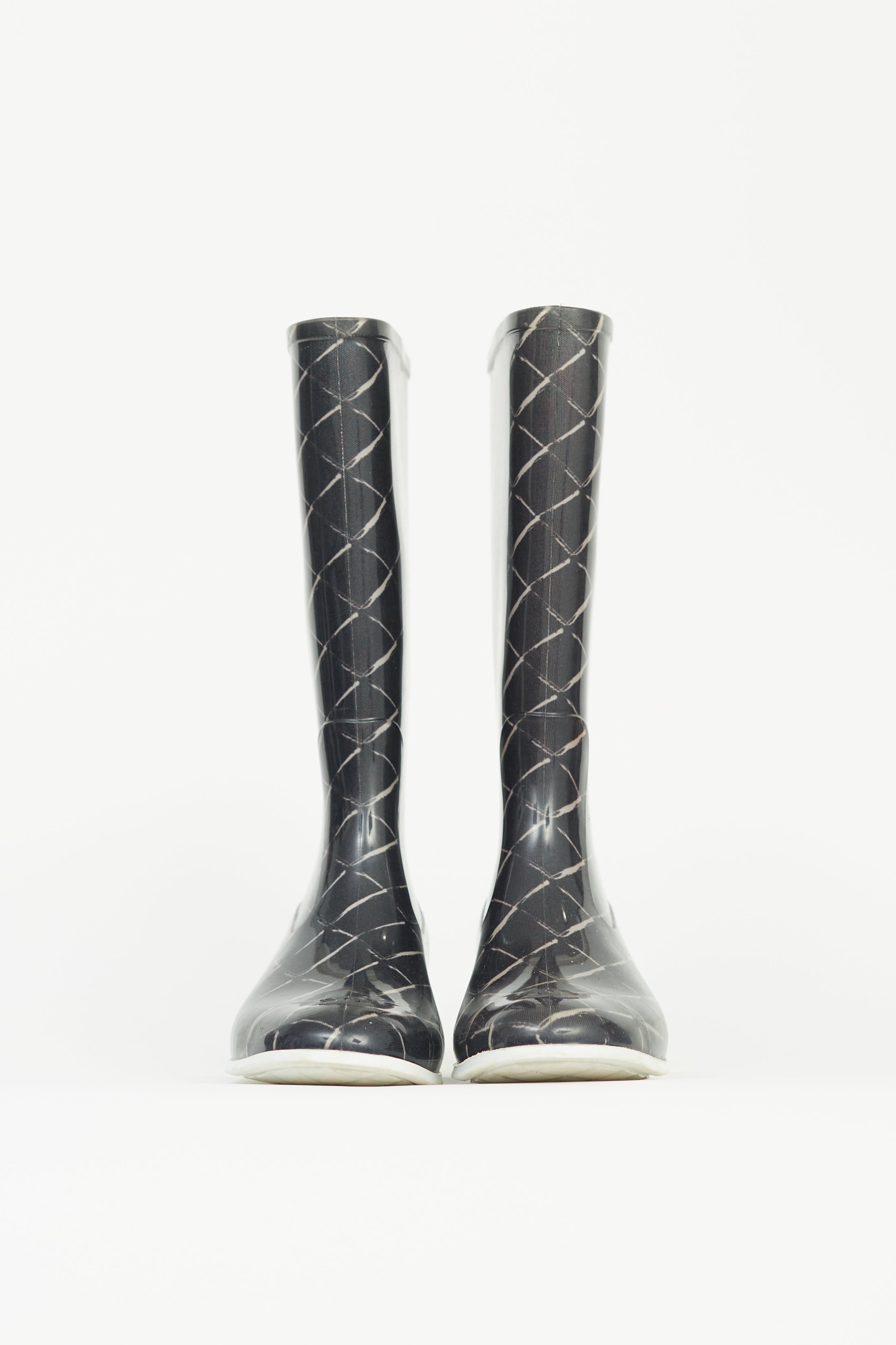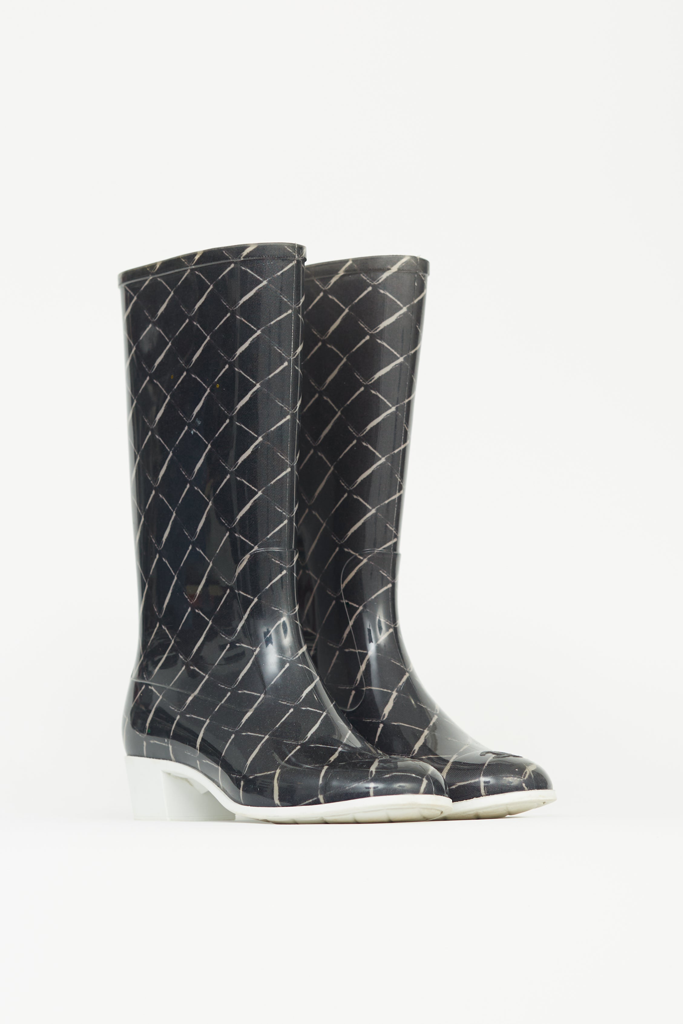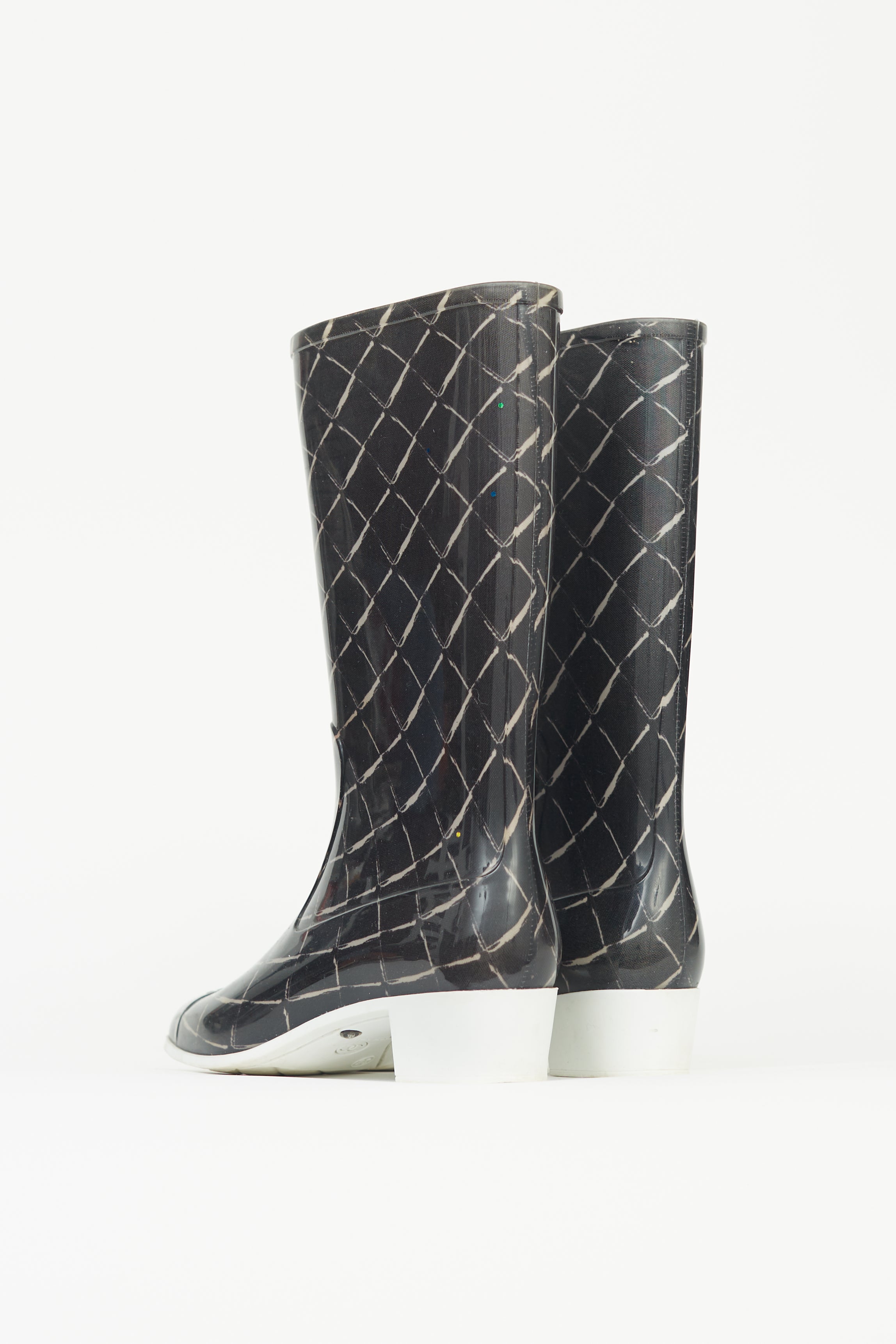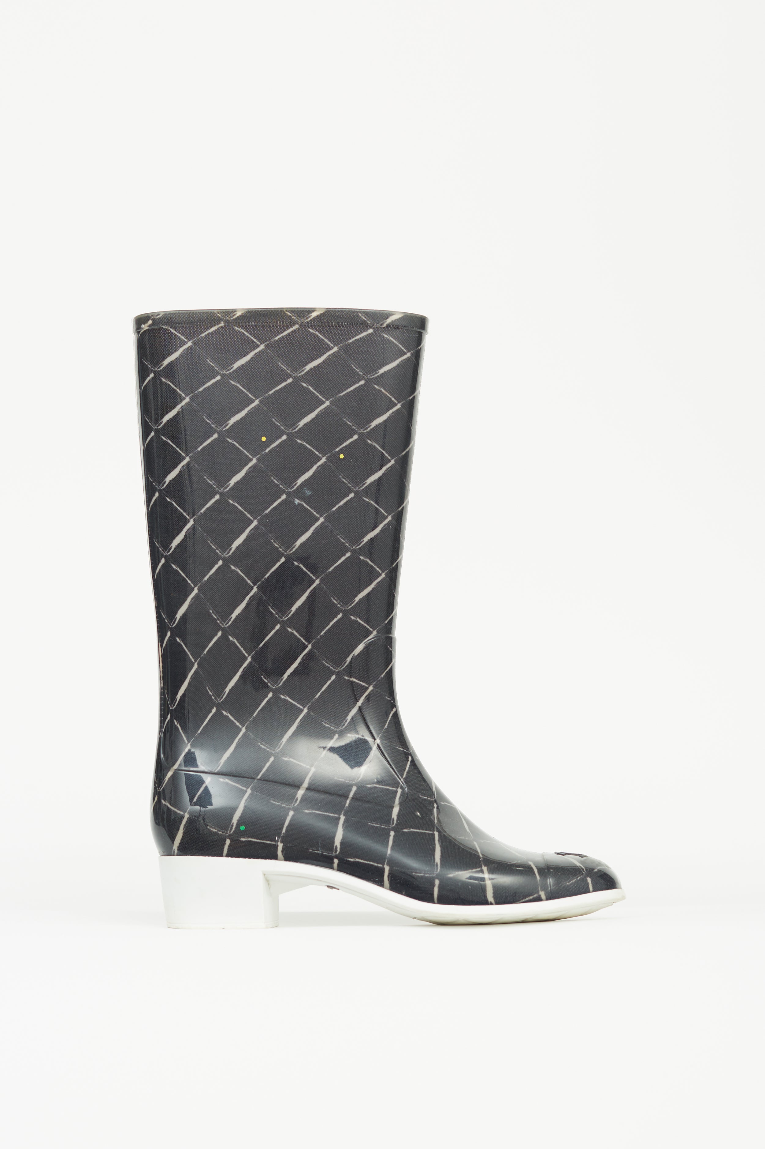 Pre-owned Chanel black rubber boots featuring a white quilted print all over, rounded toe, high shaft, tonal embossed logo at toe, block heels, and white rubber outsoles.