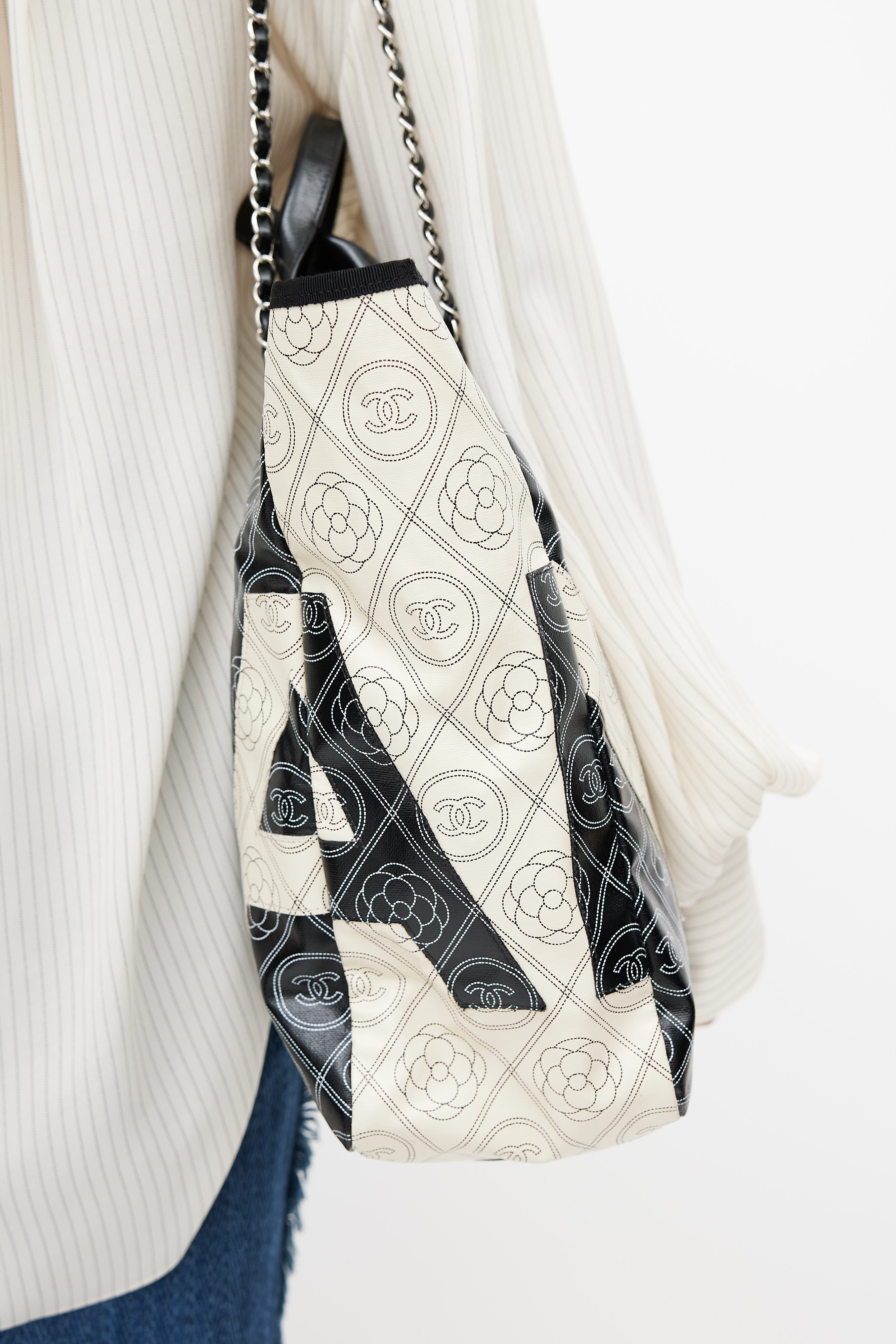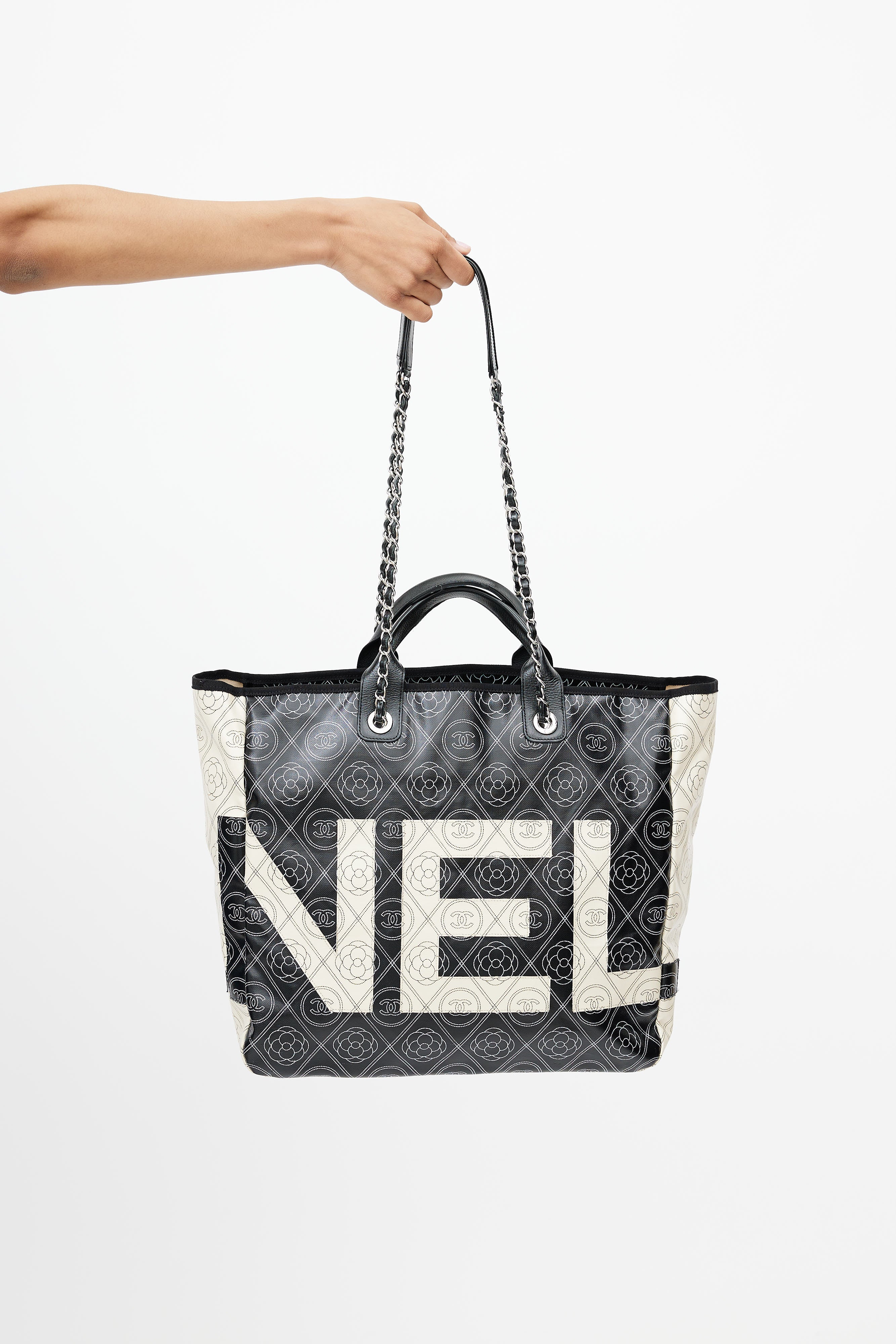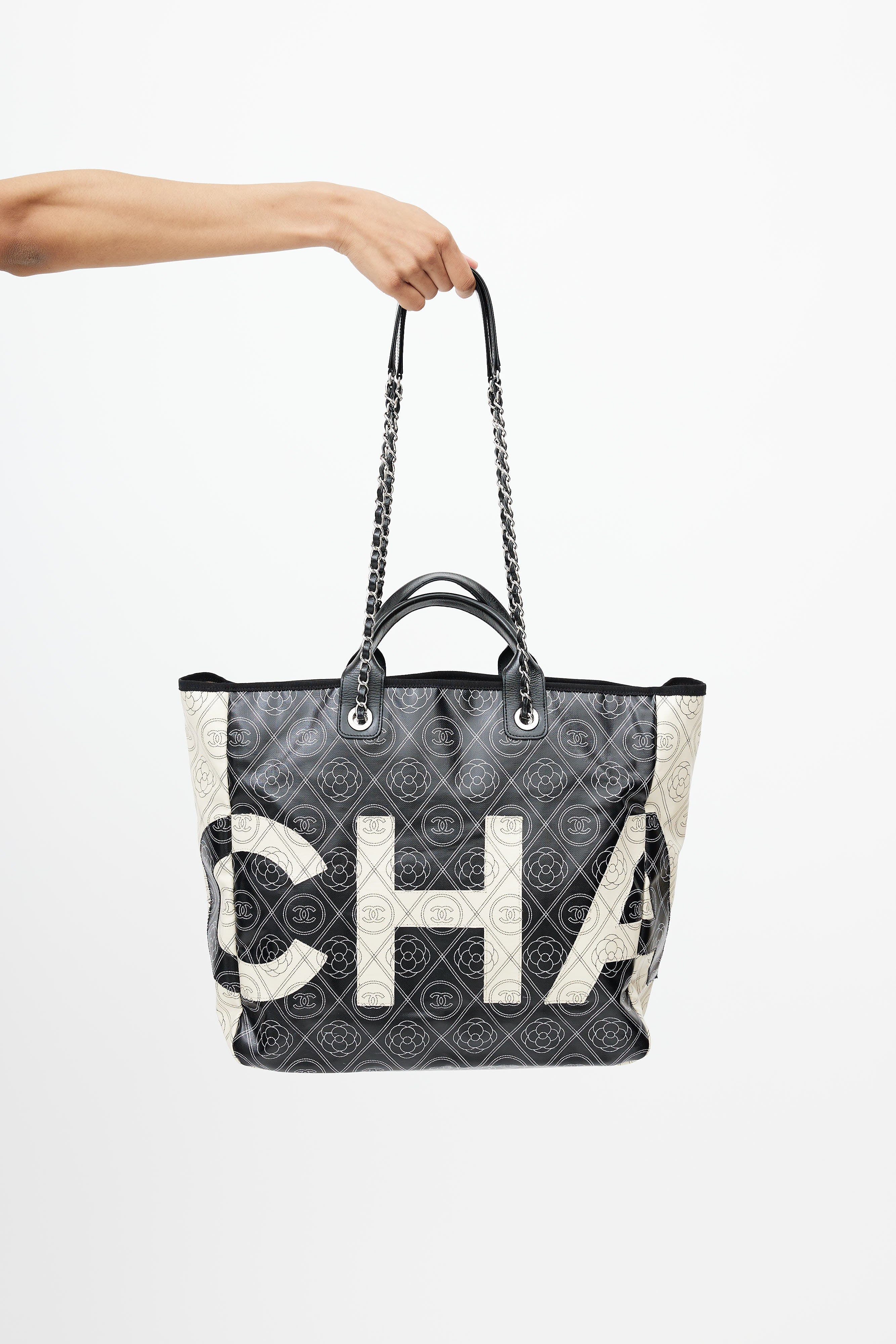 Pre-owned Chanel black Camellia coated canvas shoulder bag featuring white CC print throughout, wrapped leather top handles, white logo appliquè at front and back, one main compartment with two zip pockets, and Chanel classic chain leather shoulder strap. Comes with dust bag.