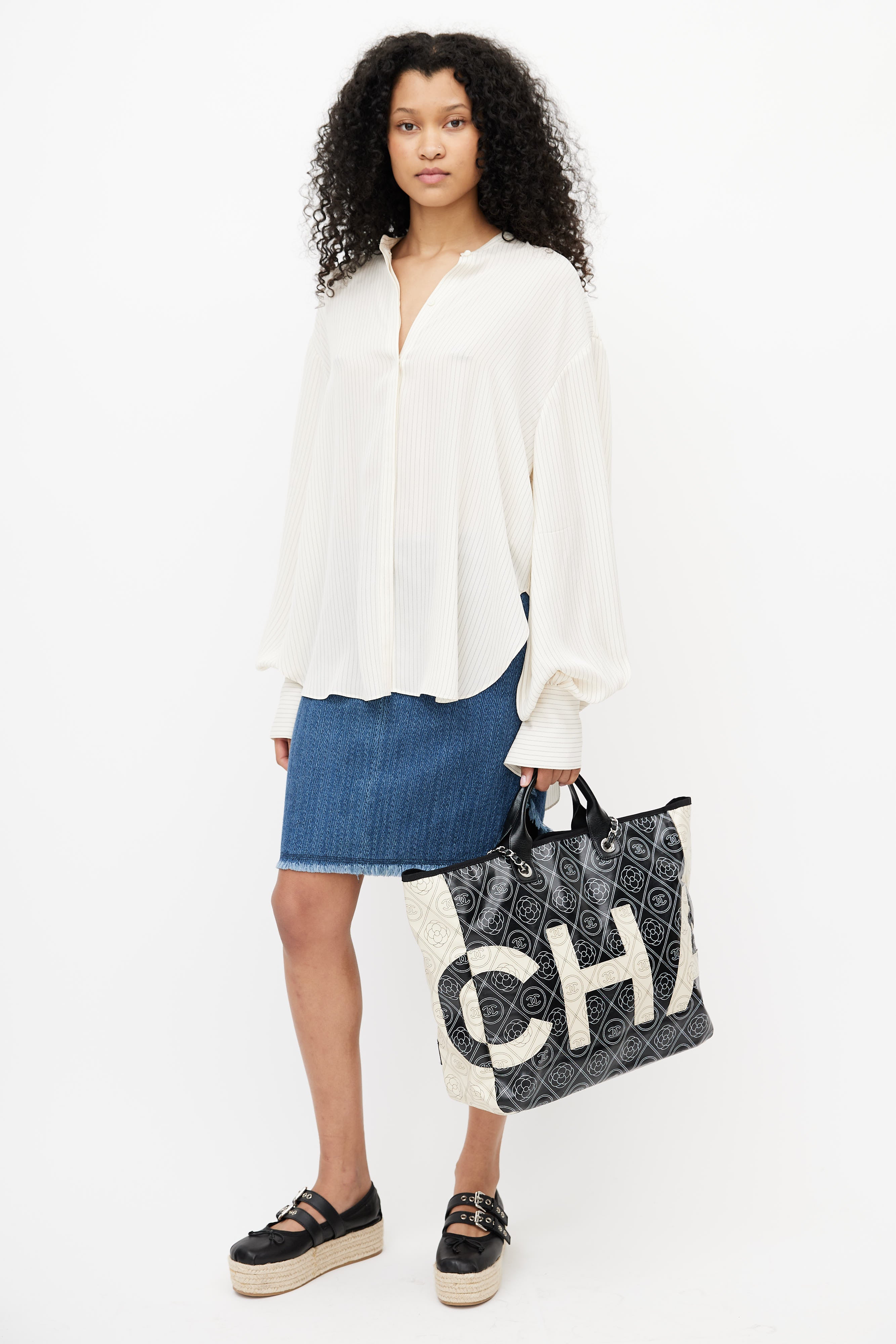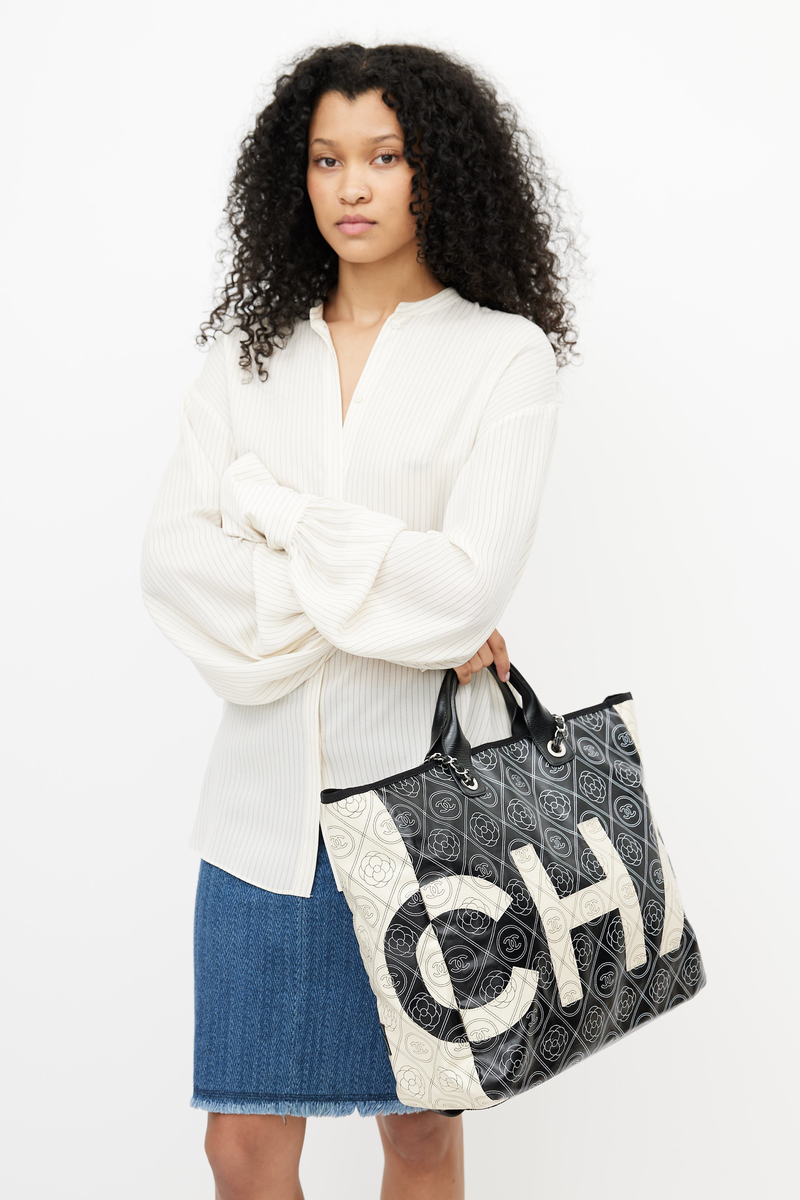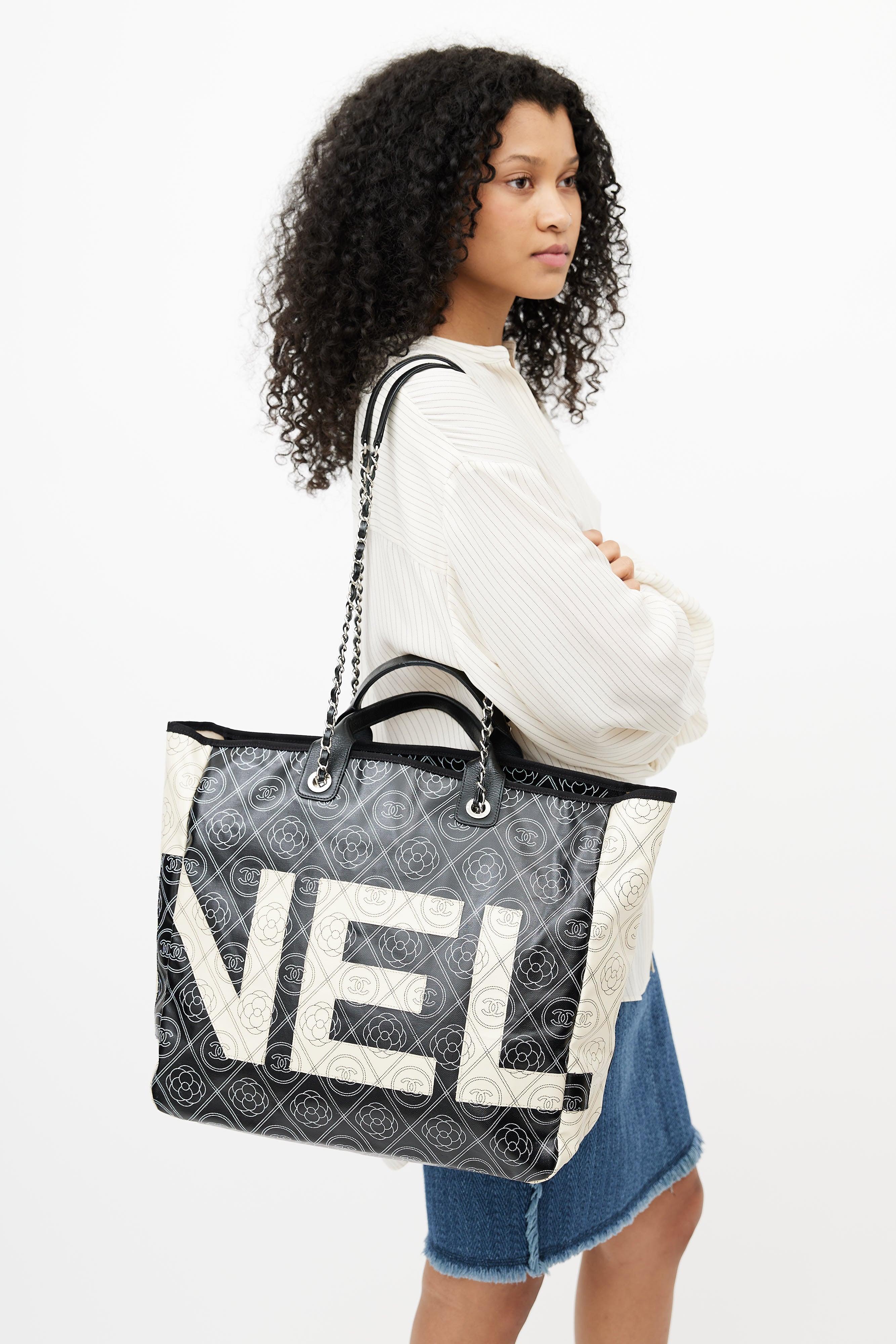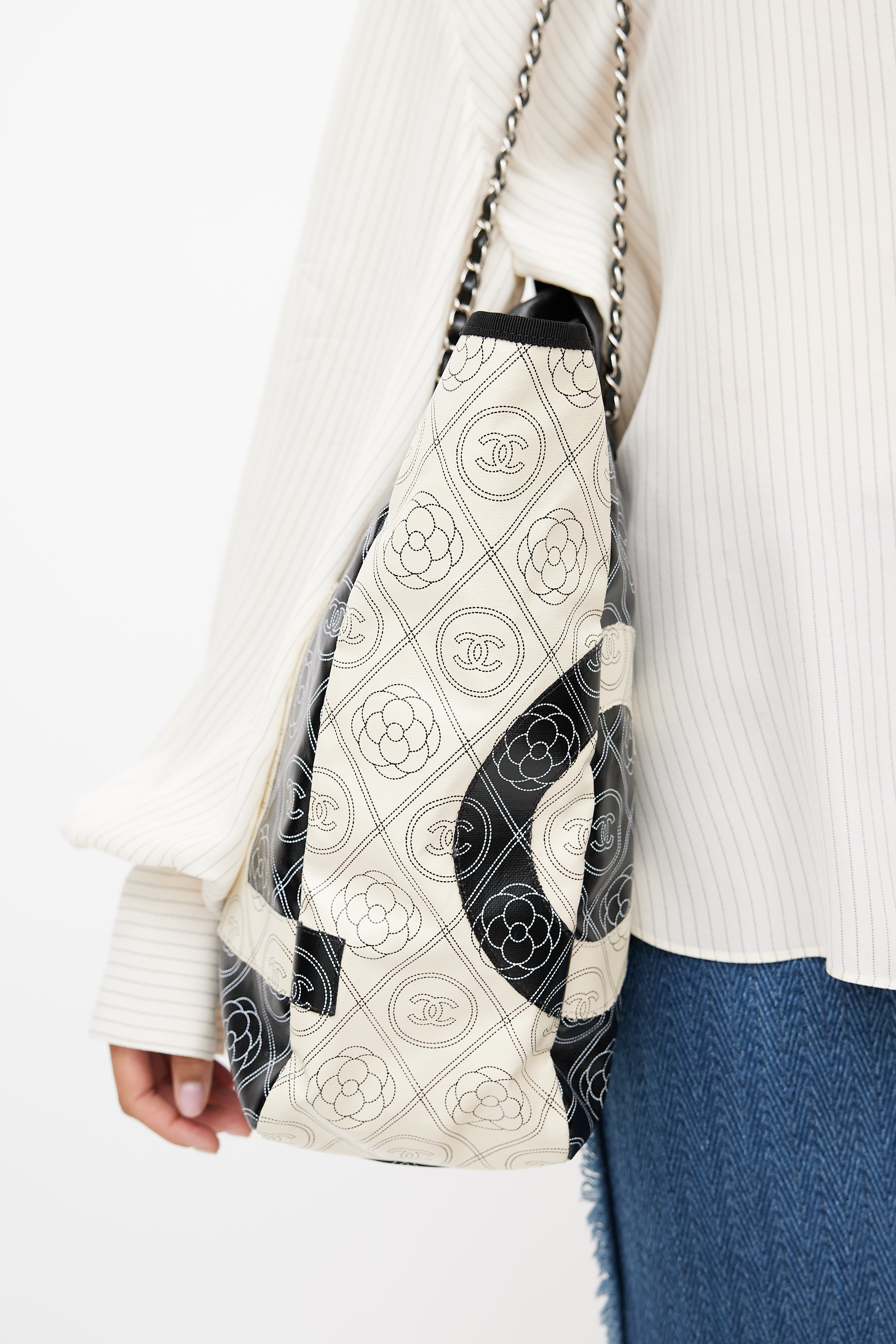 Pre-owned Chanel black Camellia coated canvas shoulder bag featuring white CC print throughout, wrapped leather top handles, white logo appliquè at front and back, one main compartment with two zip pockets, and Chanel classic chain leather shoulder strap. Comes with dust bag.