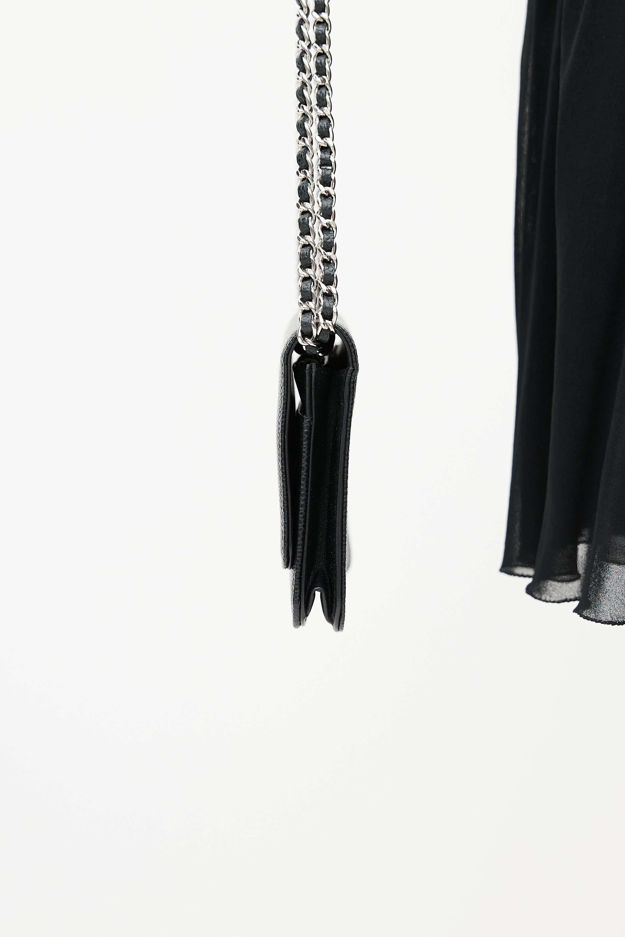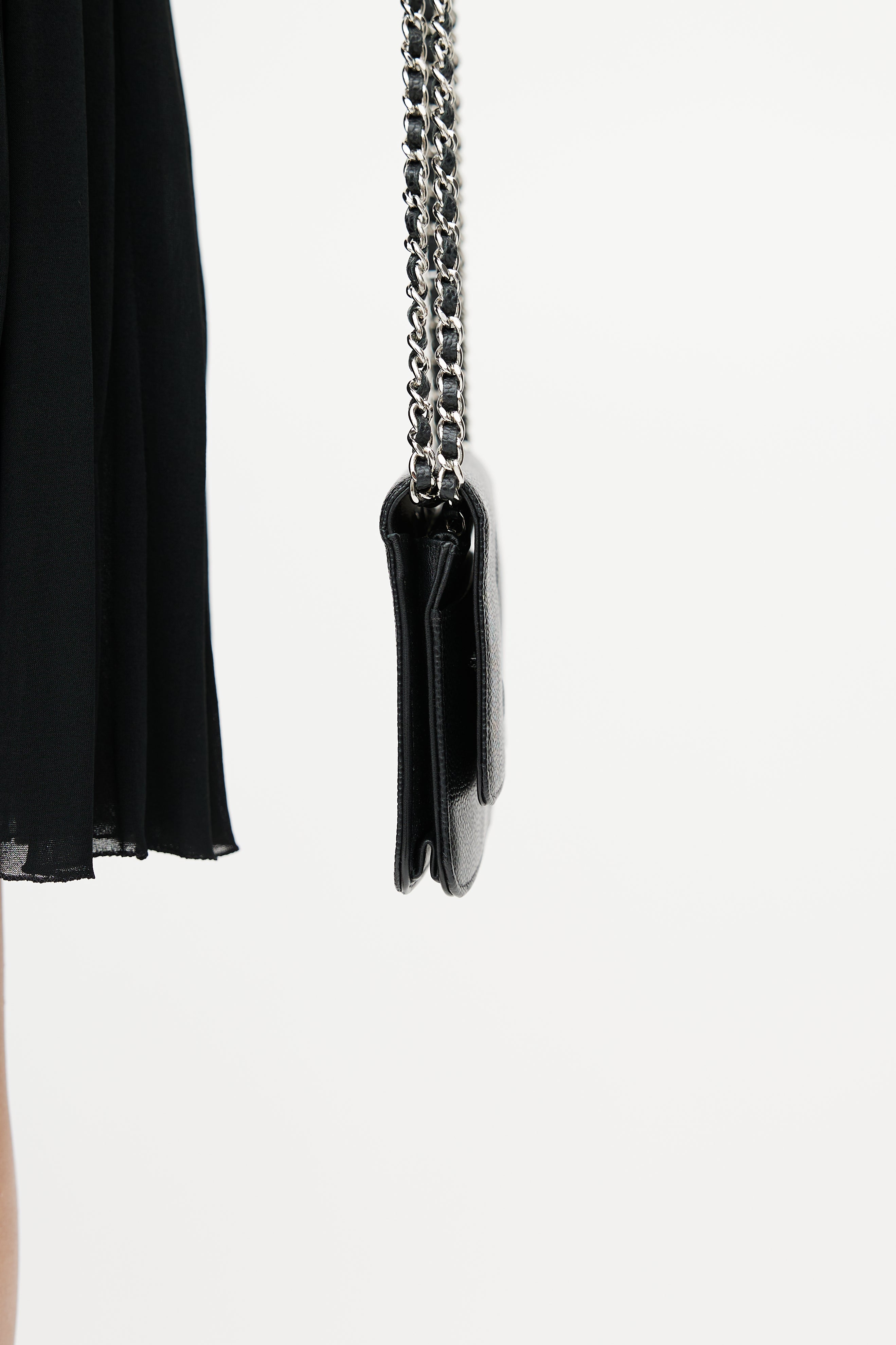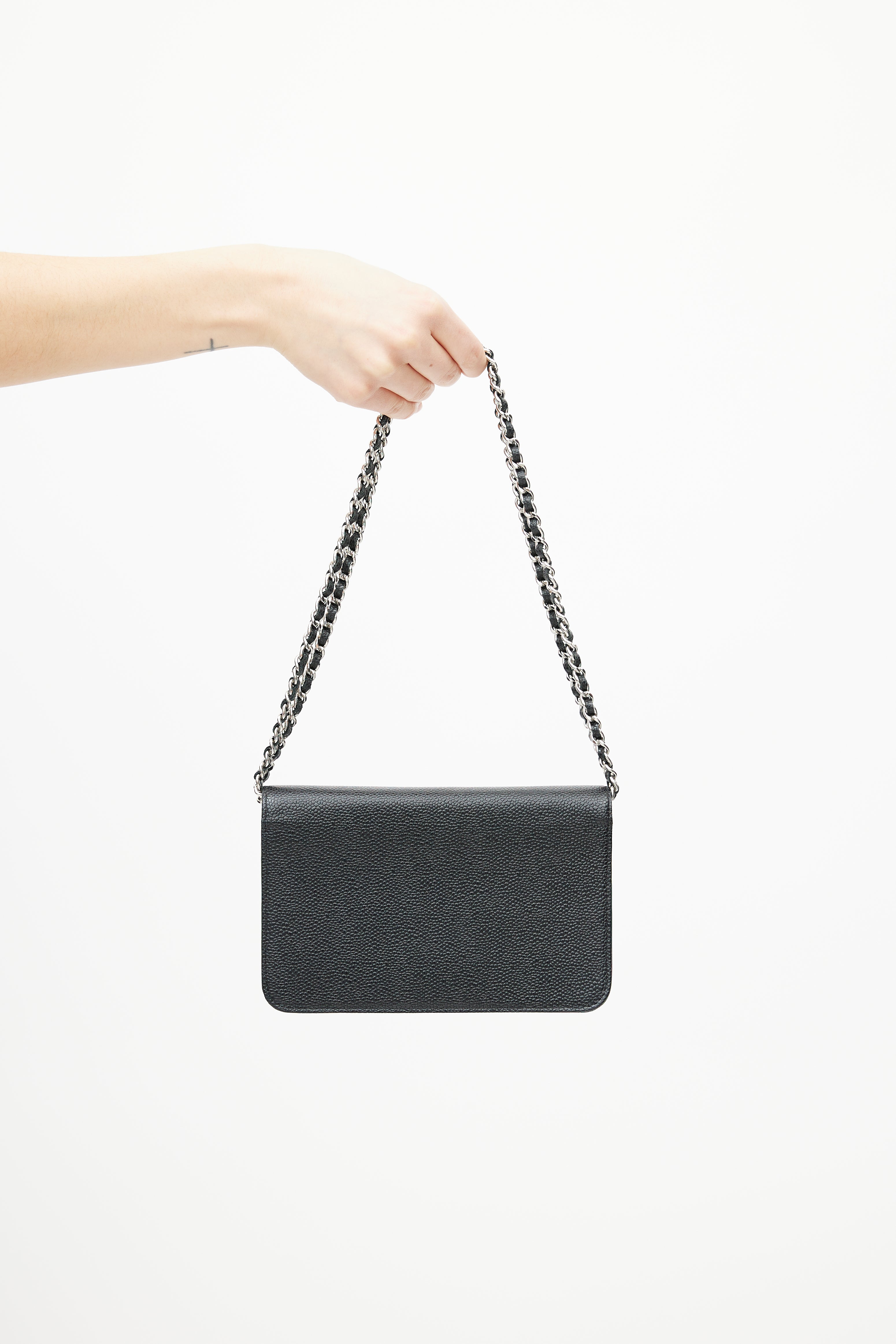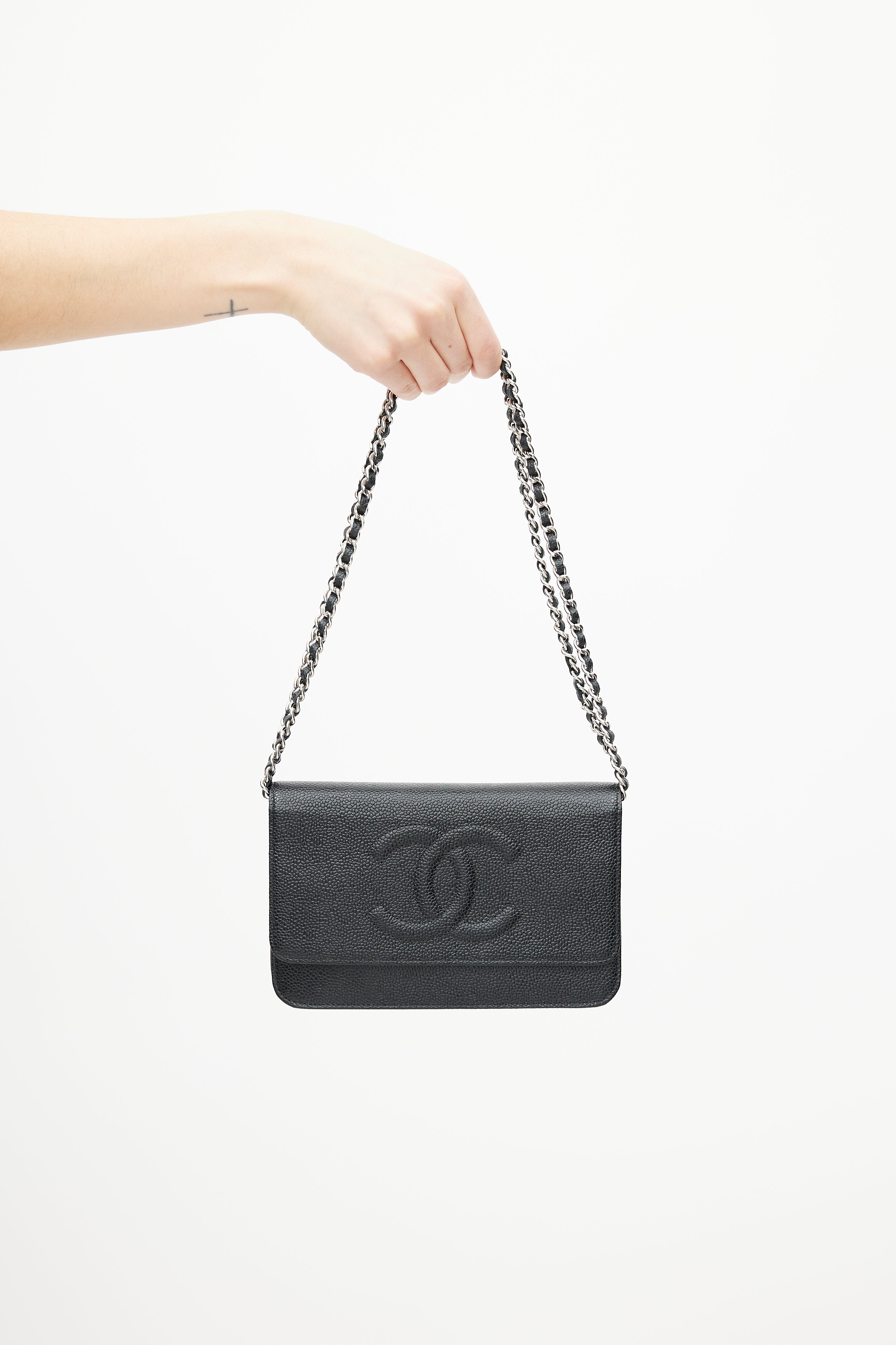 Pre-owned Chanel black Timeless wallet on chain in textured caviar leather featuring a top flap with embroidered CC logo, one main compartment with six slip pockets, one interior zip pouch, silver tone braided chainlink shoulder strap, one slip pocket at front, and front snap closure. Comes with original box.