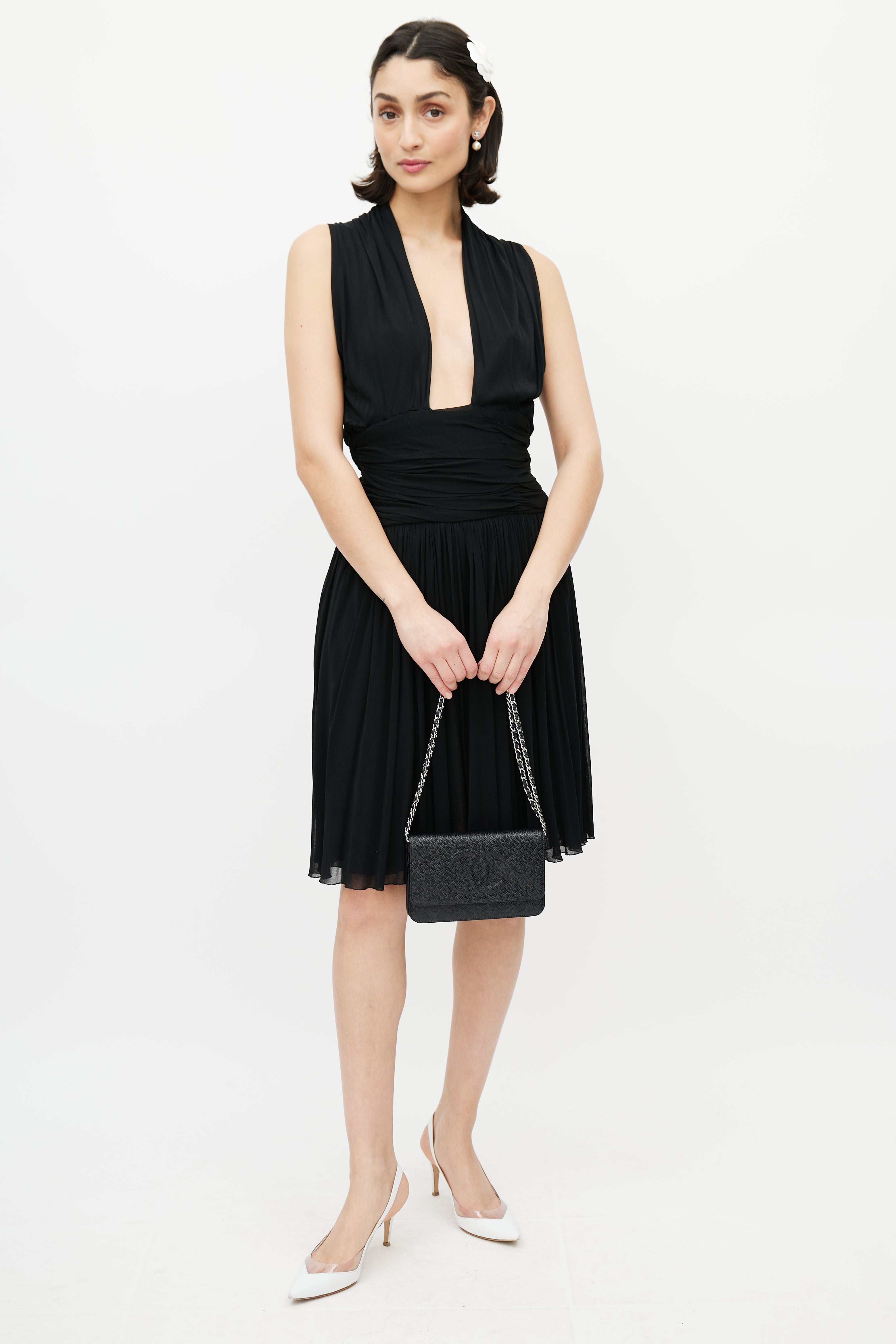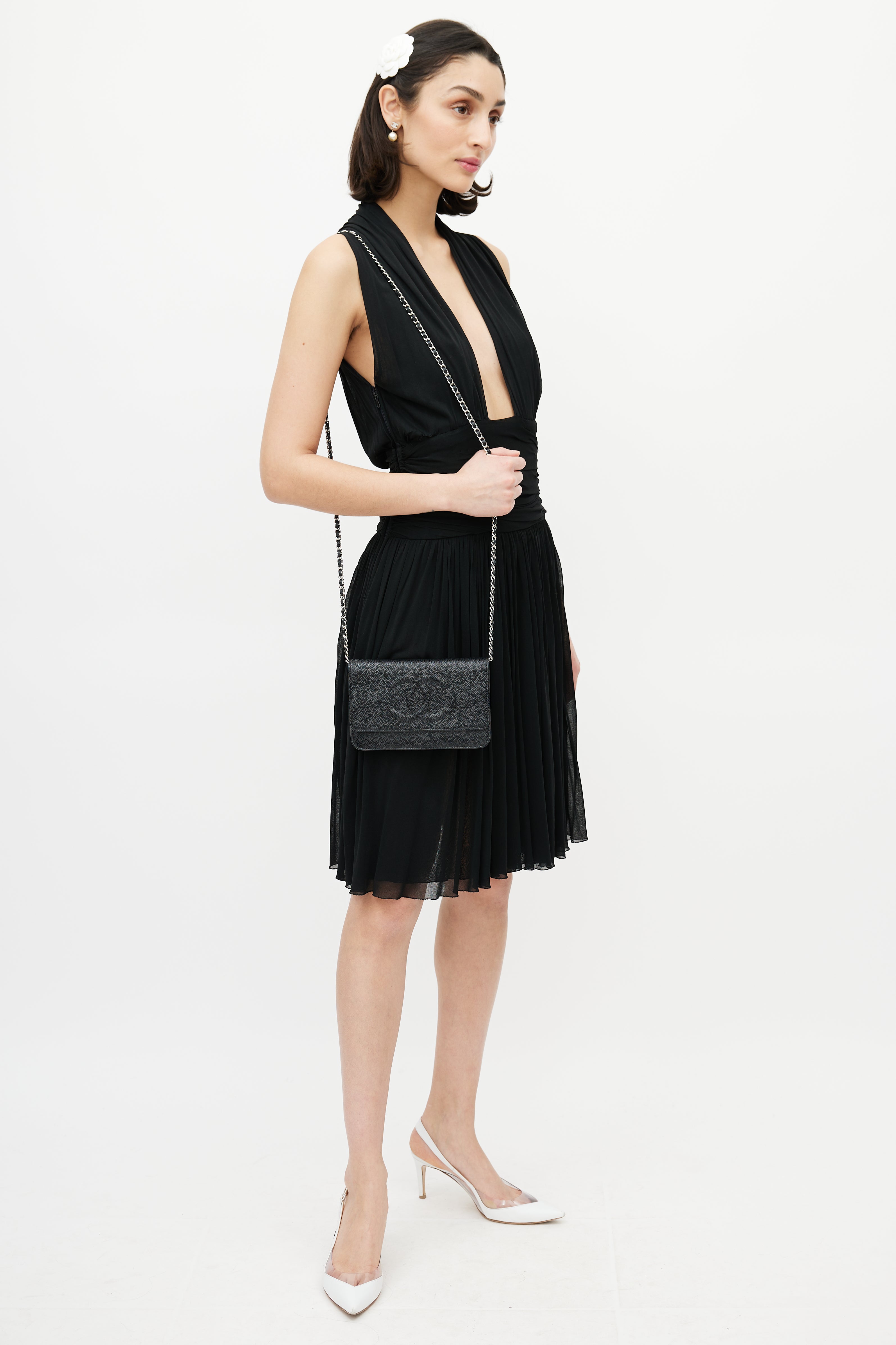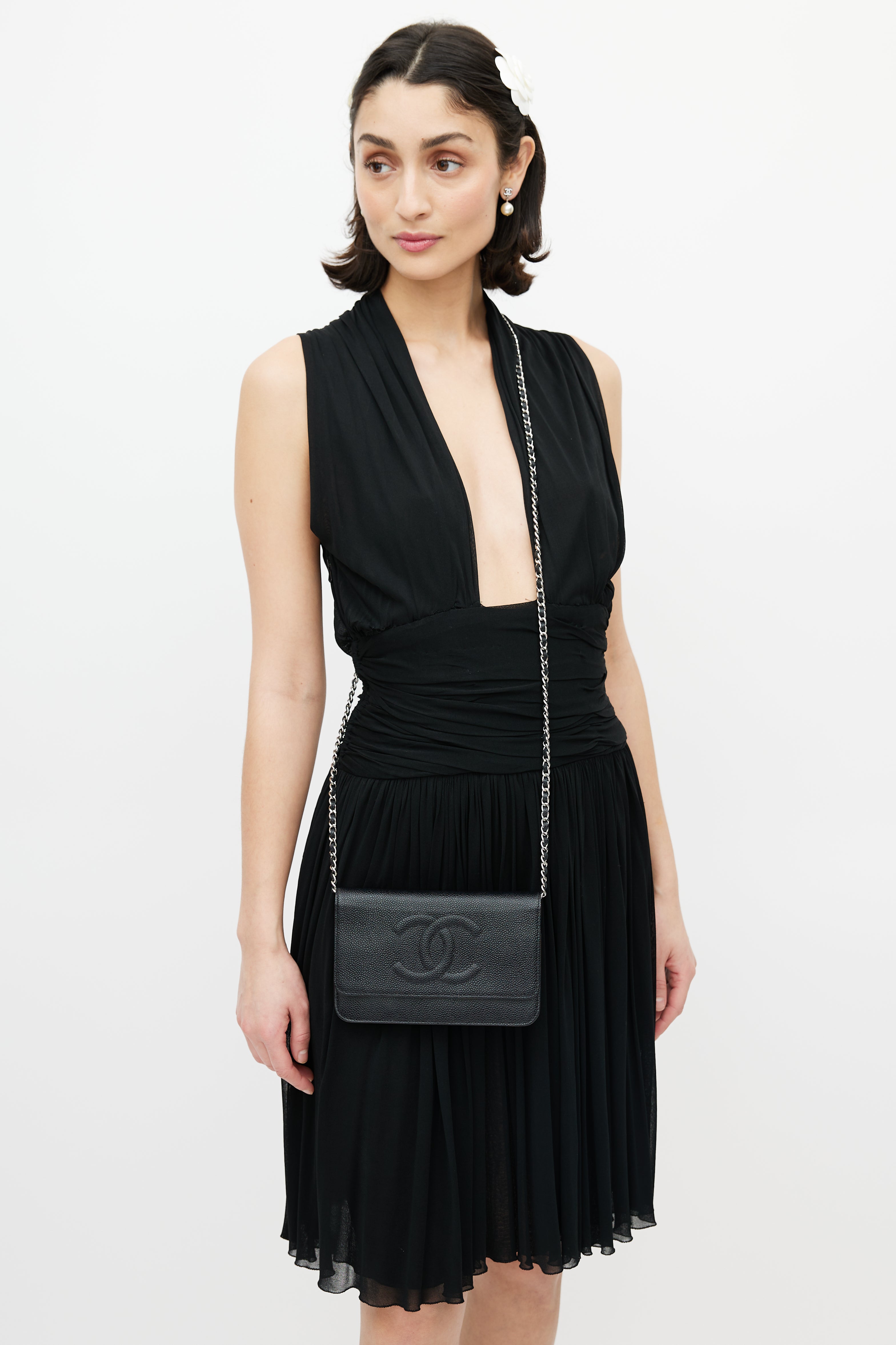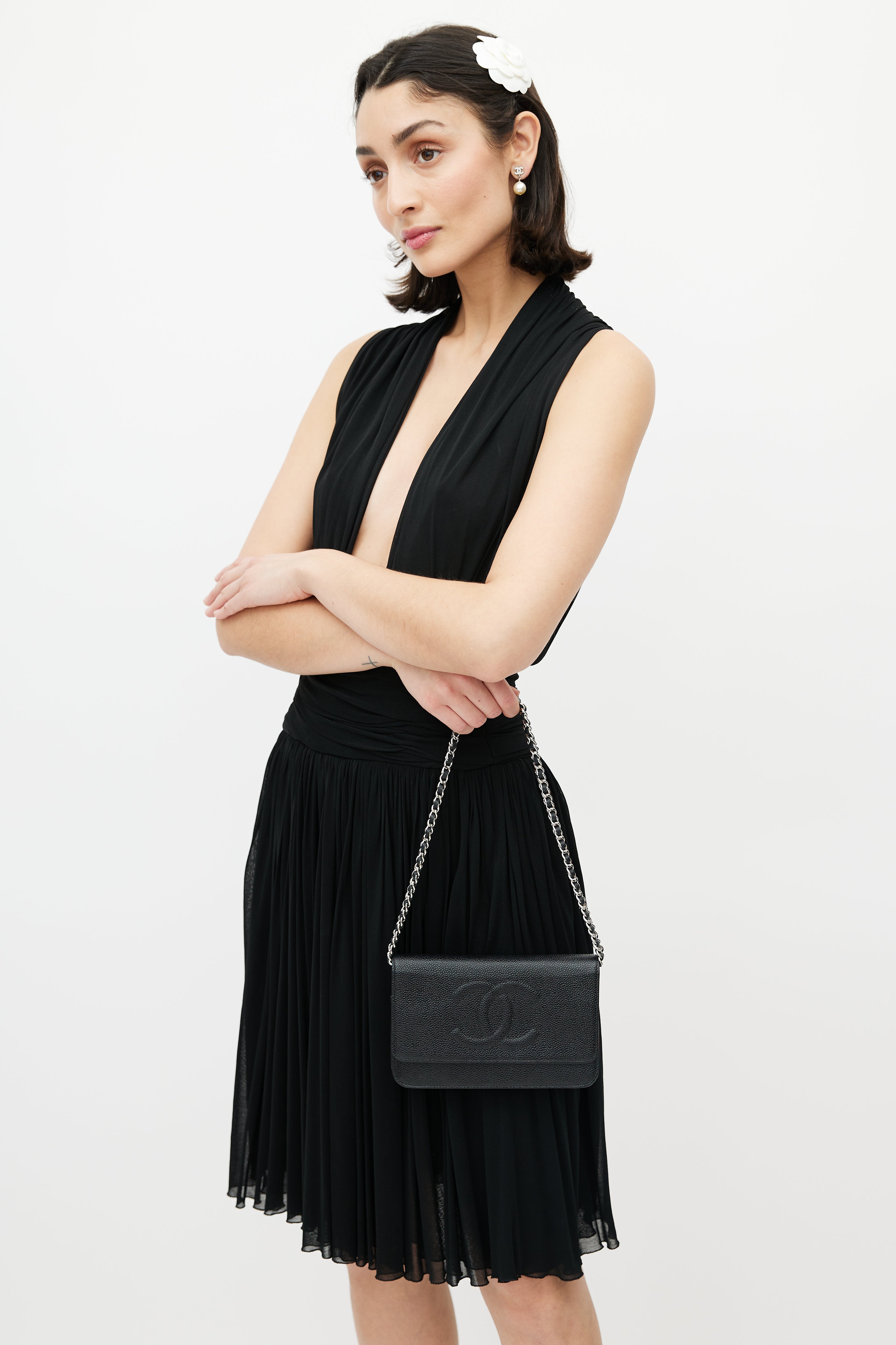 Pre-owned Chanel black Timeless wallet on chain in textured caviar leather featuring a top flap with embroidered CC logo, one main compartment with six slip pockets, one interior zip pouch, silver tone braided chainlink shoulder strap, one slip pocket at front, and front snap closure. Comes with original box.