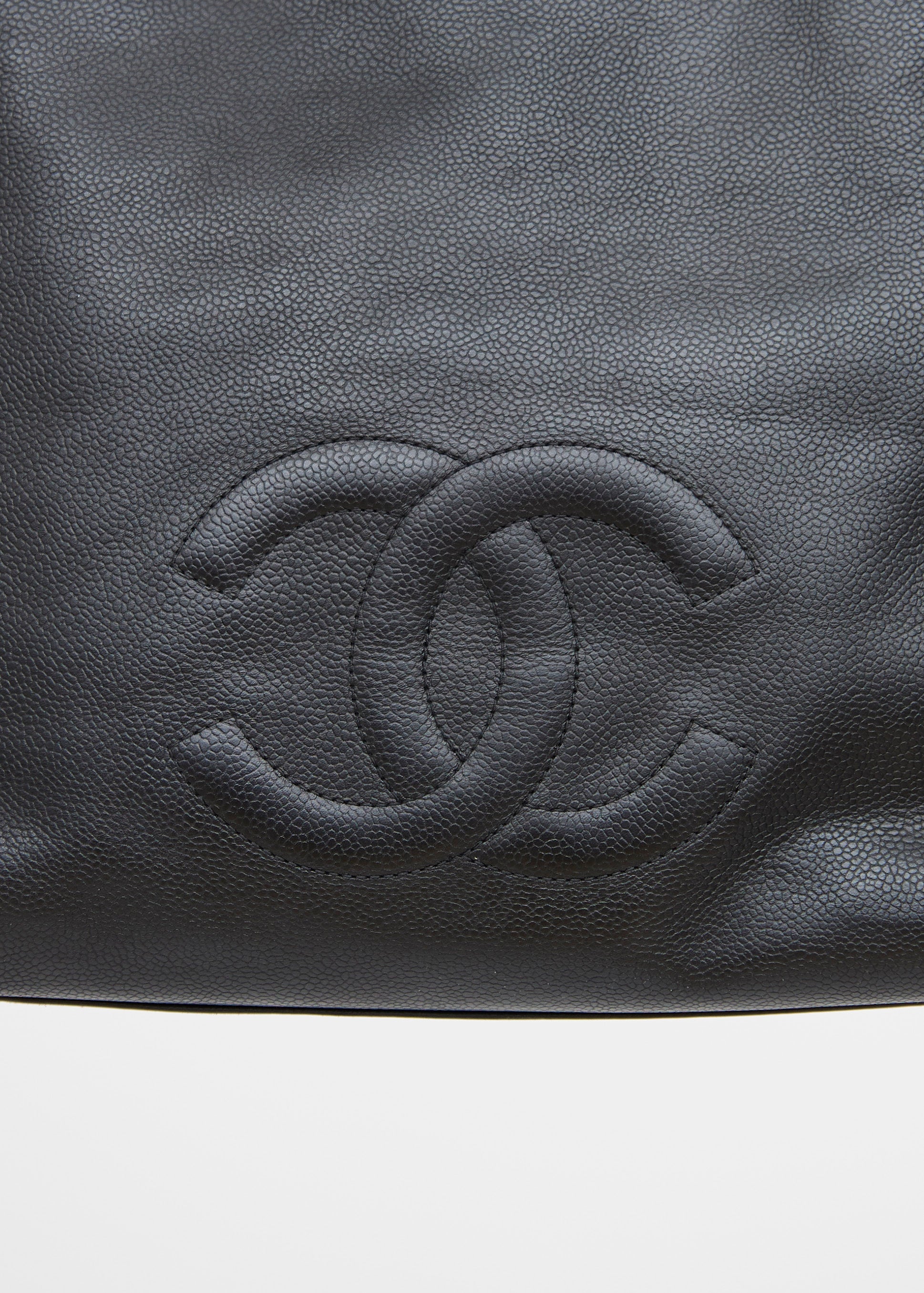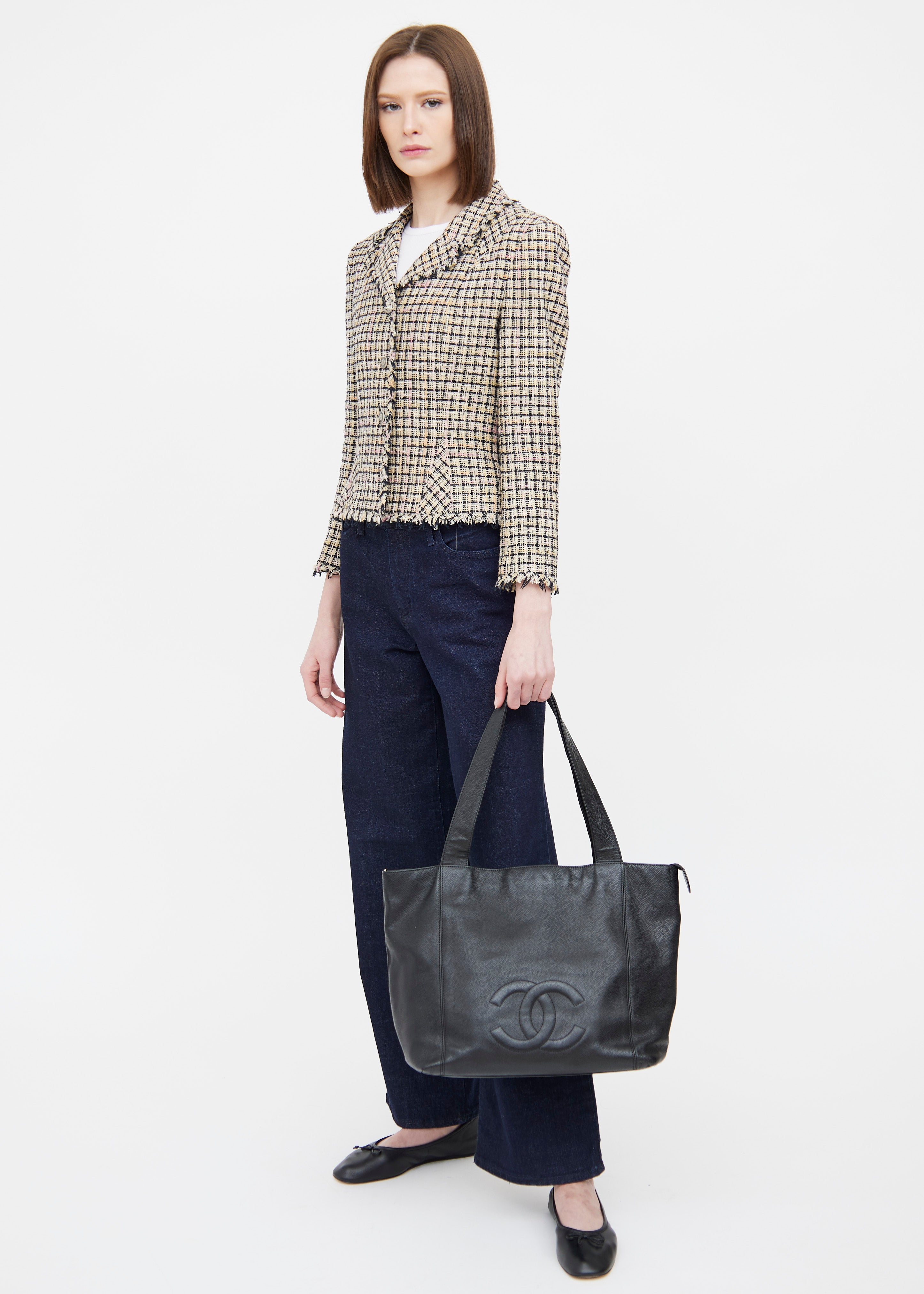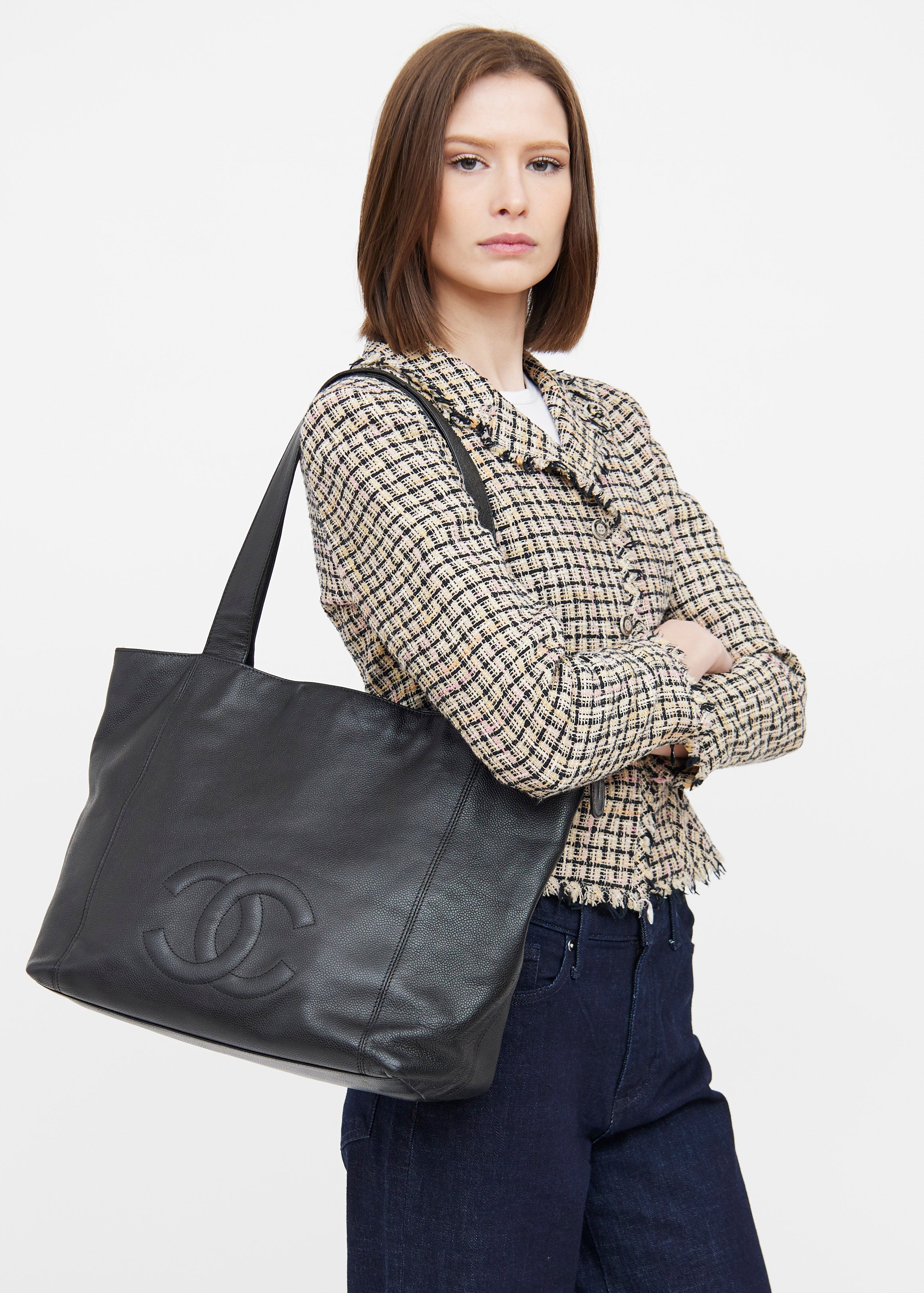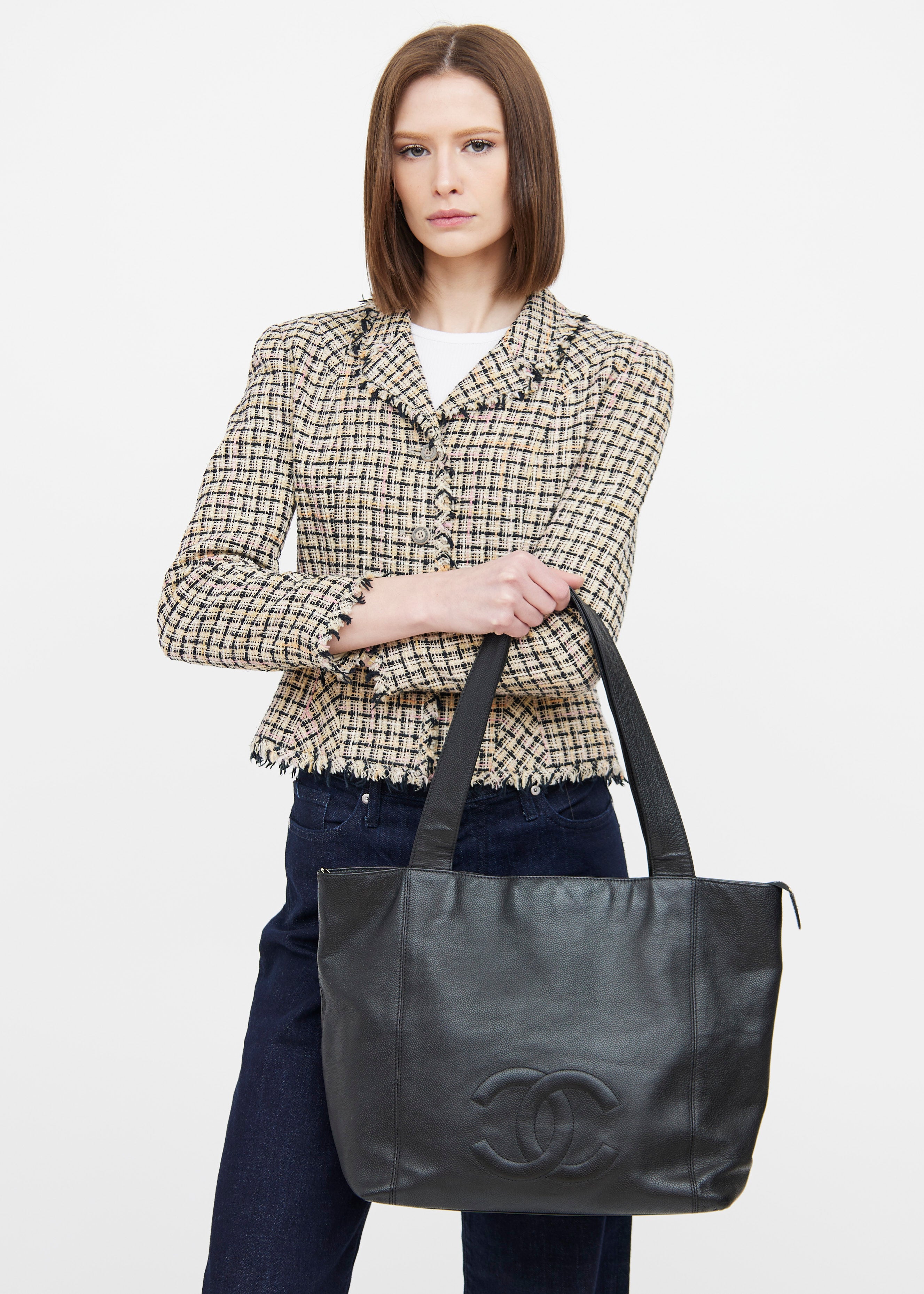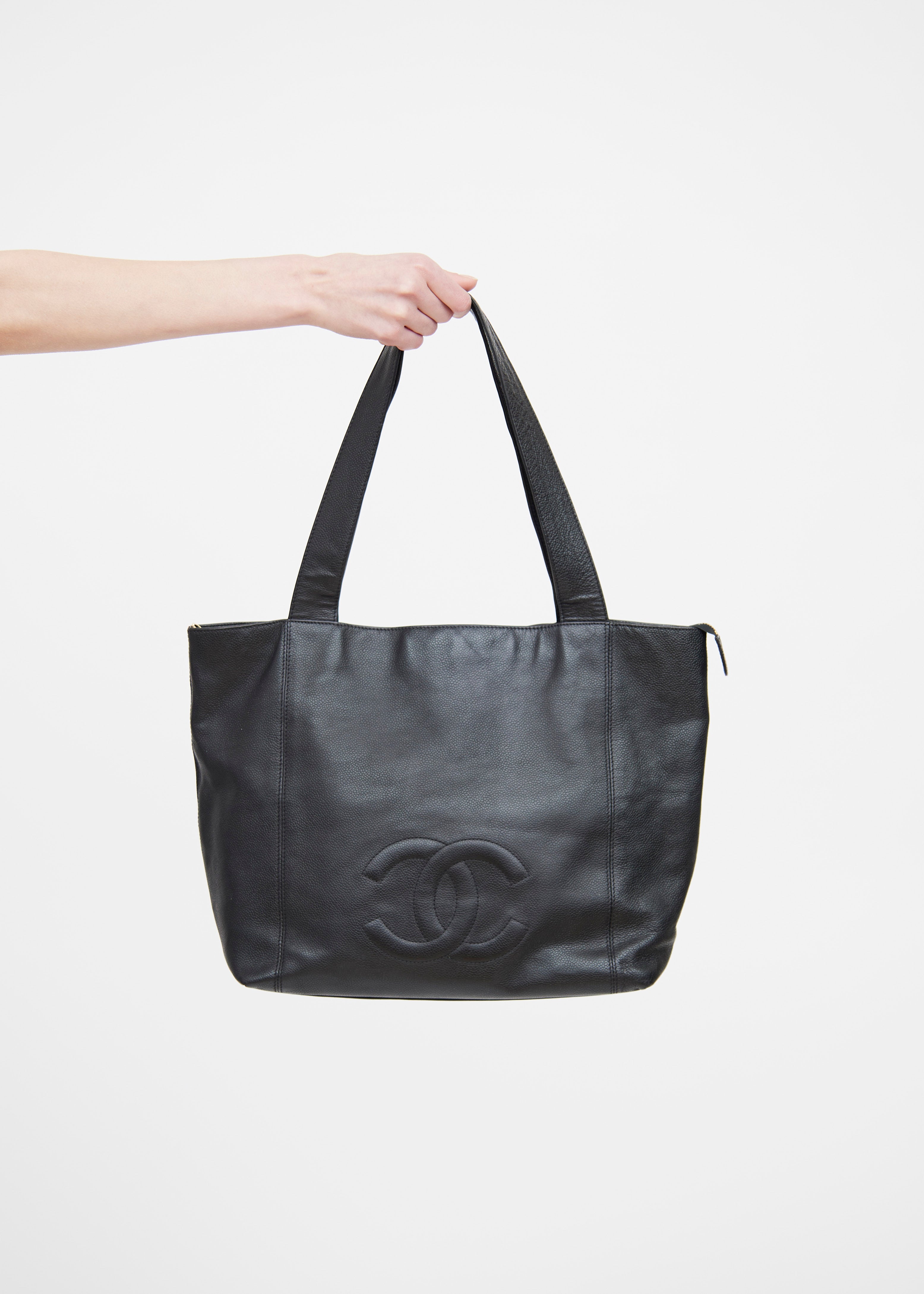 Pre-owned Chanel black Coco Mark CC Tote bag featuring dual flat top handles, embroidered front CC logo, top zip closure, one main canvas line compartment, and dual interior zip closures.