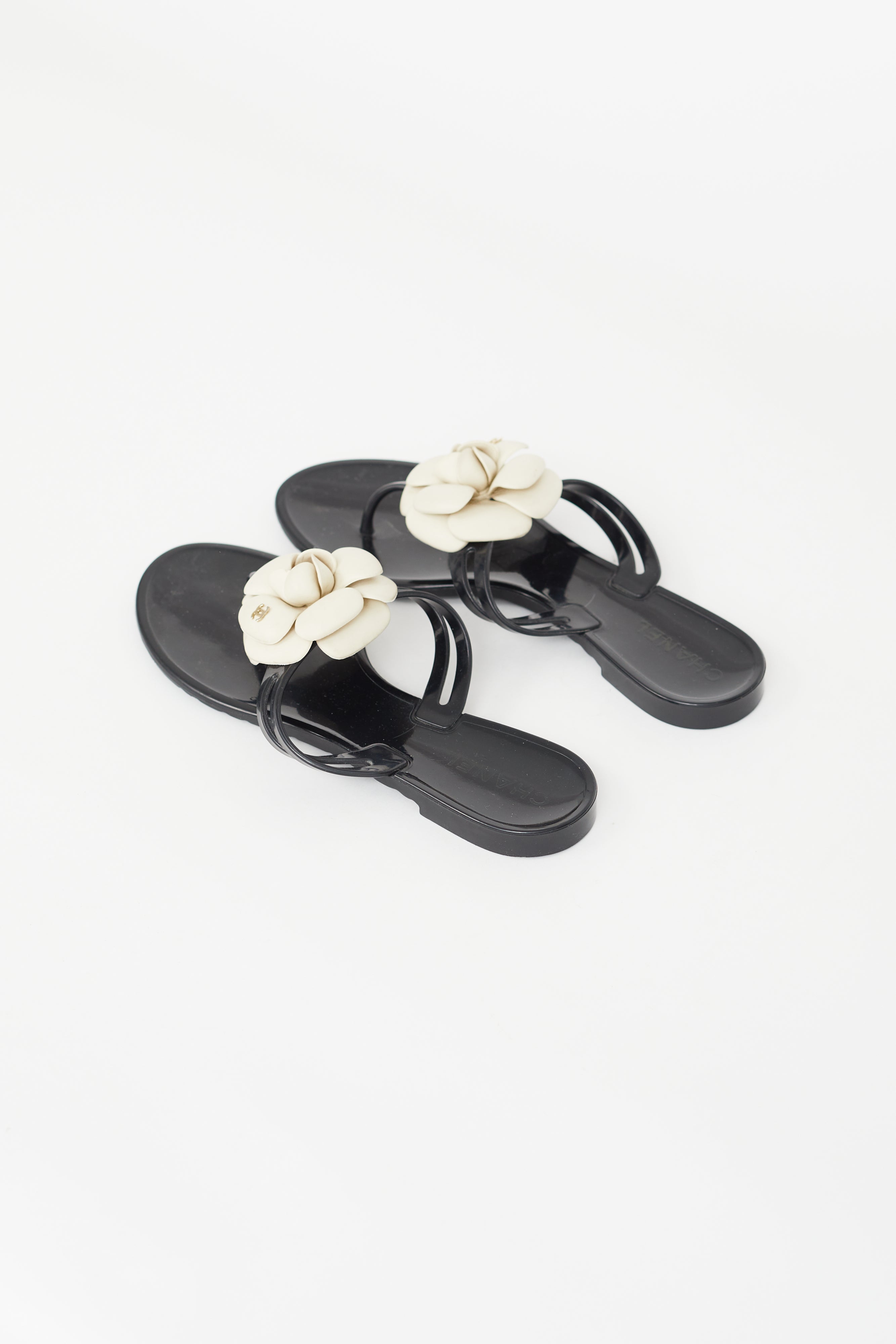 Pre-owned Chanel black Camellia sandals featuring an open round toe, thong T-strap, and cream Camellia floral detail with gold tone CC logo hardware. Comes with original dust bag.
