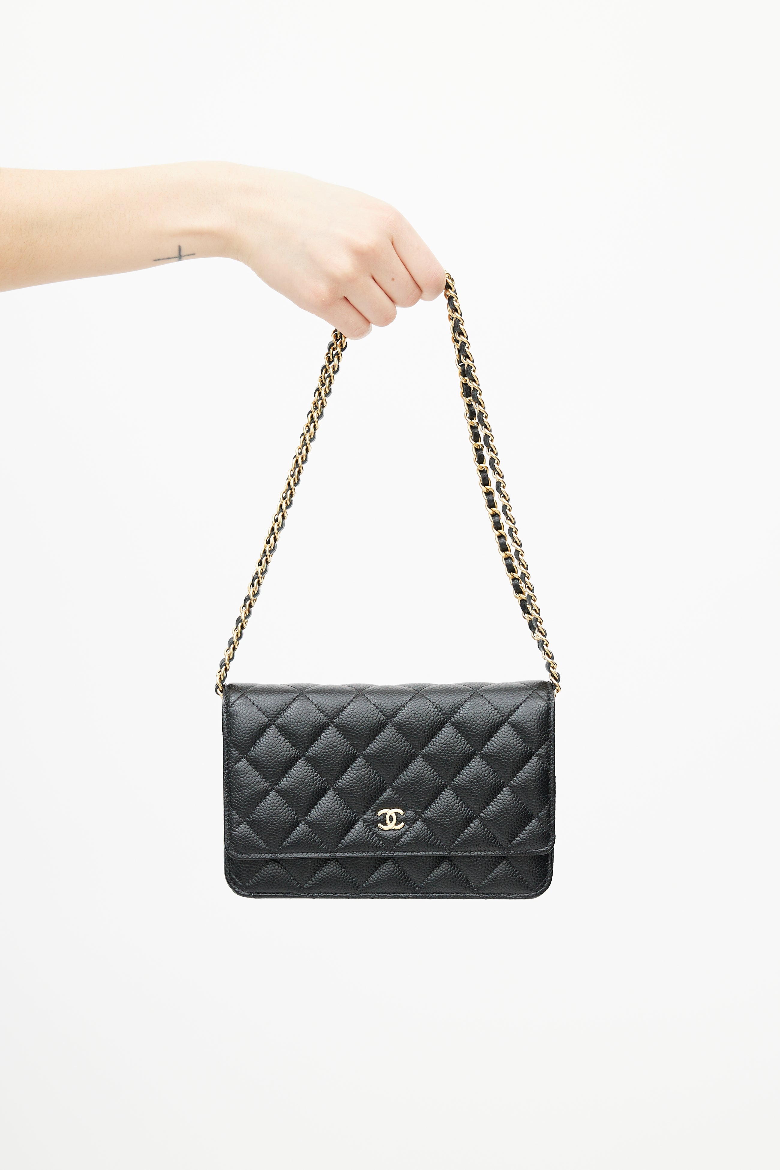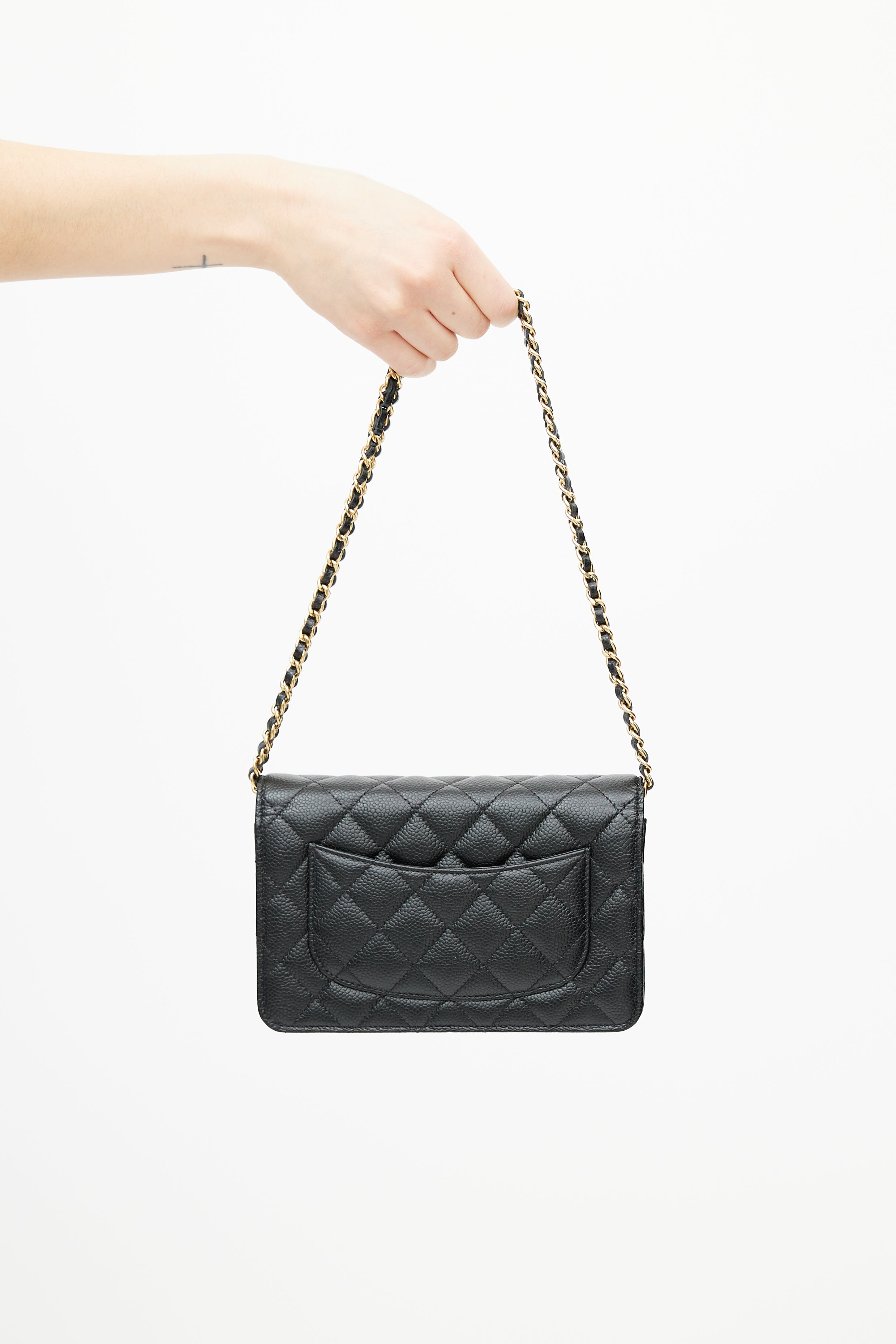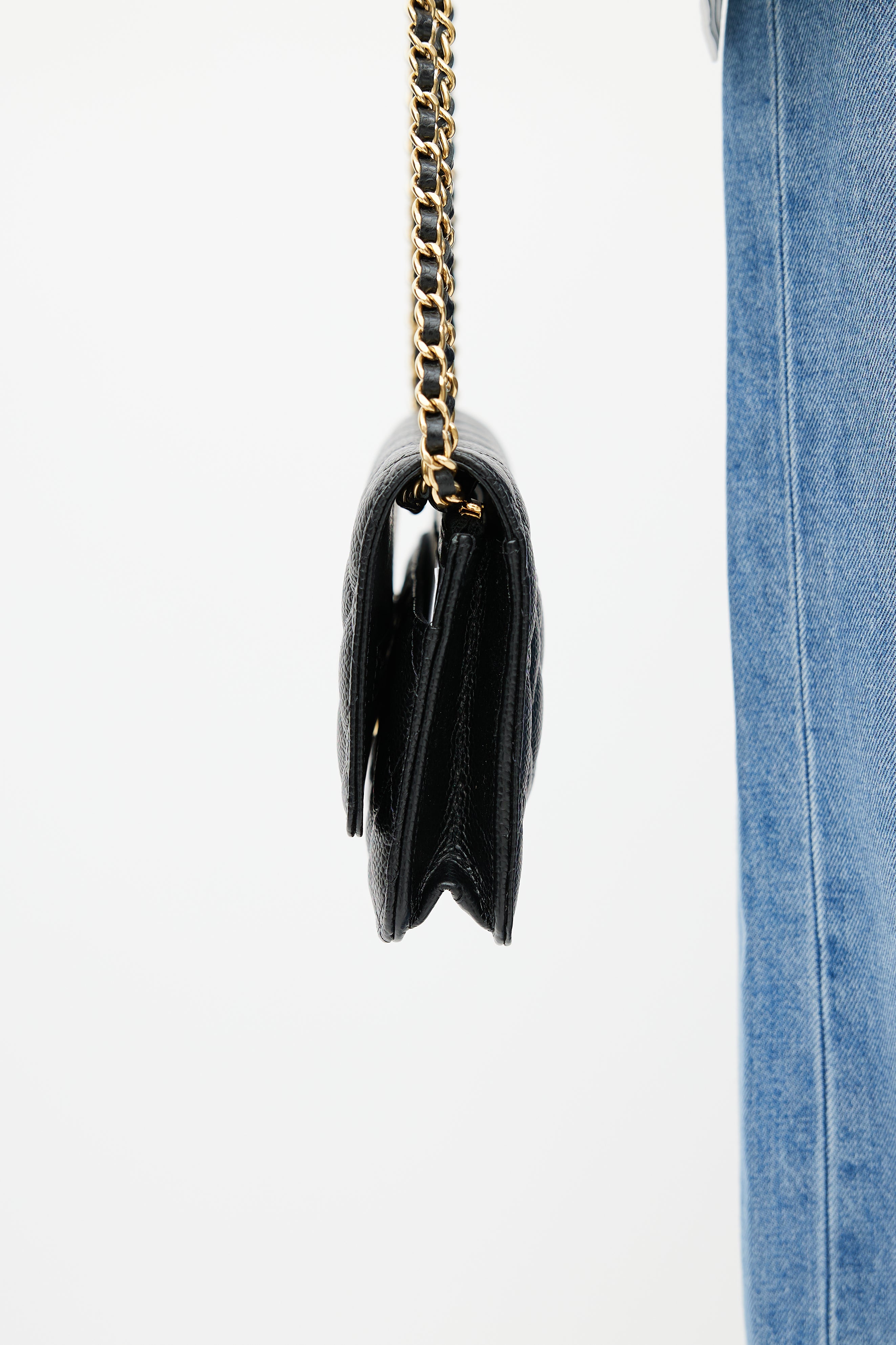 Pre-owned Chanel black wallet on chain in textured caviar leather featuring a top flap with gold tone CC logo hardware, one main compartment with seven slip pockets, one interior zip pouch, one slip pocket at back, gold tone braided chainlink shoulder strap, one slip pocket at front, and magnetic snap closure. Comes with original box.