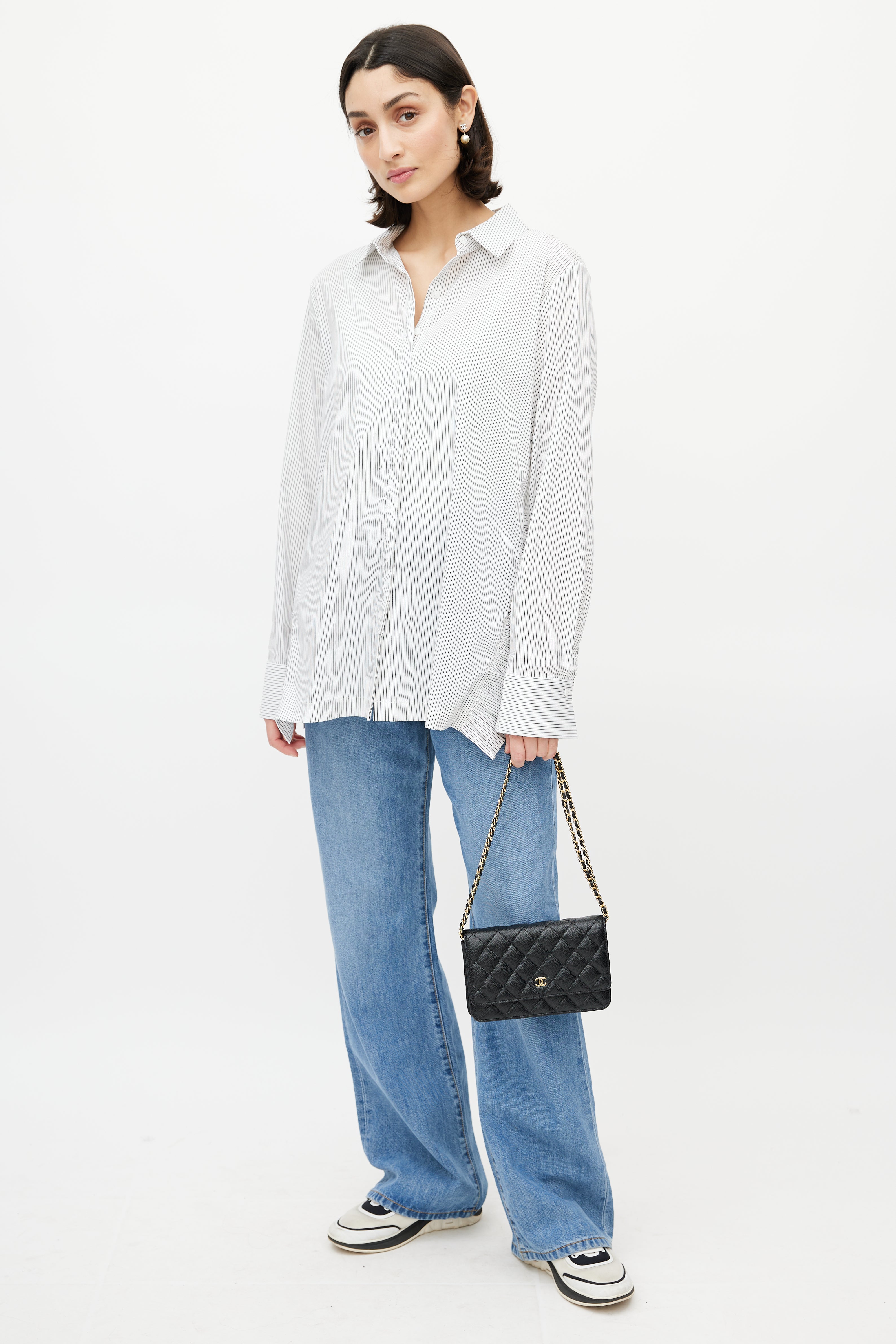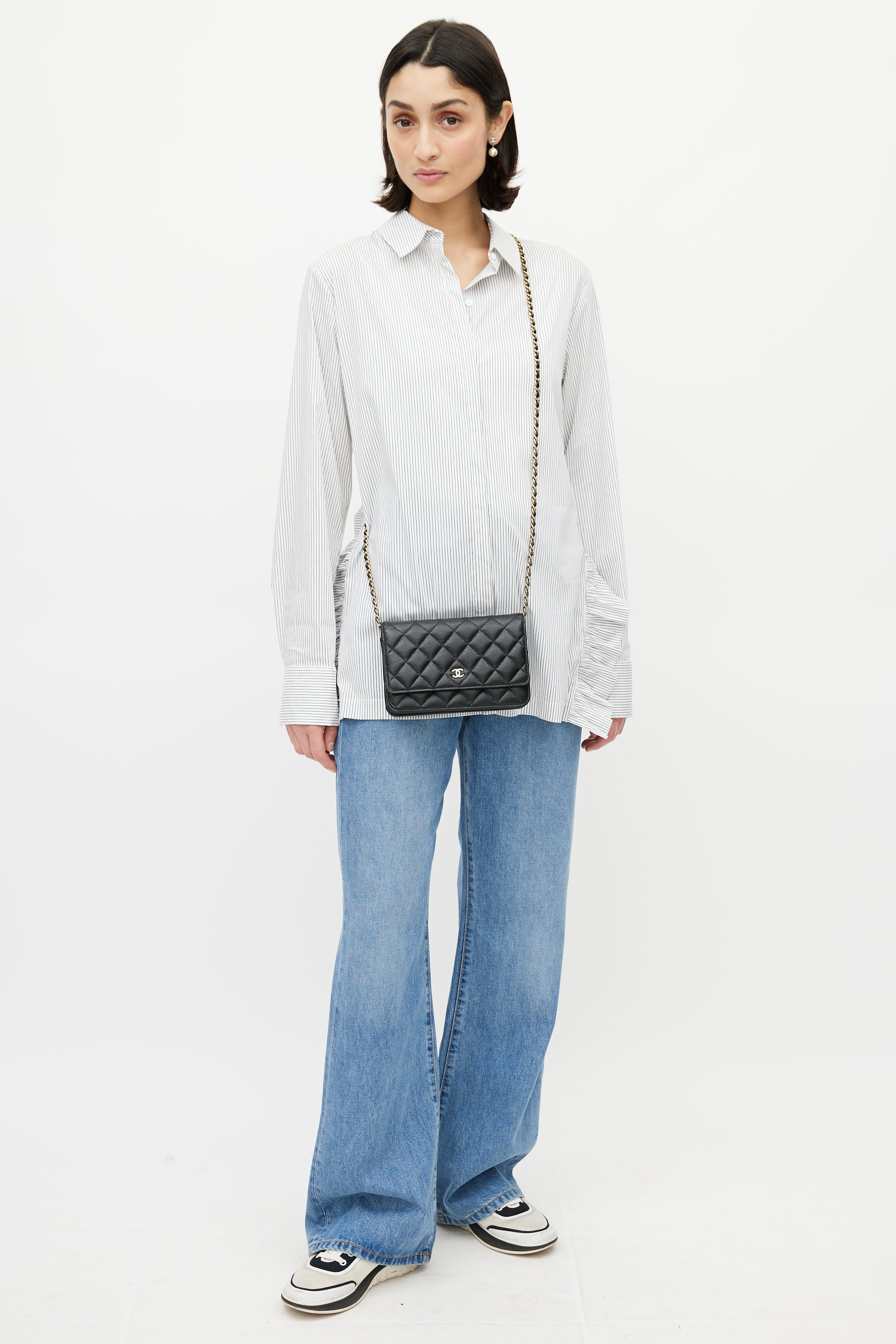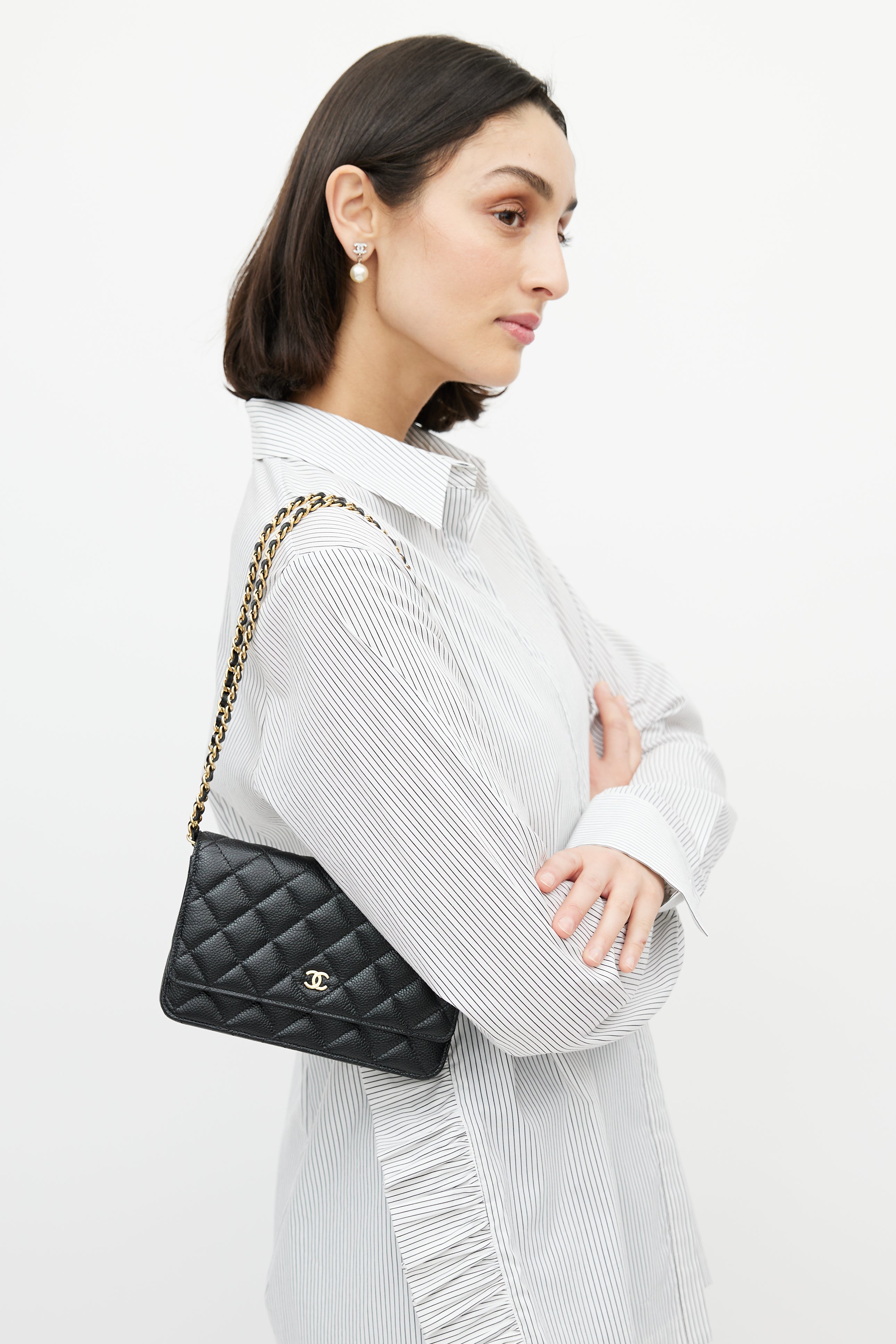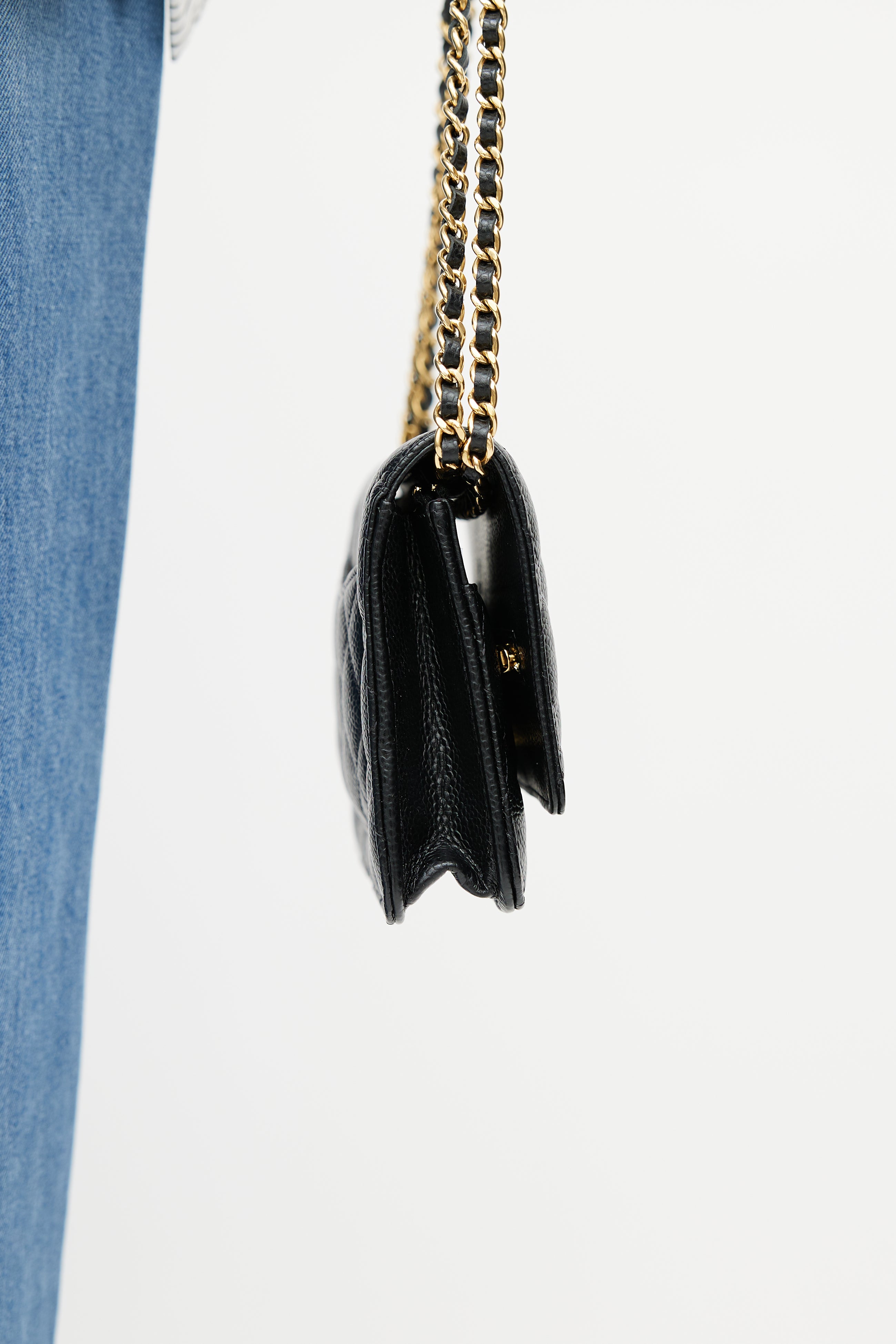 Pre-owned Chanel black wallet on chain in textured caviar leather featuring a top flap with gold tone CC logo hardware, one main compartment with seven slip pockets, one interior zip pouch, one slip pocket at back, gold tone braided chainlink shoulder strap, one slip pocket at front, and magnetic snap closure. Comes with original box.