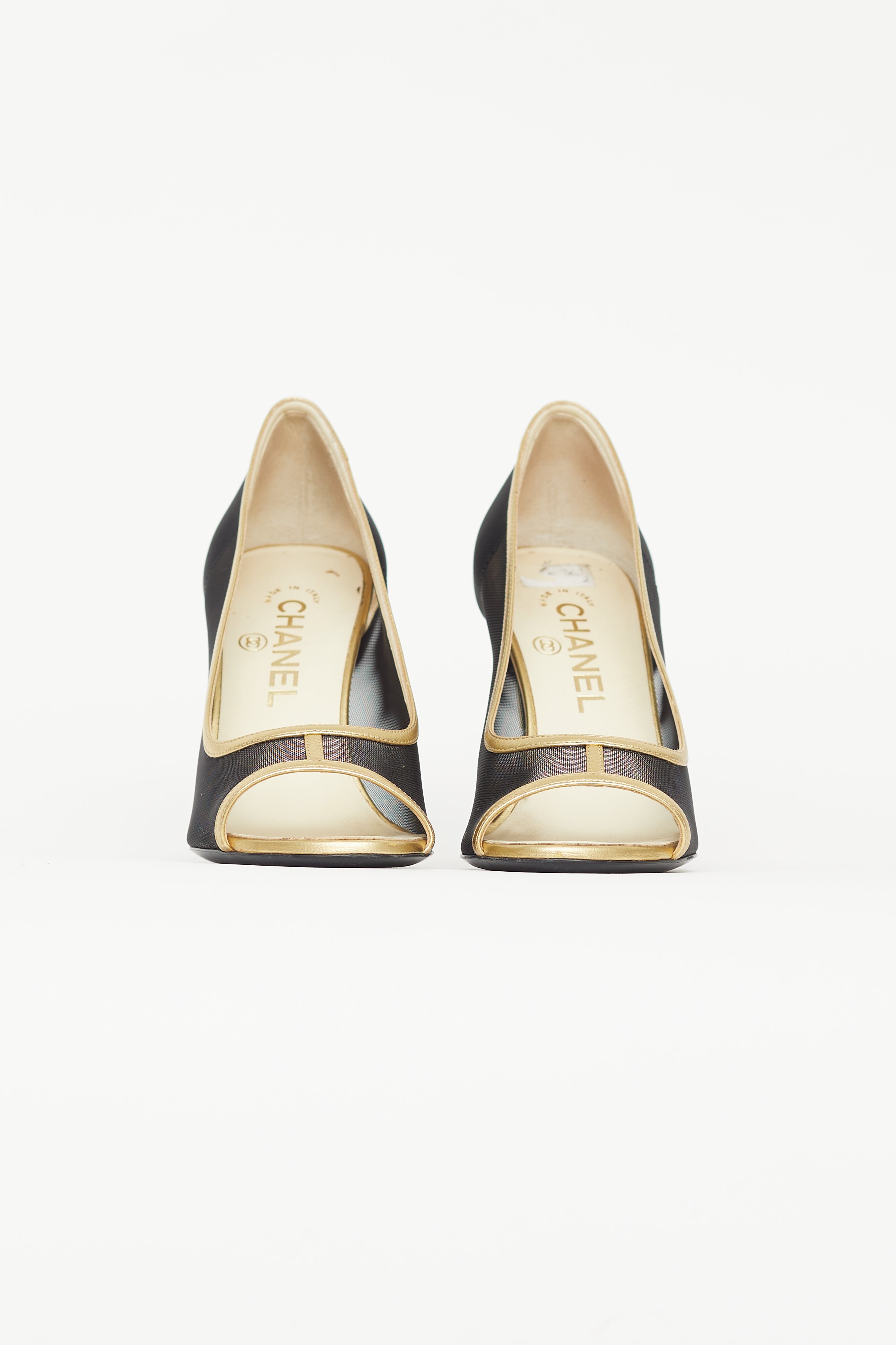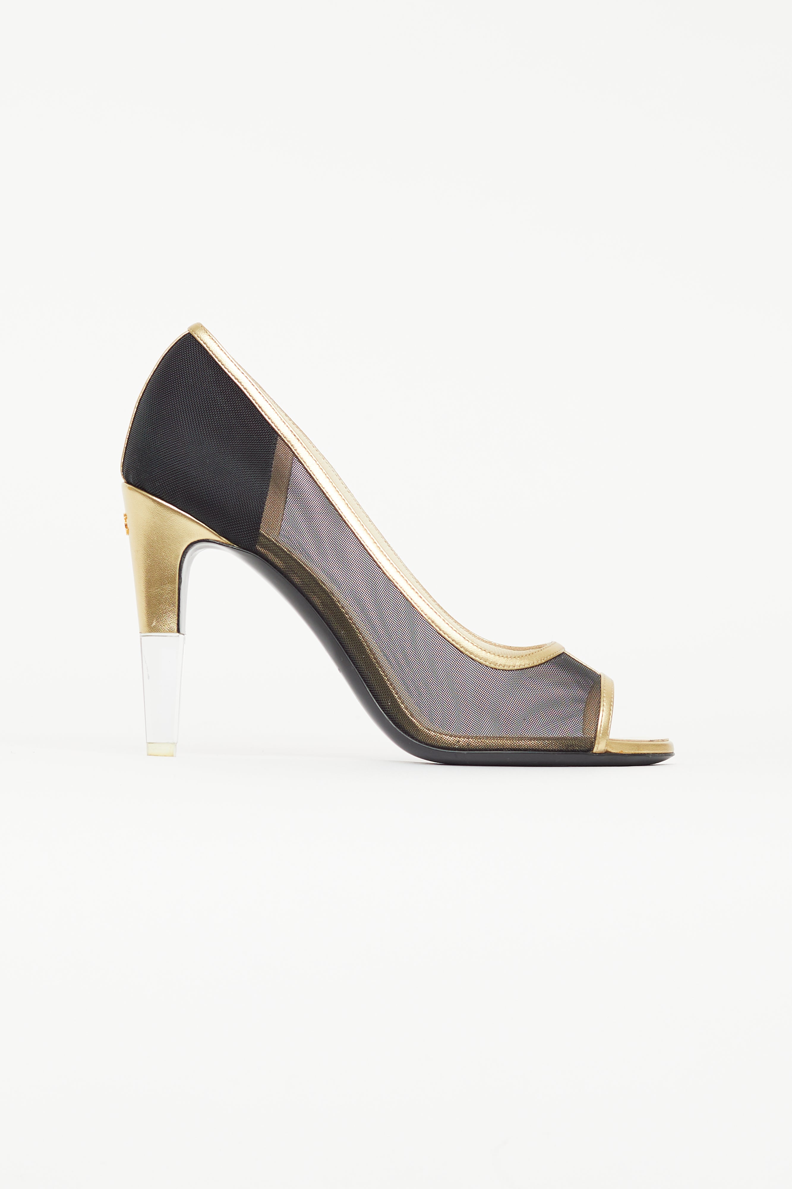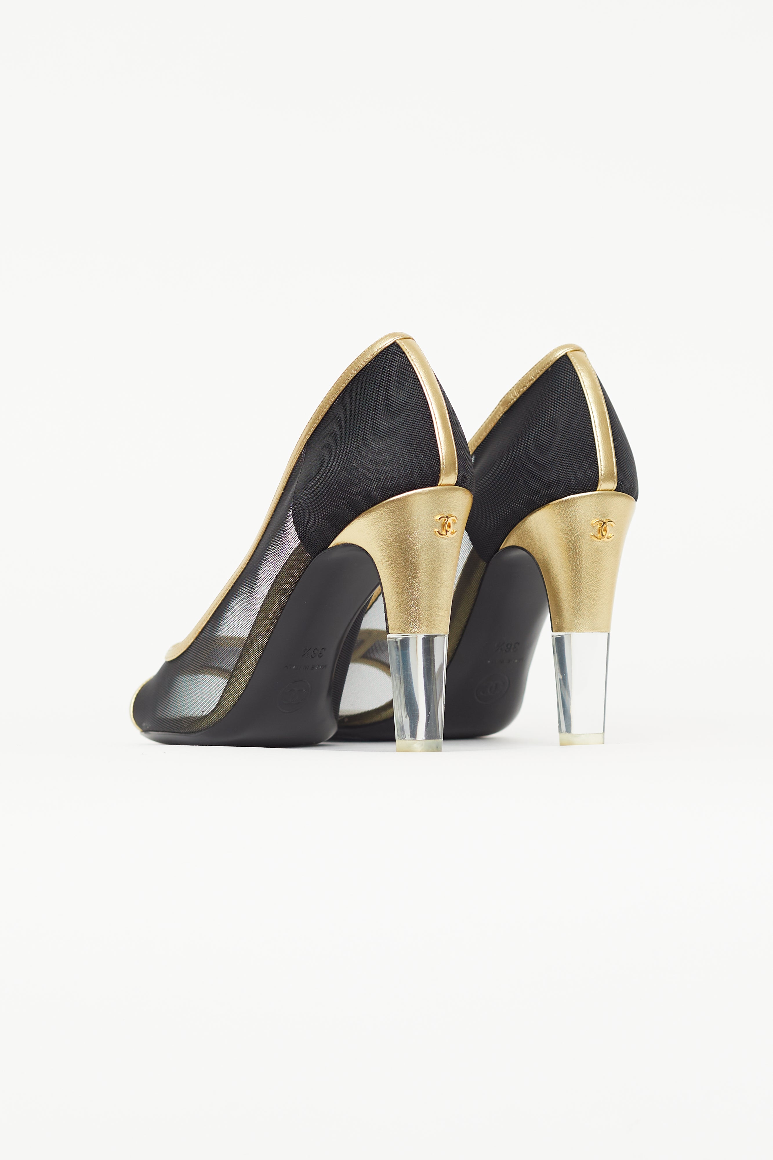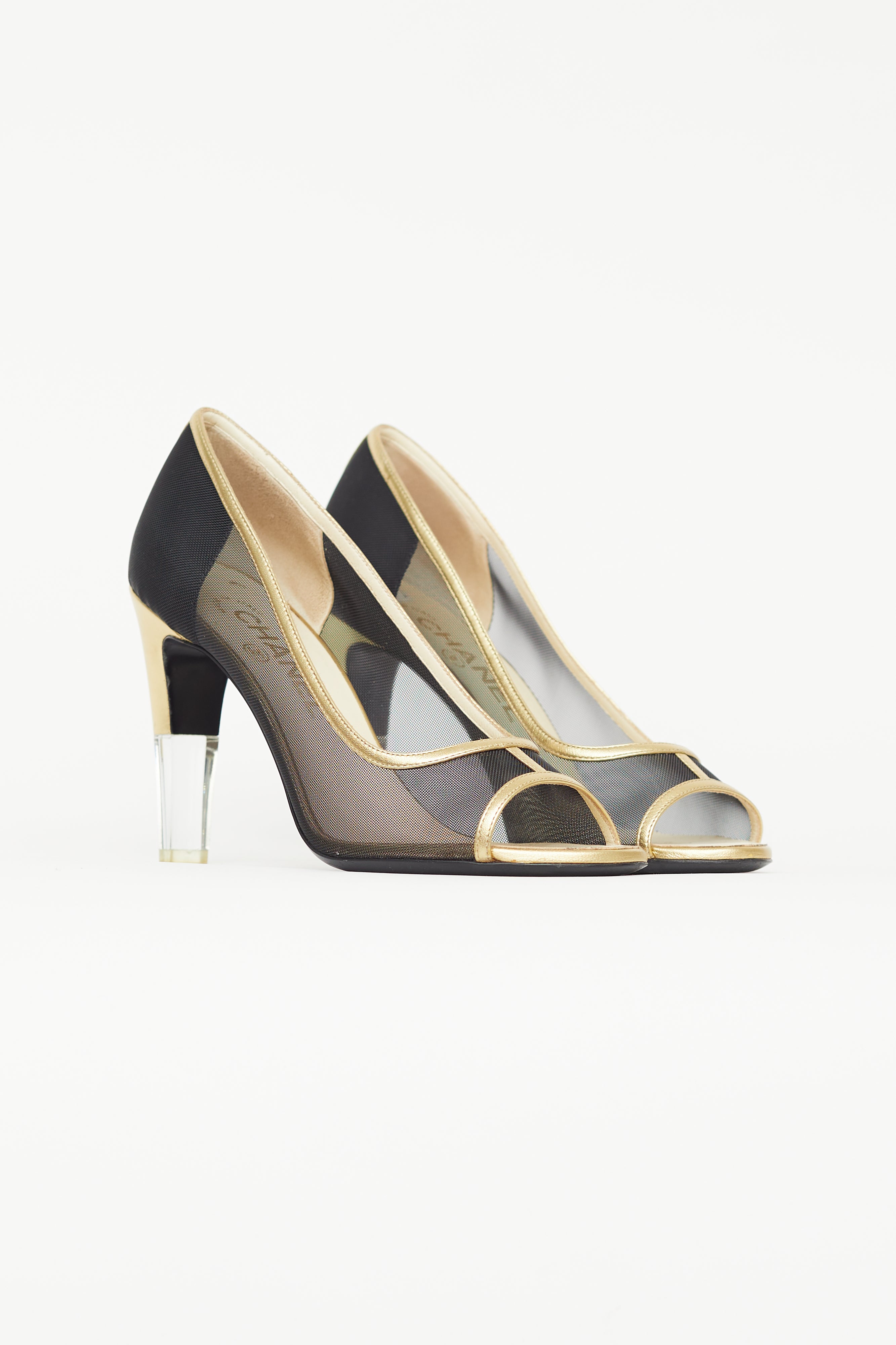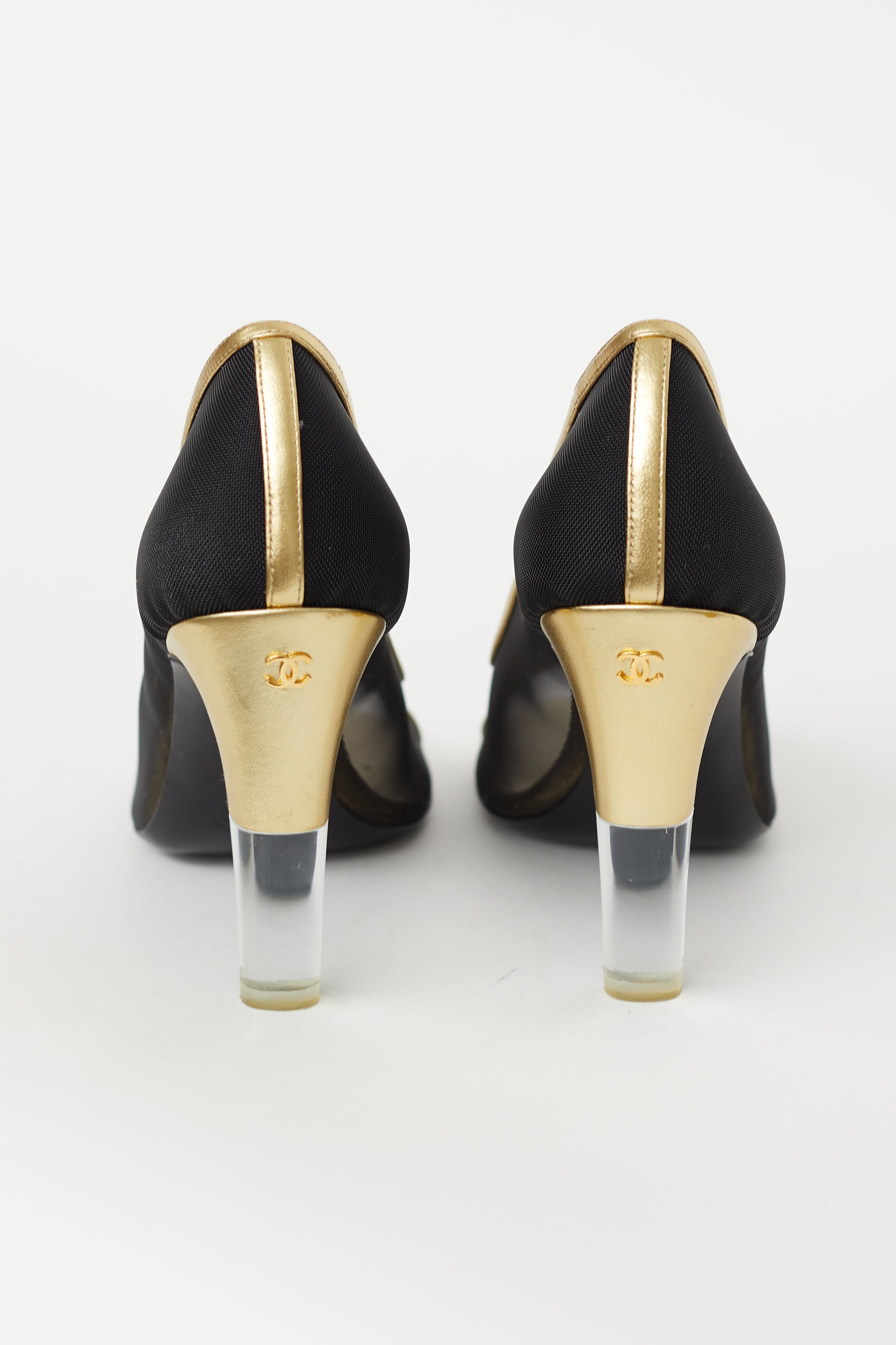 Pre-owned Chanel black heels featuring open rounded toe, gold leather trim, mesh upper, gold and clear block heel, and gold tone CC logo at back of heel.